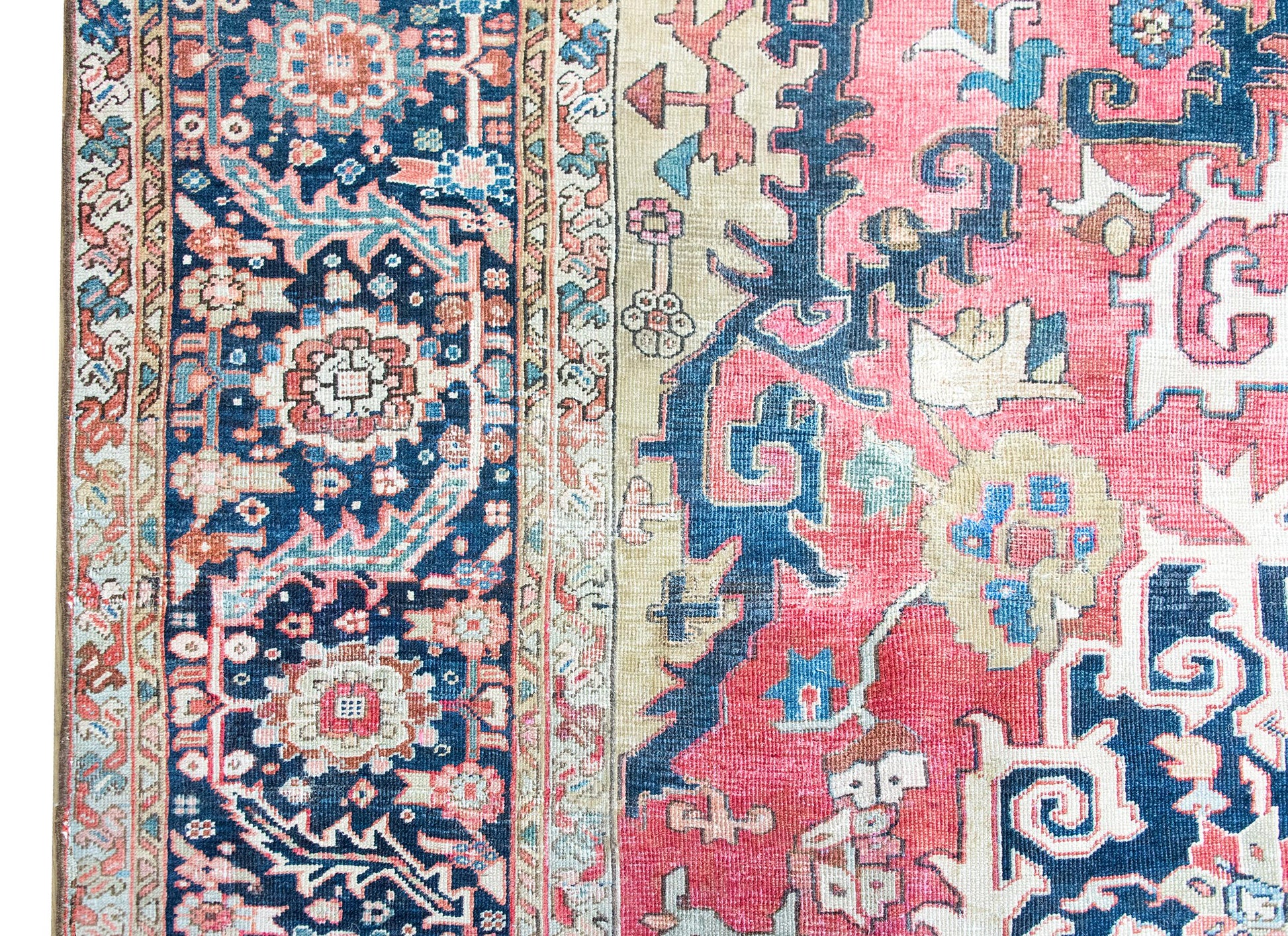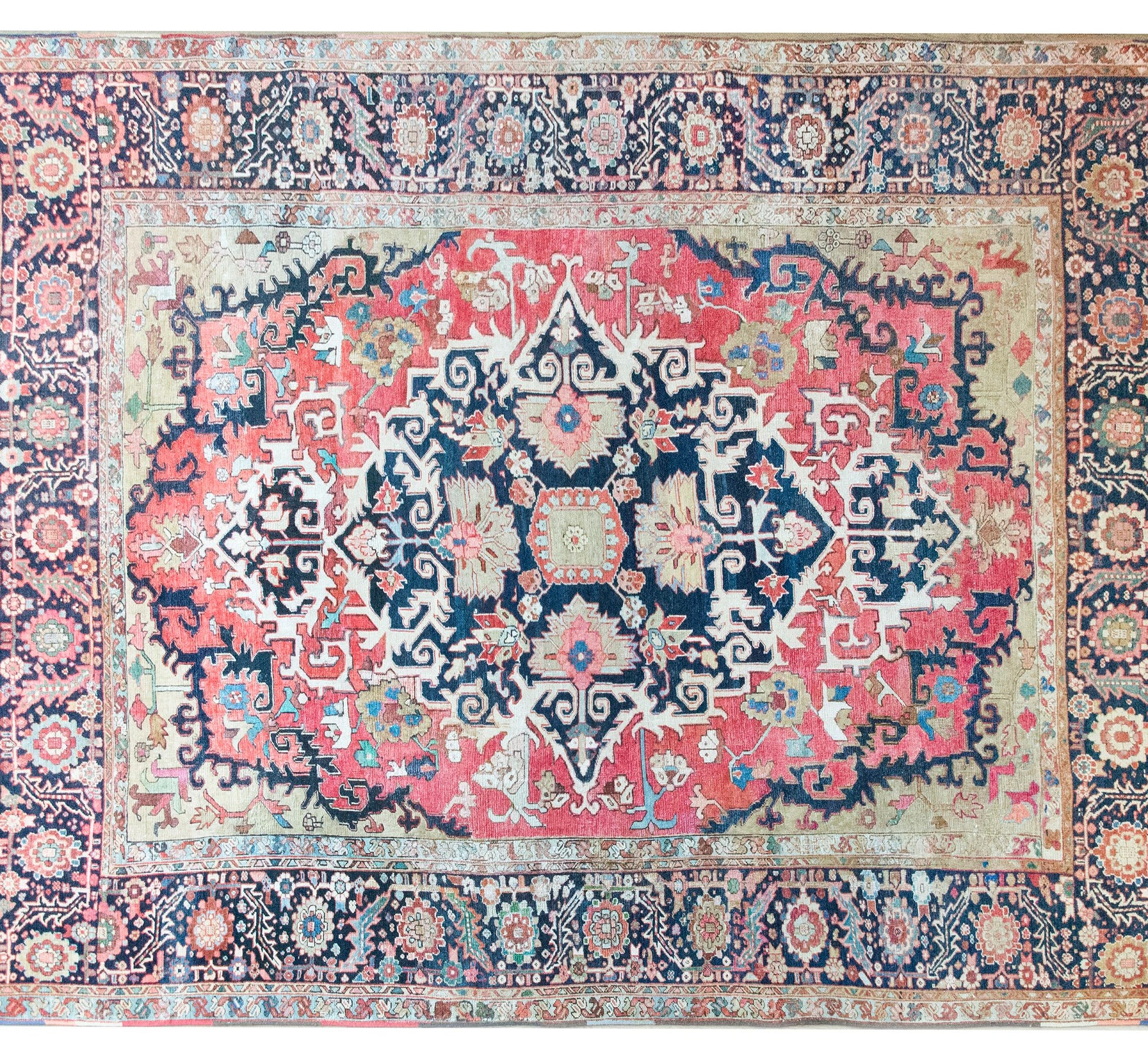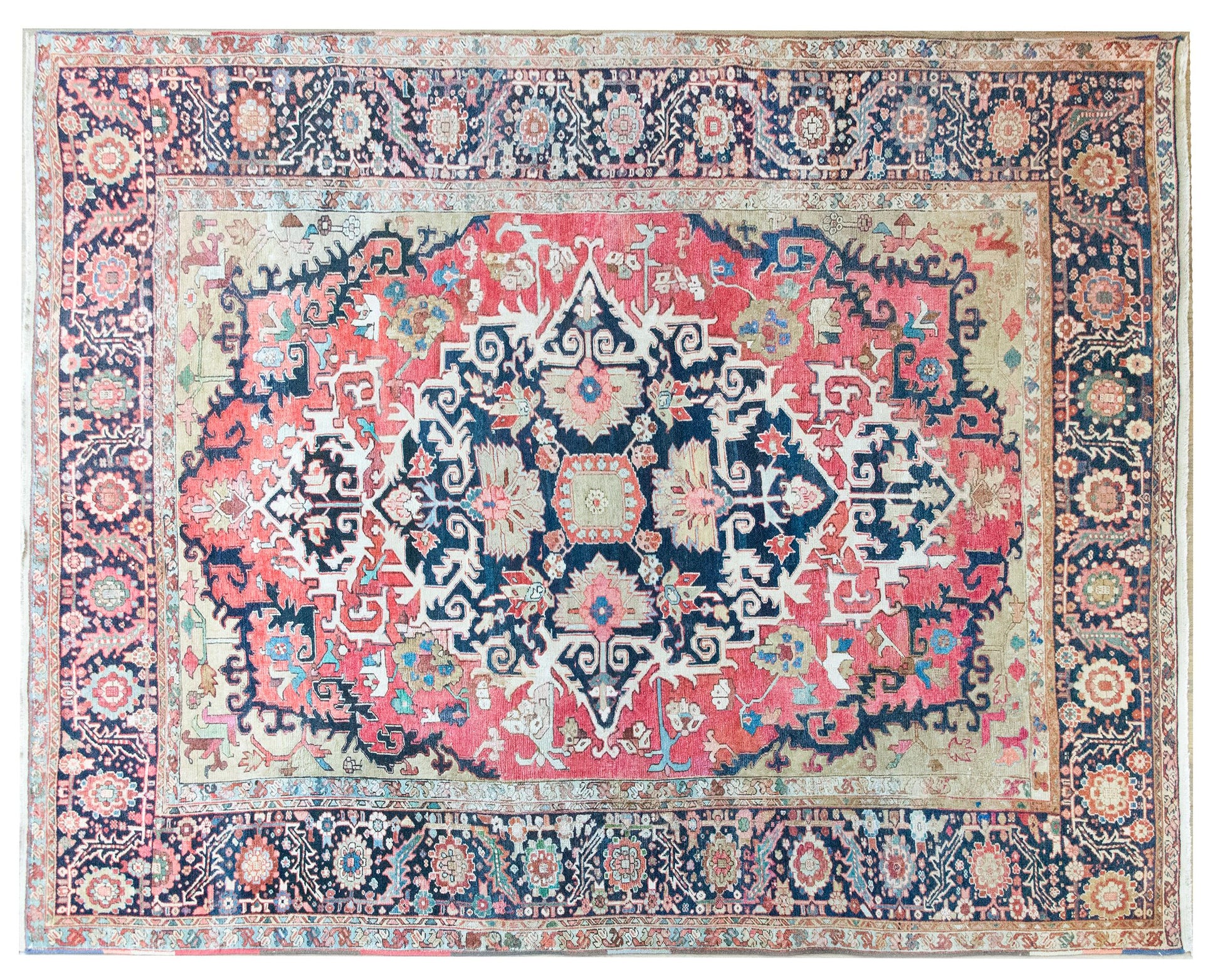 A remarkable late 19th century Persian Serapi rug with the most wonderful and mesmerizing medallion with stylized scrolling vines and flowers, surrounded by the most beautiful wide border with a repeated floral and scrolling vine pattern, and all woven in traditional Serapi colors of pink, varying shades of indigo, cream, white, and crimson wool.