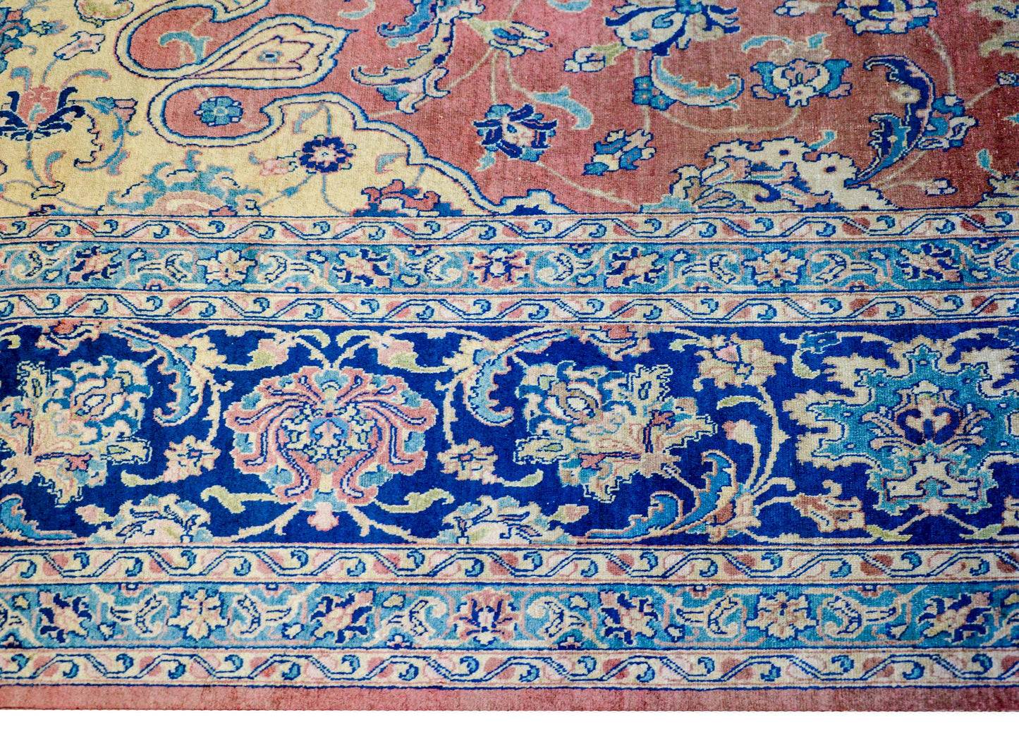 A beautiful early 20th century Persian Tabriz rug with a fantastic large central floral medallion woven in indigo, pink, and gold, on a wonderful salmon colored ground with myriad flowers and scrolling vines. The border is wide with one wide central stripe with large-scale flowers flanked by three matching pairs of petite scrolling vine patterned stripes.