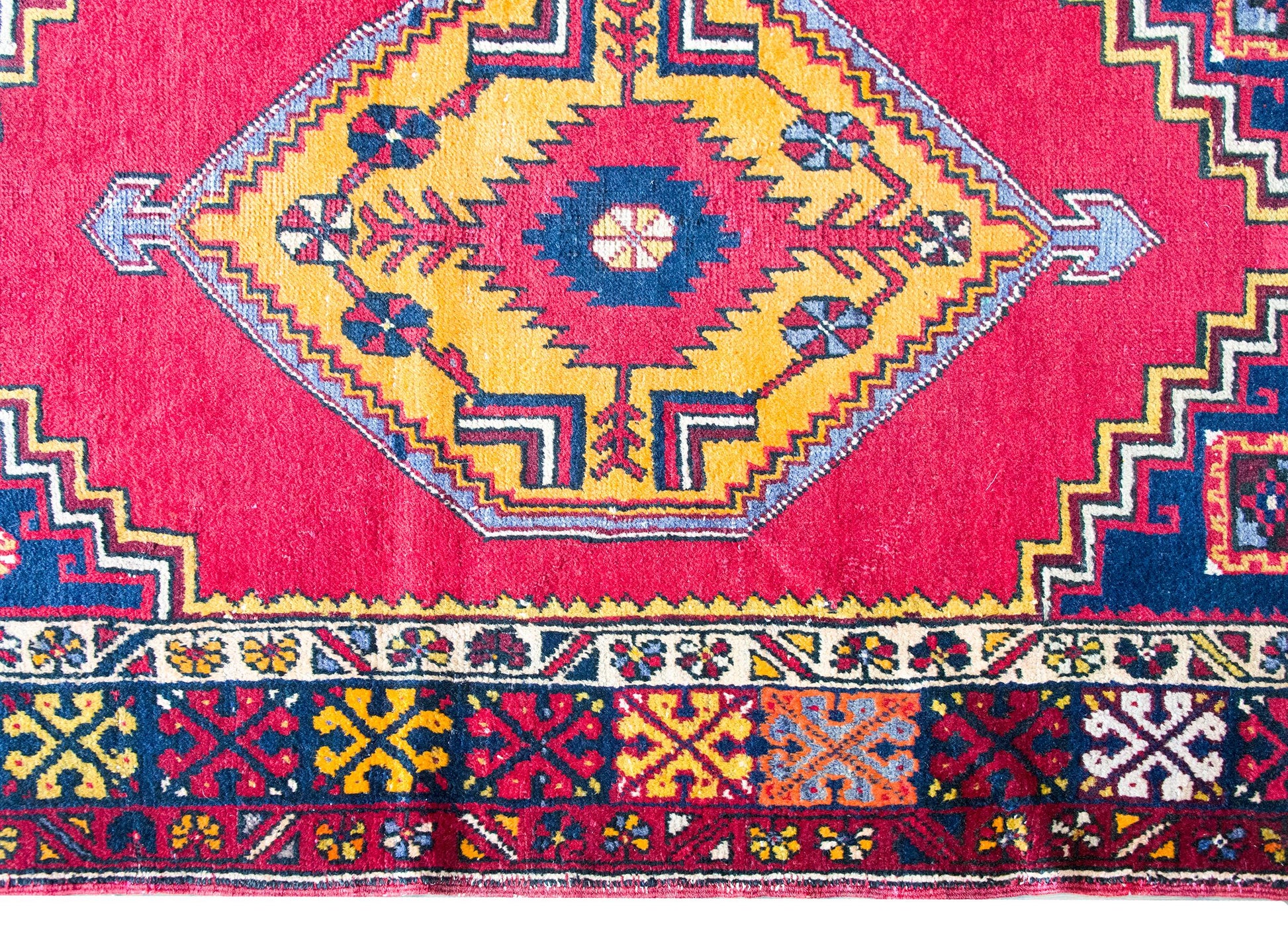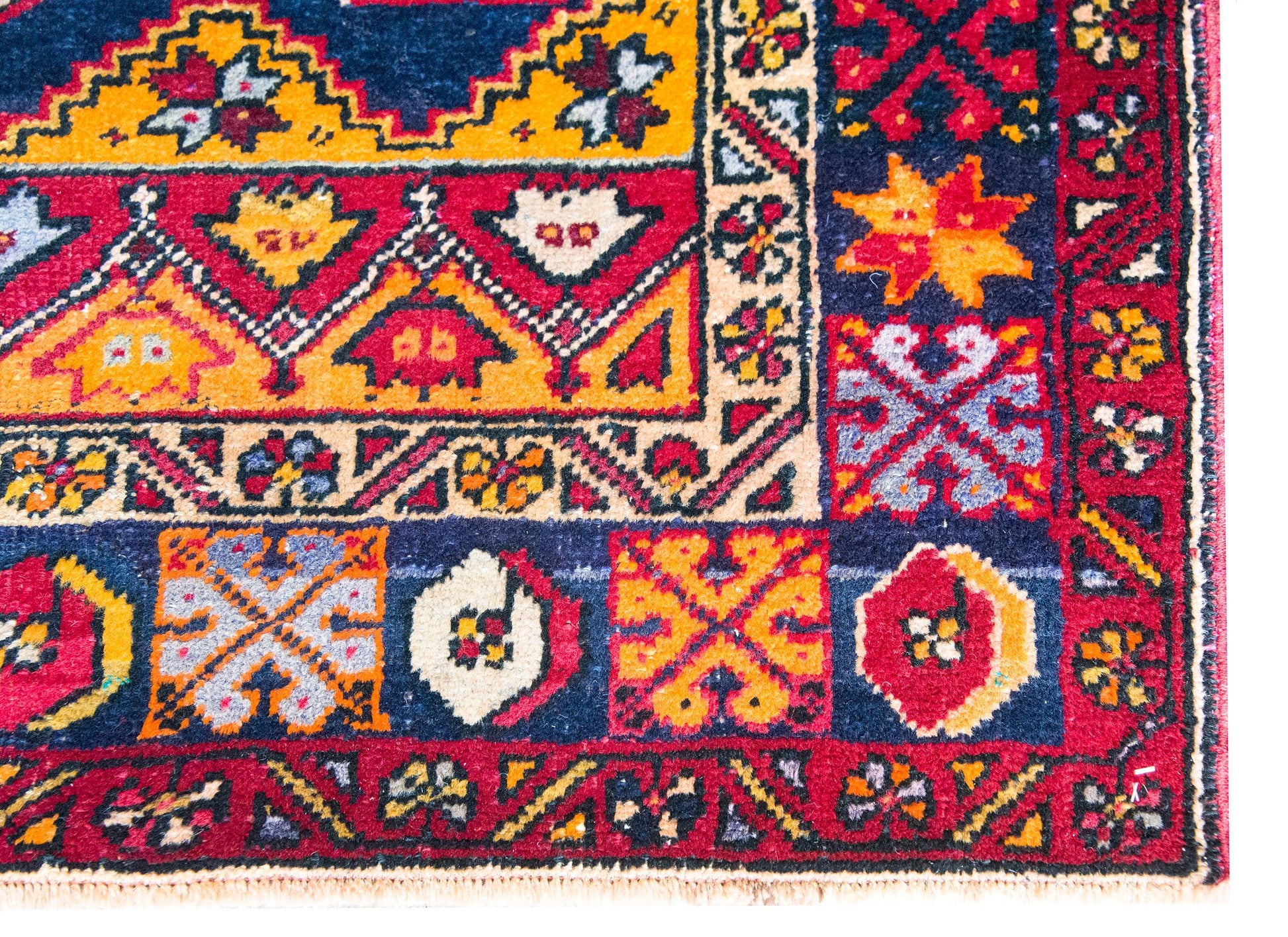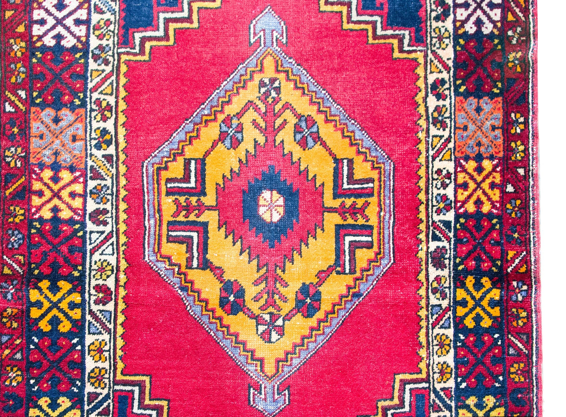 A striking 1930s Anatolian rug, handwoven in Turkey with a saturated crimson ground and a bold stepped medallion in shades of gold, navy, and coral. The central motif floats within a field of red, flanked by angular corner spandrels and framed by a richly patterned border filled with stylized flowers and tribal emblems. The wool pile is low and even, with color that remains vivid nearly a century after it was woven. The design is lively and graphic, with strong contrasts and a confident use of color that speaks to the skill and imagination of its maker. Woven entirely by hand, this rug reflects the heritage and artistic vocabulary of the Anatolian region, where each symbol holds meaning and each composition is unique. A beautiful example of early 20th-century Turkish village weaving, preserved with care and full of character.