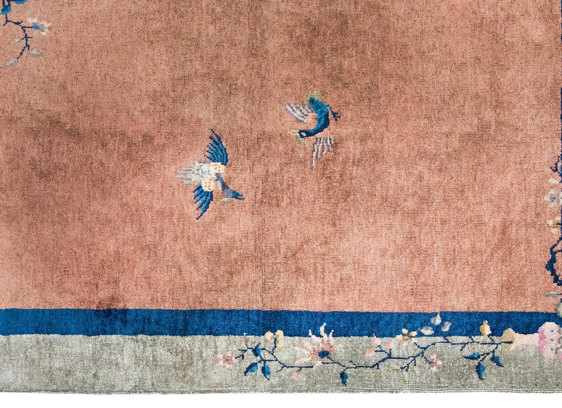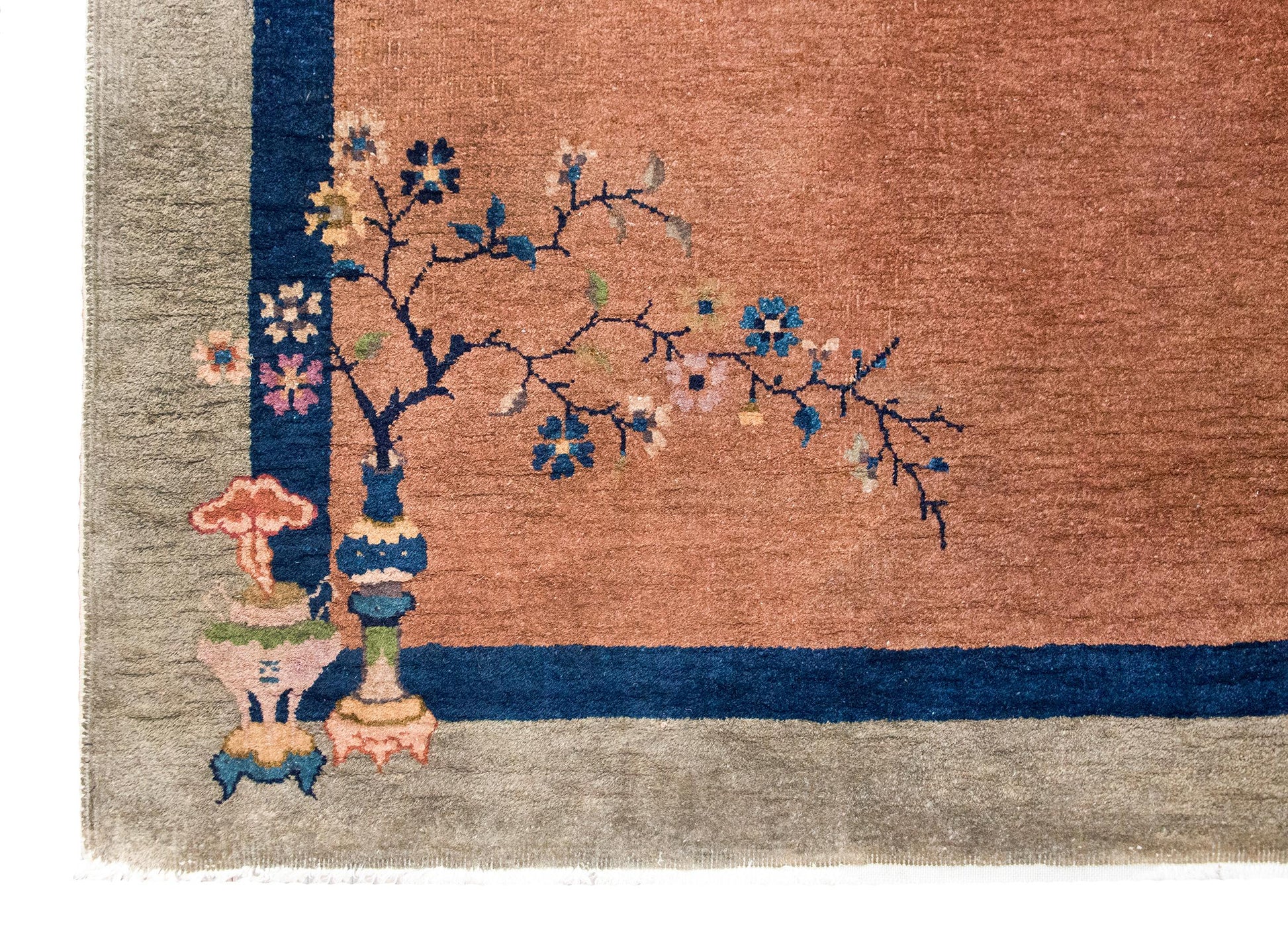 A captivating early 20th-century Chinese Art Deco rug, this piece is a masterful blend of symbolism and color. The soft peach-colored field is framed by a thin navy blue stripe and a wide gray border, creating a refined contrast that draws the eye inward. Scattered across the surface are scholar’s objects, each representing literary and artistic pursuits—elegant vases brimming with cherry blossoms and chrysanthemums, delicate teapots, and a beautifully detailed incense brazier, all woven with exquisite precision.