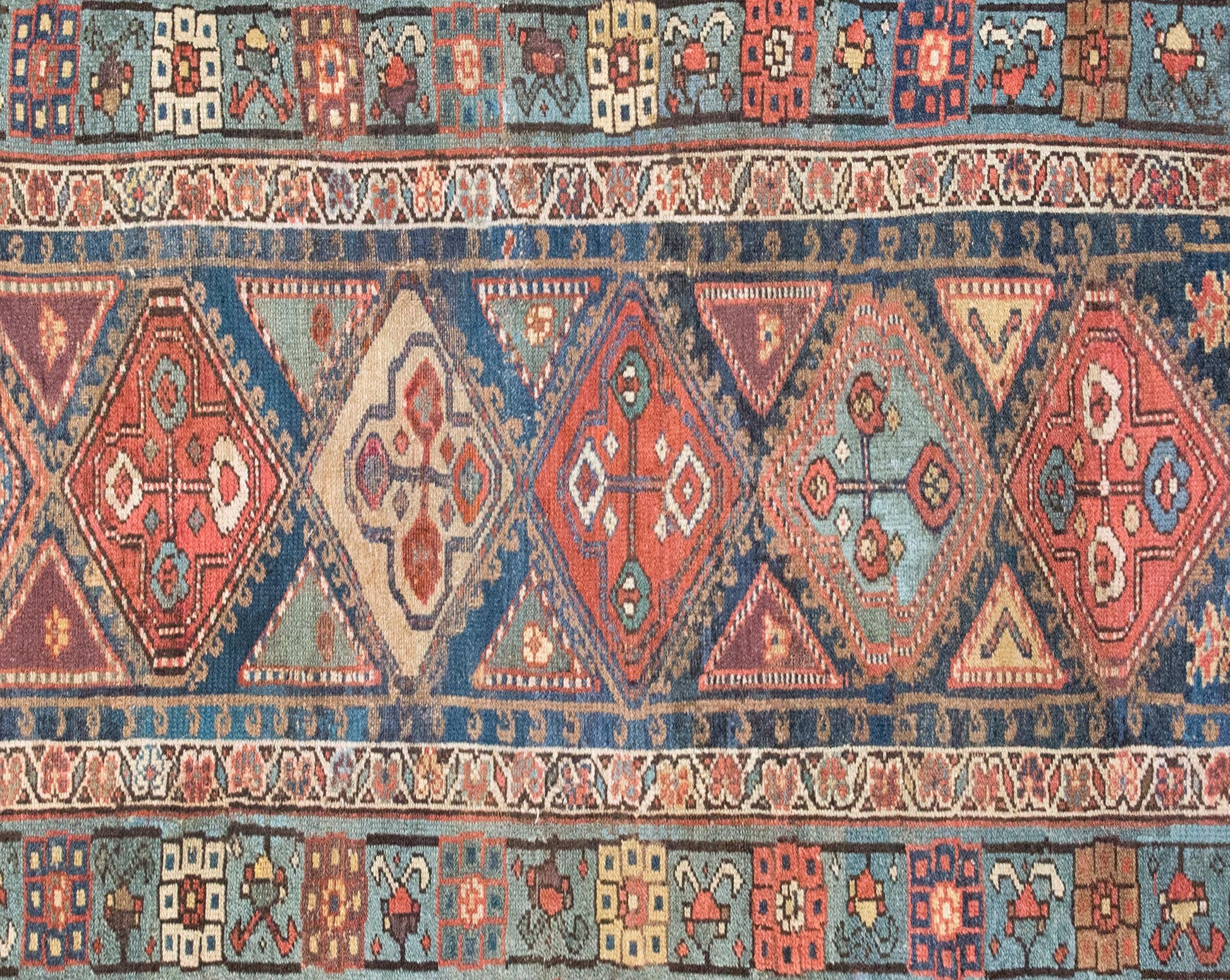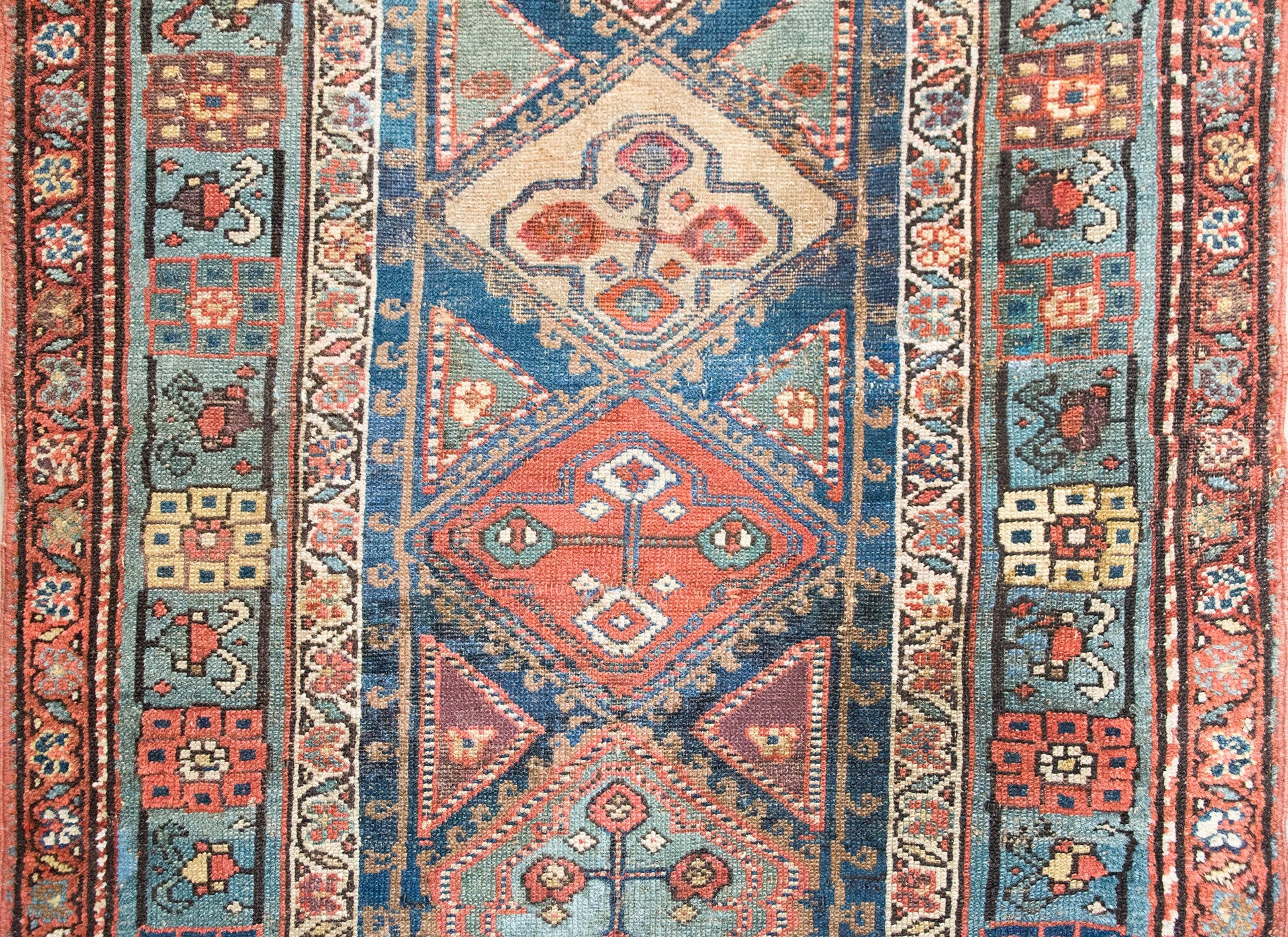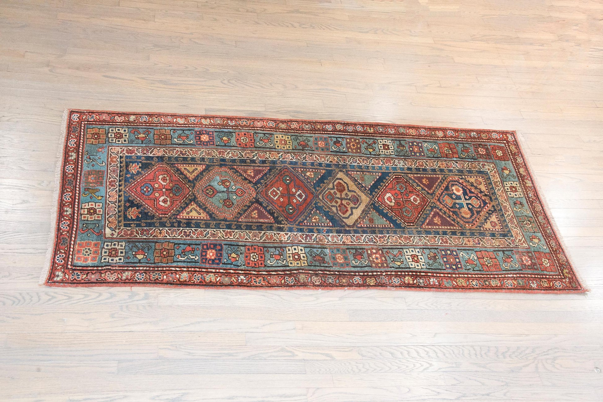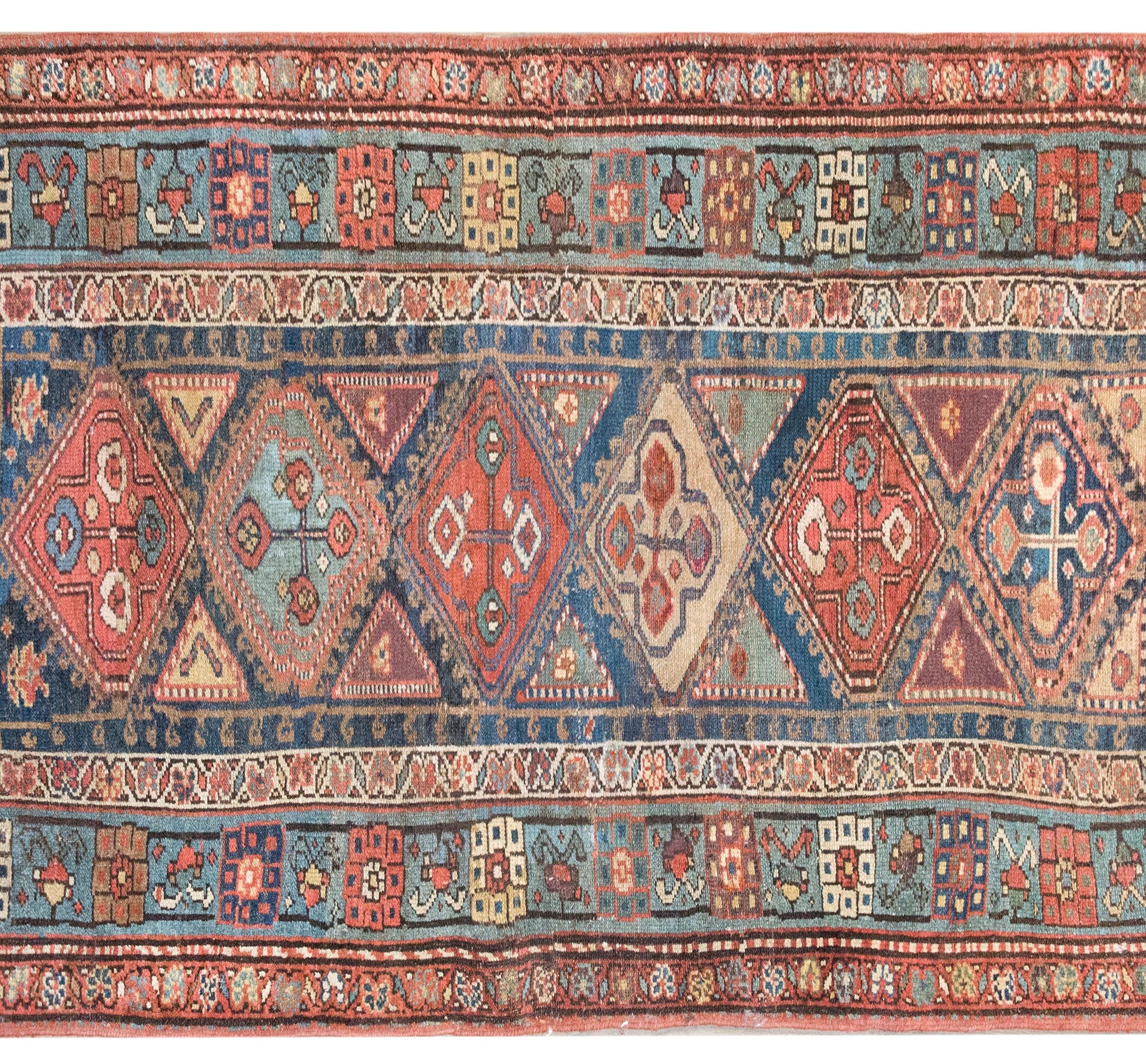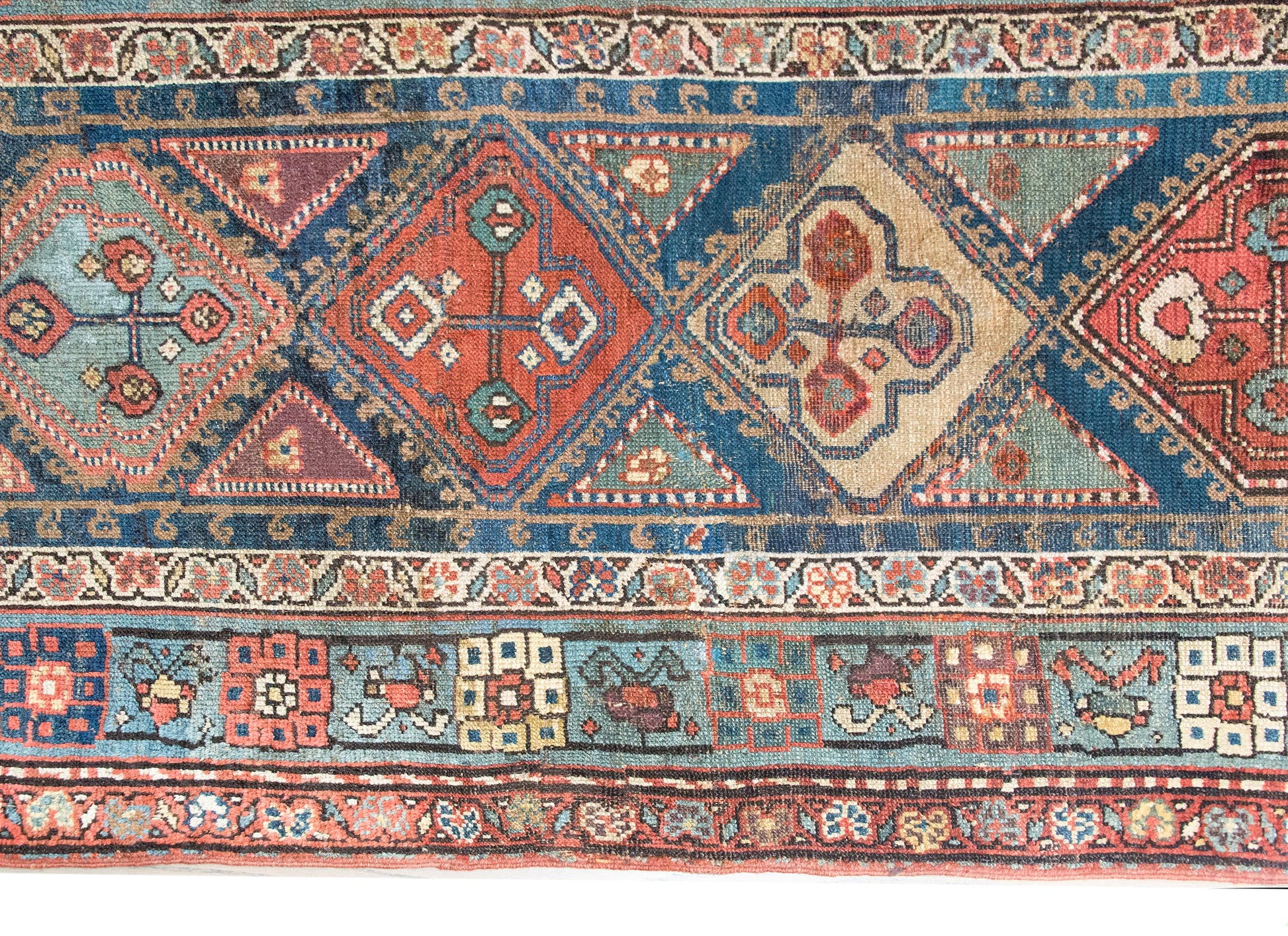 A striking early 20th-century Persian Azari rug, this piece is a testament to the rich weaving traditions of Azerbaijan. Its series of diamond medallions, each intricately adorned with stylized floral motifs, create a mesmerizing rhythm across the field, drawing the eye from one detailed form to the next. The wide, complex border is a masterpiece in itself, featuring a scrolling vine and floral pattern, beautifully rendered in a bold yet harmonious palette.