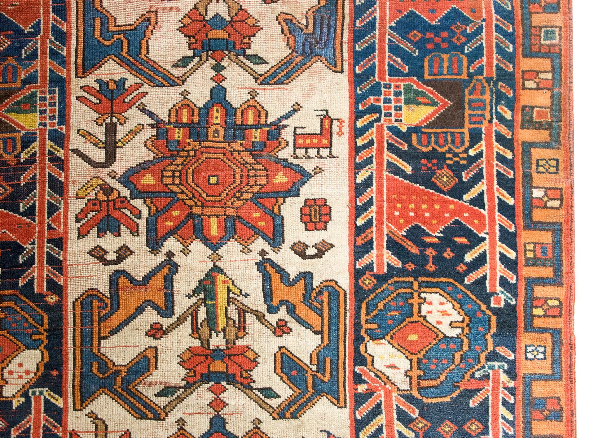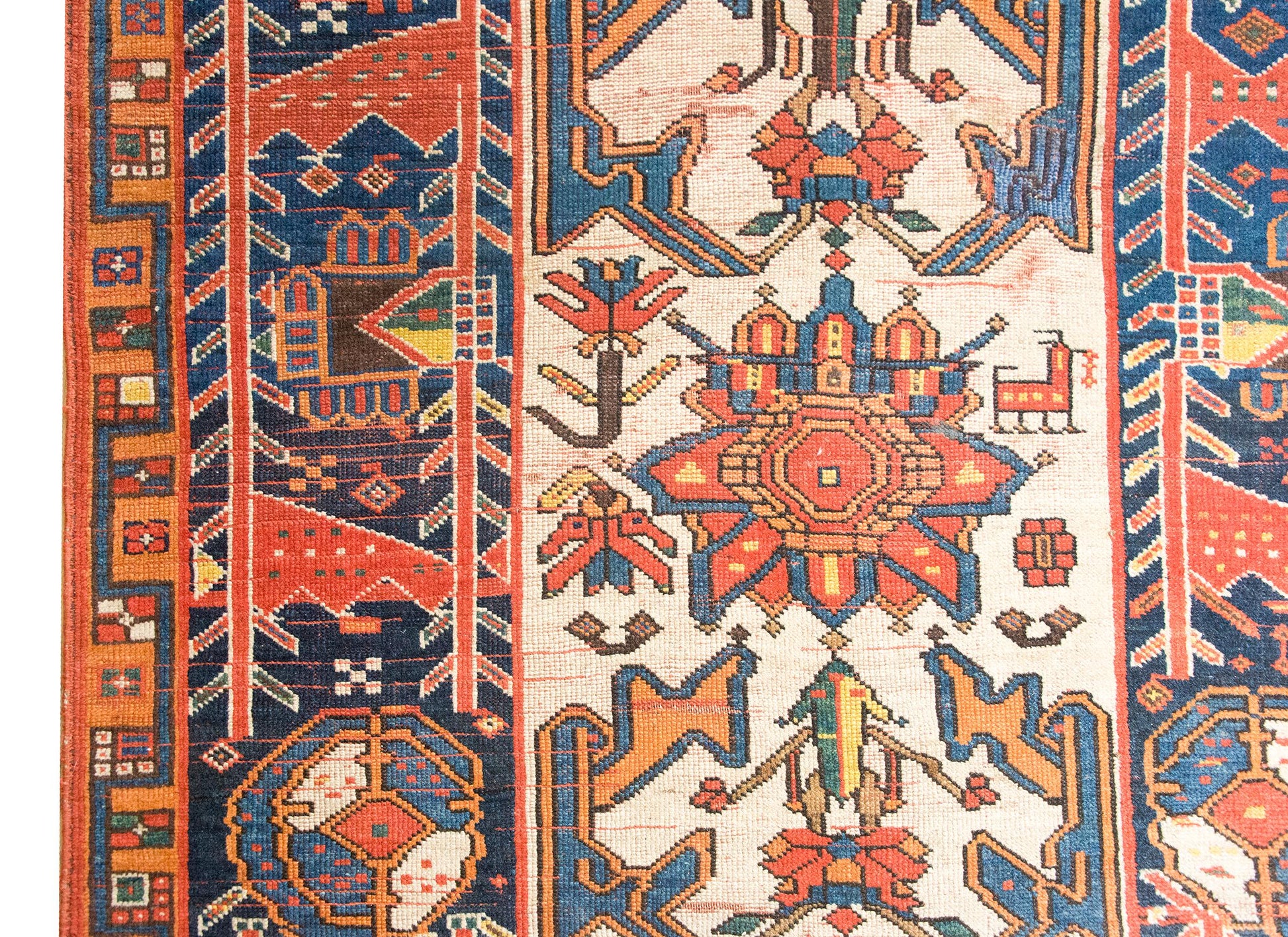 This early 20th-century Persian Bakhtiari Lori rug is a stunning example of tribal artistry, featuring a mesmerizing repeated large-scale floral pattern that runs the length of the central field. Woven in rich shades of crimson, gold, indigo, orange, and white, the design pulses with movement and energy, a hallmark of Lori weaving. Framing the composition is a highly elaborate border, where large-scale stylized florals intertwine with scrolling vines, creating a dynamic yet harmonious balance.