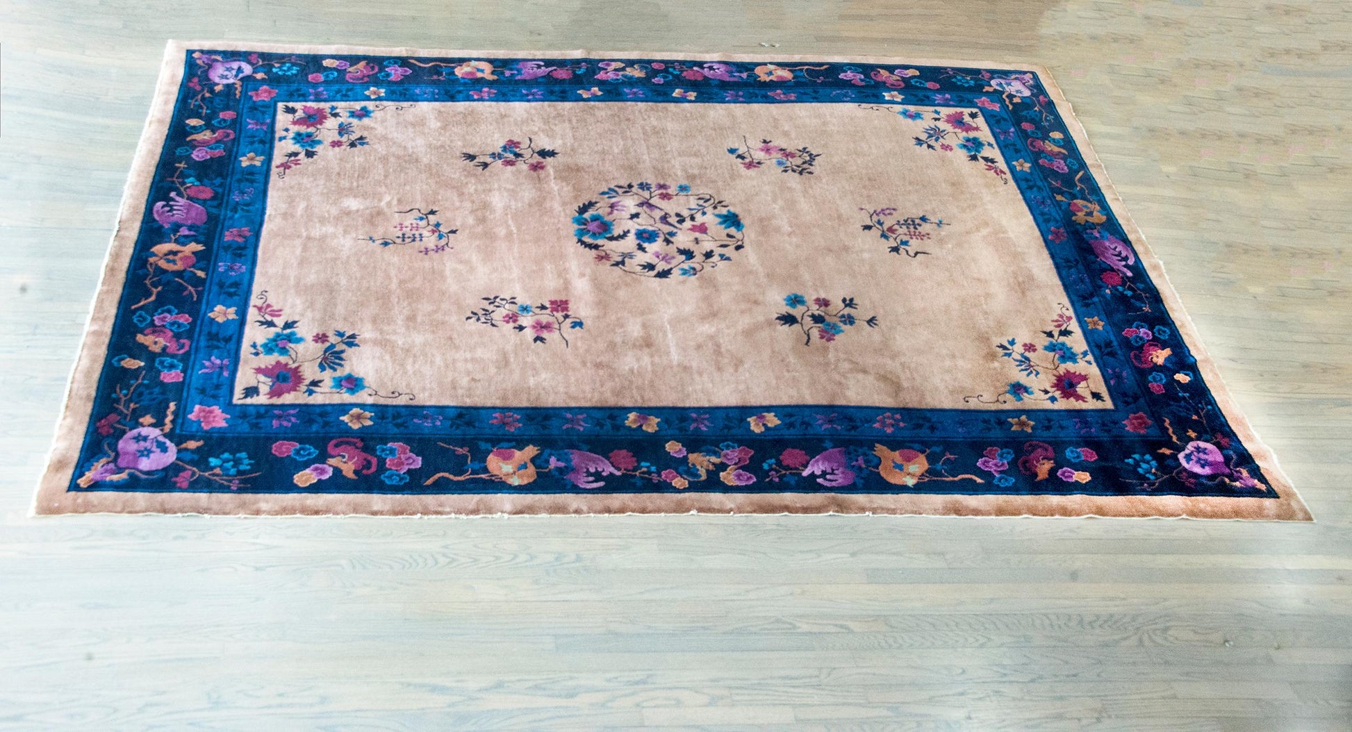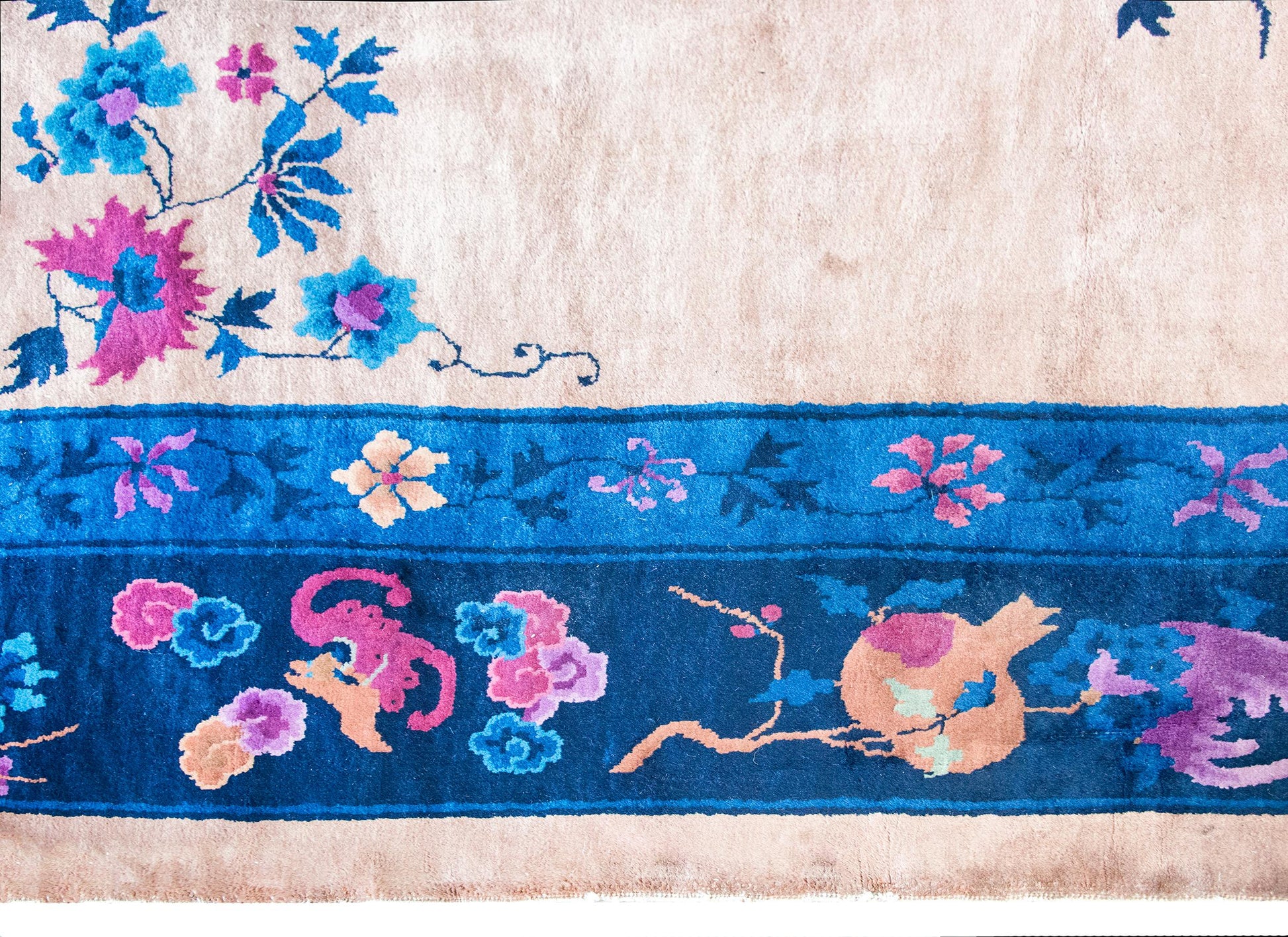 A lush and lyrical composition, this early 20th-century Chinese Art Deco rug brings together bold color, cultural symbolism, and painterly design. At its center, a floral medallion blossoms with peonies, chrysanthemums, and cherry blossoms—traditional emblems of beauty, longevity, and renewal—set against a soft beige field scattered with more floral forms. A wide border frames the scene with an array of auspicious Chinese motifs: pomegranates for fertility, Buddha’s hand citron for happiness, double gourds for health, bats for good fortune, and drifting clouds suggesting transcendence. Woven in richly nuanced shades of violet, lavender, deep and pale indigo, fuchsia, and warm brown wool, the palette feels both vibrant and grounded. As with many Art Deco Chinese rugs of the period, the composition blends tradition with modern sensibility—an expressive statement piece that remains elegant and relevant. Beautiful underfoot, or just admired from across the room, this is a rug that tells stories in color and symbol.