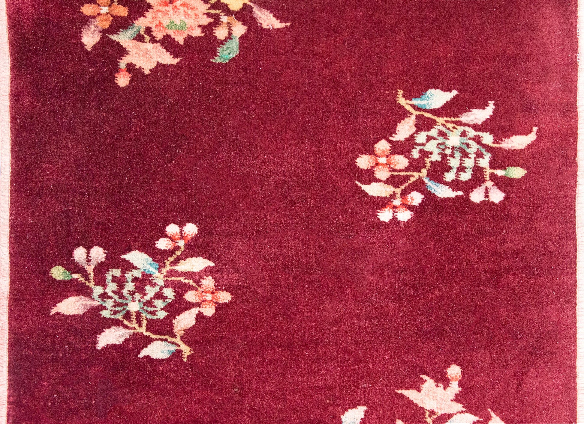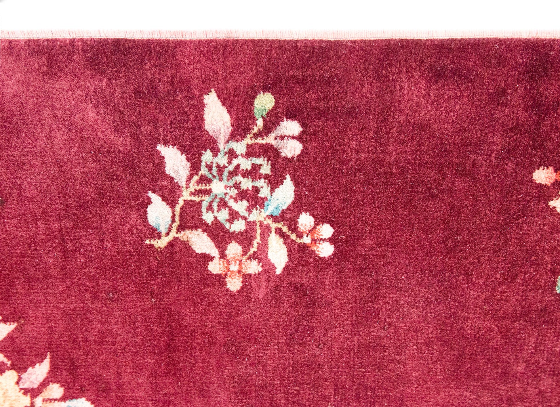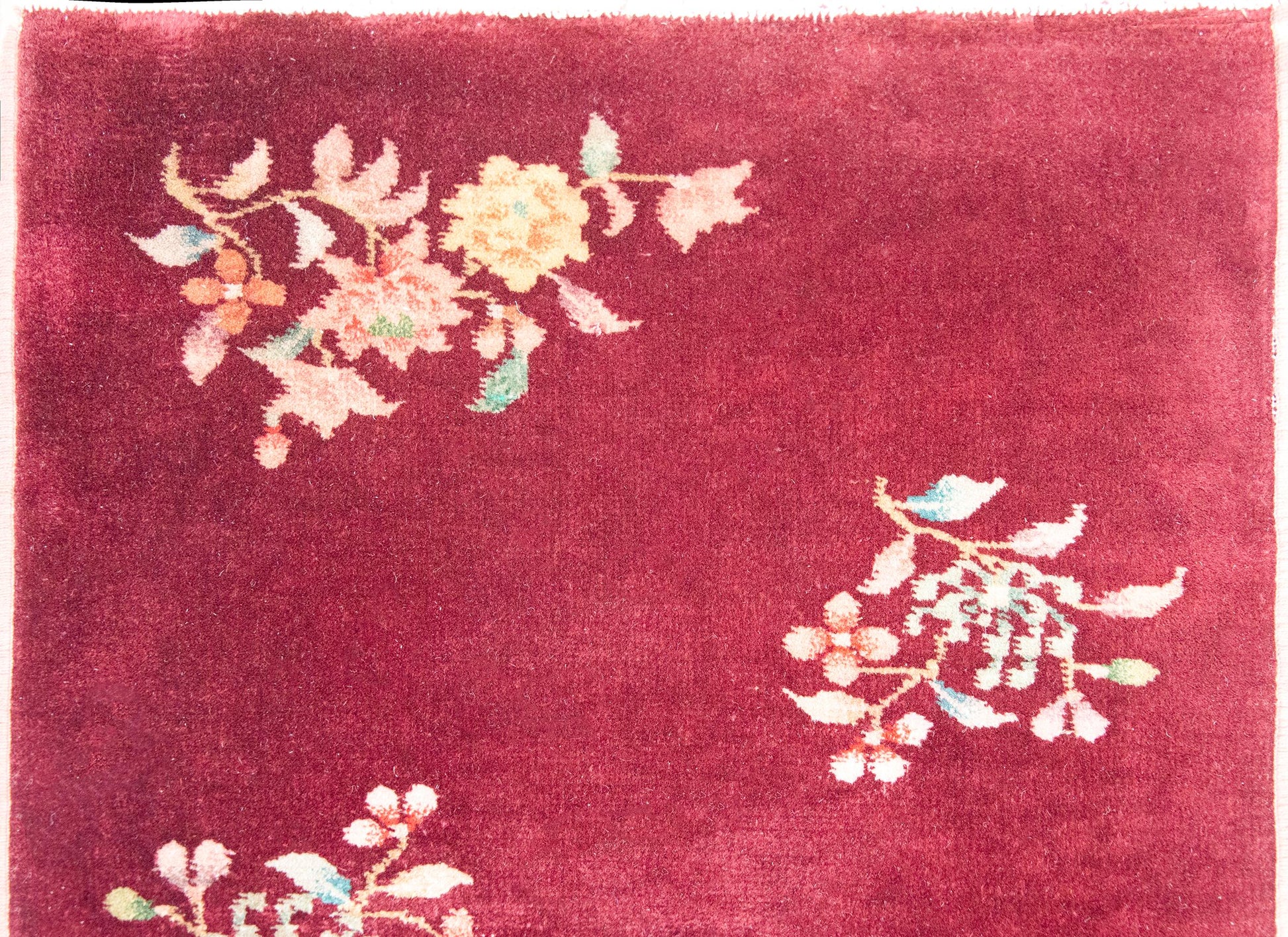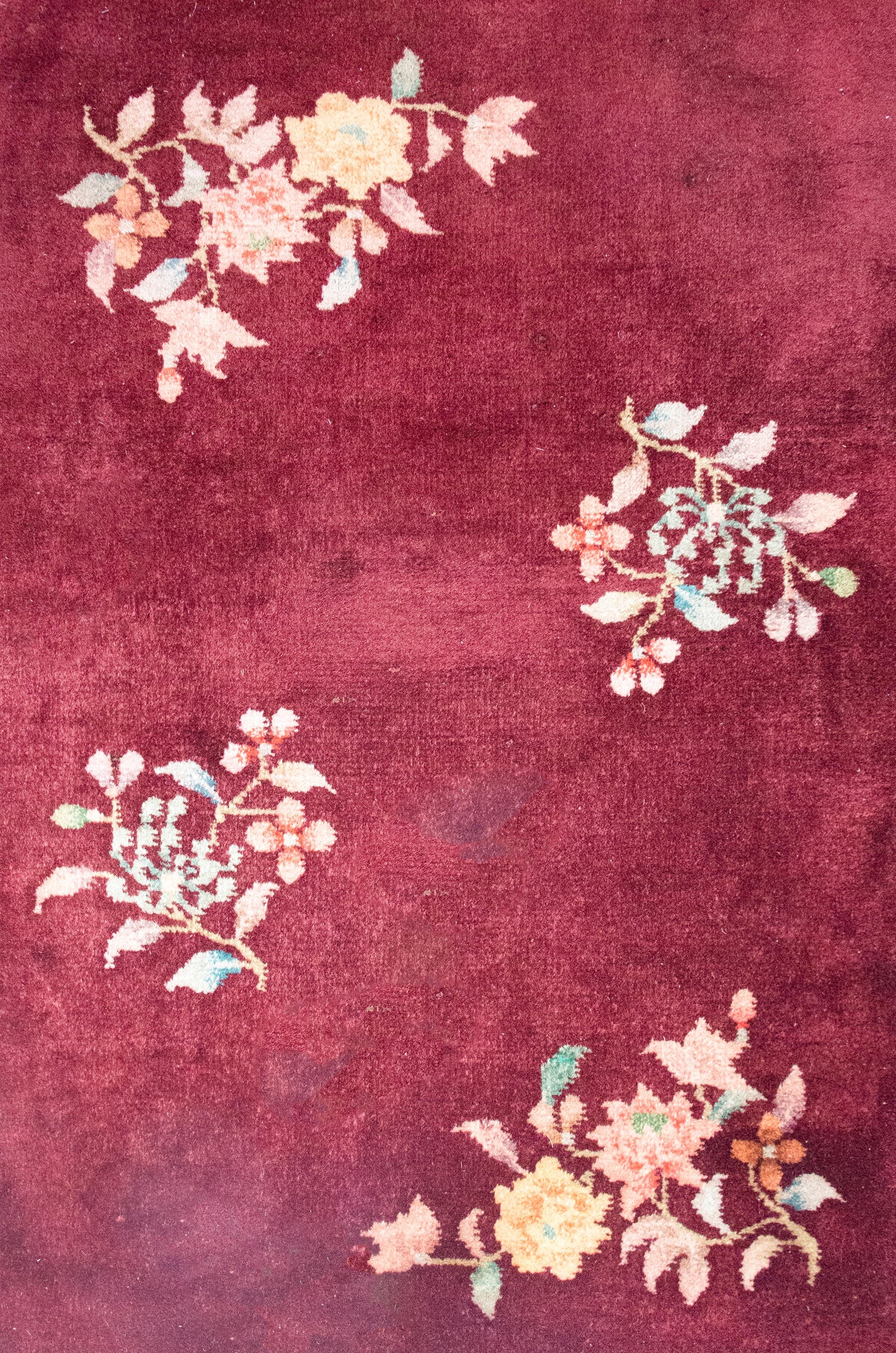 A stunning early 20th century petite Chinese Art Deco rug with a cranberry field with two chrysanthemum clusters in opposing corner, and two cherry blossoms clusters on the center, and all woven in pastel pinks, greens, yellow, and indigos.
