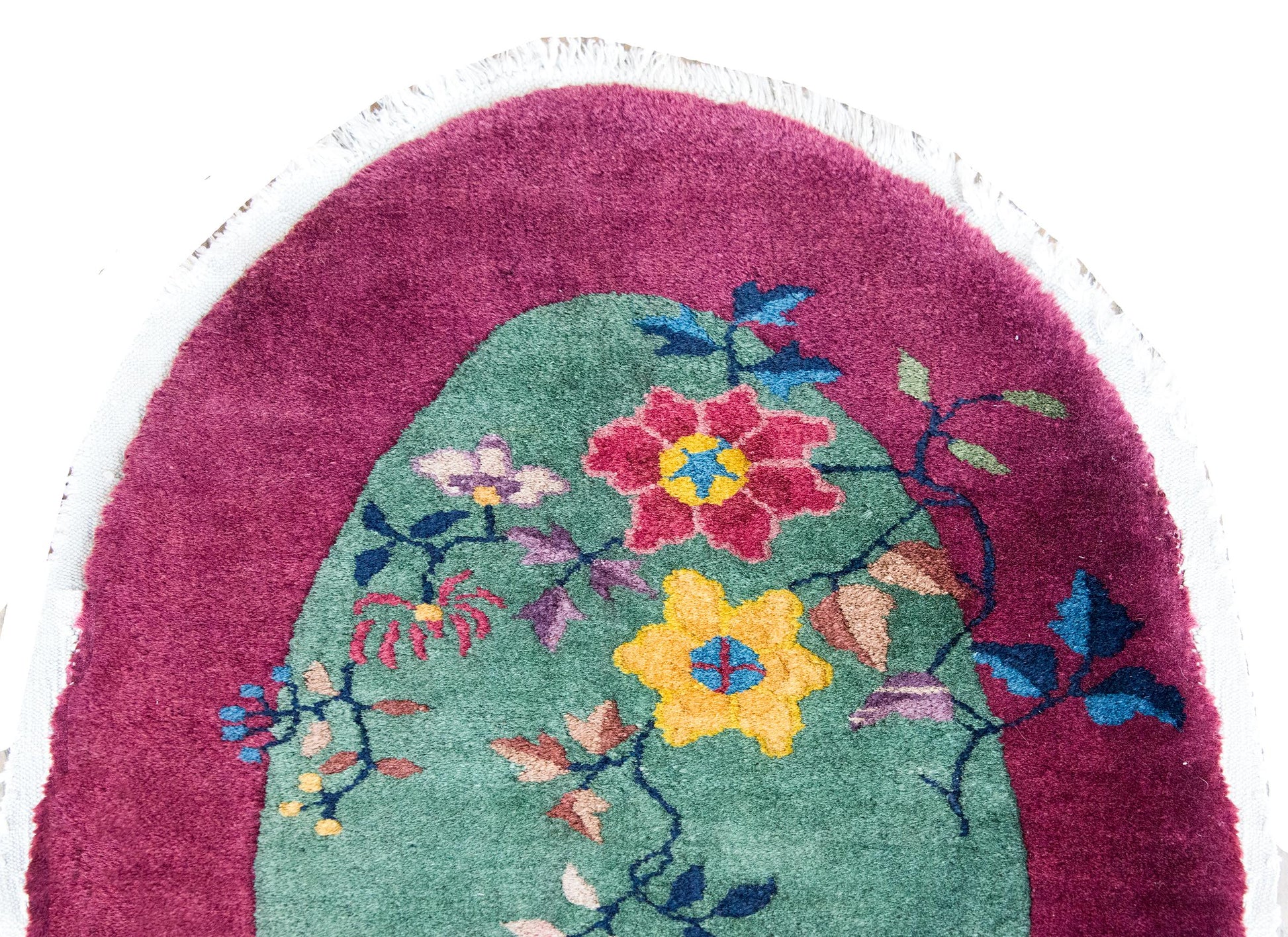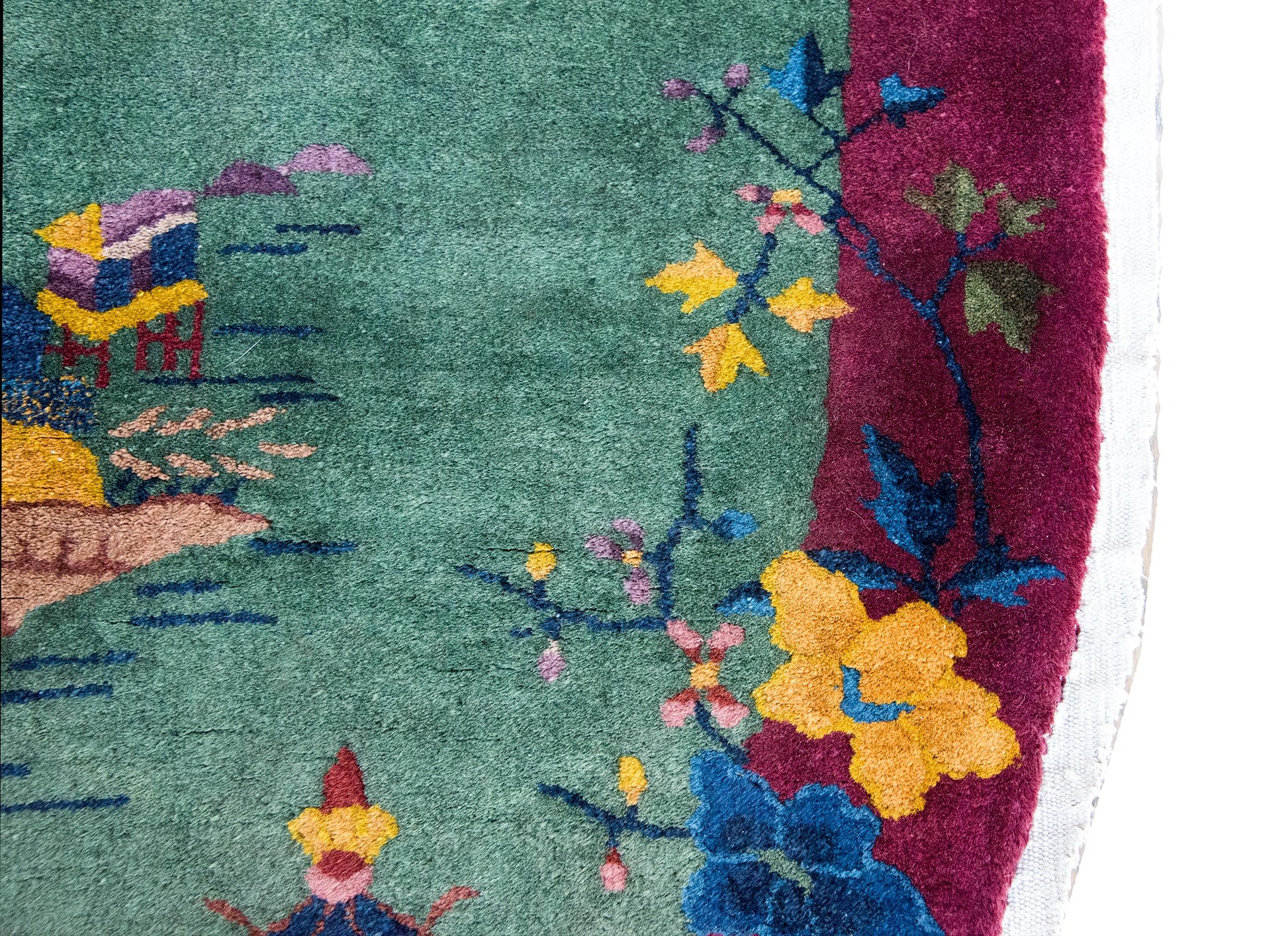 A charming petite early 20th century Chinese Art Deco oval rug with a green field surrounded by a wide violet border, and all overlaid with a garden landscape scene including a pagoda and garden pavilion at the edge of a pond, and with multi-colored peonies and chrysanthemum branches.