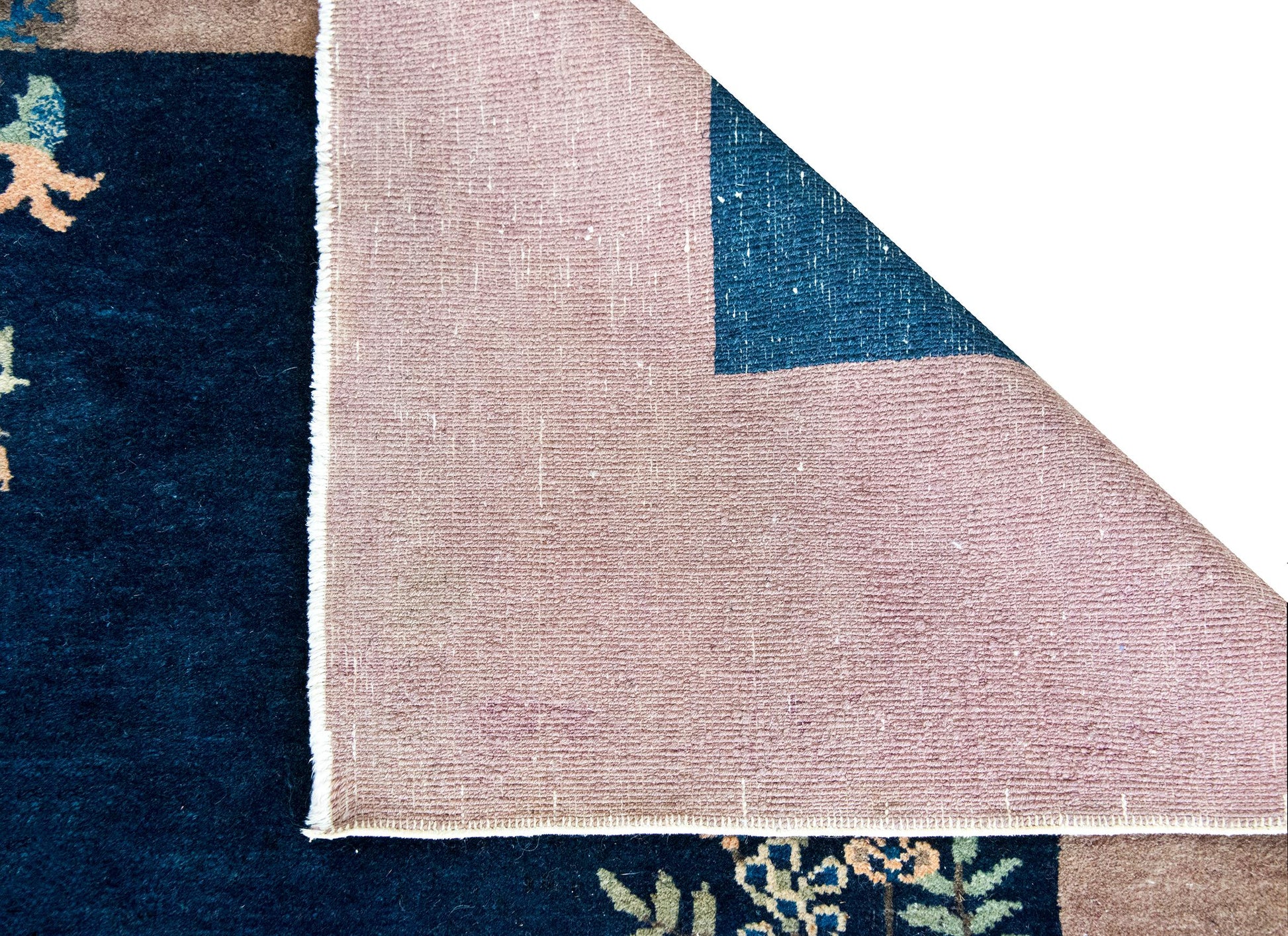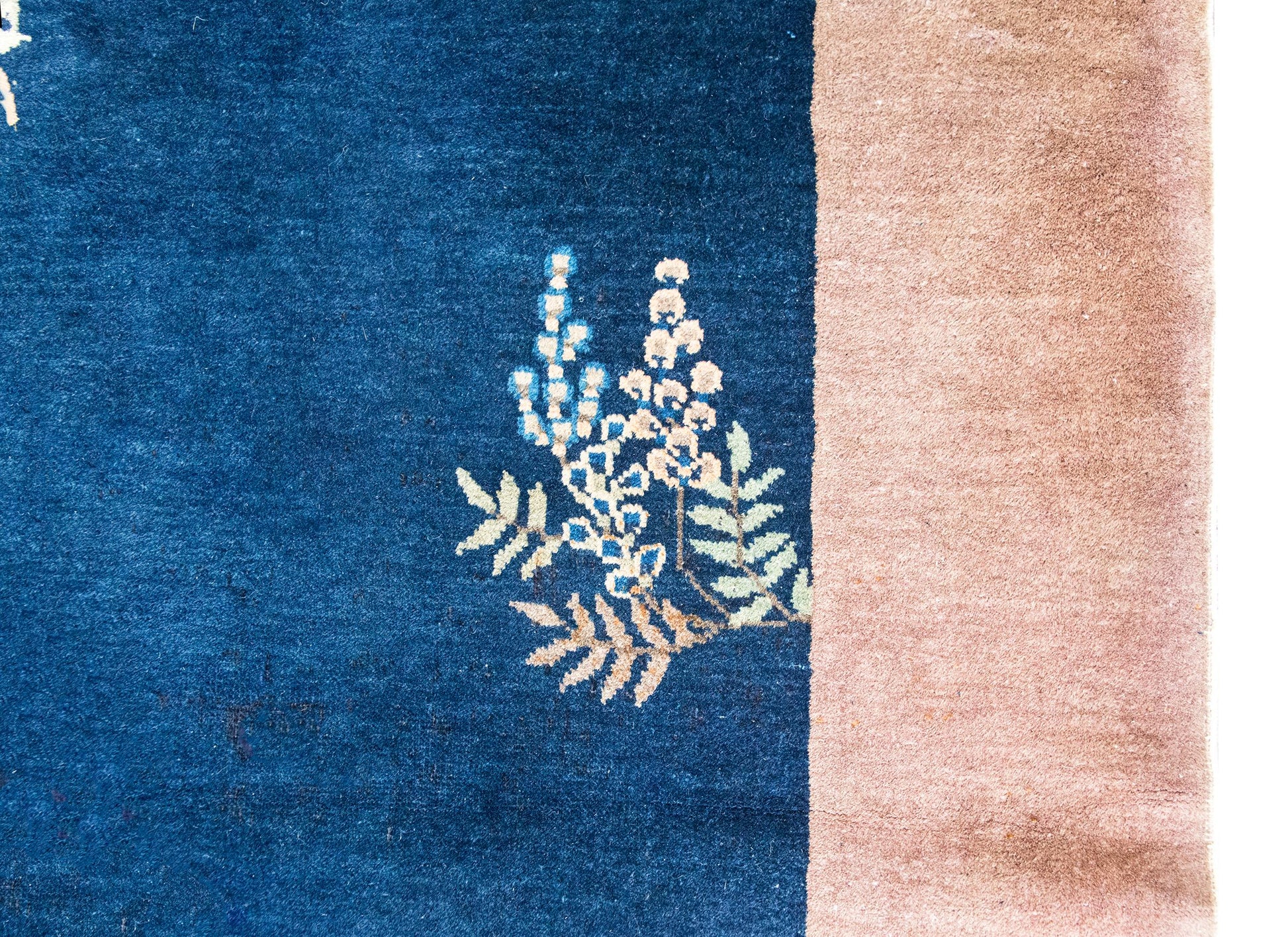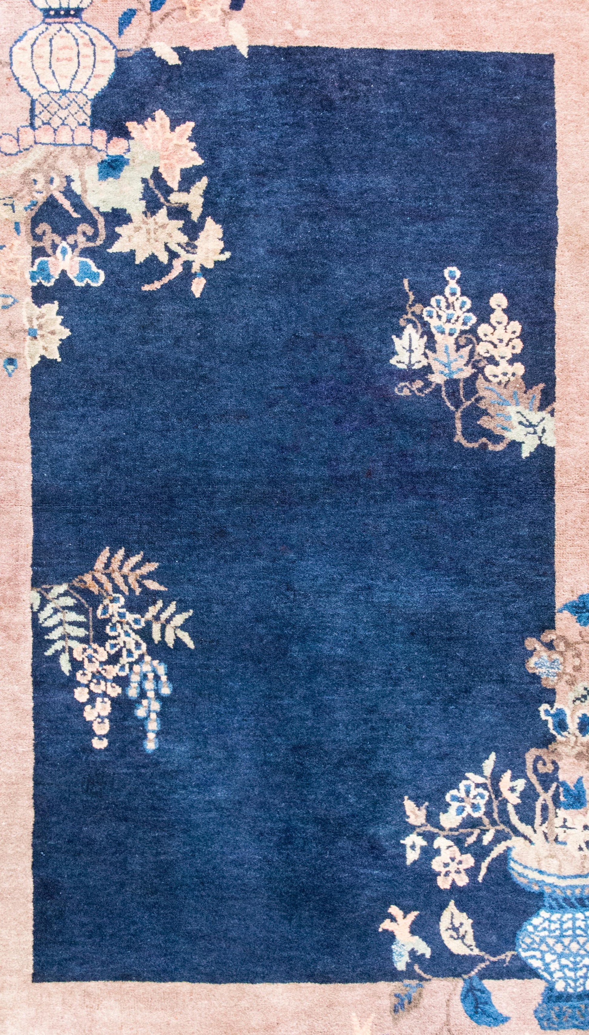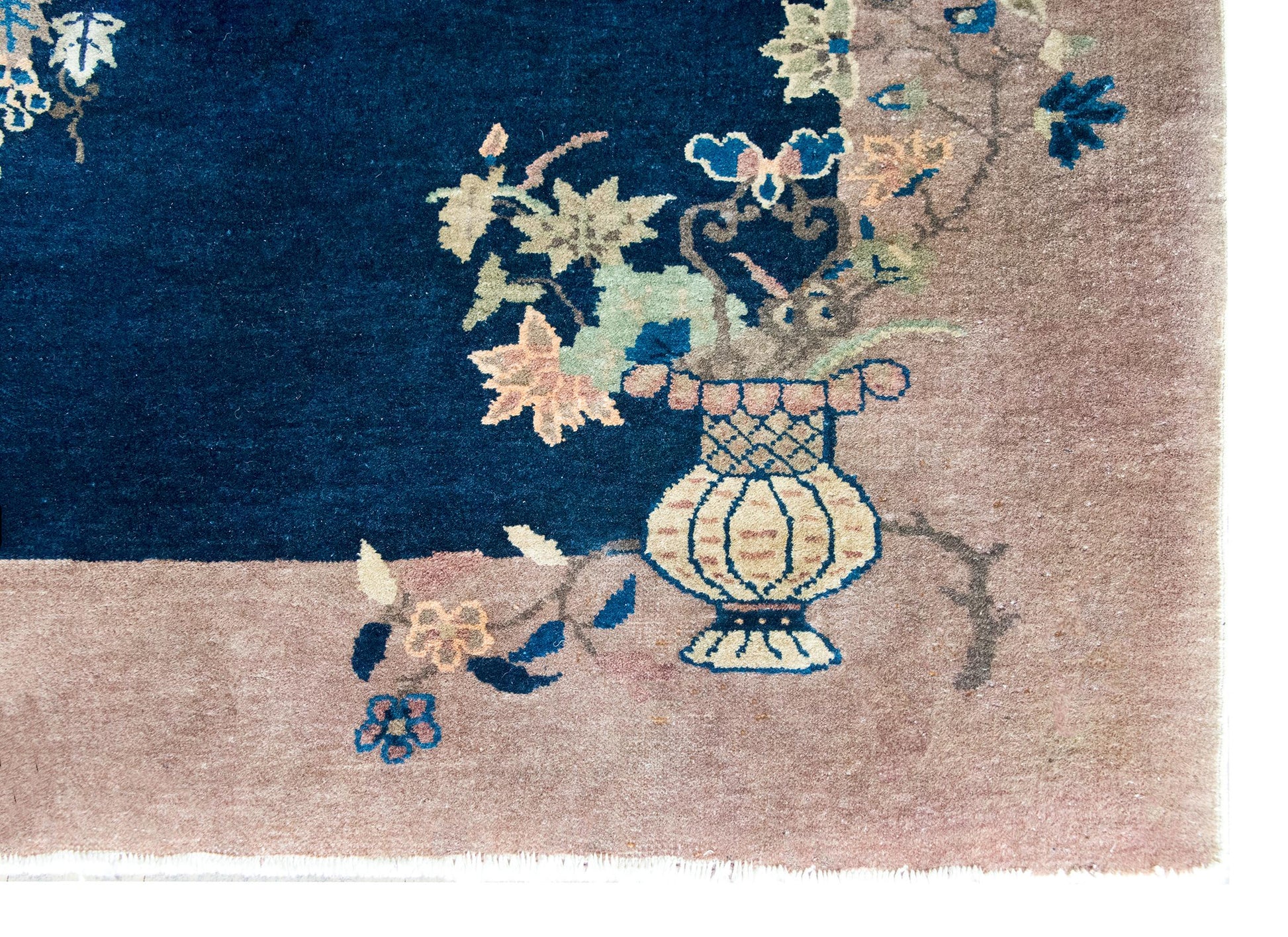 A luminous Chinese Art Deco rug from the 1920s–30s, hand-knotted with a striking palette of deep indigo, lavender, and soft blush. A bold rectangular navy field anchors the design, surrounded by a wide dusty rose border and punctuated by asymmetrical floral motifs, cascading vines, and a traditional Chinese vase—all rendered in soft pastel tones with subtle shading. The composition is both spare and expressive, emblematic of the Chinese Art Deco movement that flourished in cities like Shanghai during the early 20th century.