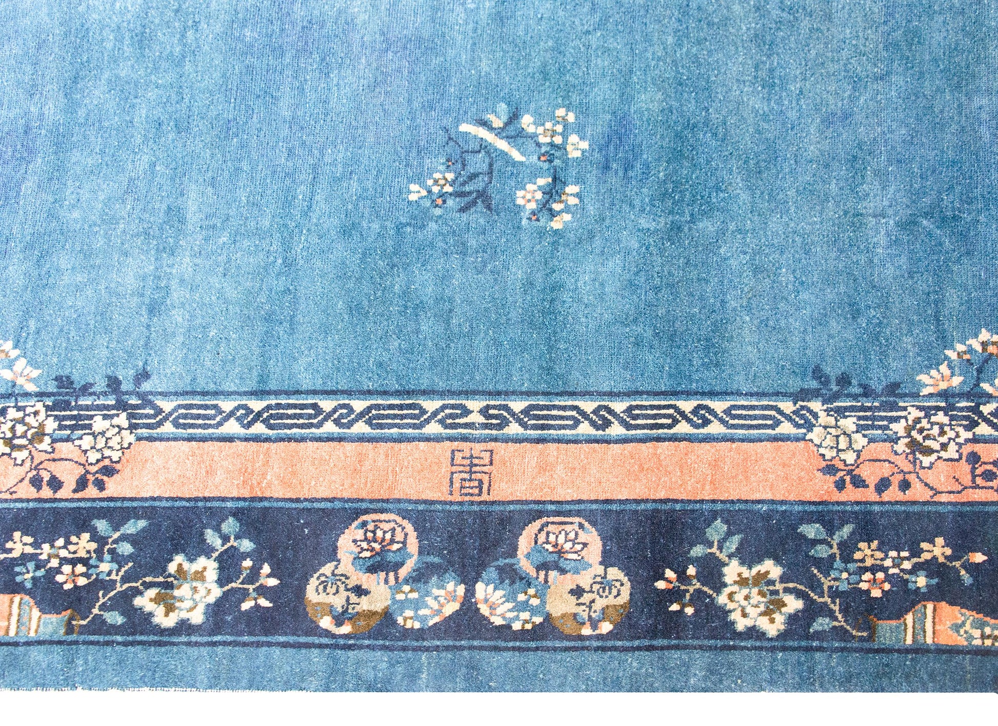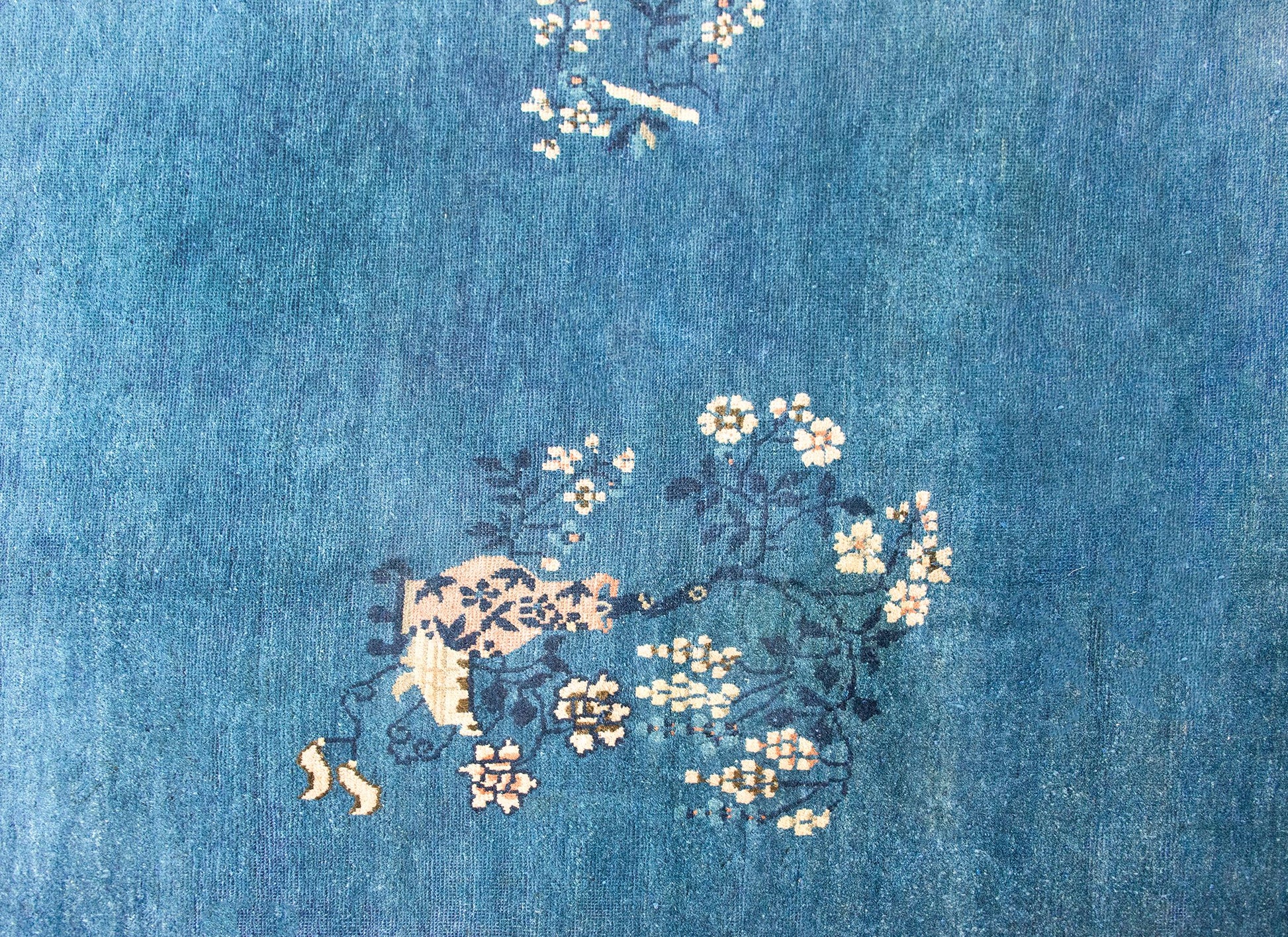 This early 20th-century Chinese Art Deco rug features a deep indigo field that draws you in immediately. Around it, several borders add layers of interest: one with a continuous meandering motif, another a slender salmon stripe, and a third decorated with a charming repeat of vases filled with peonies, chrysanthemums, and cherry blossoms. The field itself is scattered with similar vases and auspicious flowers, tying the whole design together with quiet elegance. The colors—various shades of indigo, soft salmon, and warm cream—are thoughtfully balanced and still retain the richness of their vegetable-dyed wool origins. What makes this rug special is how it combines traditional Chinese symbolism with the streamlined, graphic quality of Art Deco. It feels both timeless and fresh, perfect for those who appreciate subtle complexity on the floor or wall.