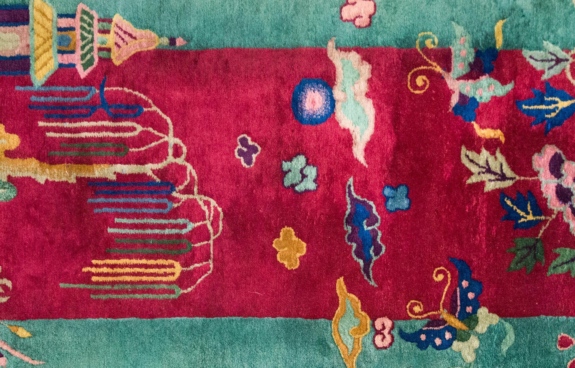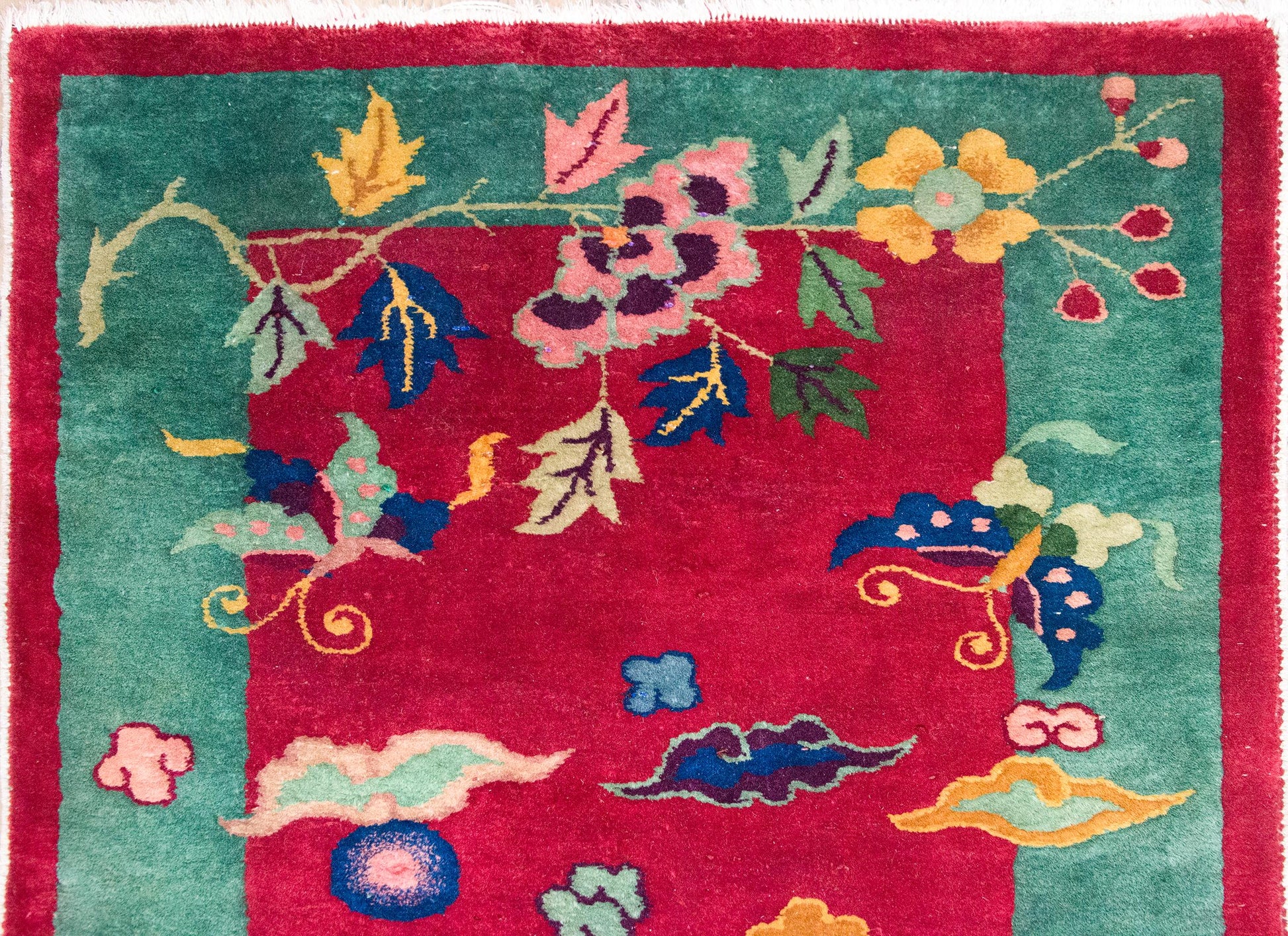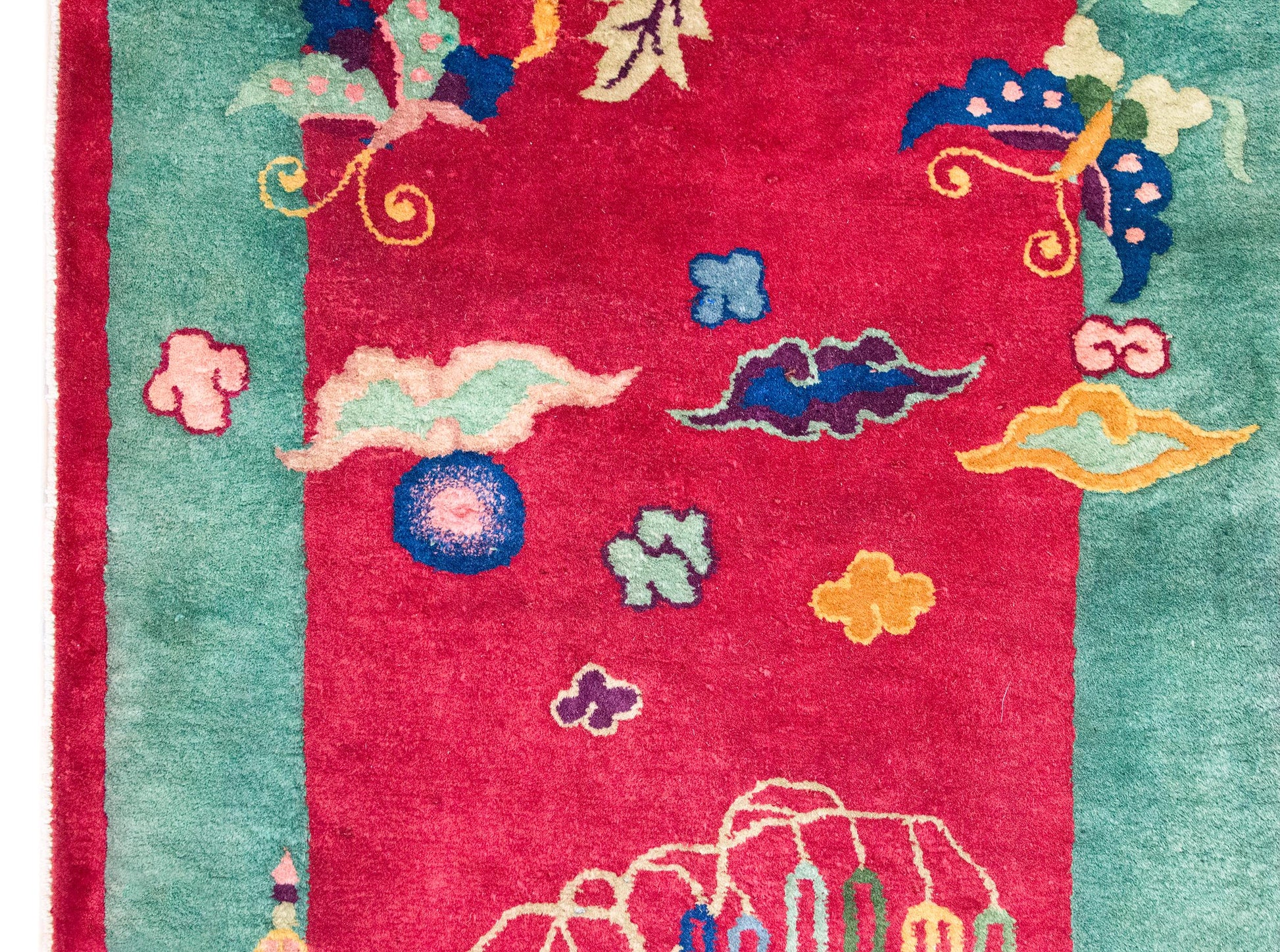A charming early 20th century Chinese Art Deco rug with a cranberry field featuring a multi-colored whipping willow tree standing beside a pagoda, with billowing clouds, butterflies, and peonies floating above. The border is wide with a mint green color, and the entire rug is woven in varying shades of indigo, green, gold, pink, and violet.
