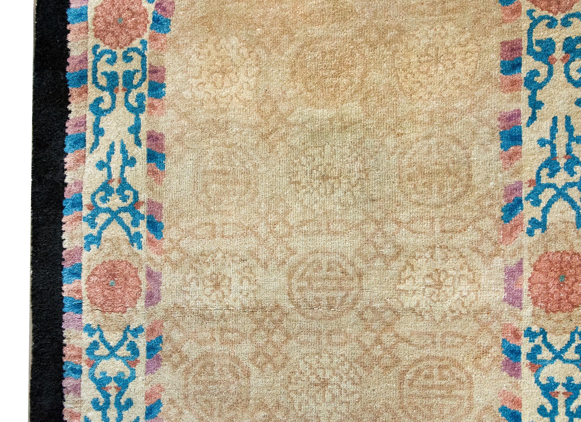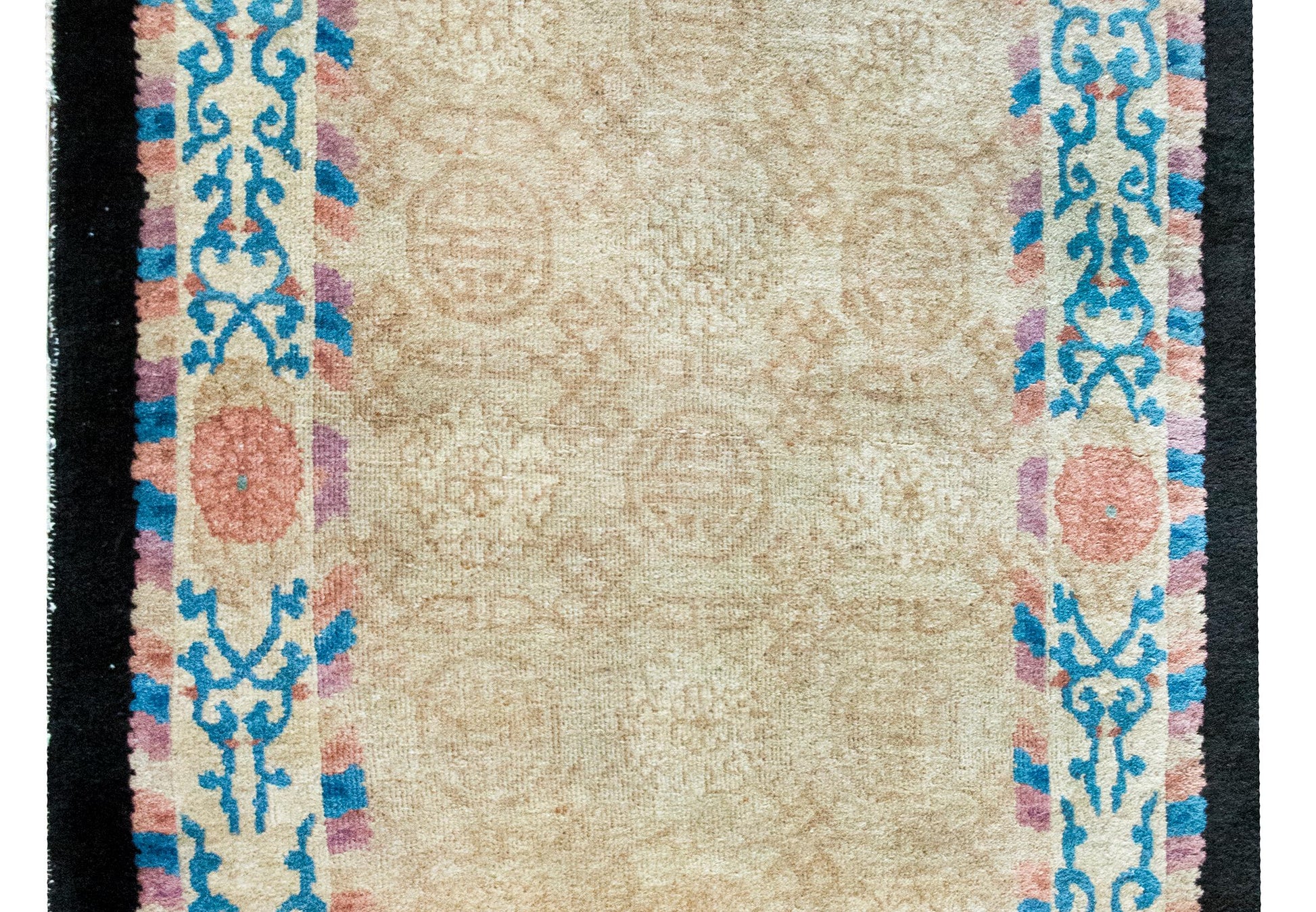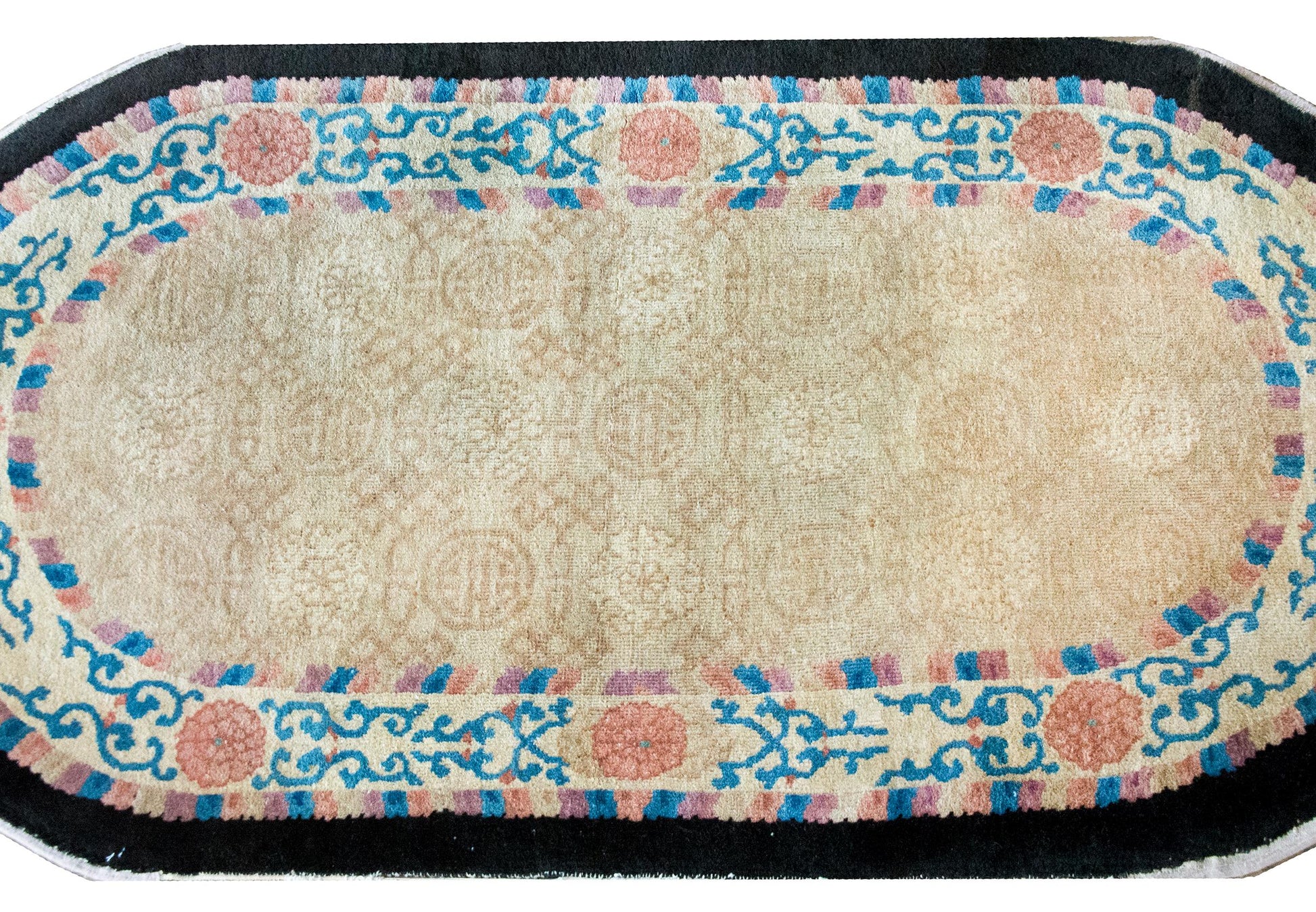 A wonderful early 20th century Chinese Peking oval rug with a central field woven with a subtle tone on tone Shou character and peony pattern, and surrounded by a charming border with large pink peonies and indigo scrolling vines.