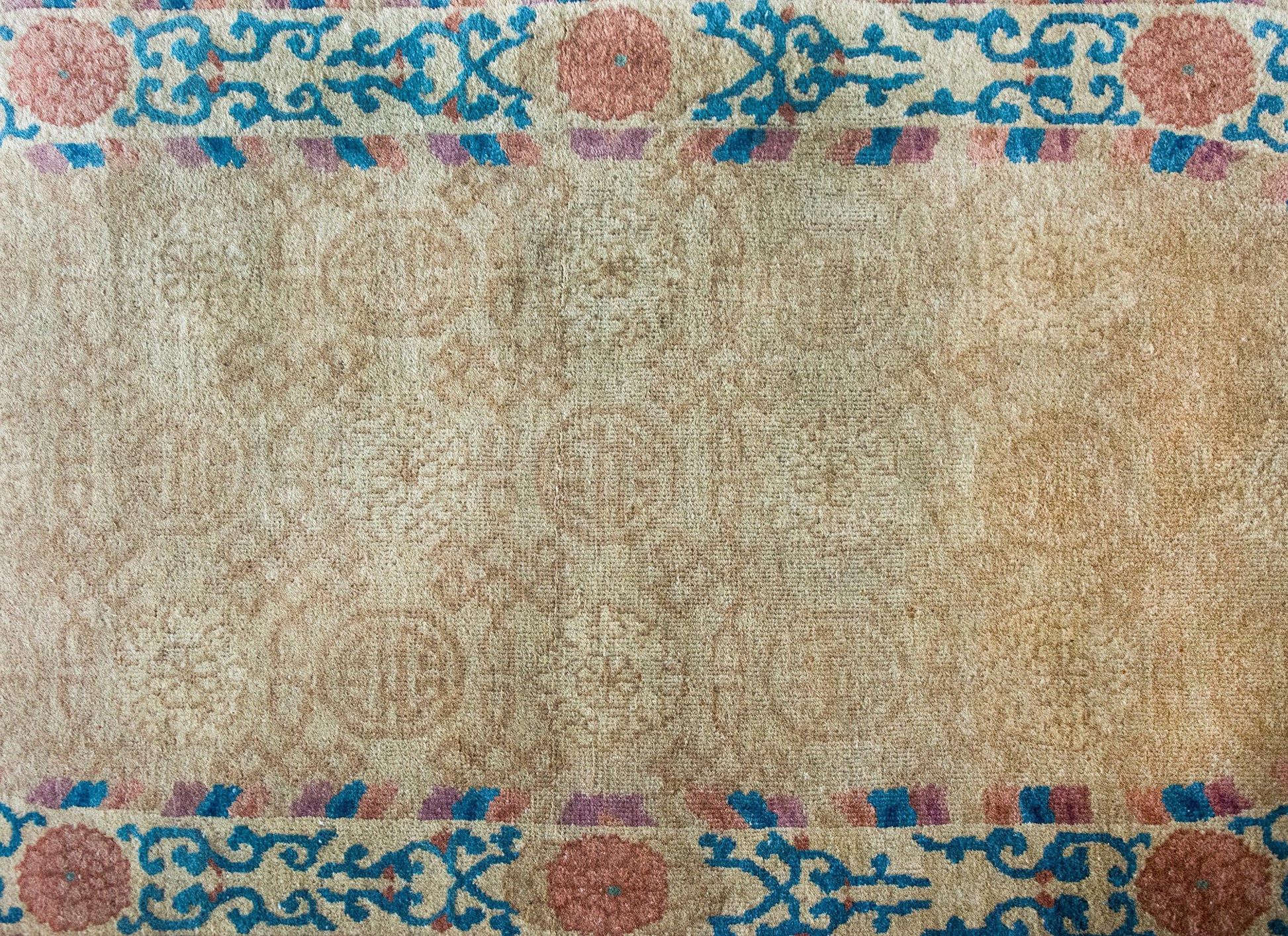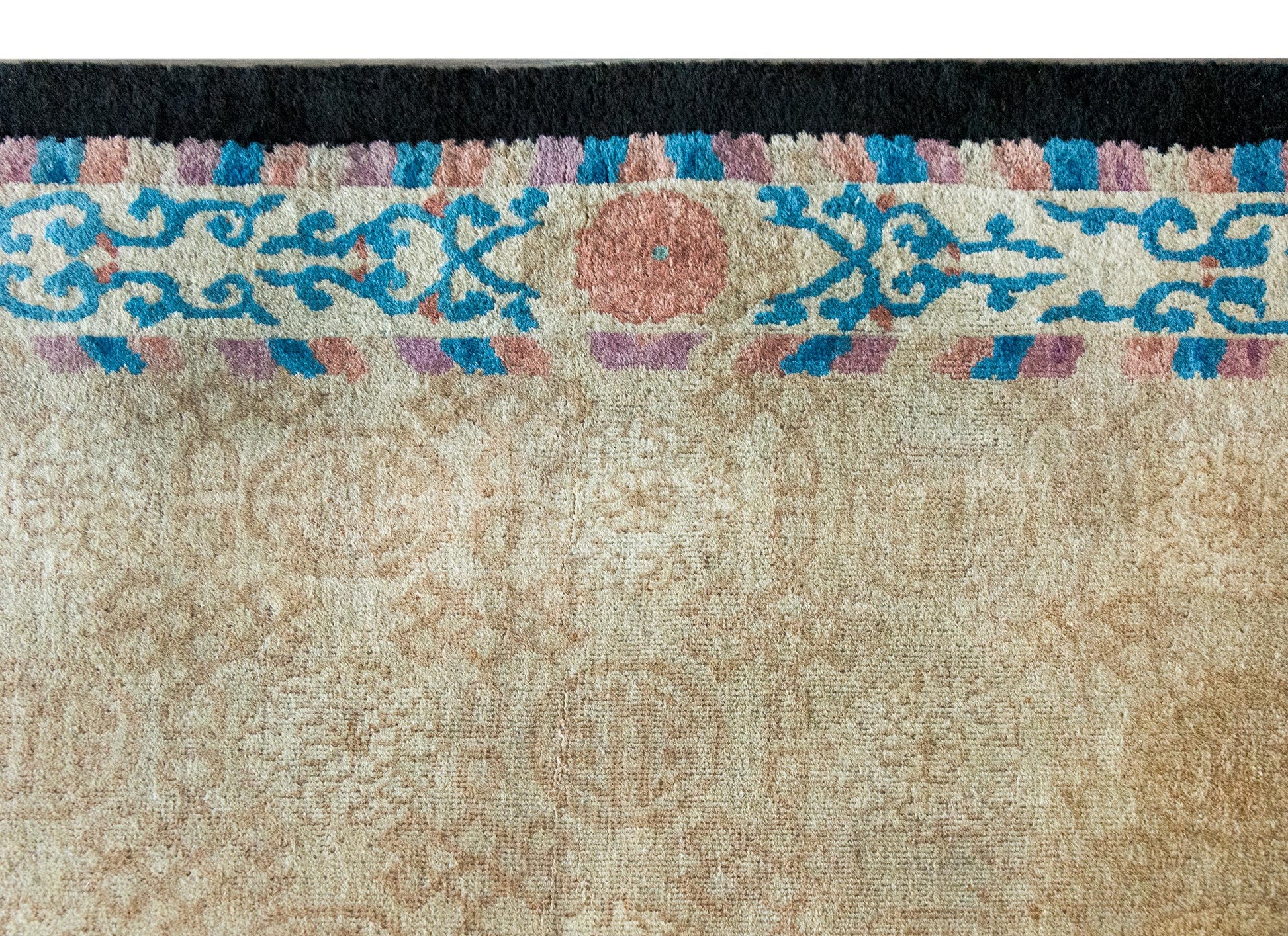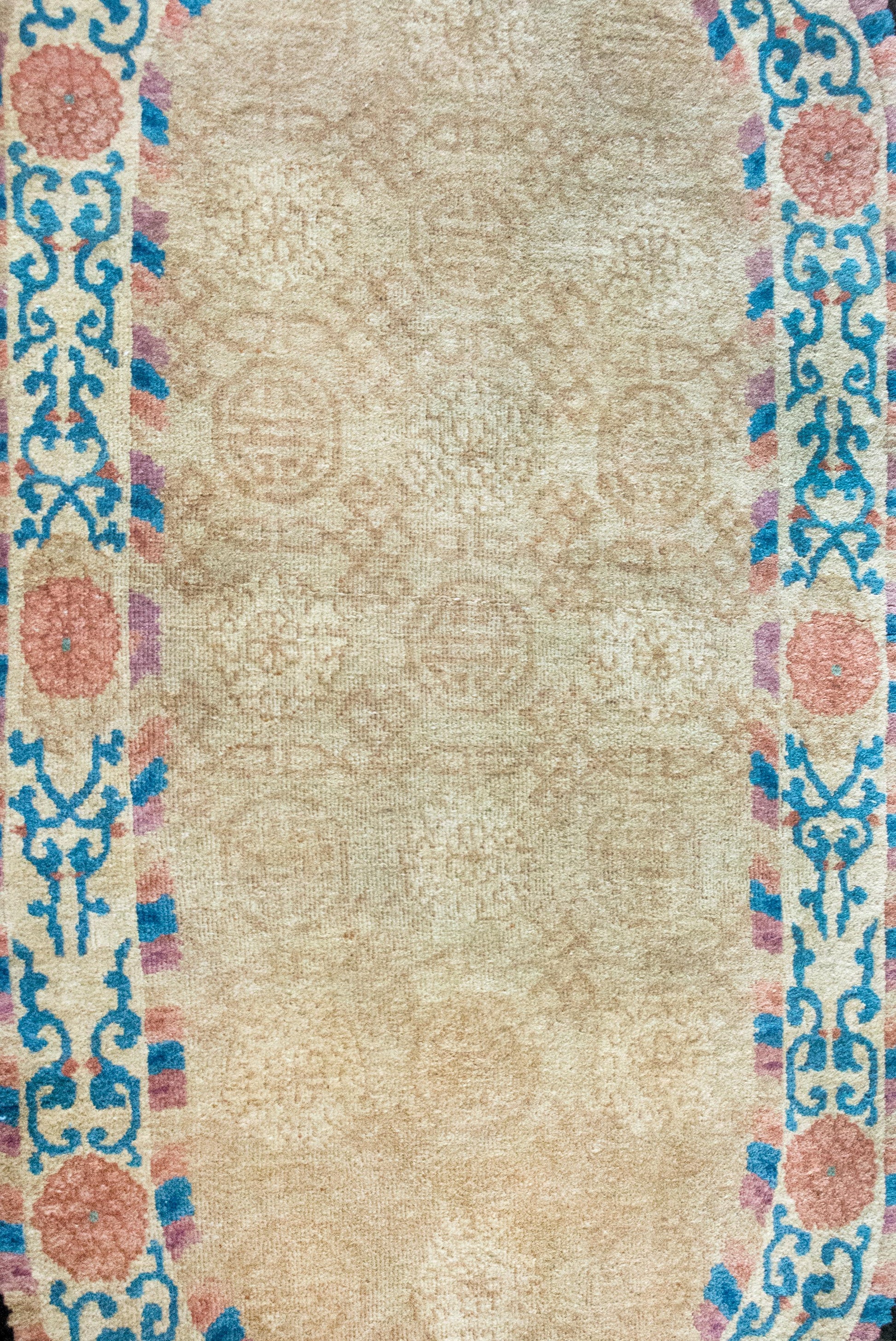 A wonderful early 20th century Chinese Peking oval rug with a central field woven with a subtle tone on tone Shou character and peony pattern, and surrounded by a charming border with large pink peonies and indigo scrolling vines.