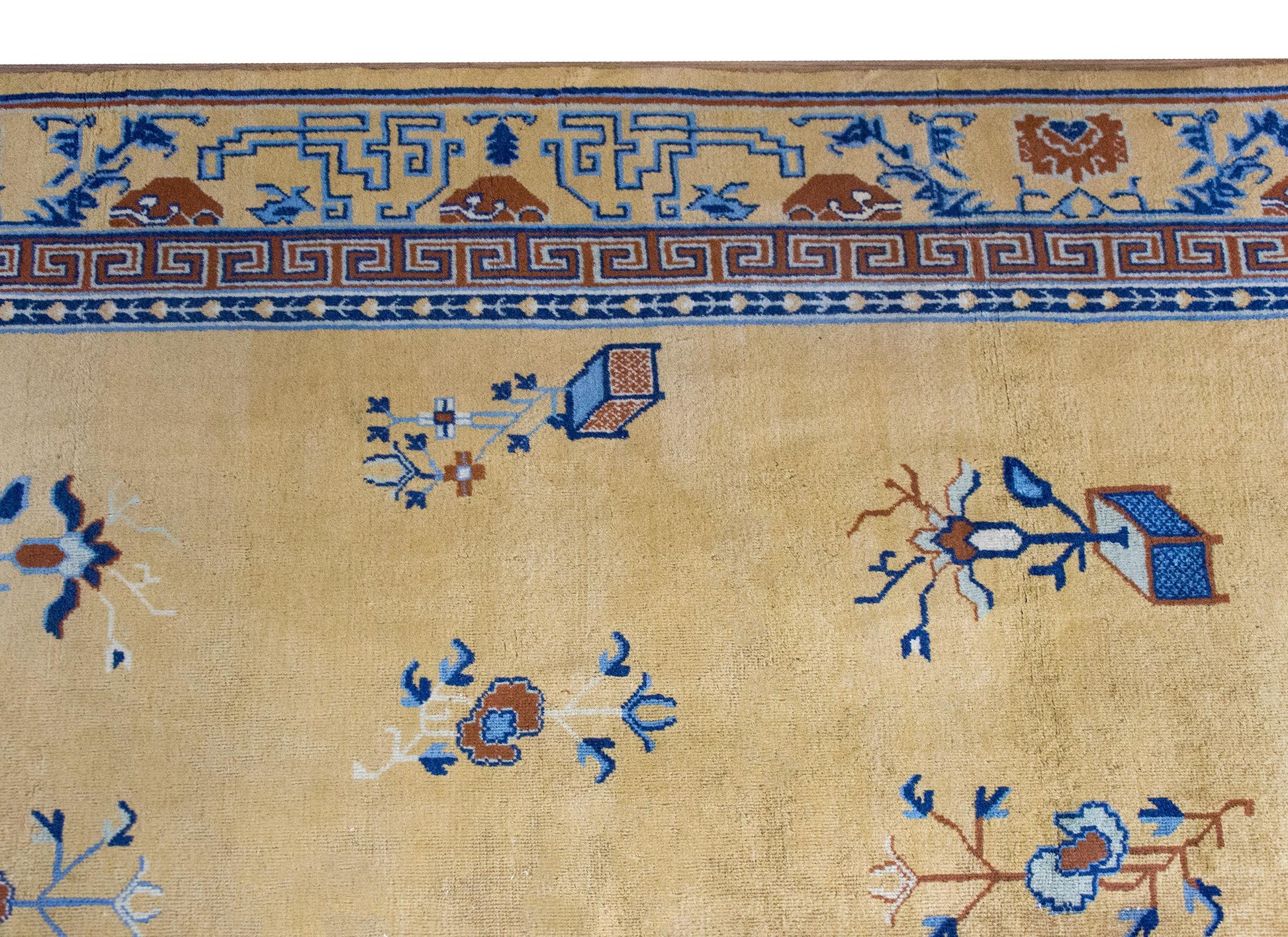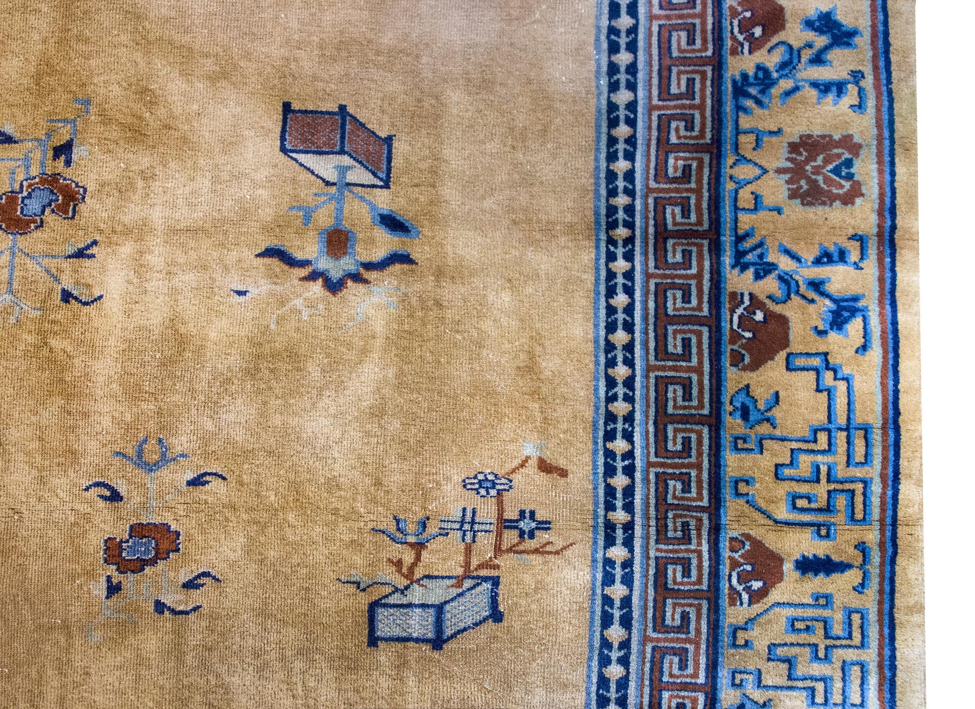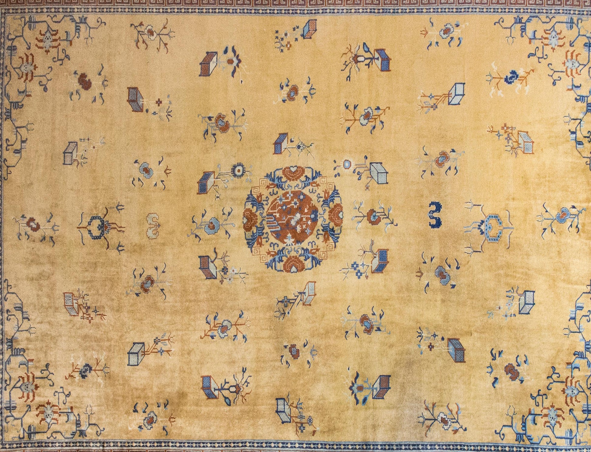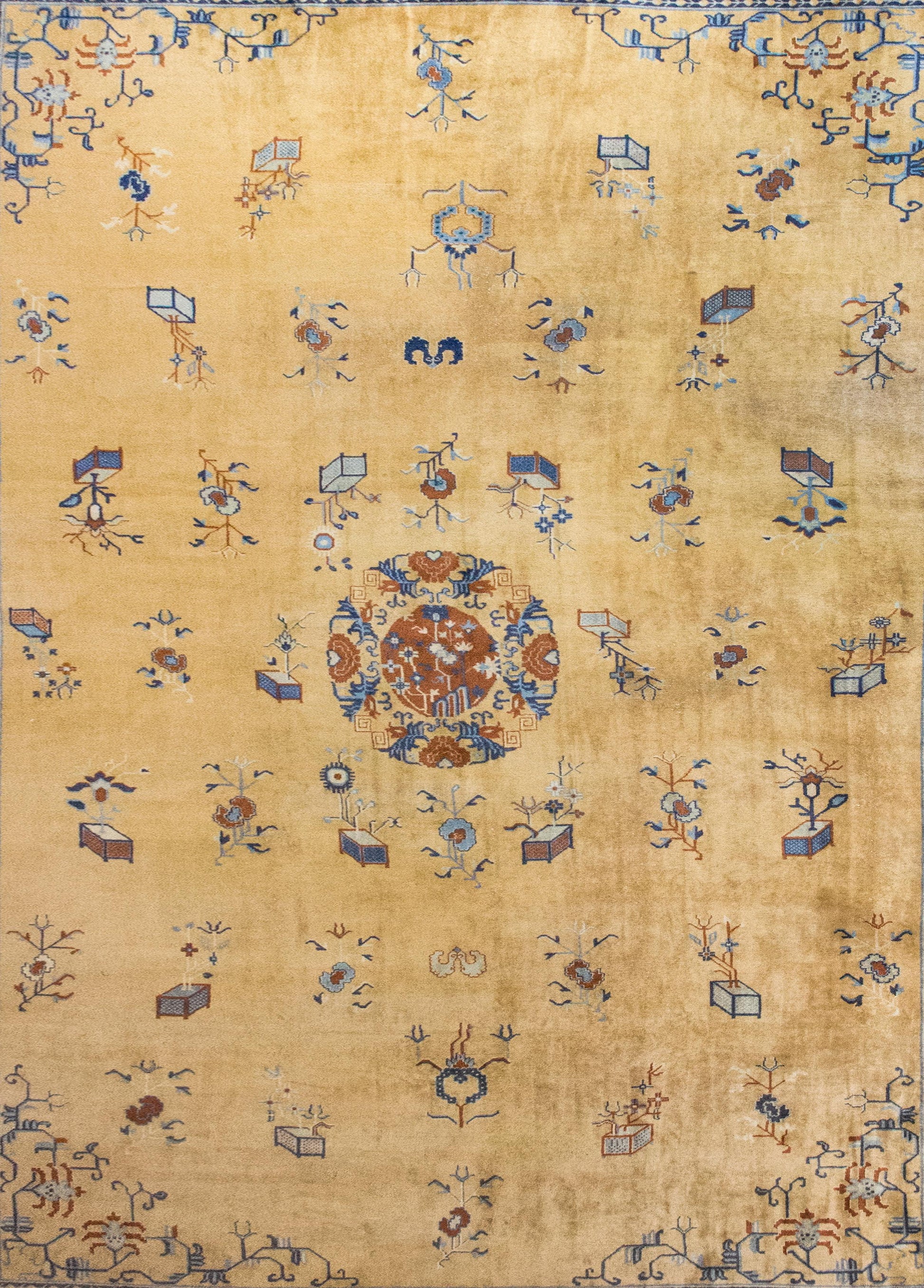 A rare and exquisite early 20th-century Chinese Peking rug, distinguished by its luminous gold field—a sought-after hue that adds warmth and depth. At its heart, a central medallion blooms with stylized cherry blossoms and peonies, symbols of renewal and prosperity, woven in elegant shades of light and dark indigo with rich brown accents. Surrounding this focal point, a profusion of potted flowers fills the field, each rendered with delicate artistry, creating a rhythmic and balanced composition. The border is a masterwork of design, featuring a highly stylized floral-patterned outer stripe, an inner meandering motif that lends a sense of movement, and a petite floral stripe that adds a final touch of refinement. The interplay of intricate patterns and harmonious colors makes this rug a true statement piece—steeped in tradition yet effortlessly suited for a modern interior. A rare find, it is a testament to the enduring beauty of Chinese craftsmanship.