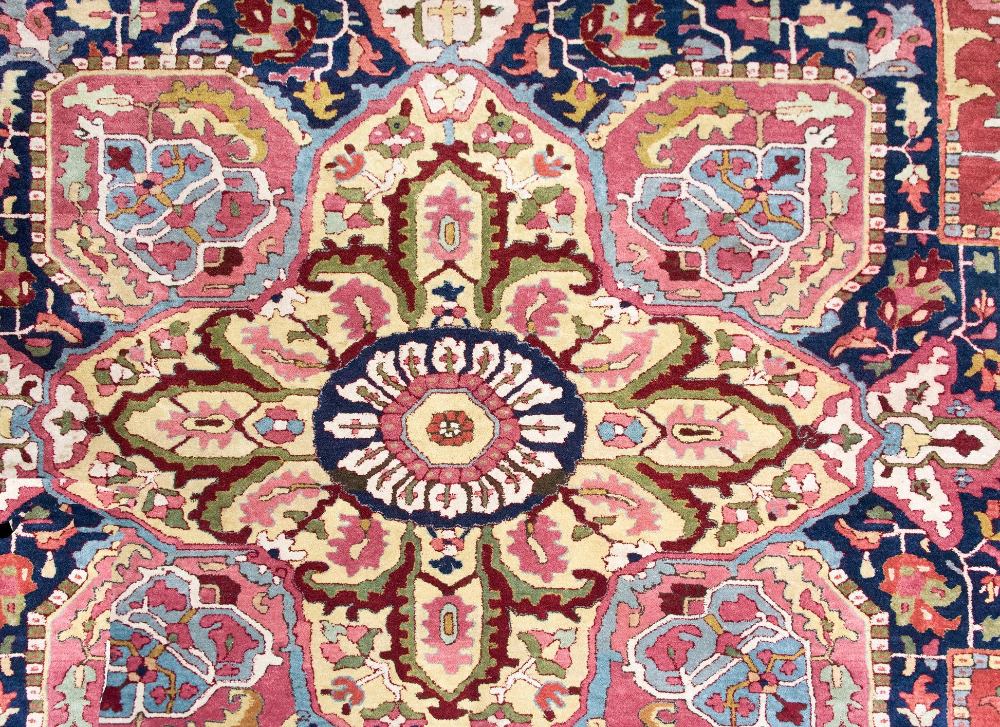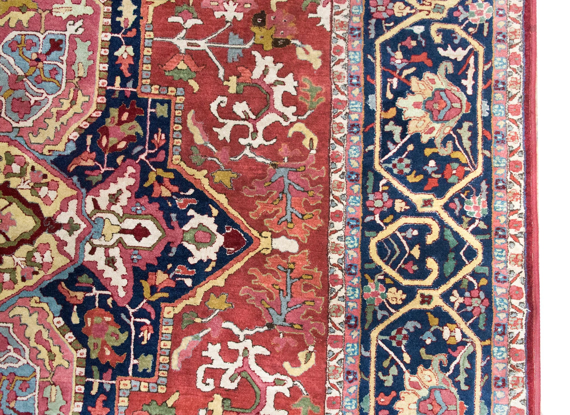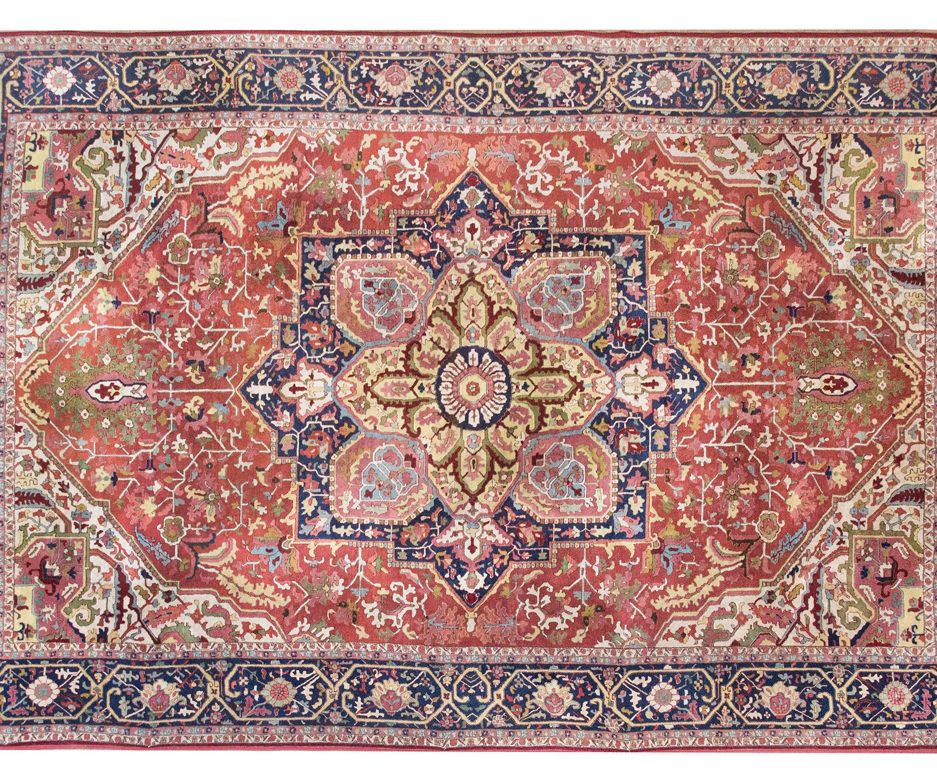 A rare and wonderful early 20th century German Tetex rug woven with a traditional Persian Heriz pattern including a large central floral medallion living amidst a field of more stylized flowers and scrolling vines, surrounded by a wide floral patterned border, and all woven in traditional Heriz varying shades of crimson, pink, indigos, cream, gold, and green colored wool.