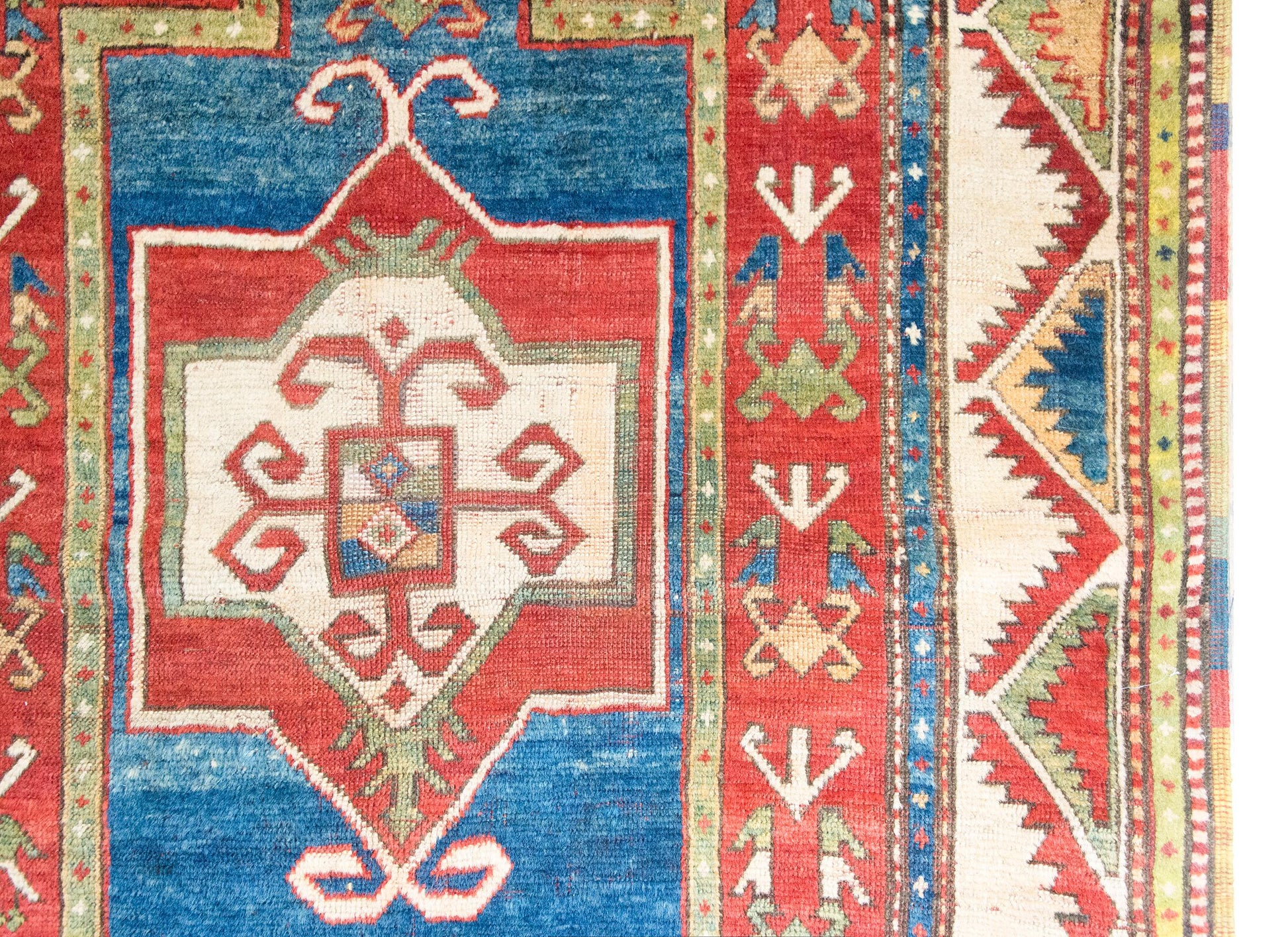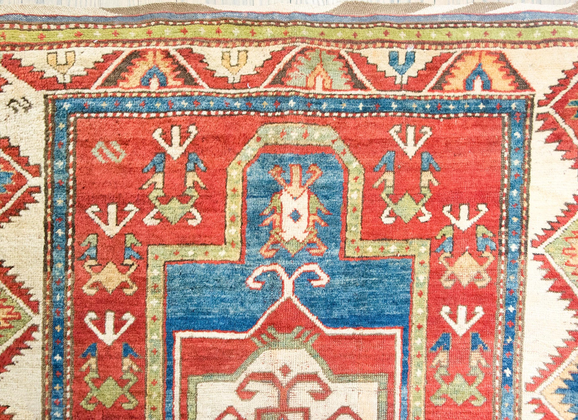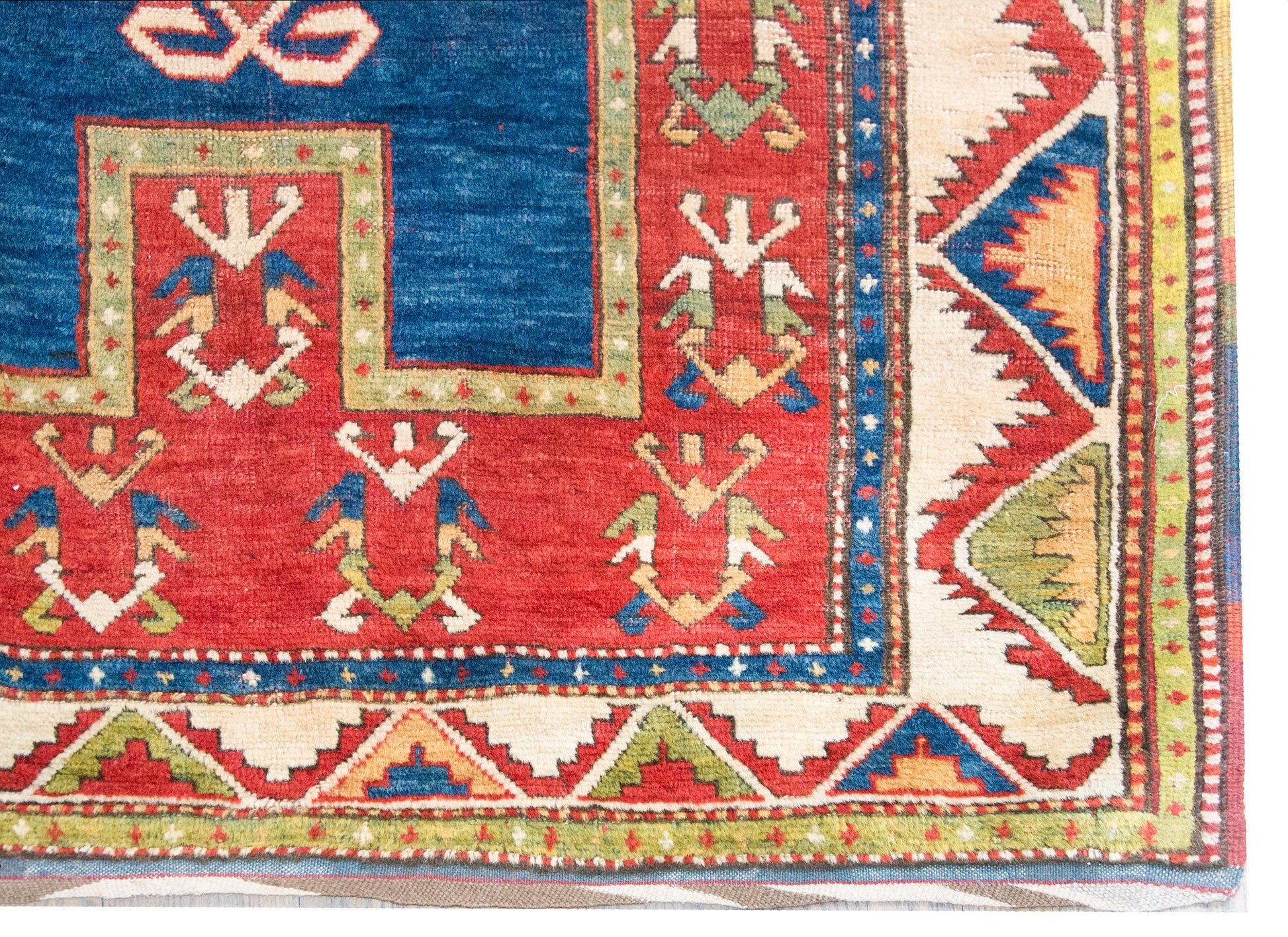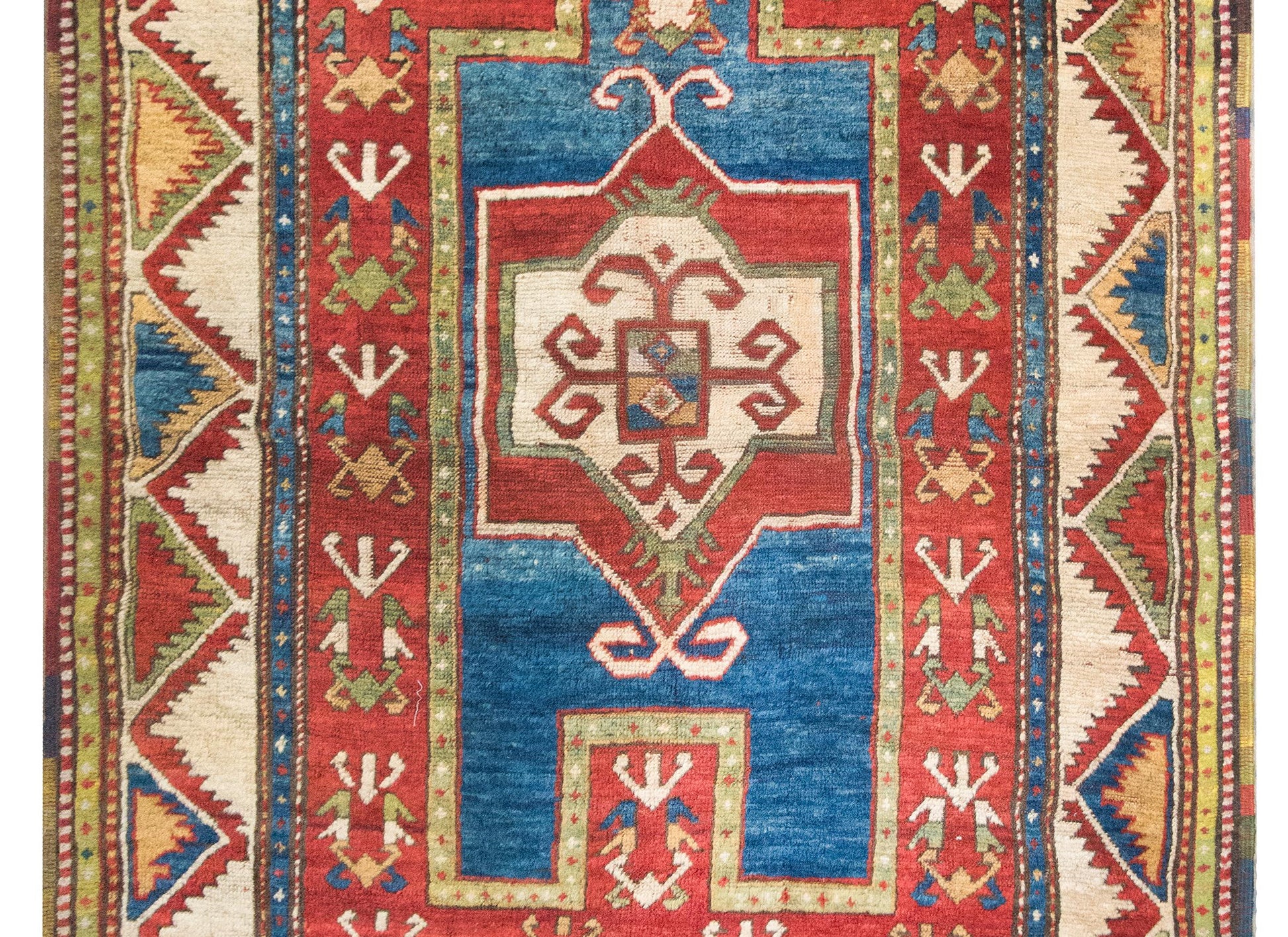Woven in crimson, varying shades of indigo, green, and white wool, the rug’s natural dyes have mellowed beautifully over time, enhancing its depth and character. Kazak prayer rugs, traditionally woven by nomadic and village artisans, were not only used in daily worship but also valued as expressions of cultural identity and artistry. With its striking balance of floral and geometric elements, this rug remains a timeless testament to the enduring beauty of Caucasian weaving traditions.