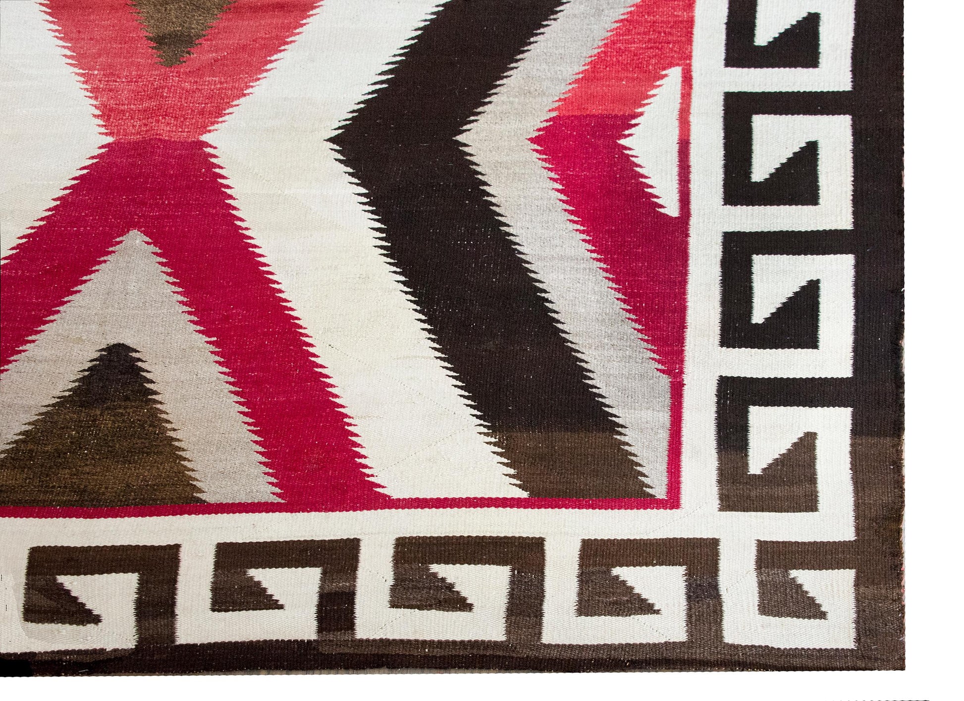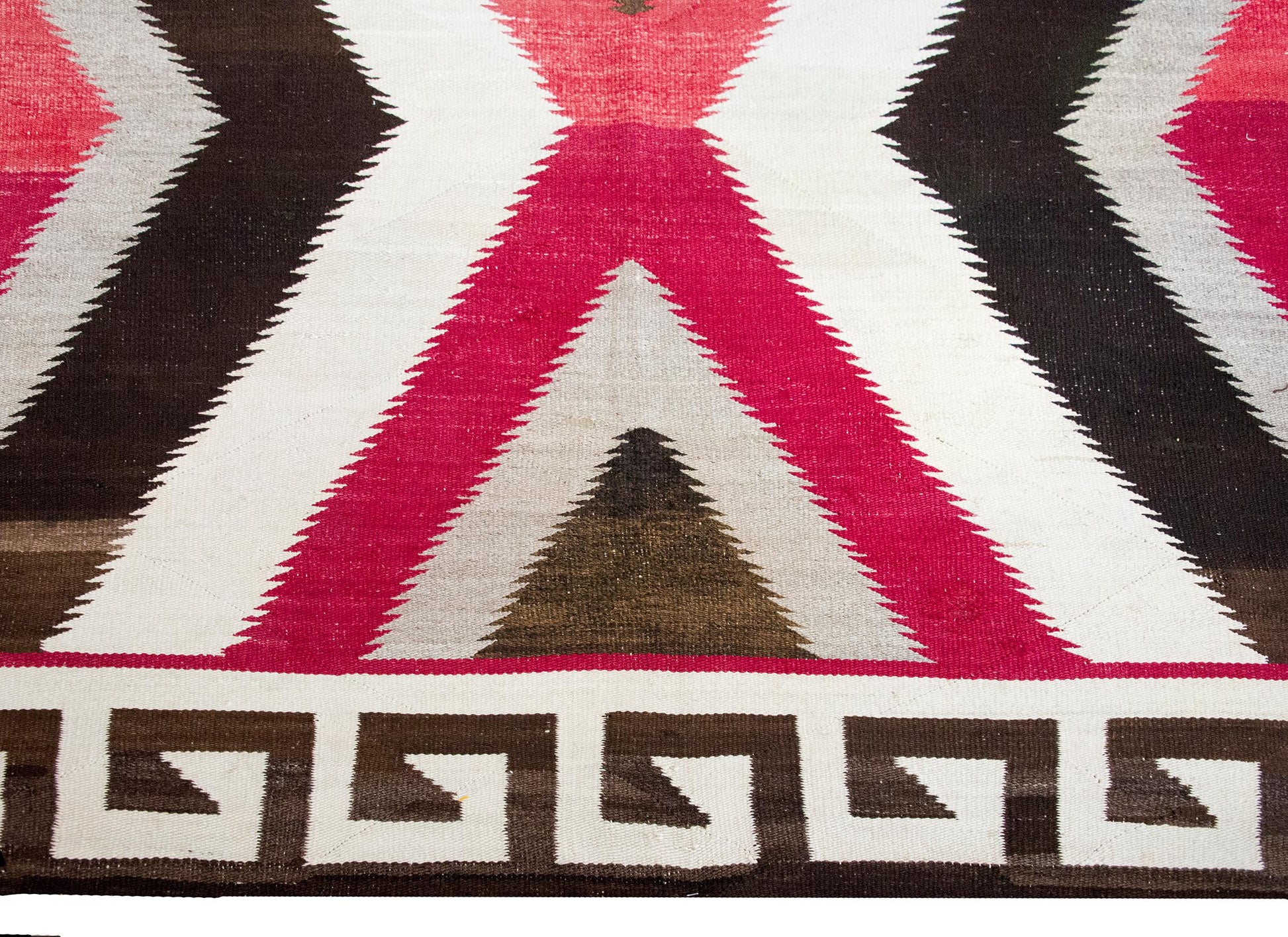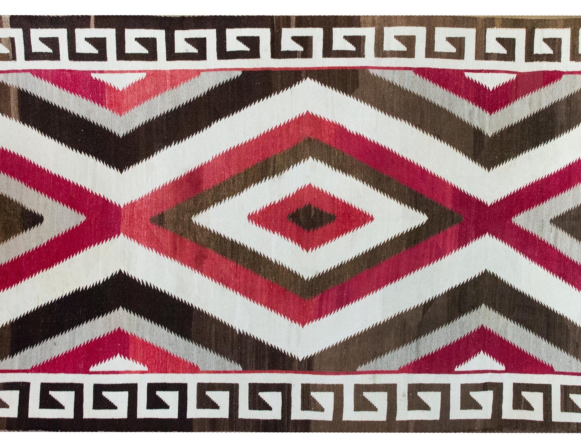 What sets this piece apart is not only its bold, balanced design but its scale—large Navajo rugs from this period are exceedingly uncommon, as most were woven in smaller, more manageable sizes. Framing the central field is a striking dark brown and white Greek key border, likely infused with symbolic meaning—perhaps referencing sacred paths or natural forces like lightning, both recurring themes in Navajo visual language. Woven by a Diné (Navajo) weaver in the American Southwest, this rug is a rare and powerful example of tradition, symbolism, and scale.