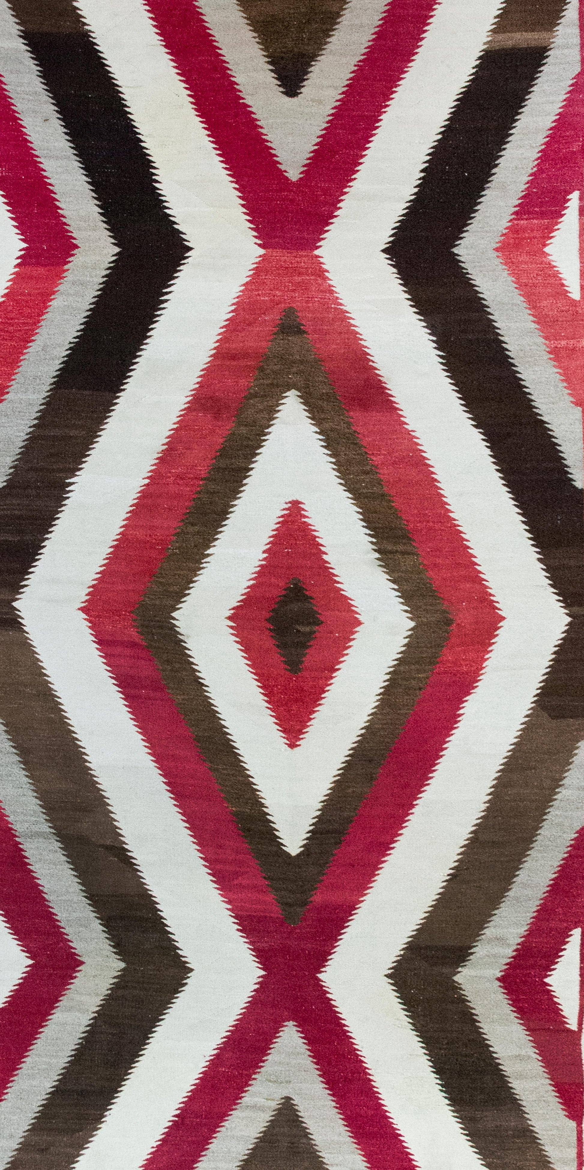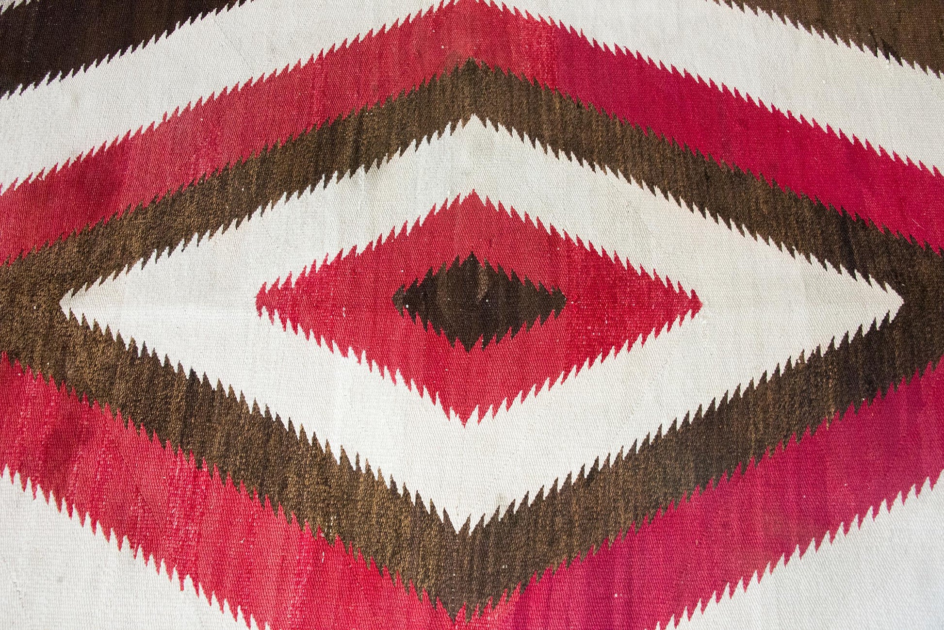 Woven around 1900, this exceptionally rare large-format Navajo rug is a striking example of Indigenous artistry on an ambitious scale. At its center lies a natural brown diamond medallion, from which radiates a dynamic series of crimson, white, and dark brown diamonds—each shape echoing outward in rhythmic precision. Hand-spun wool, natural dyes, and aniline dye give the rug its deep, earthy palette and luminous texture.