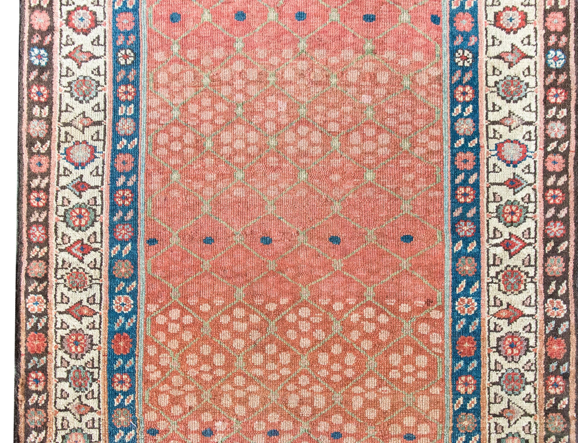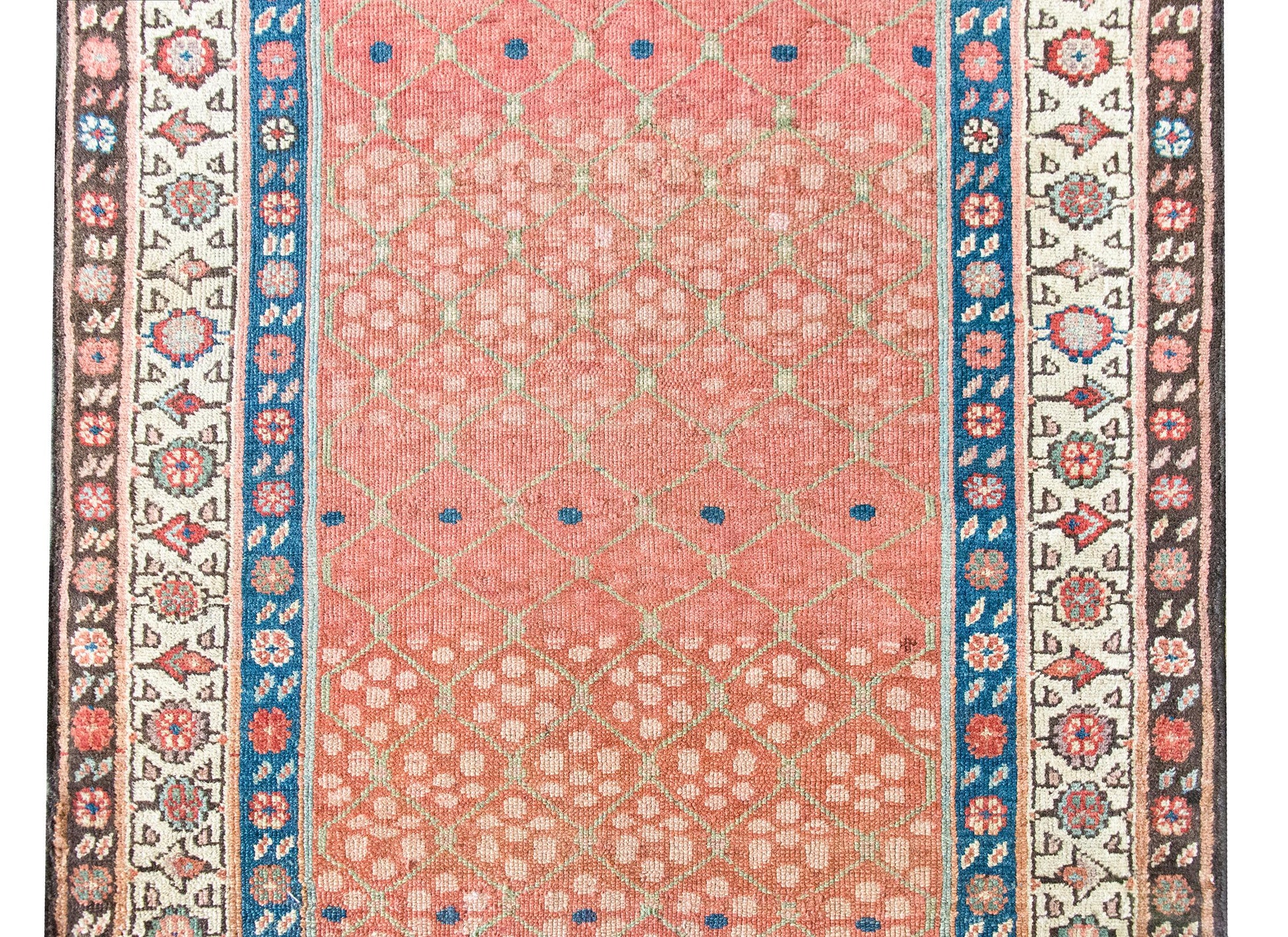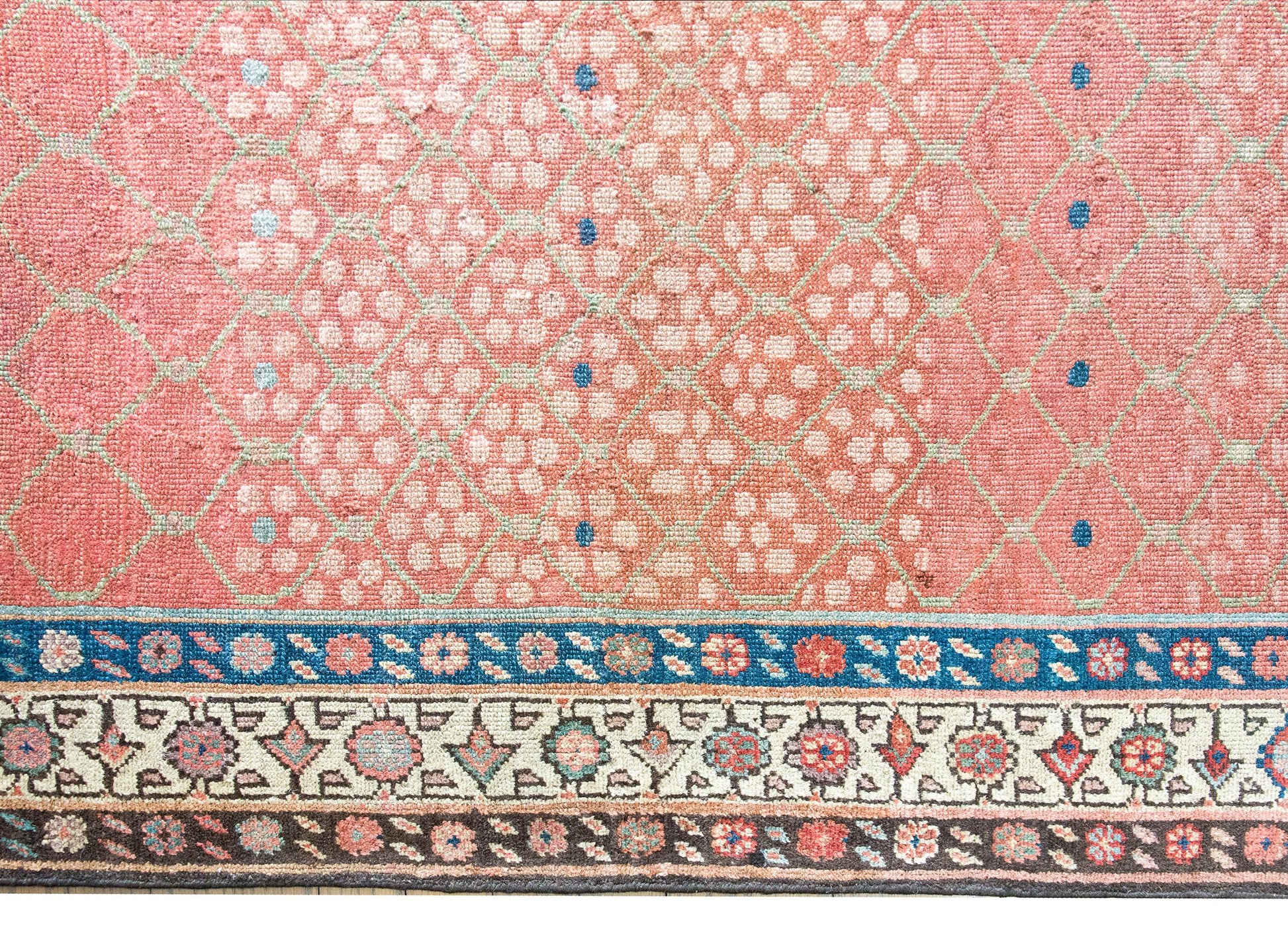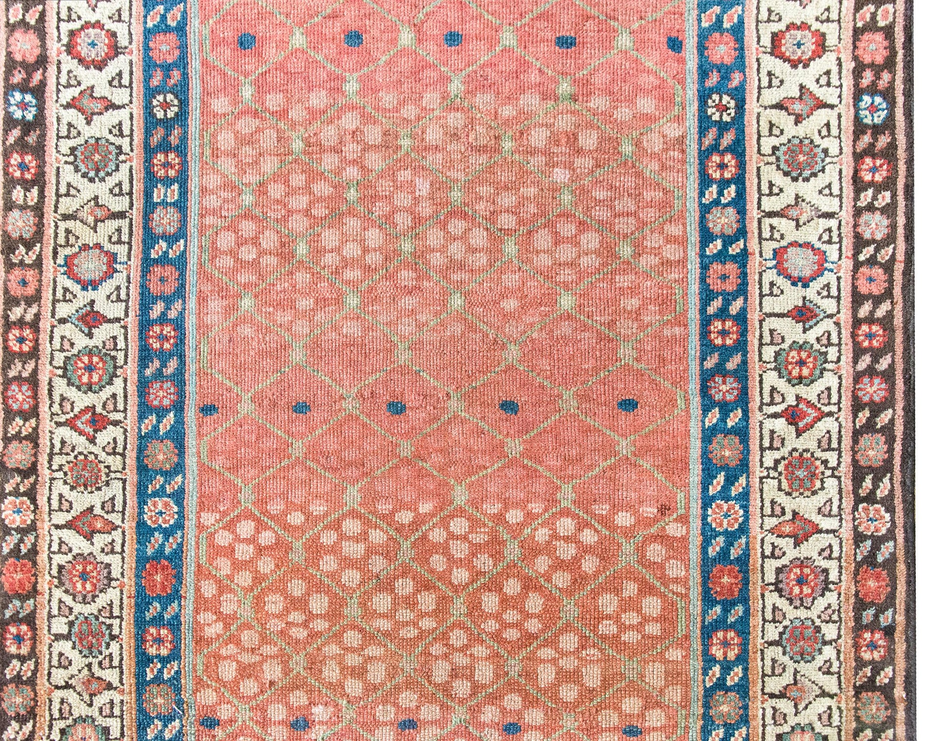 Woven circa 1900, this early 20th-century Persian Karabakh runner is a lyrical example of the region’s romantic, floral aesthetic. The central field is an utter delight—an airy pale green trellis meanders across the length, entwined with stylized blossoms rendered in soft abrash pinks and vibrant raspberry wool. The border is classically Karabakh, composed of three distinct floral bands, each with its own rhythm and palette—indigo, crimson, pale yellow, white, pink, and brown wool all working in elegant concert. Karabakh rugs hail from the mountainous region along the modern-day border of Iran and the South Caucasus. These pieces are traditionally woven by Armenian and Azerbaijani artisans, known for their refined color sensibility and deep connection to regional floral motifs. Long prized for their elegance and character, Karabakh runners like this one add a painterly, almost antique textile quality to a hallway or staircase—a quiet flourish that speaks volumes.