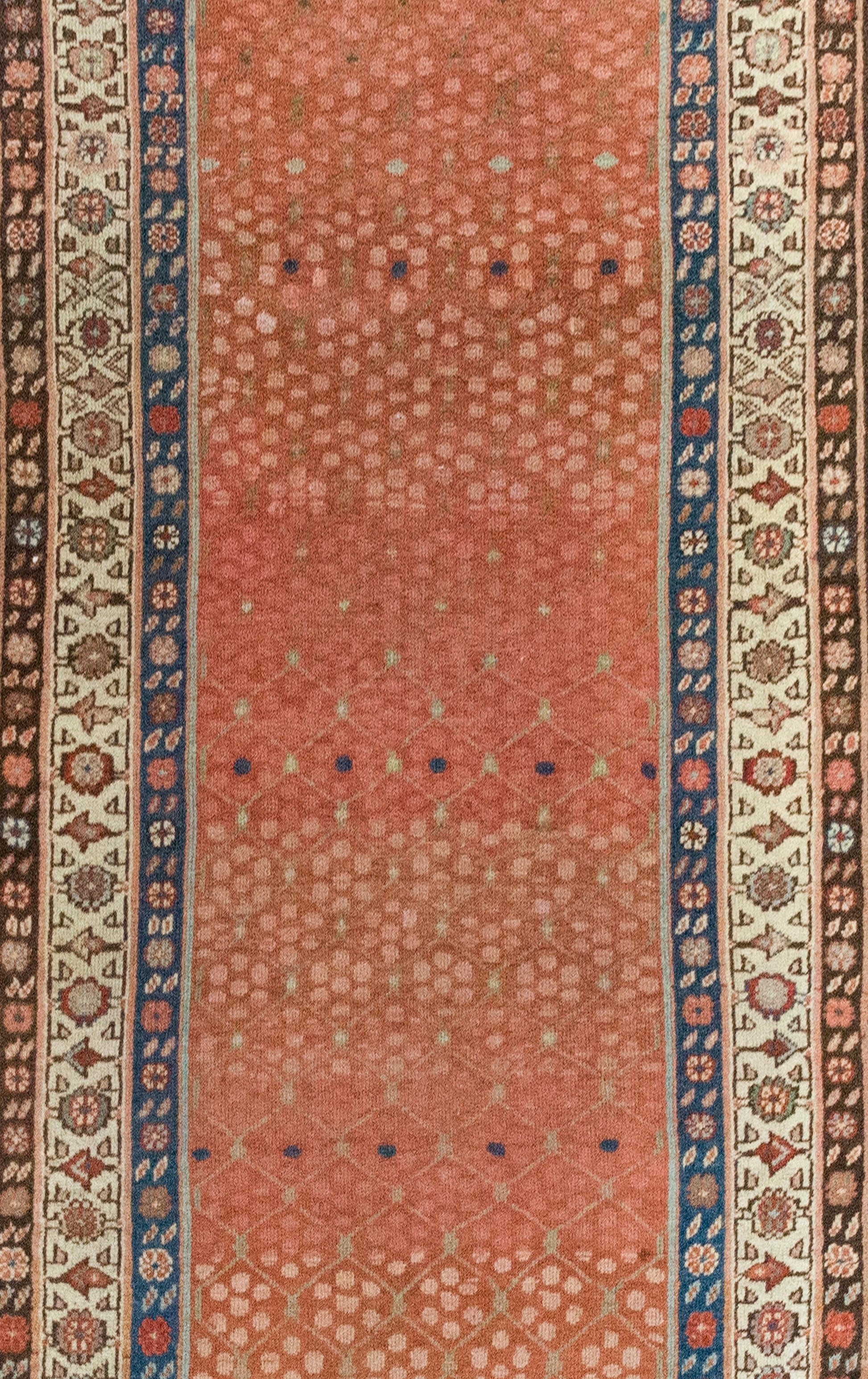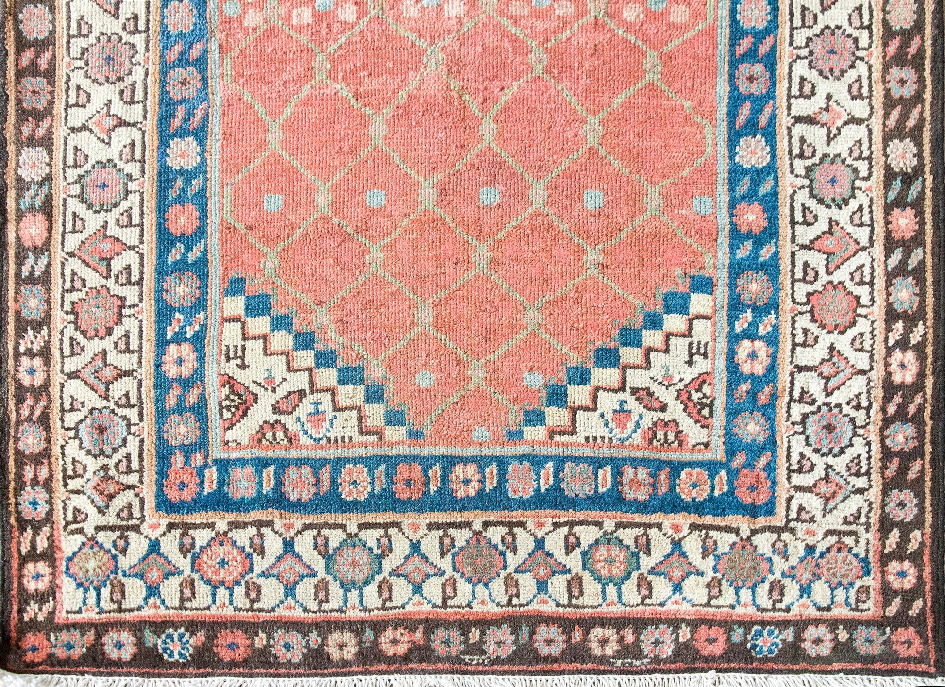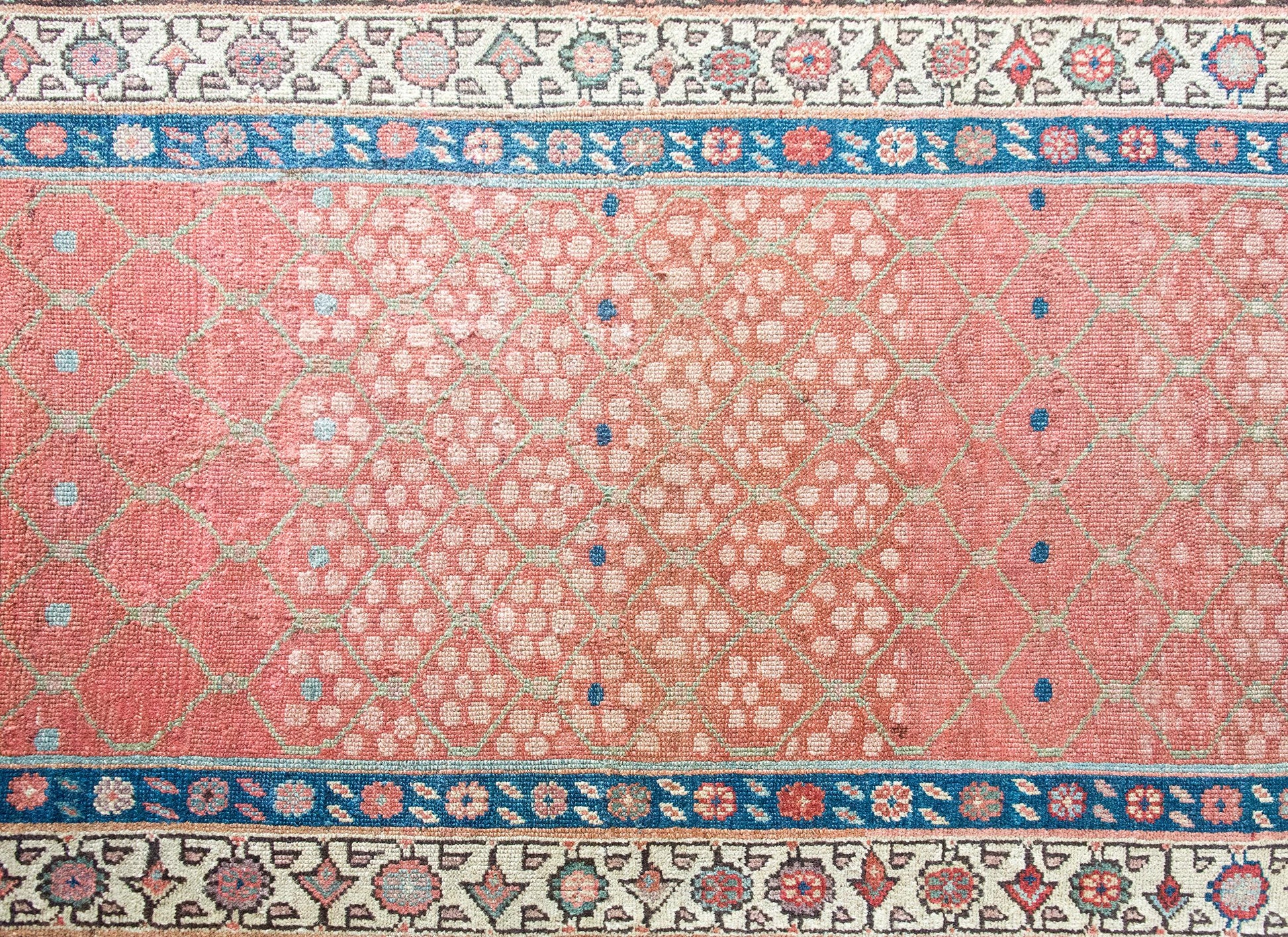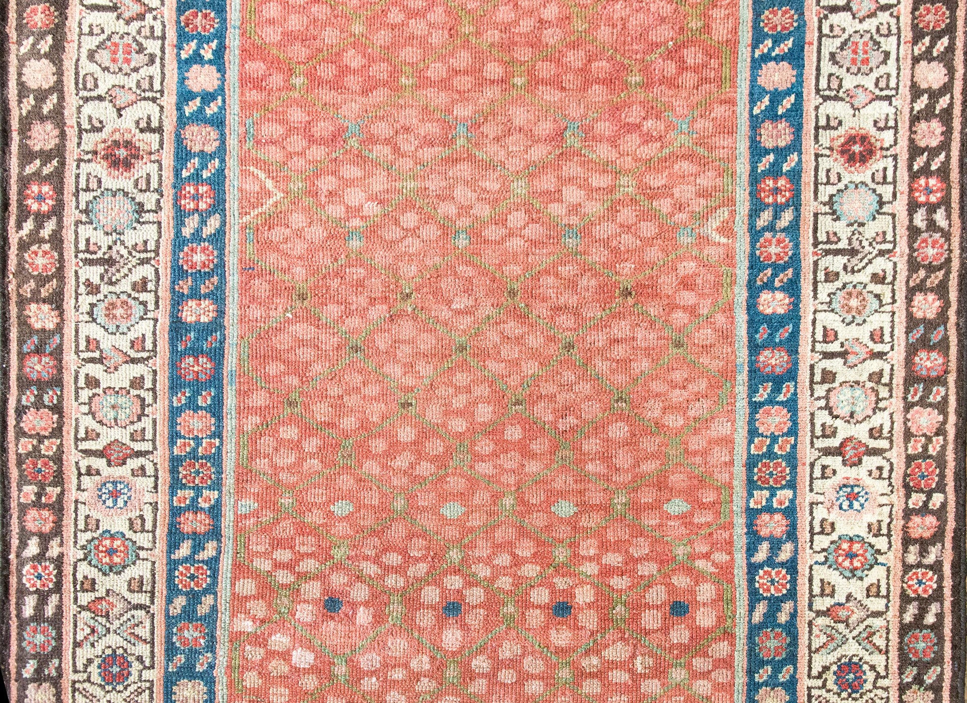 Woven circa 1900, this early 20th-century Persian Karabakh runner is a lyrical example of the region’s romantic, floral aesthetic. The central field is an utter delight—an airy pale green trellis meanders across the length, entwined with stylized blossoms rendered in soft abrash pinks and vibrant raspberry wool. The border is classically Karabakh, composed of three distinct floral bands, each with its own rhythm and palette—indigo, crimson, pale yellow, white, pink, and brown wool all working in elegant concert. Karabakh rugs hail from the mountainous region along the modern-day border of Iran and the South Caucasus. These pieces are traditionally woven by Armenian and Azerbaijani artisans, known for their refined color sensibility and deep connection to regional floral motifs. Long prized for their elegance and character, Karabakh runners like this one add a painterly, almost antique textile quality to a hallway or staircase—a quiet flourish that speaks volumes.