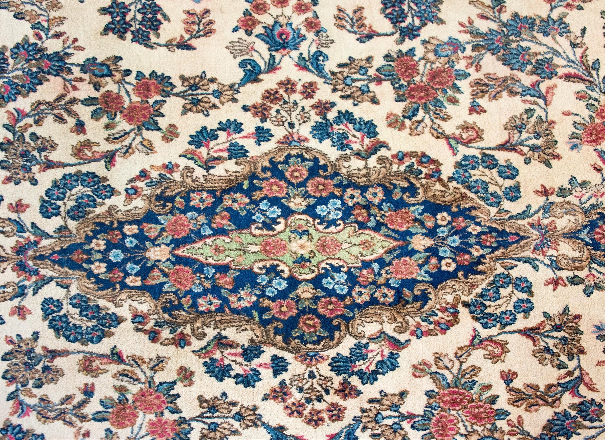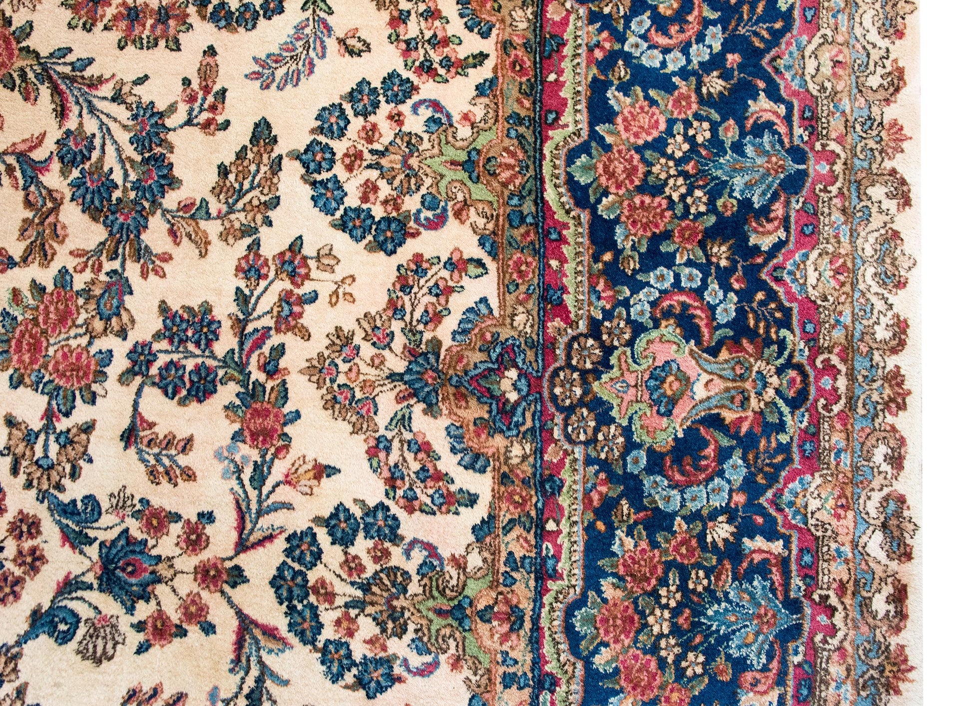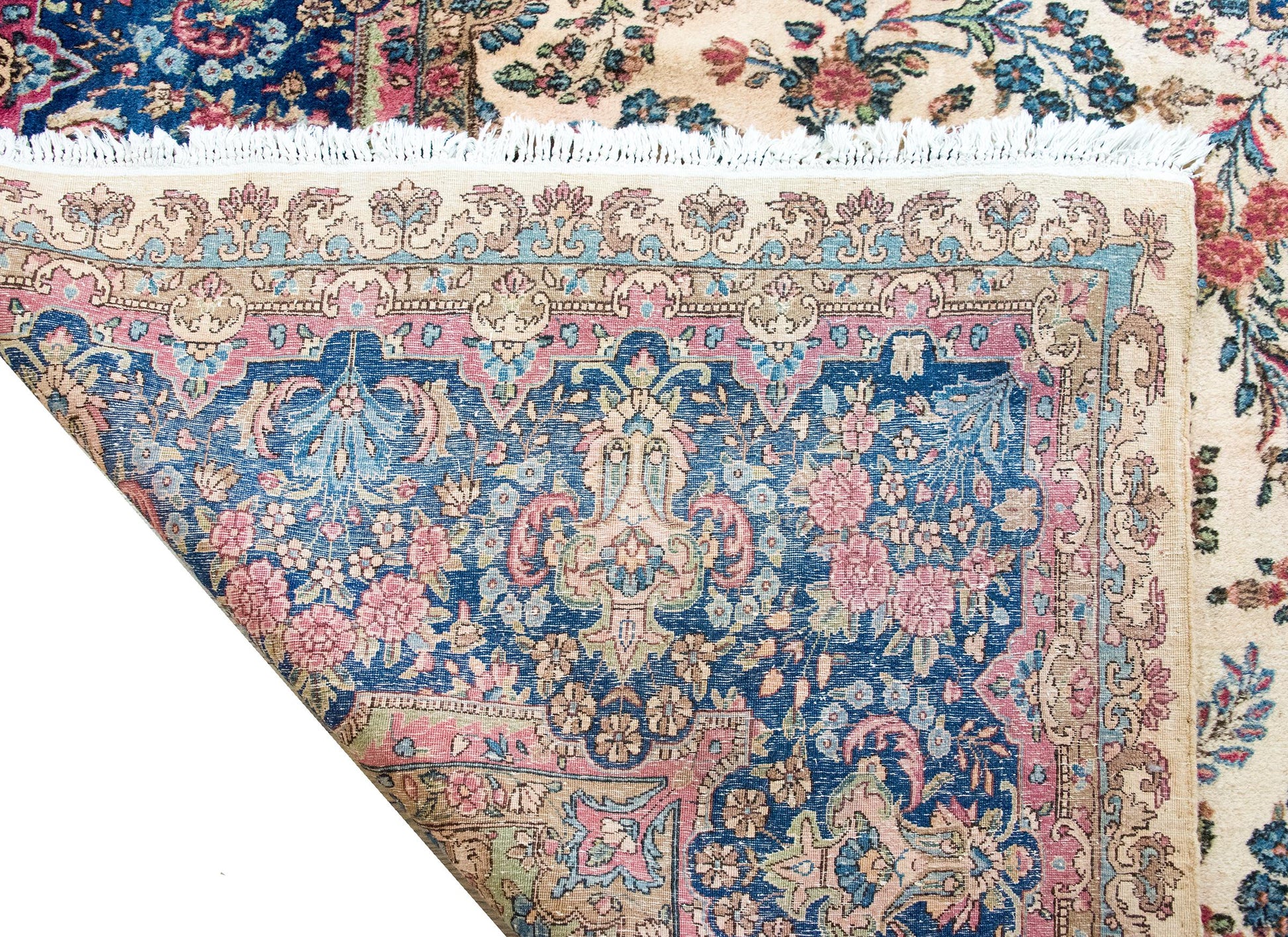A beautiful early 20th century Persian Kirman rug with a large central floral medallion living in a field of even more clustered flowers, surrounded by a wide and elaborate border with repeated florals and scrolling vines, and all woven in traditional Kirman colors of pink, varying shades of indigo, cream, green and yellow.