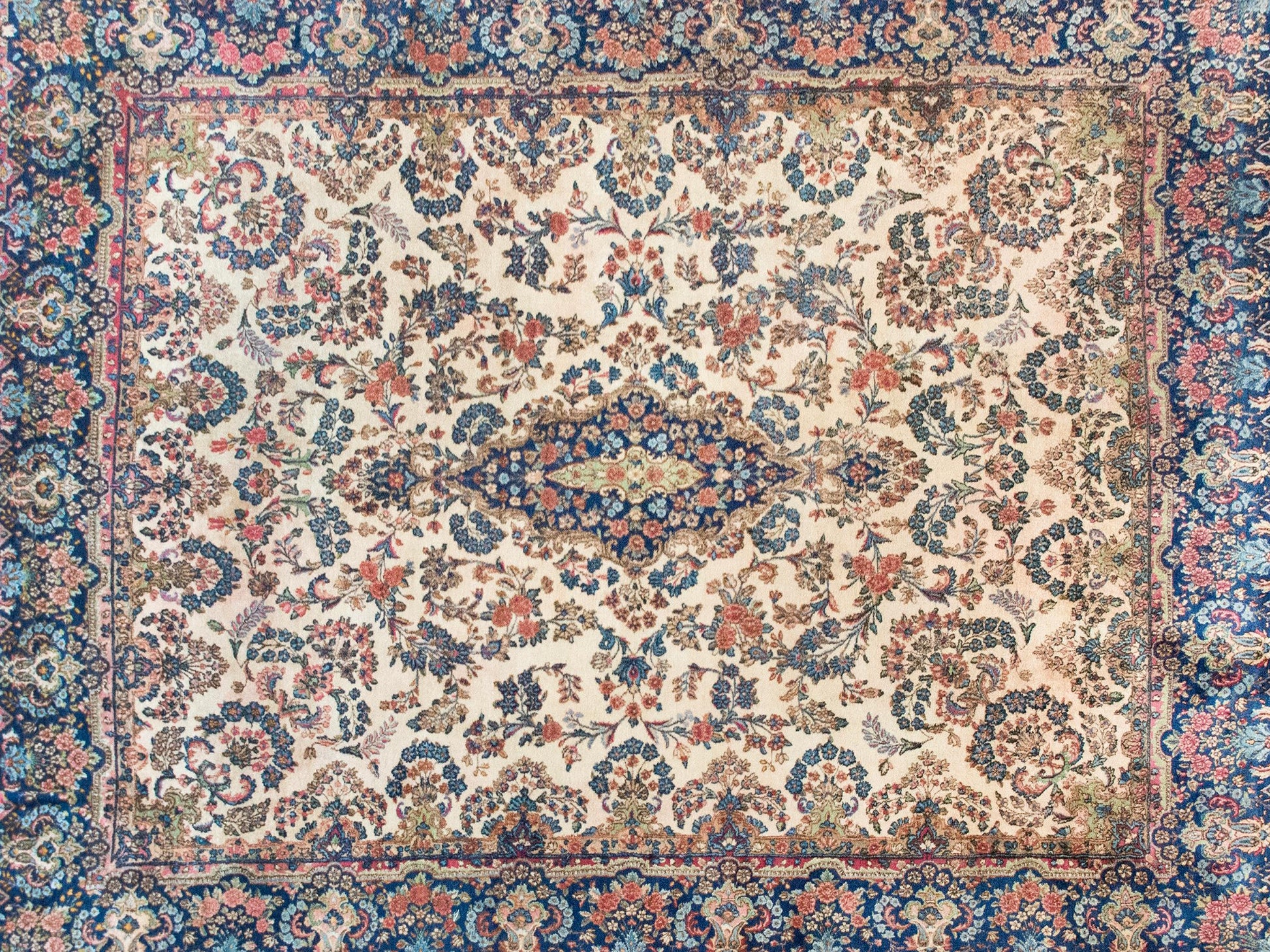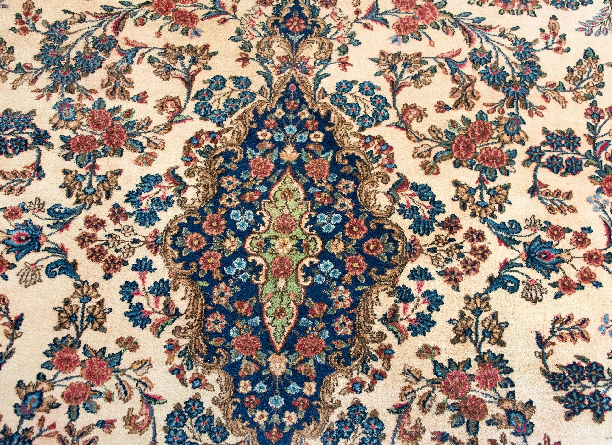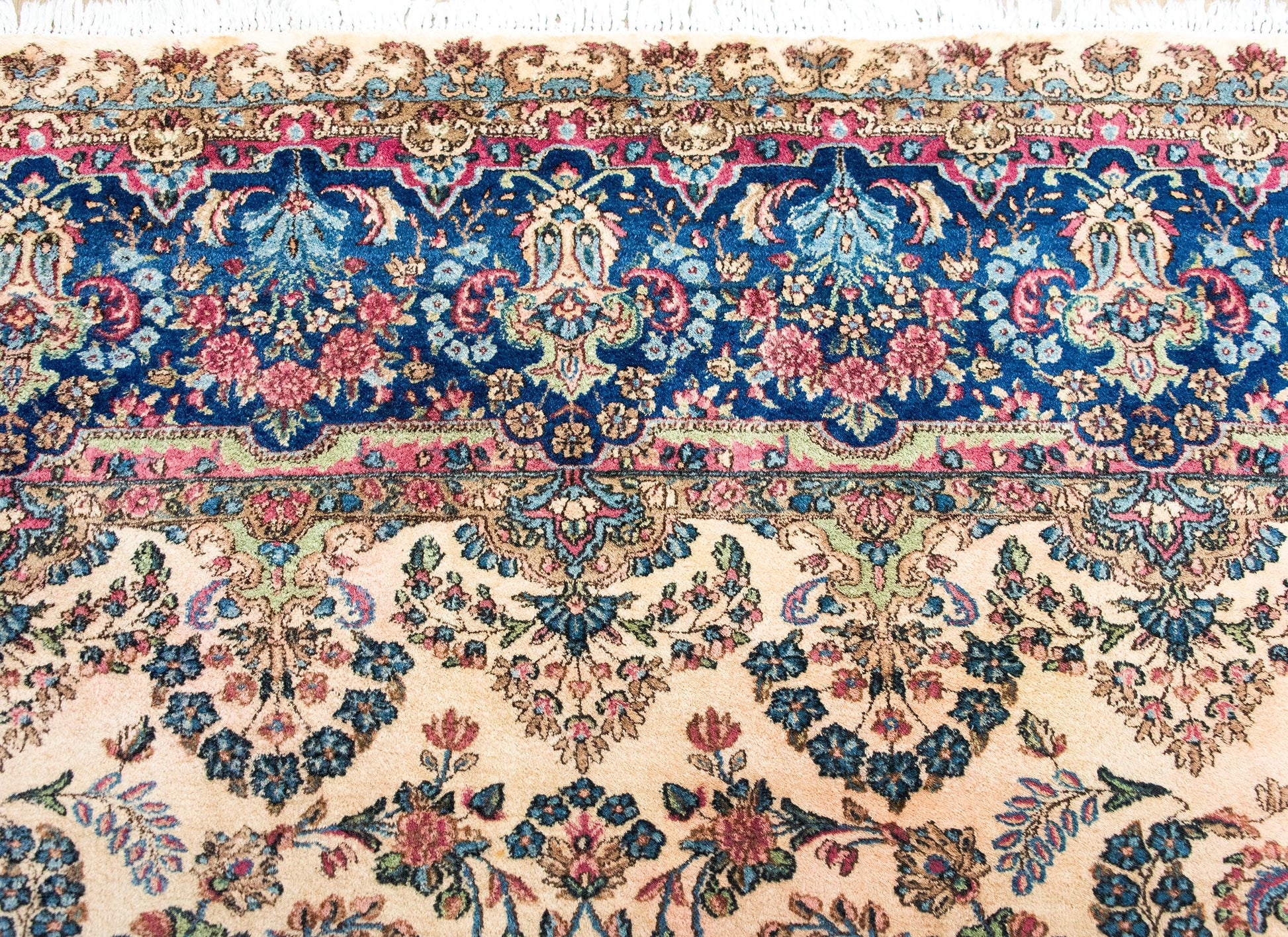 A beautiful early 20th century Persian Kirman rug with a large central floral medallion living in a field of even more clustered flowers, surrounded by a wide and elaborate border with repeated florals and scrolling vines, and all woven in traditional Kirman colors of pink, varying shades of indigo, cream, green and yellow.