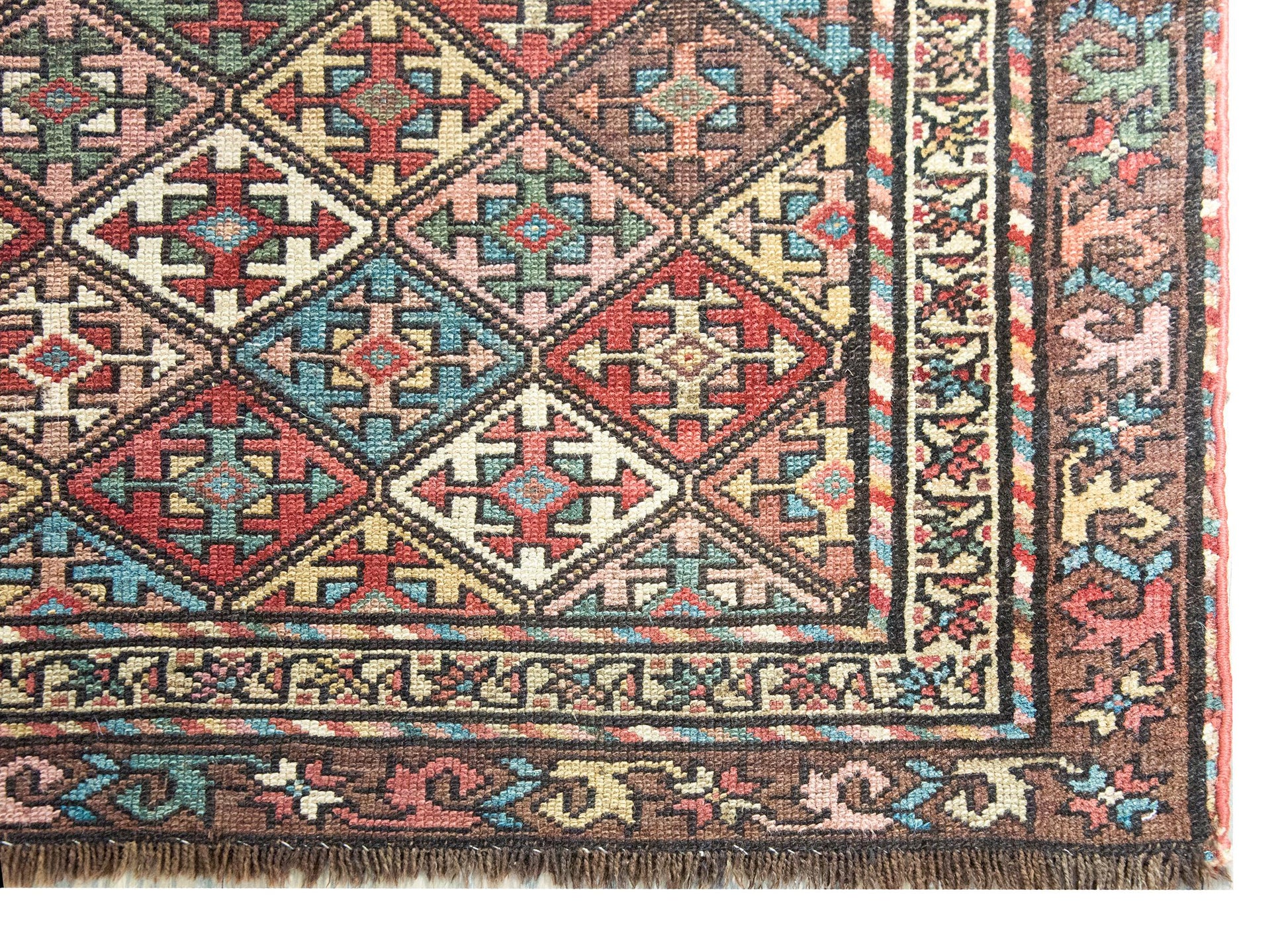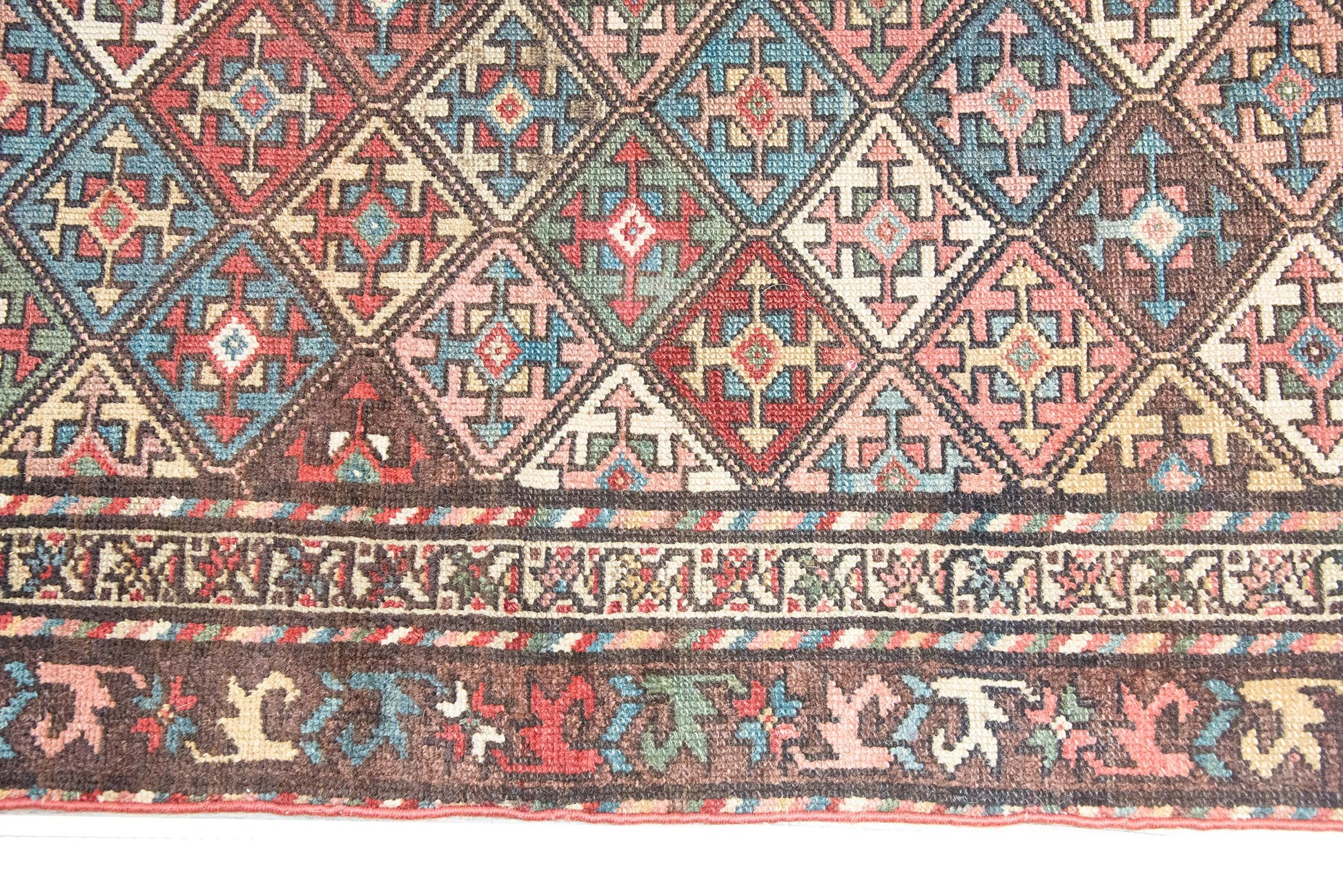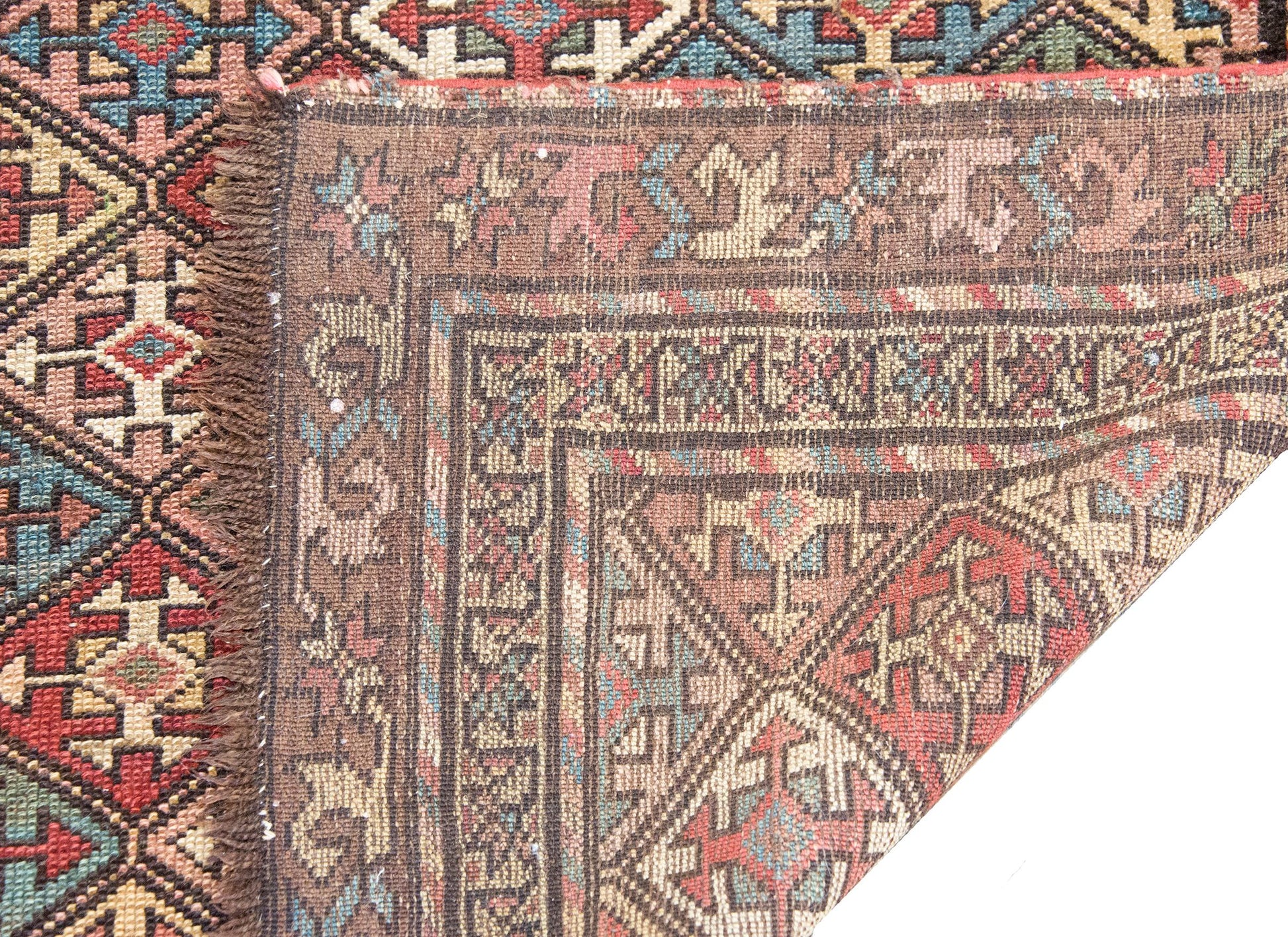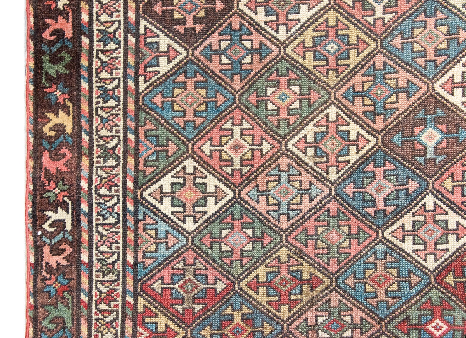 A magnificent early 20th Persian Azerbaijani Kuba rug with the most wonderful all-over geometric stylized floral pattern woven in varying shades of crimson, green, gold, indigo, and white, and surrounded by a simple border with two distinct floral patterns.
