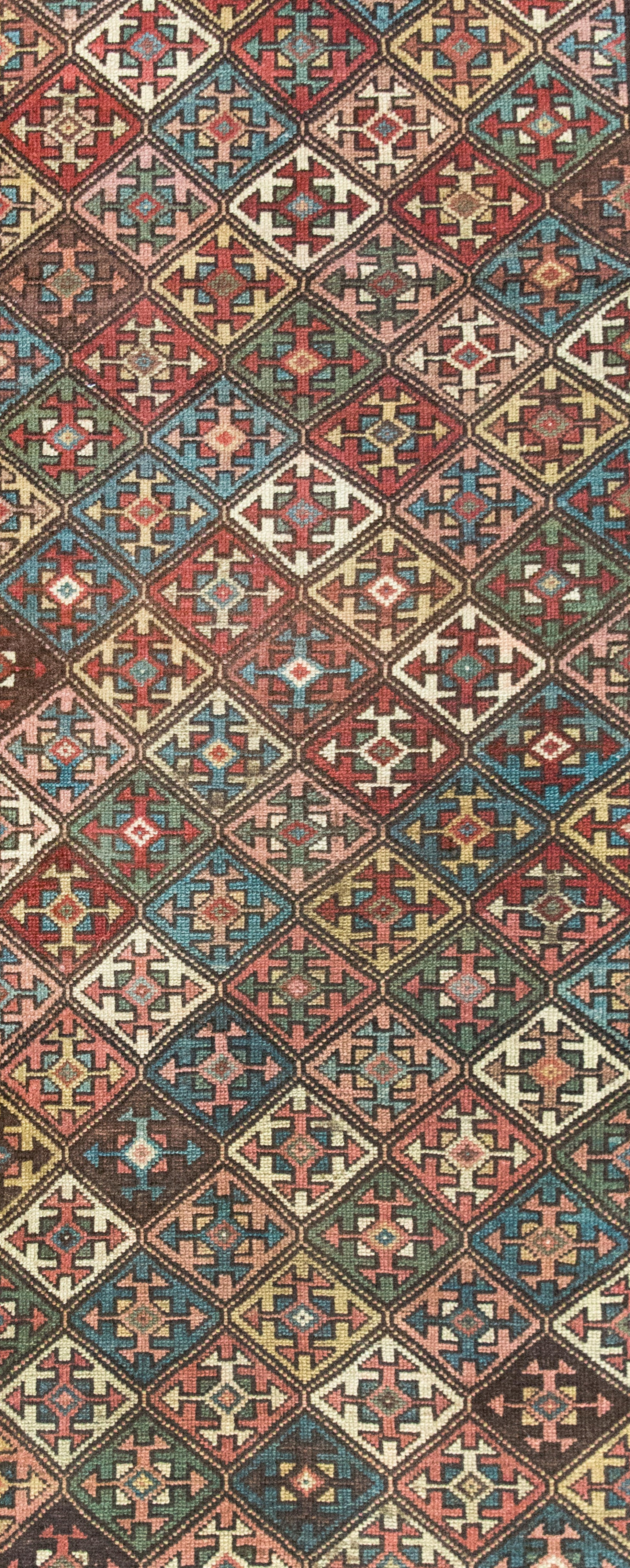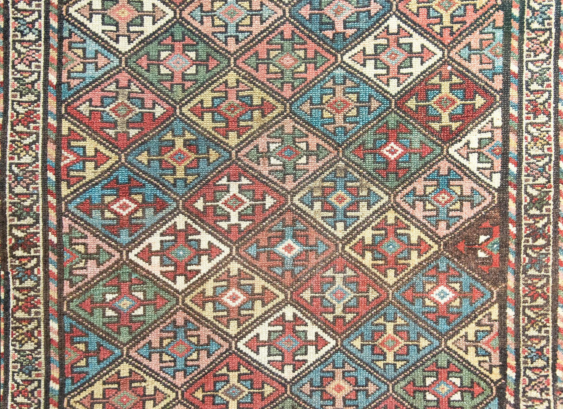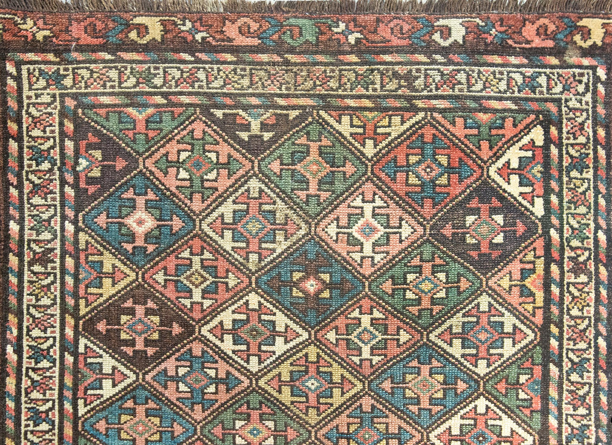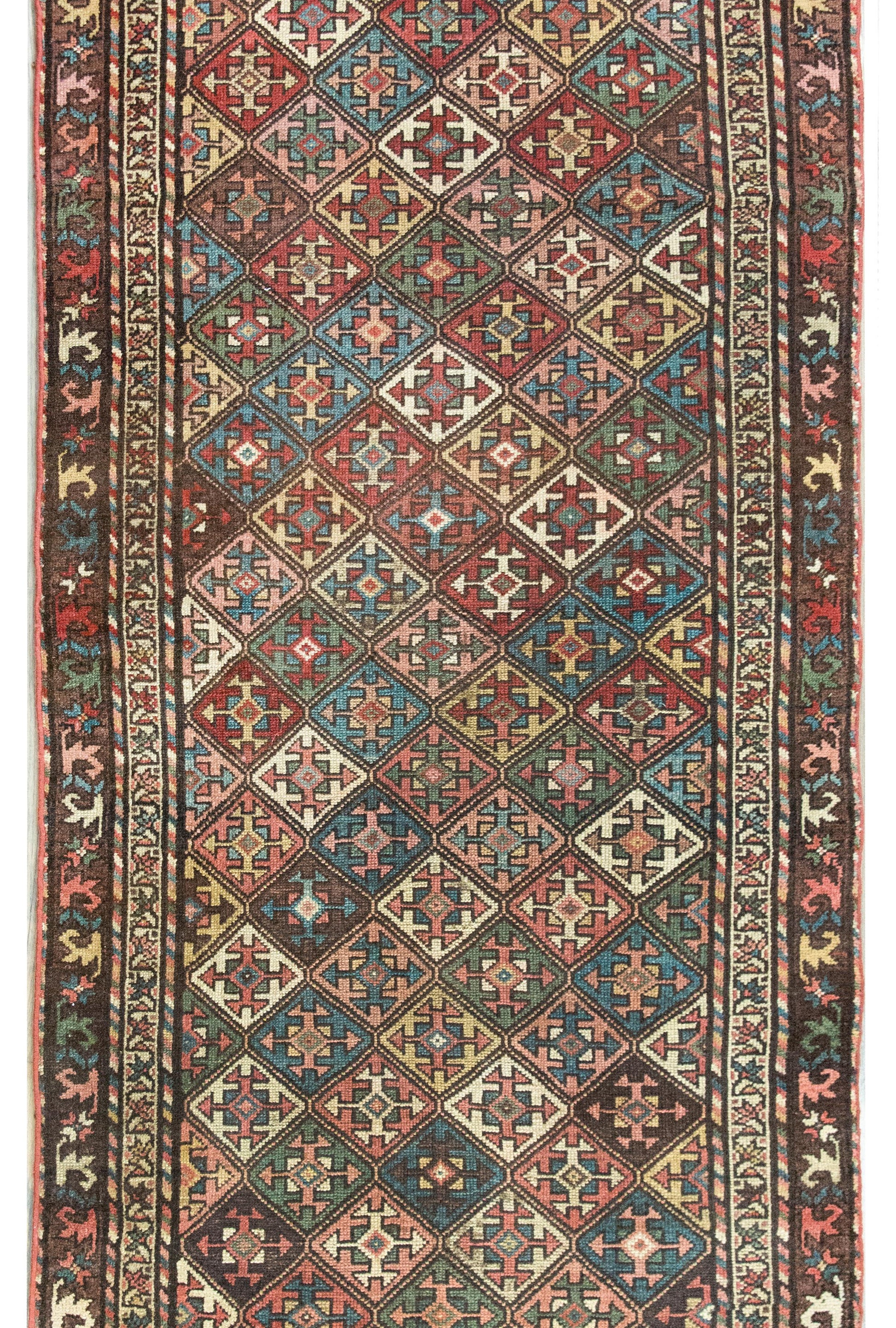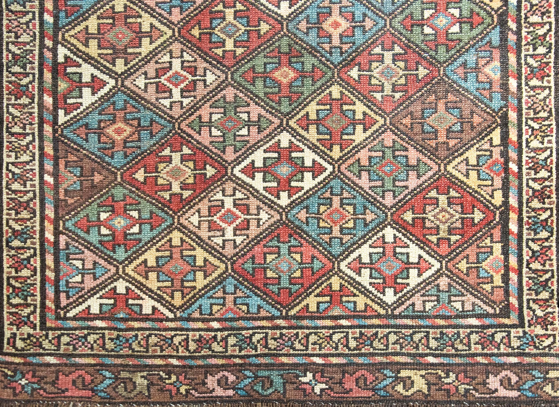 A magnificent early 20th Persian Azerbaijani Kuba rug with the most wonderful all-over geometric stylized floral pattern woven in varying shades of crimson, green, gold, indigo, and white, and surrounded by a simple border with two distinct floral patterns.