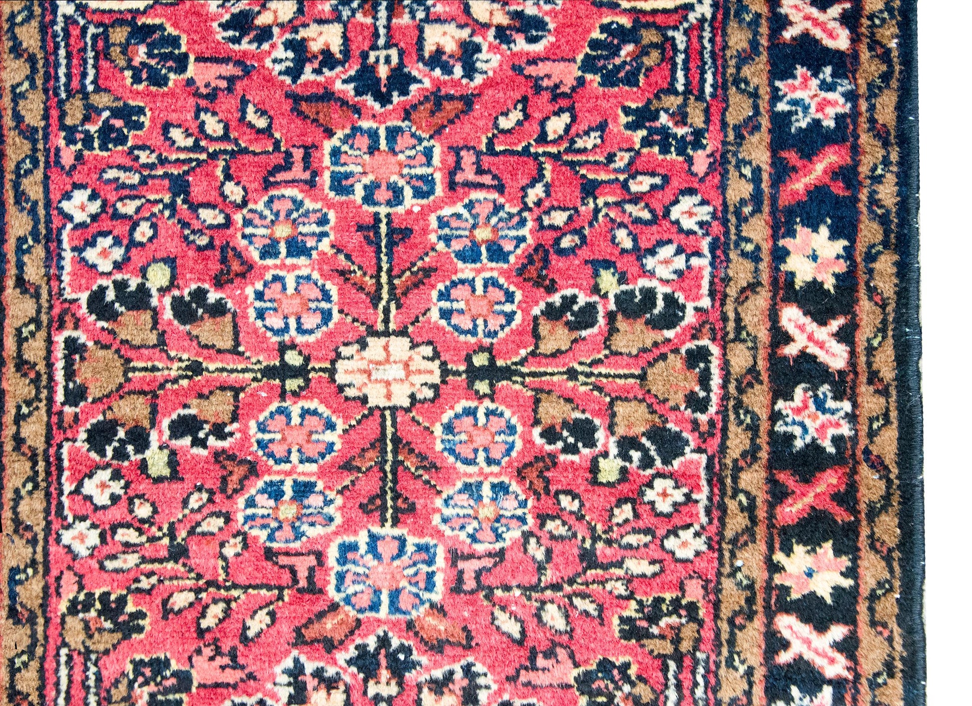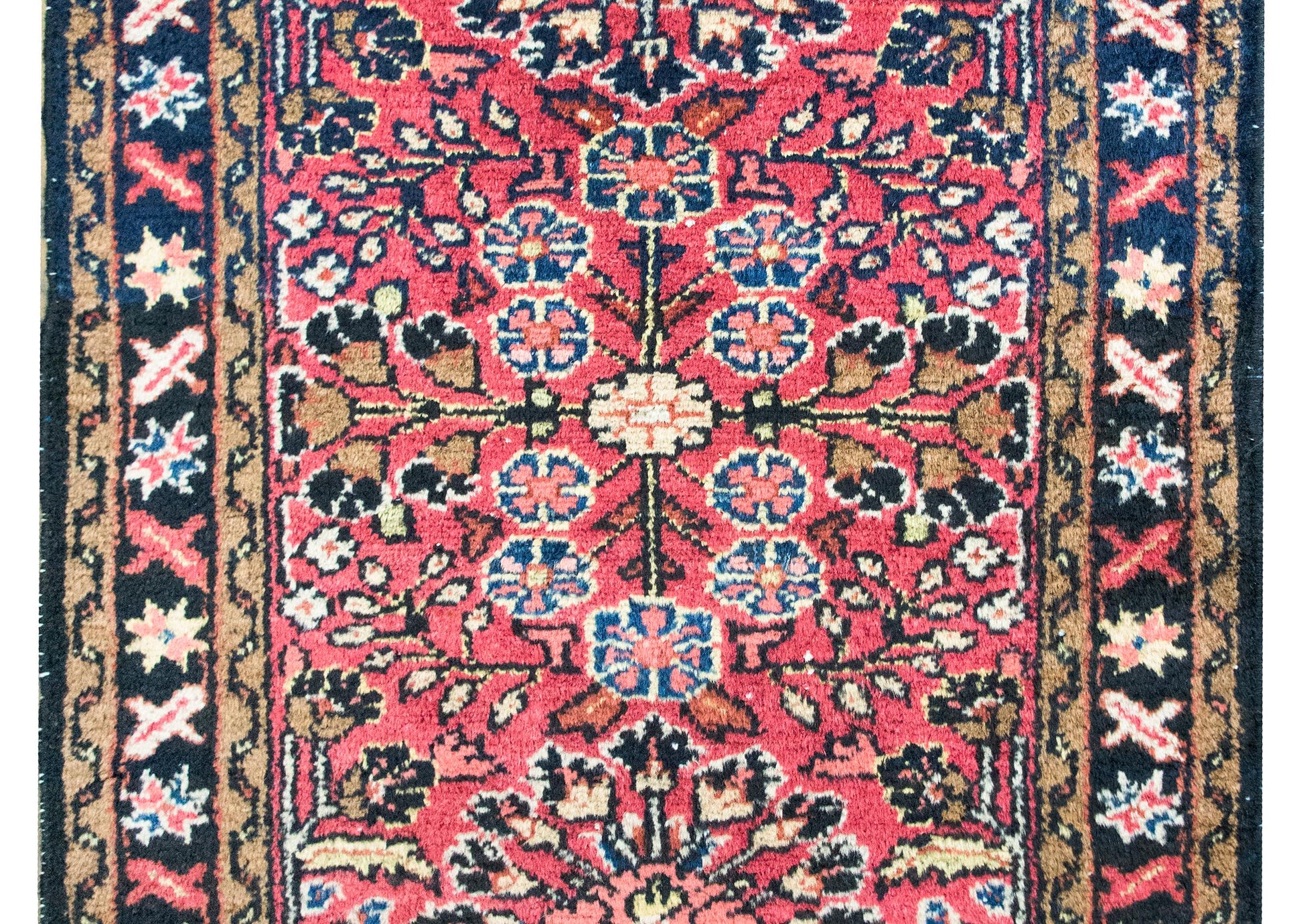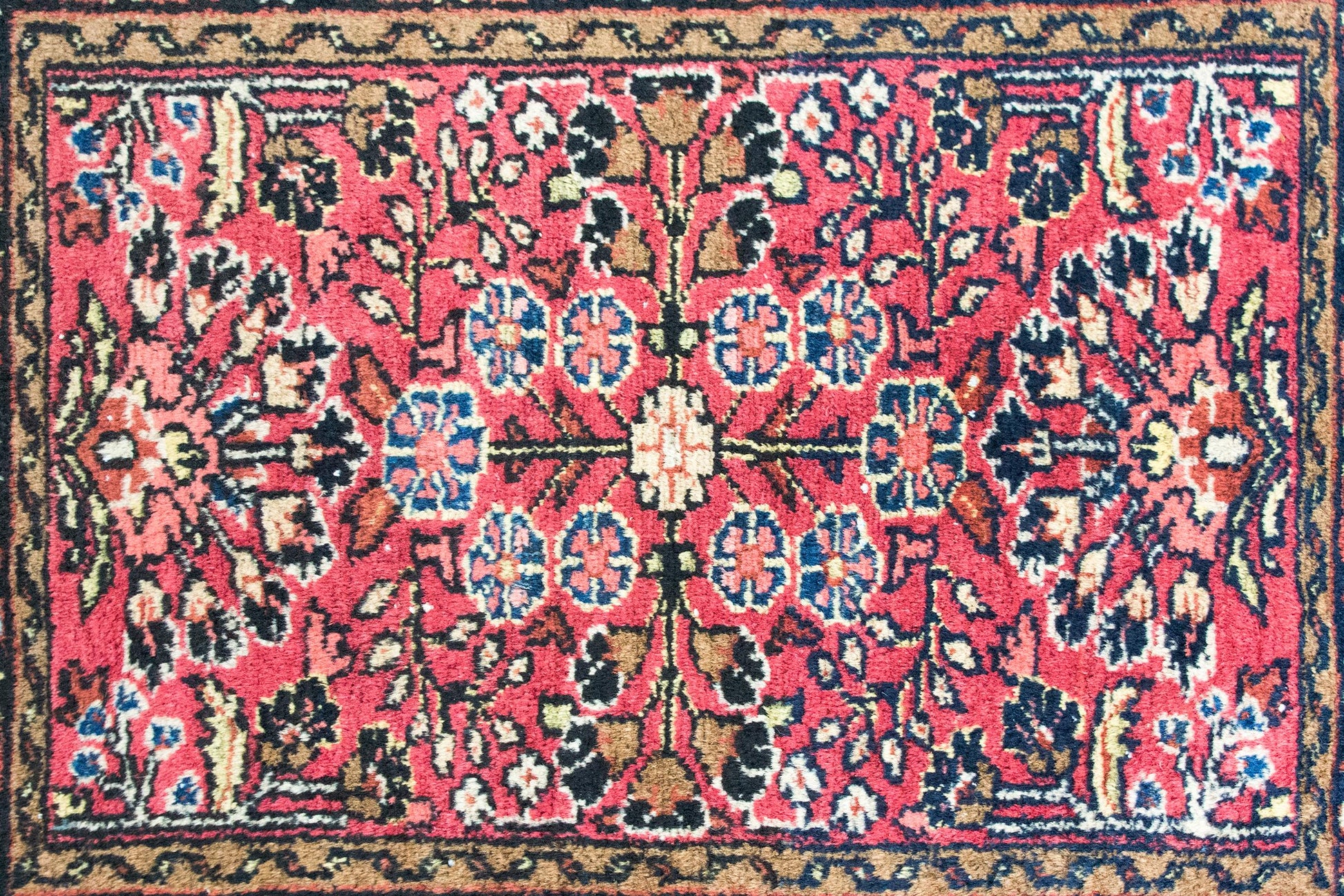 A charming petite early 20th century Persian Lilihan rug with a mirrored floral pattern with myriad floral clusters set against a coral background, surrounded by a simple stylized repeated floral patterned border, and all woven in indigo, pink, cream, yellow, and brown colored wool.