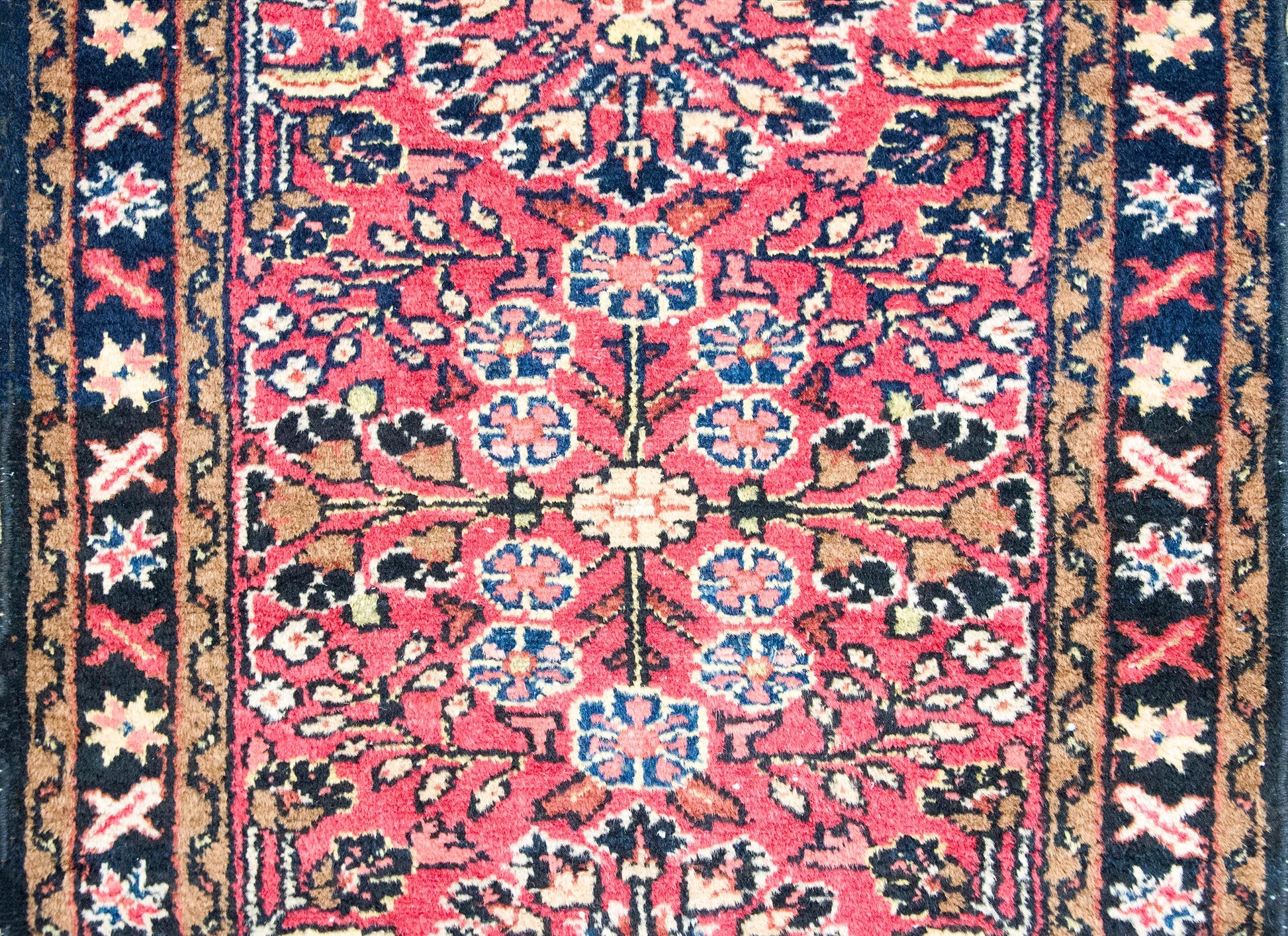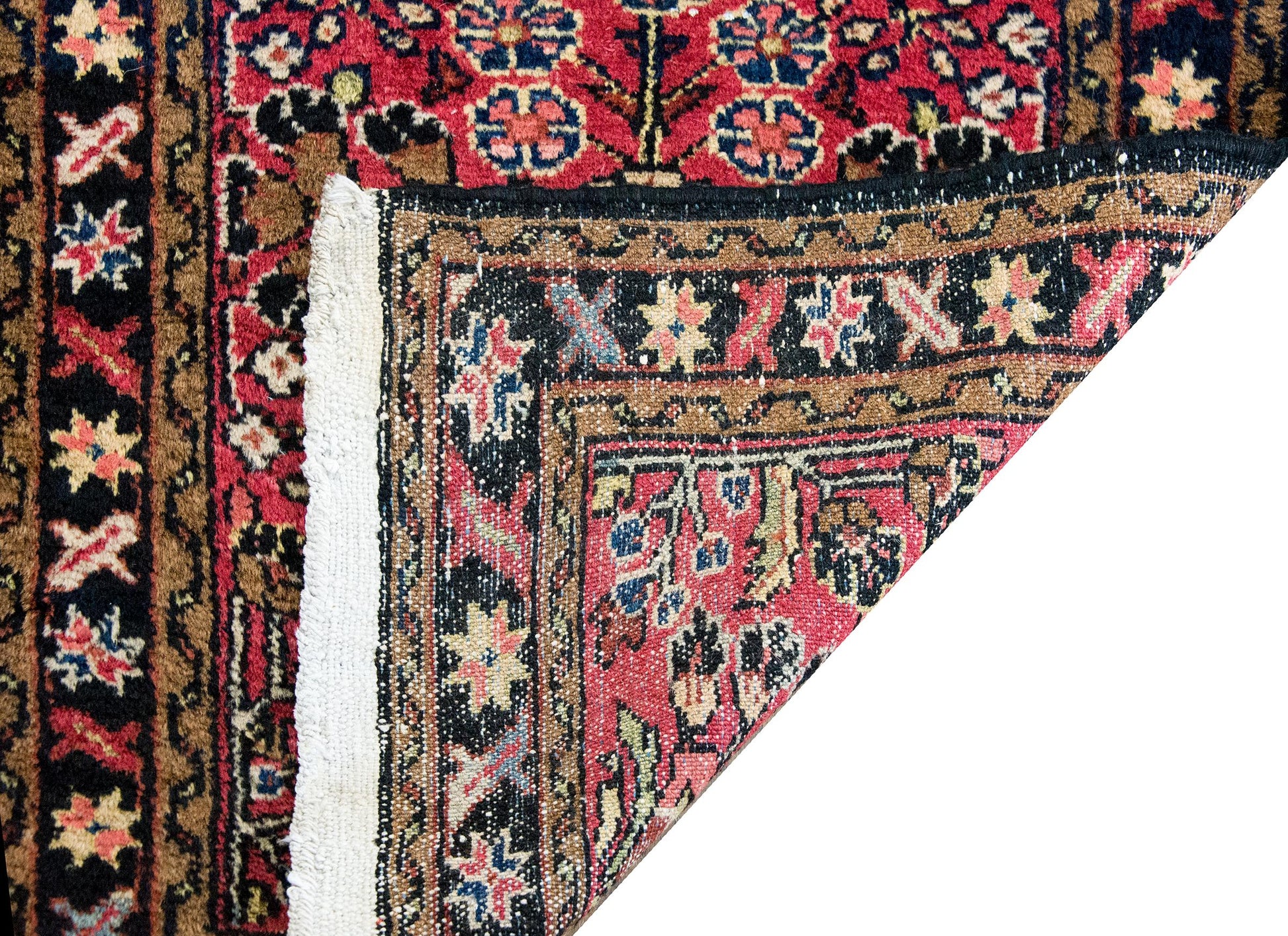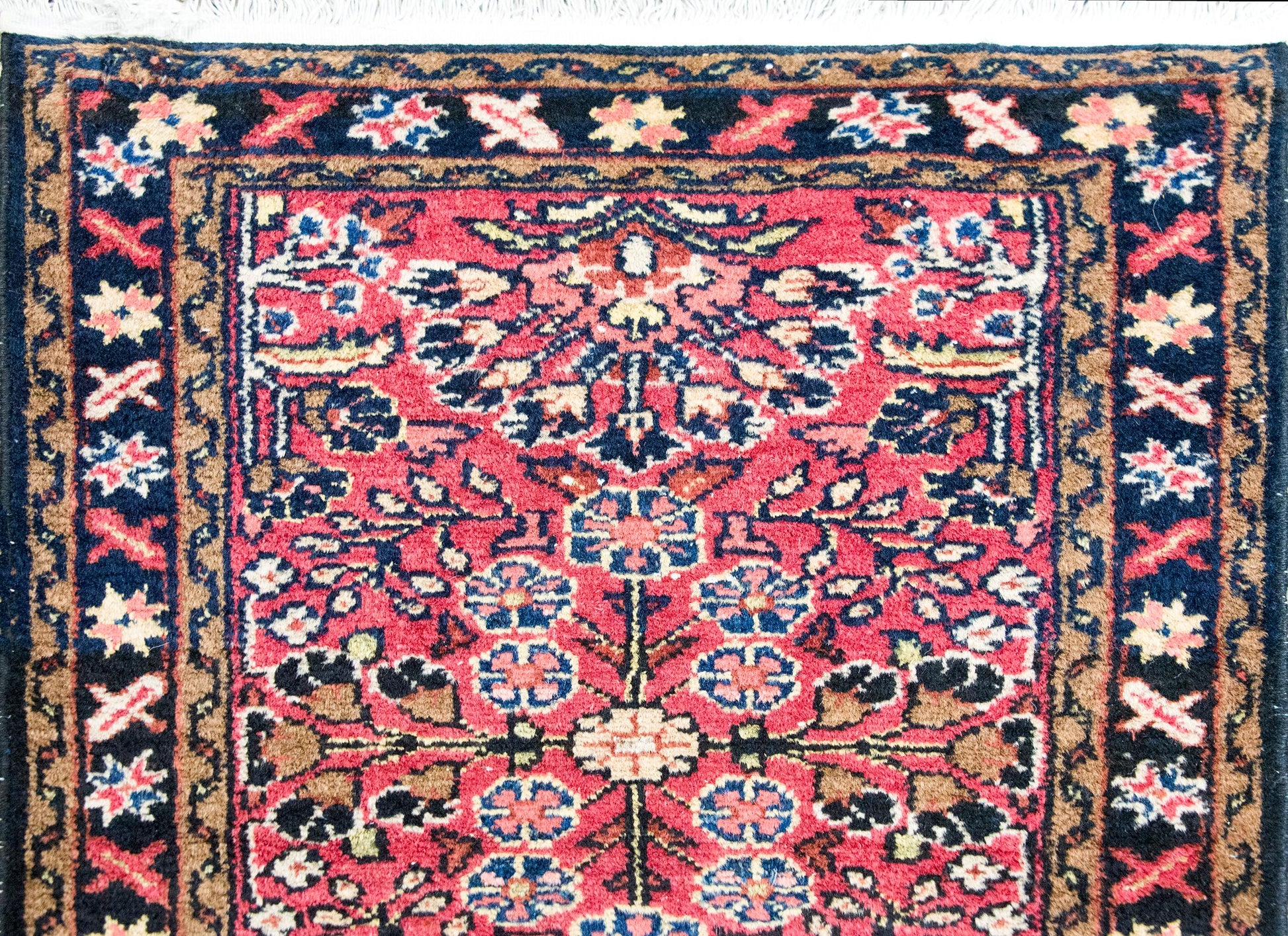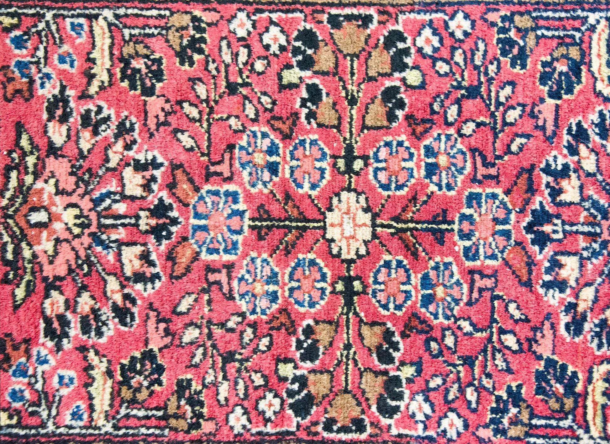 A charming petite early 20th century Persian Lilihan rug with a mirrored floral pattern with myriad floral clusters set against a coral background, surrounded by a simple stylized repeated floral patterned border, and all woven in indigo, pink, cream, yellow, and brown colored wool.