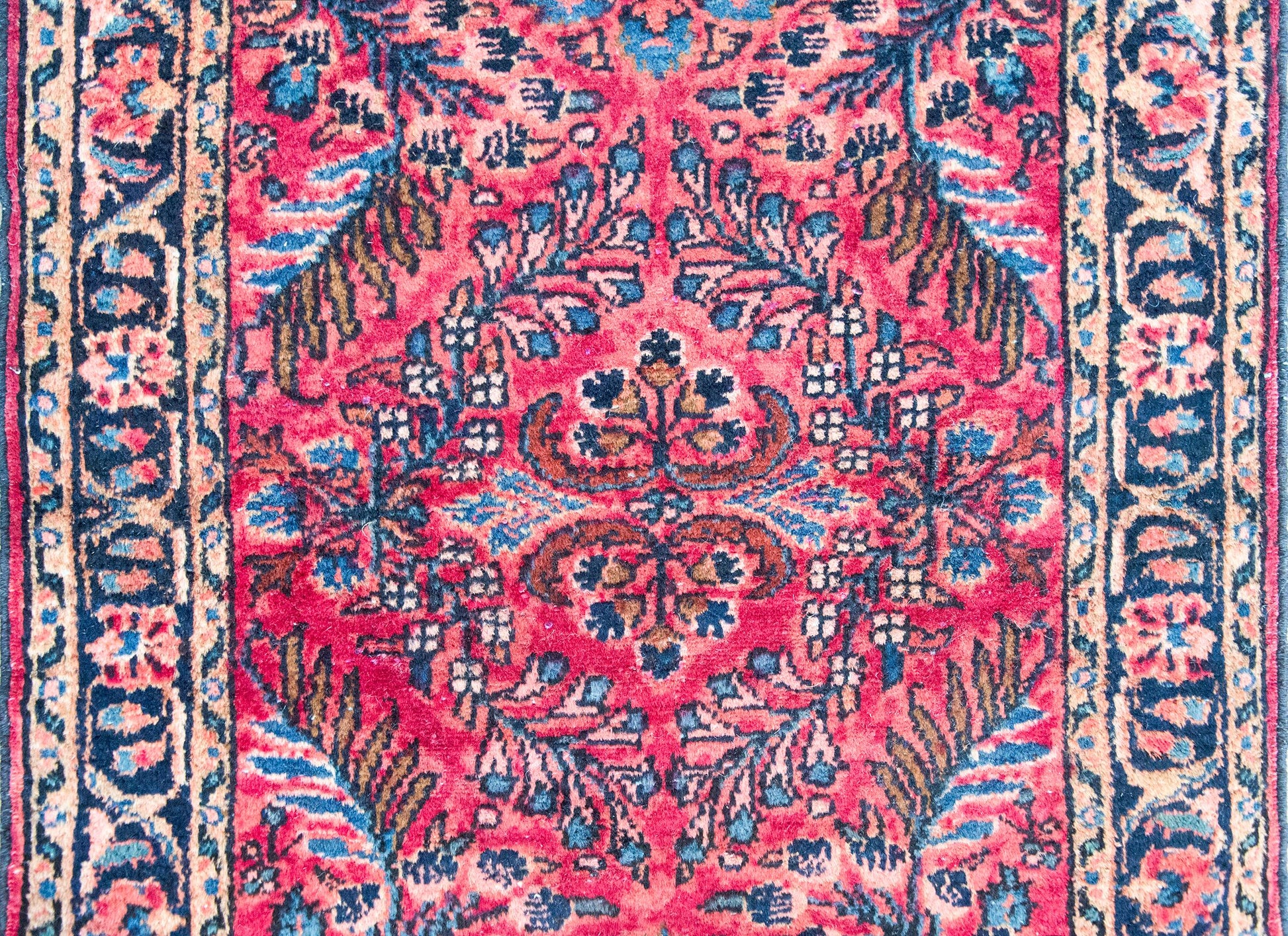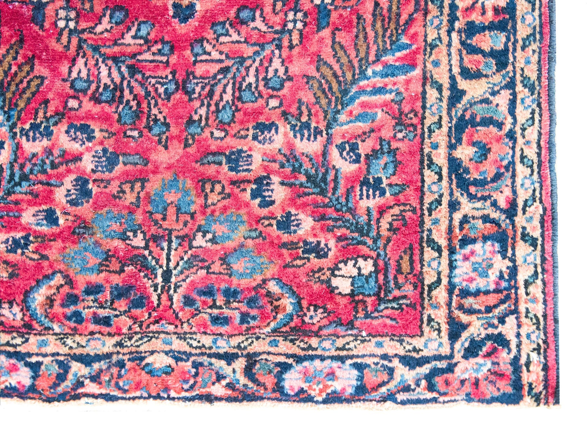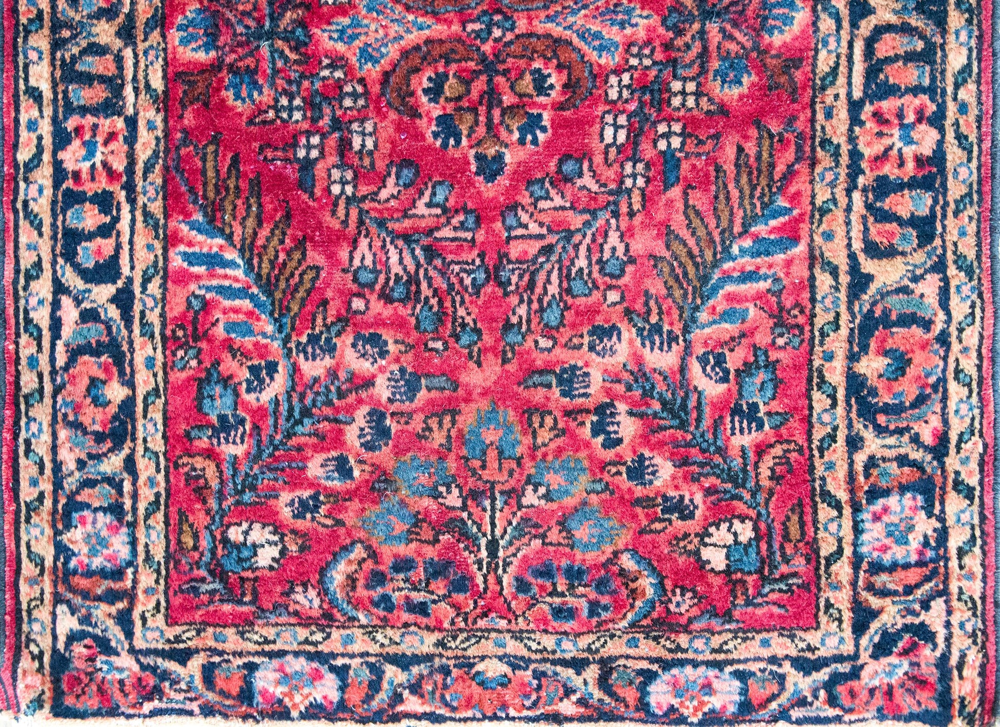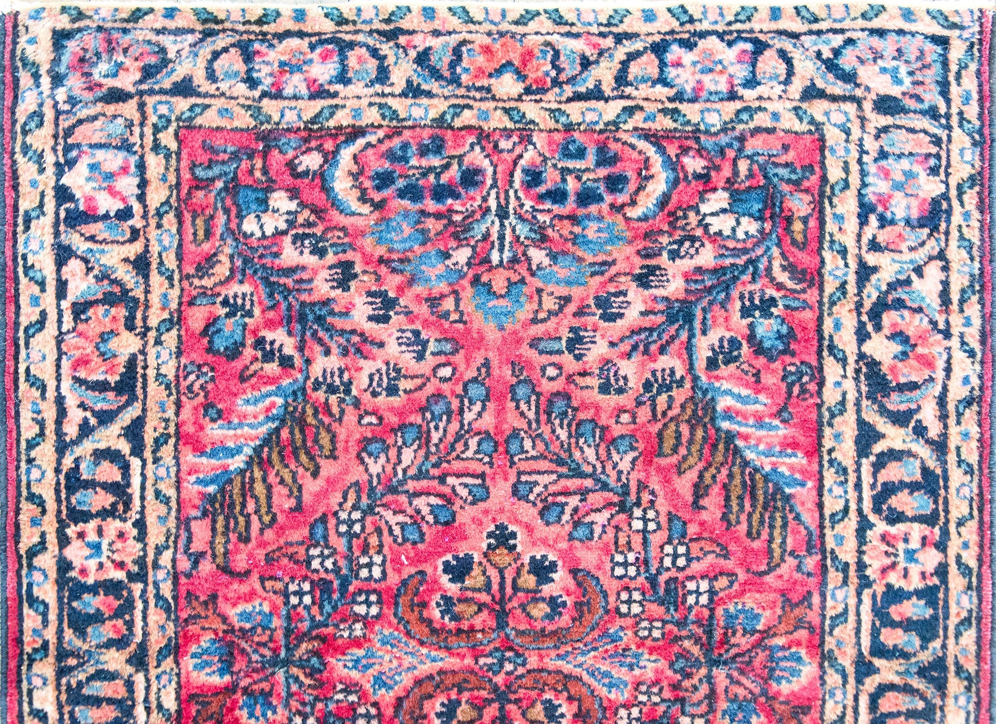 This early 20th-century Persian Lilihan rug features a beautifully mirrored floral design, where sweeping leafy branches and blooming clusters unfurl across the field in a rhythmic, symmetrical pattern. Woven in a rich palette of indigo, coral, crimson, pink, and brown, the rug radiates warmth and movement. A simple yet elegant border frames the composition, anchored by a central scrolling vine and floral stripe, flanked on either side by petite floral guard borders. Lilihan rugs are woven by Armenian weavers in the village of Lilihan, located in western Iran’s Arak region. Known for their soft wool, tight weave, and bold use of color, Lilihan rugs became especially popular in the early 20th century for their ability to bridge traditional Persian motifs with a slightly more playful, decorative style. This piece is a glowing example—full of charm, craftsmanship, and timeless appeal, equally suited to formal interiors or layered, collected spaces.