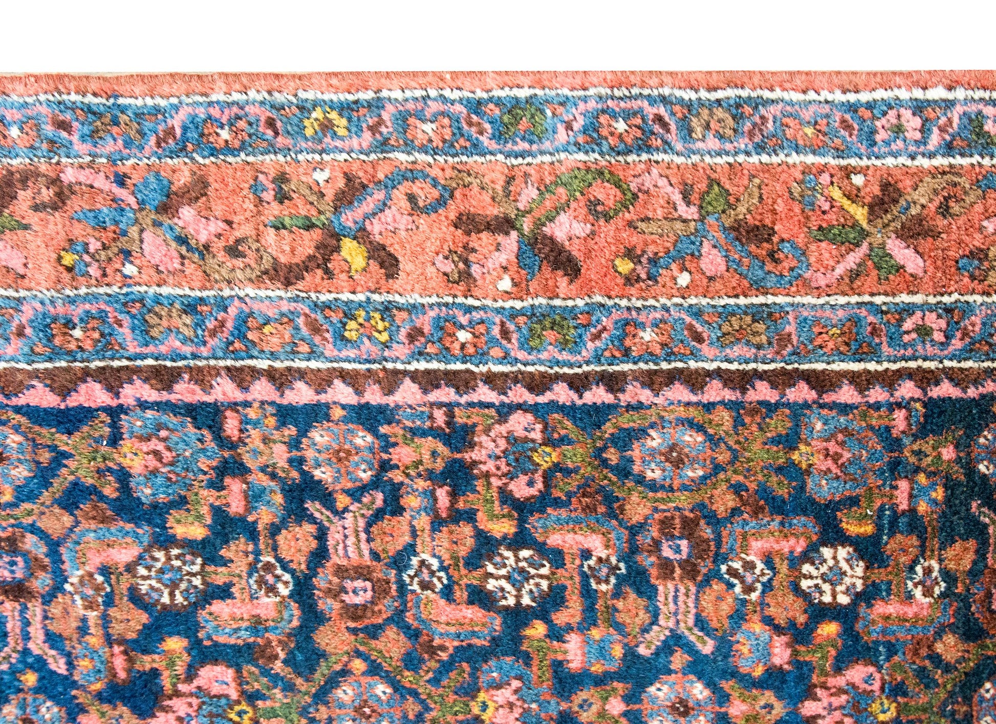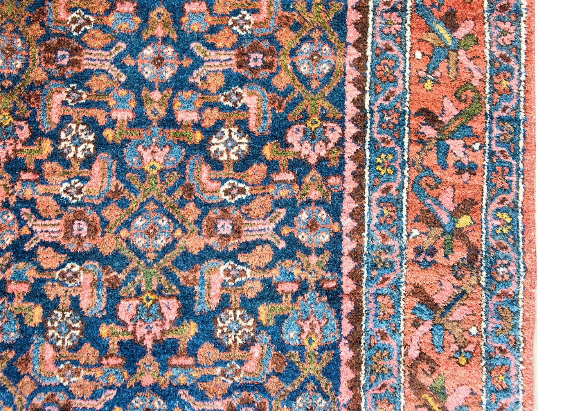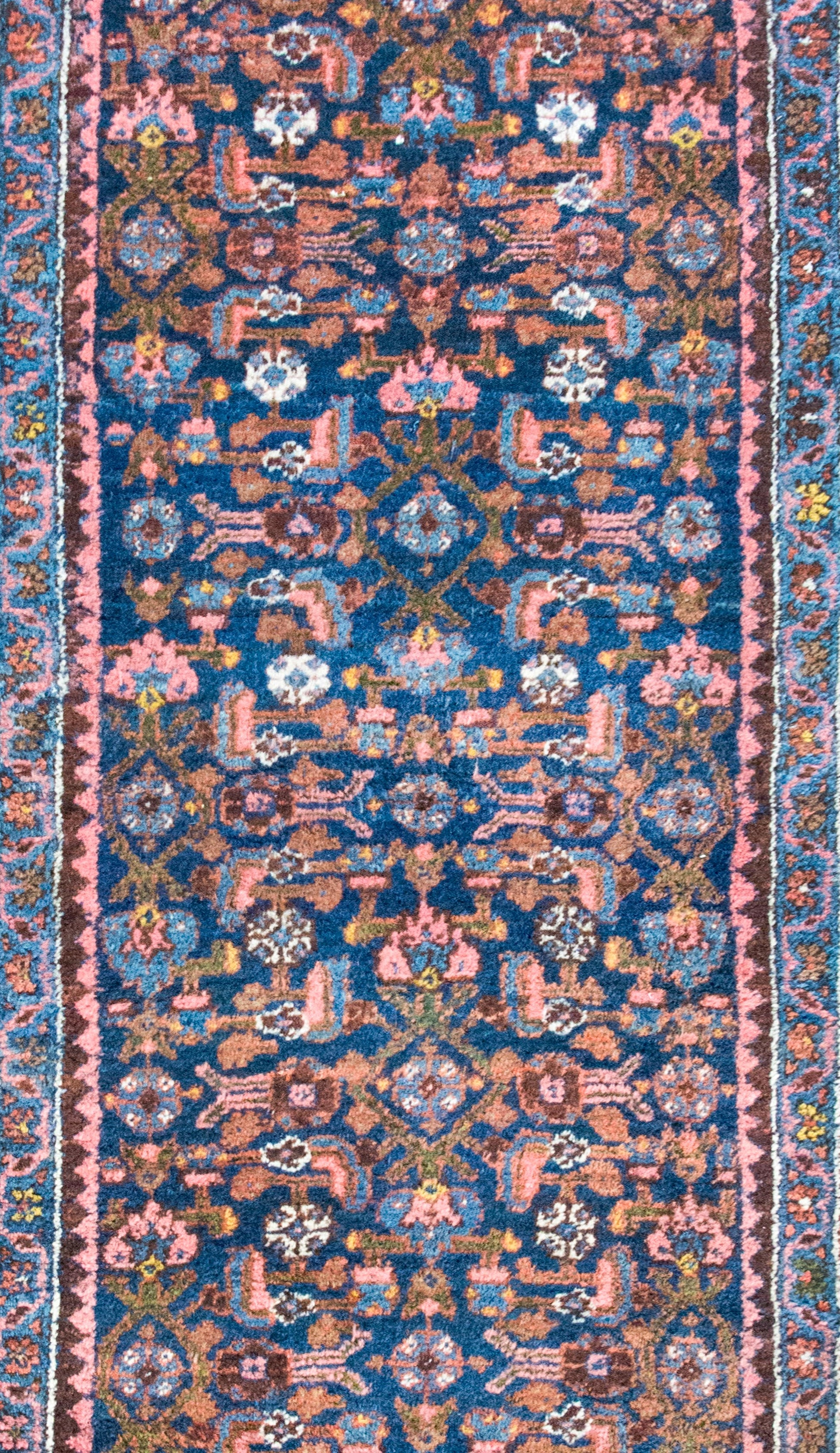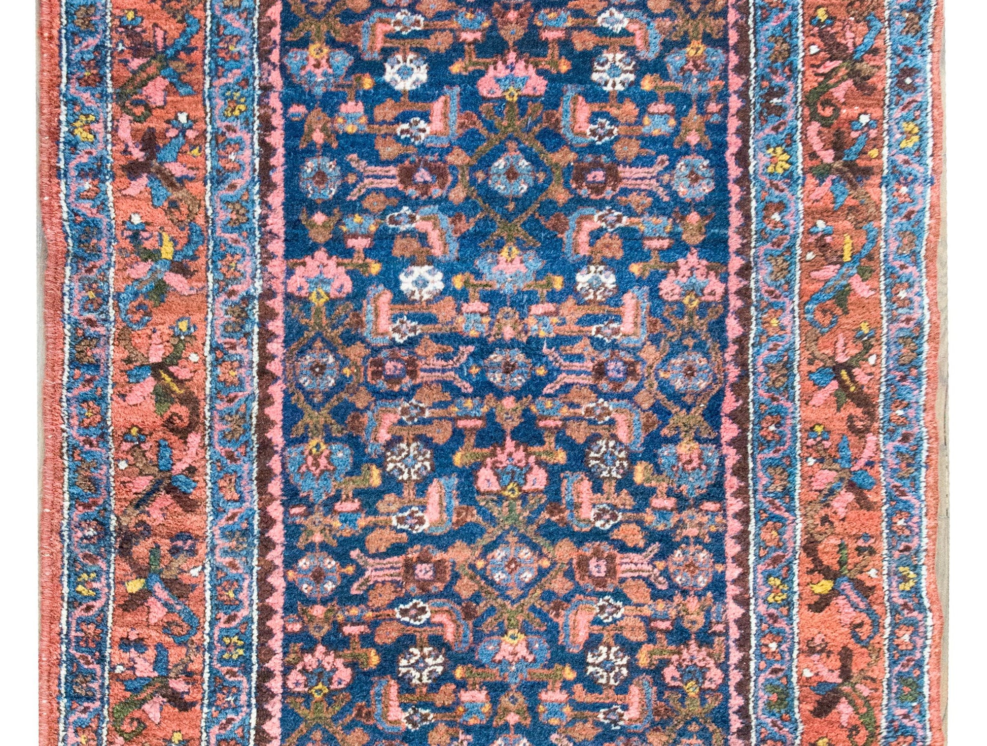 An early 20th century Persian Malayer rug with a central field with an all-over floral and leaf pattern, surrounded by a complex border with a central floral and scrolling vine stripe flanked by pairs of matching petite floral and geometric patterned stripes, and all woven in shades of pink, indigo, gold, green, and violet wool.
