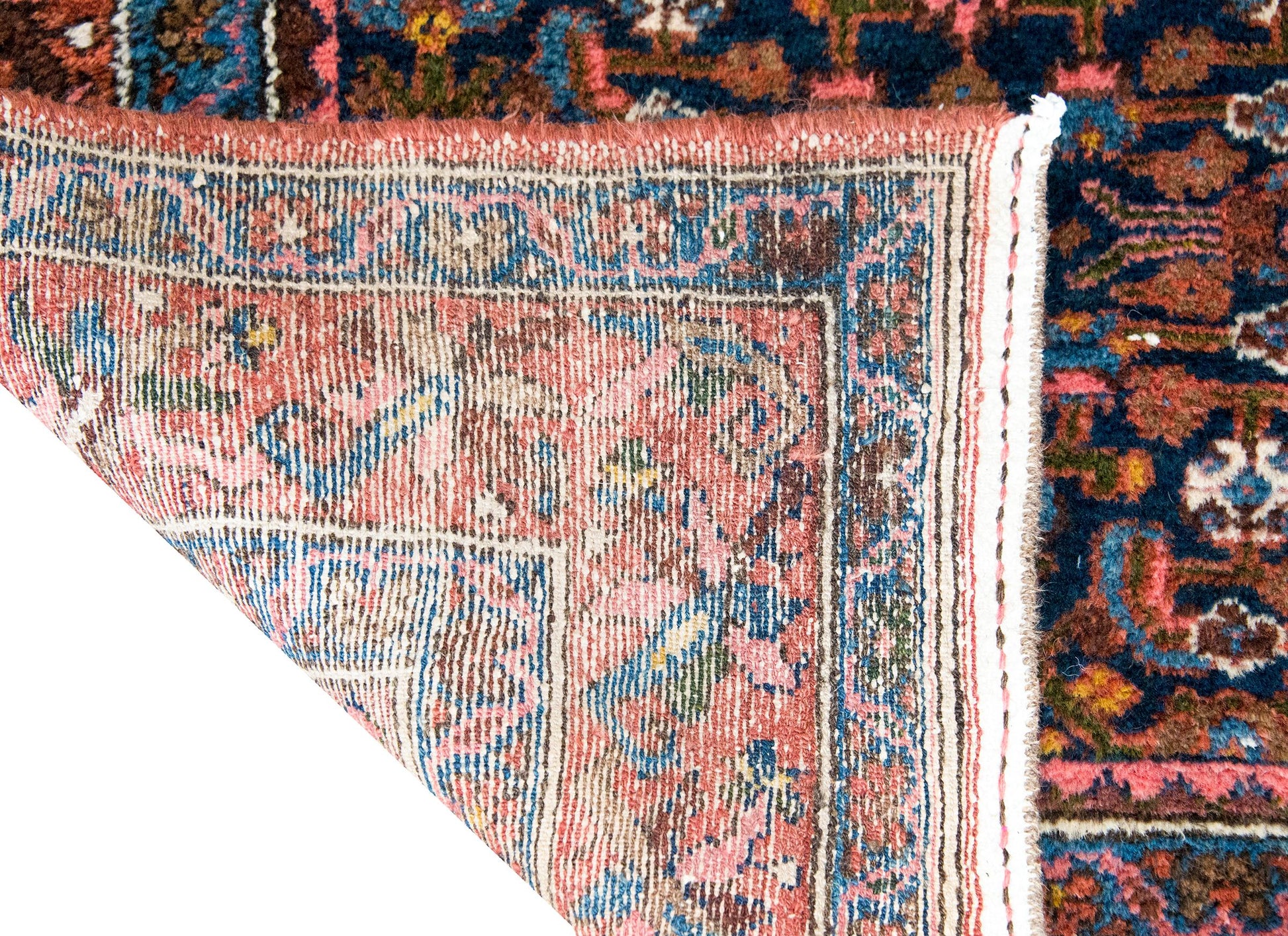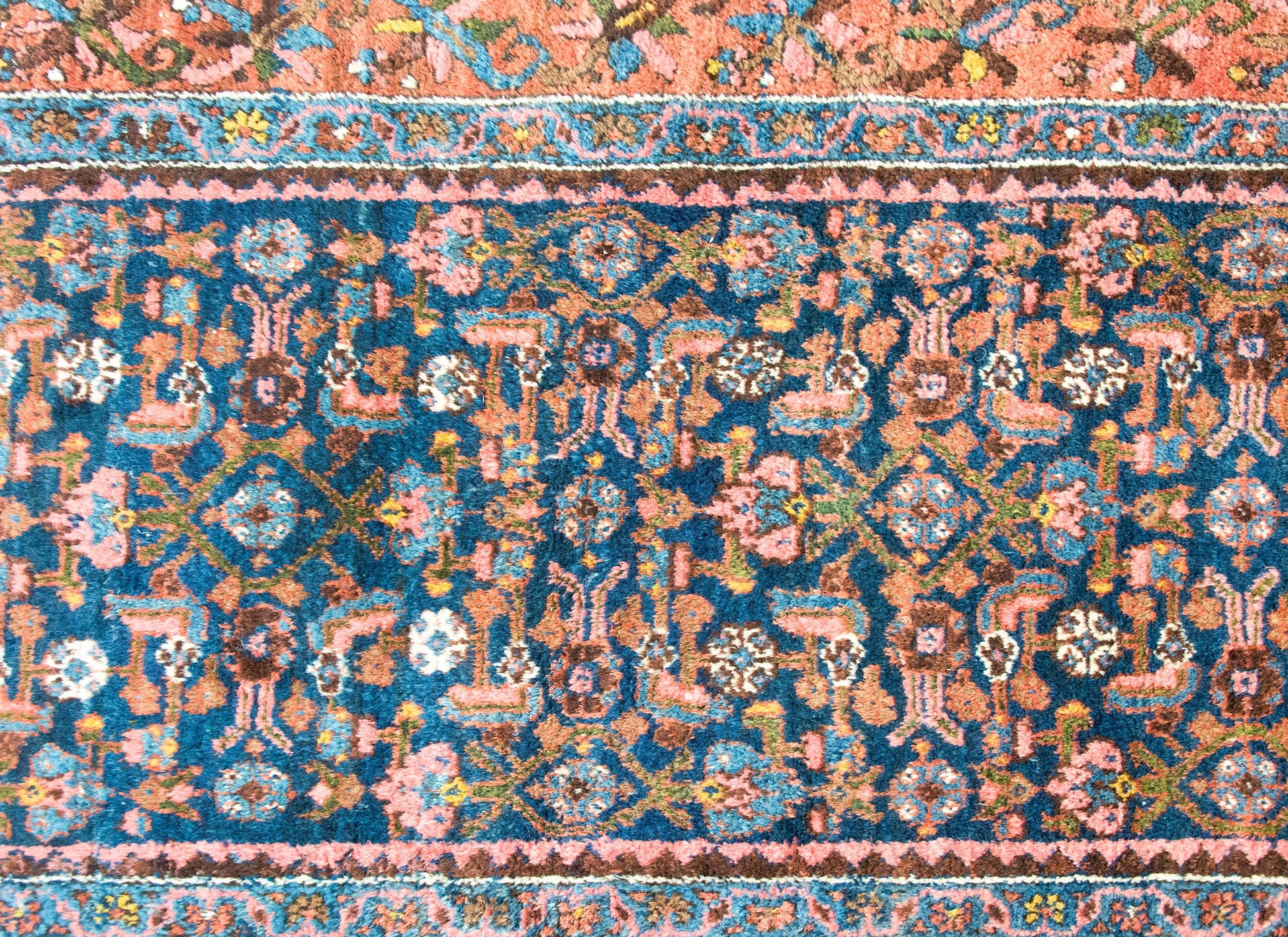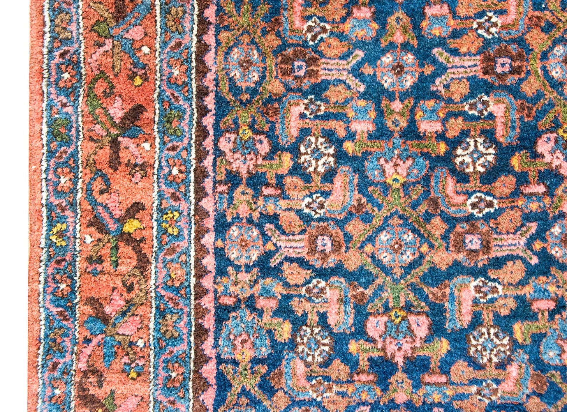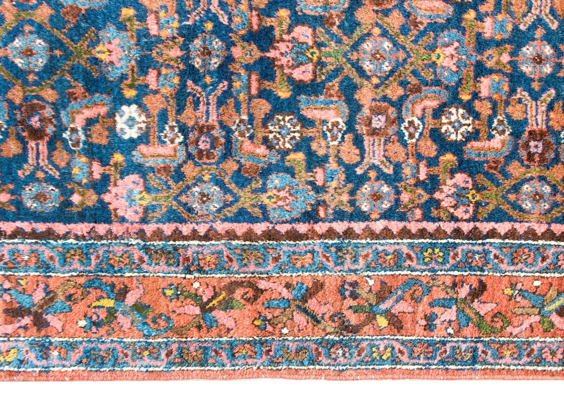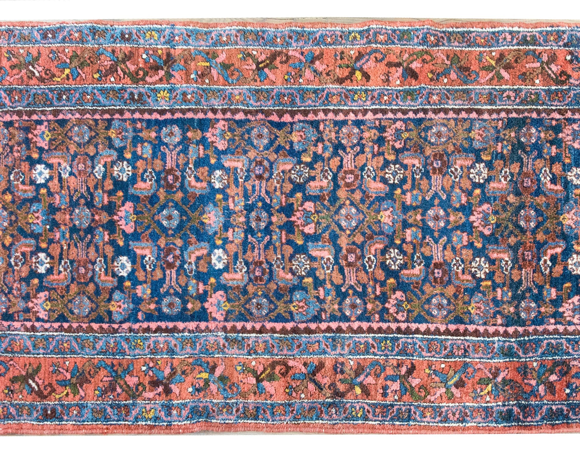 An early 20th century Persian Malayer rug with a central field with an all-over floral and leaf pattern, surrounded by a complex border with a central floral and scrolling vine stripe flanked by pairs of matching petite floral and geometric patterned stripes, and all woven in shades of pink, indigo, gold, green, and violet wool.