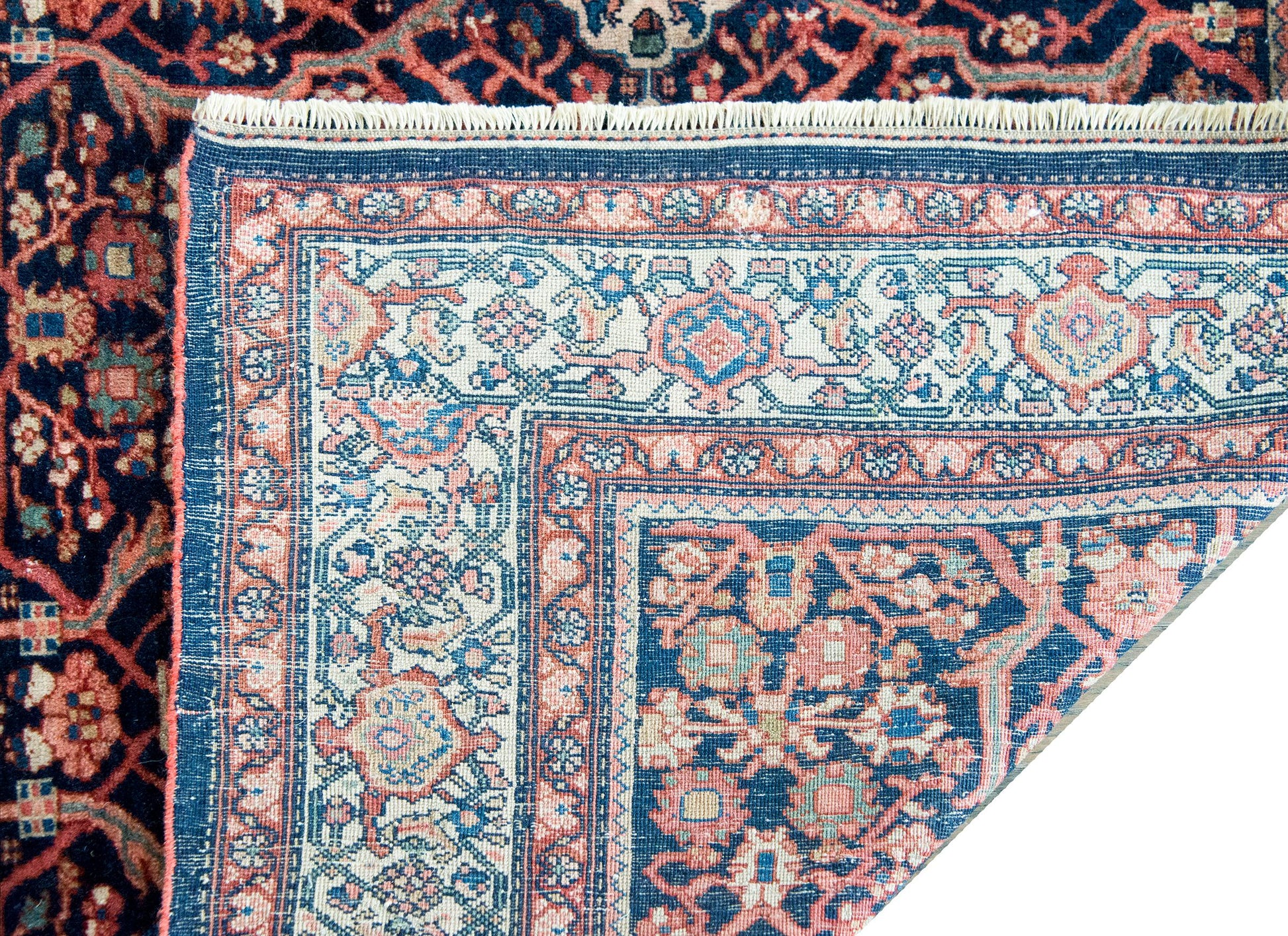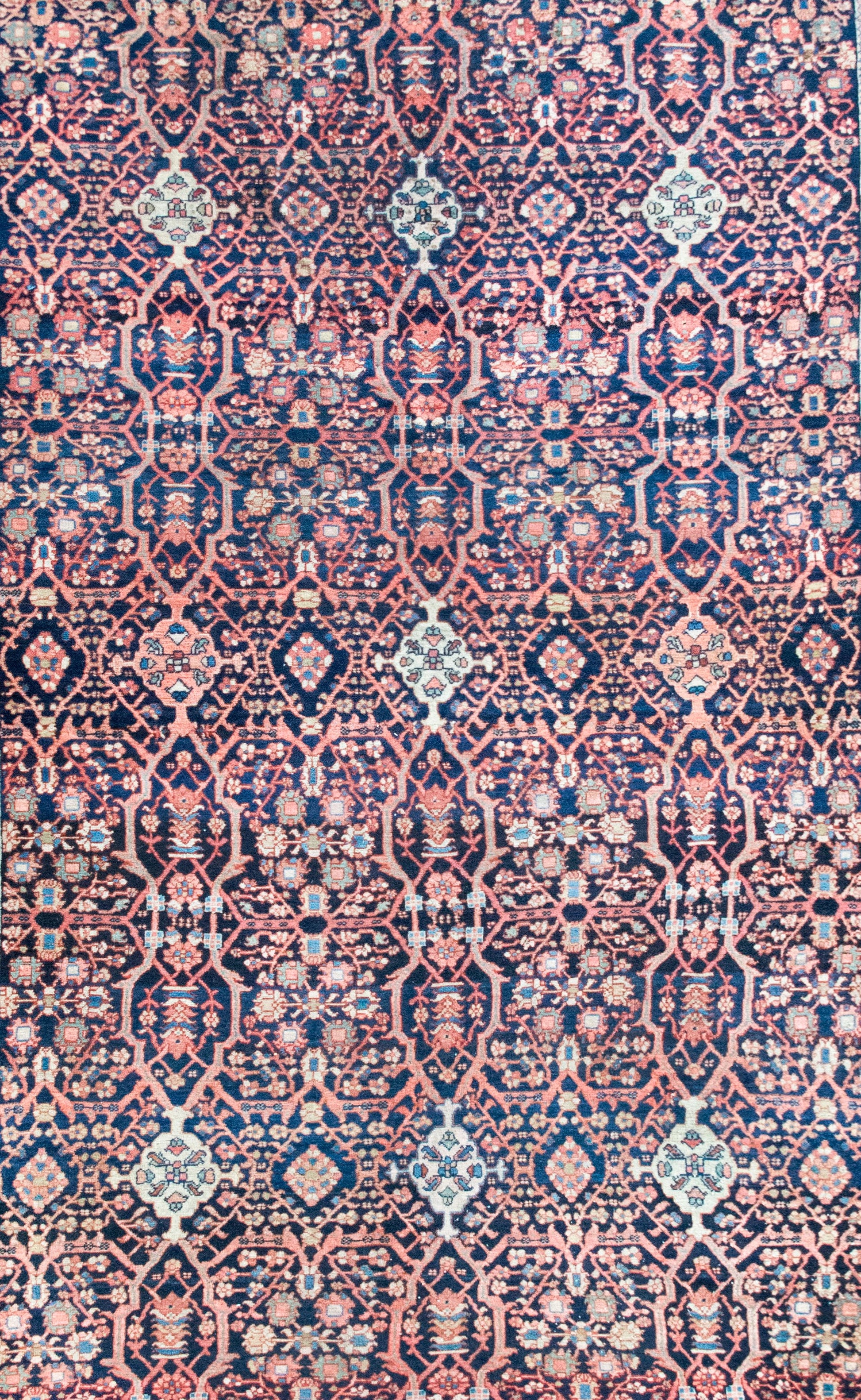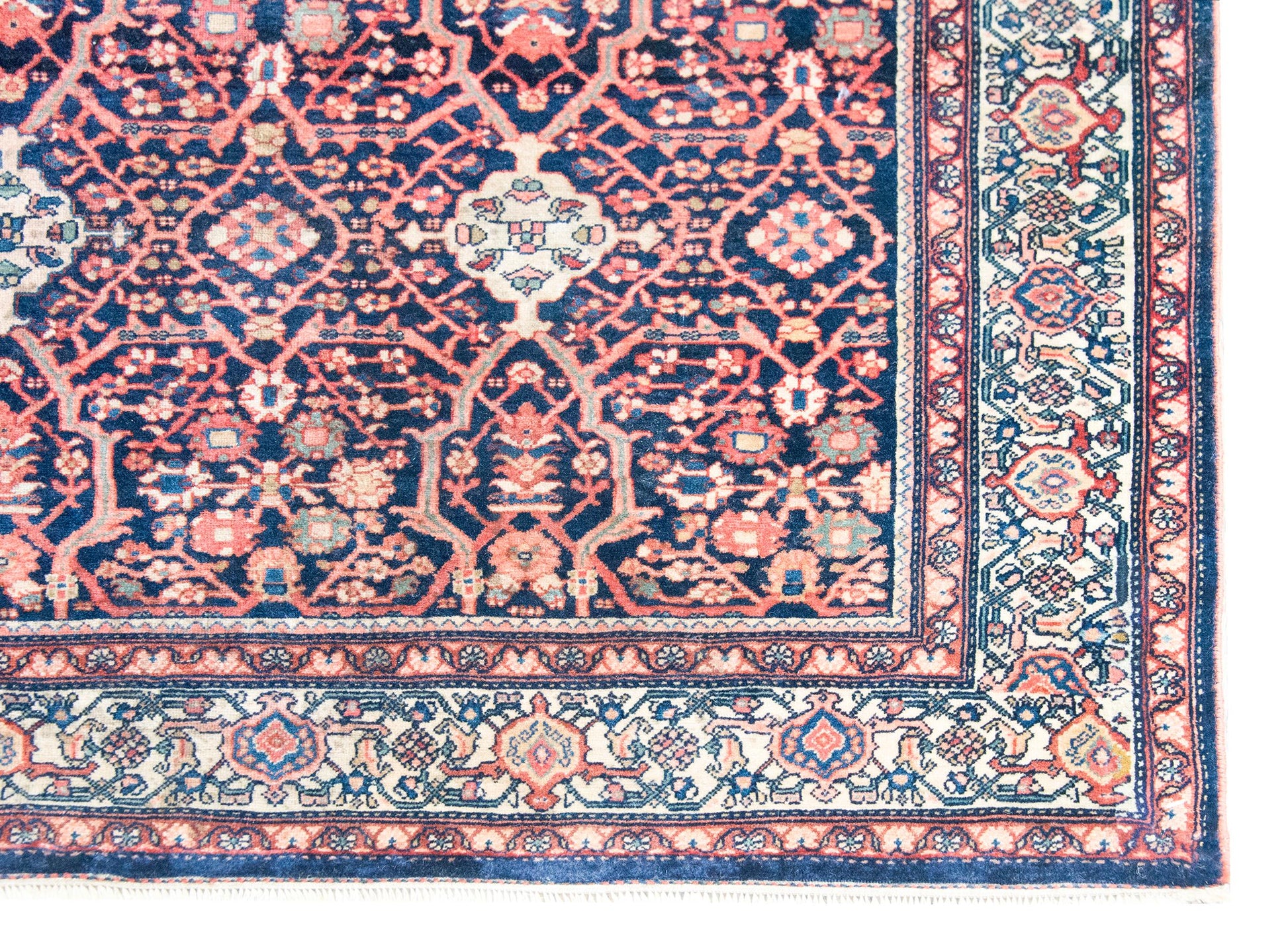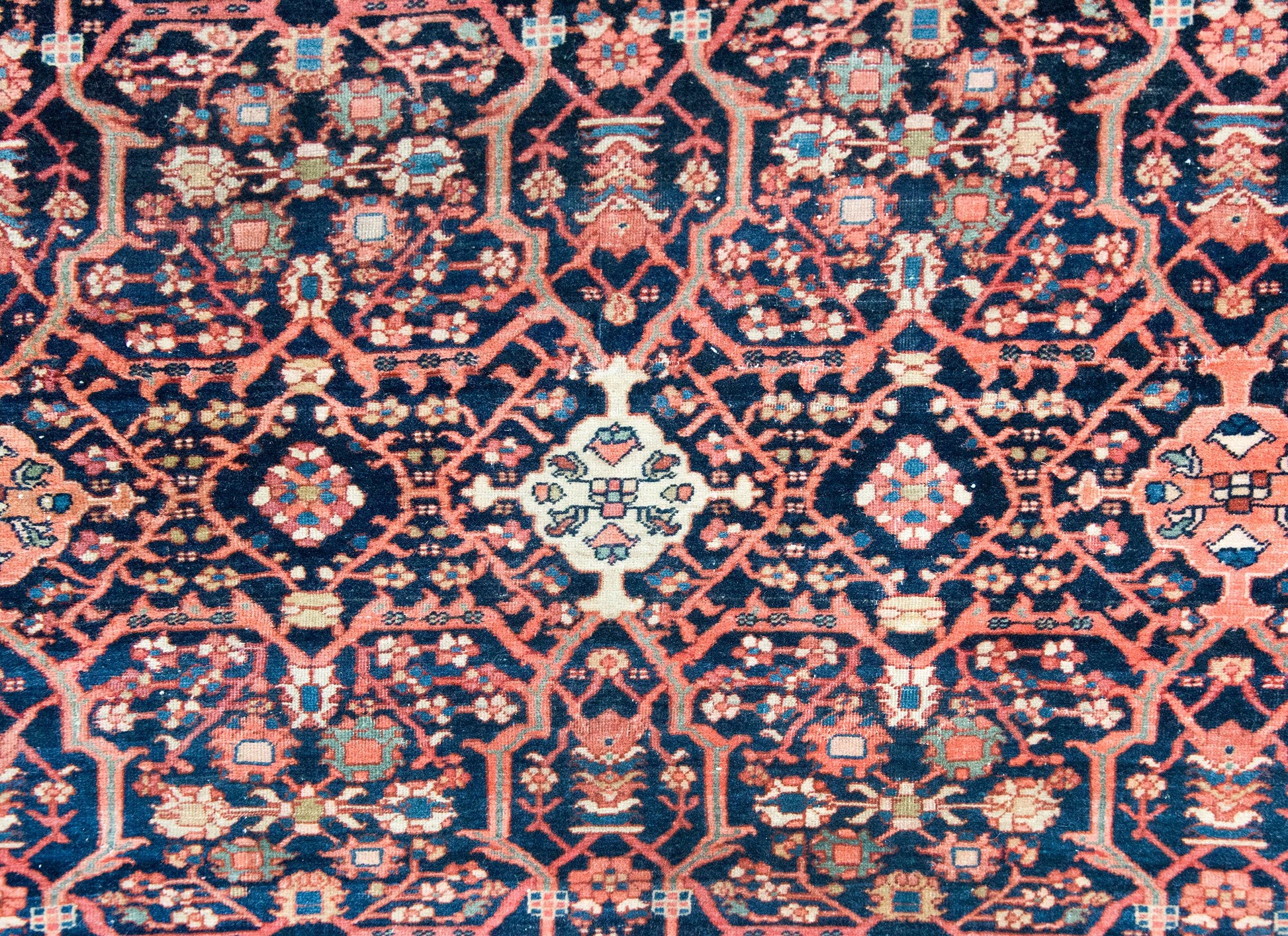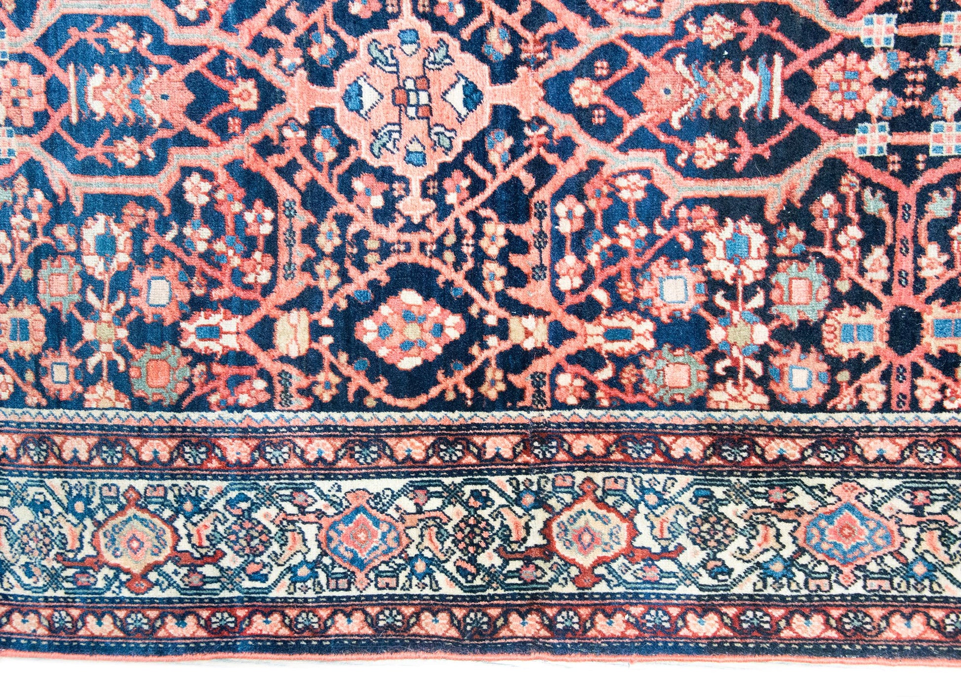 A remarkable early 20th century Persian Mission Malayer rug with an all-over floral trellis pattern surrounded by a wide border with a central floral and vine pattern flanked by pairs of petite floral patterned stripes, and all woven in varying shades of indigo, crimson, pink, and cream colored wool.