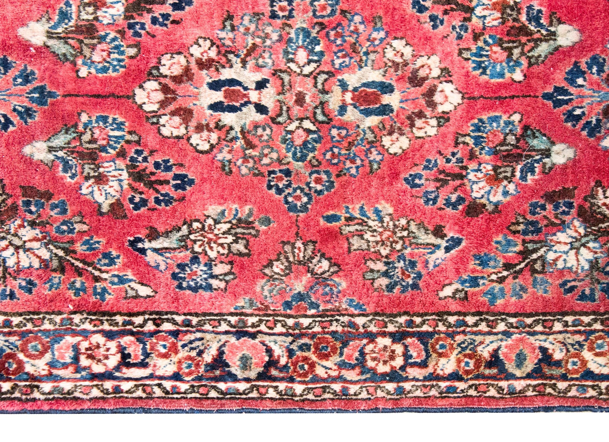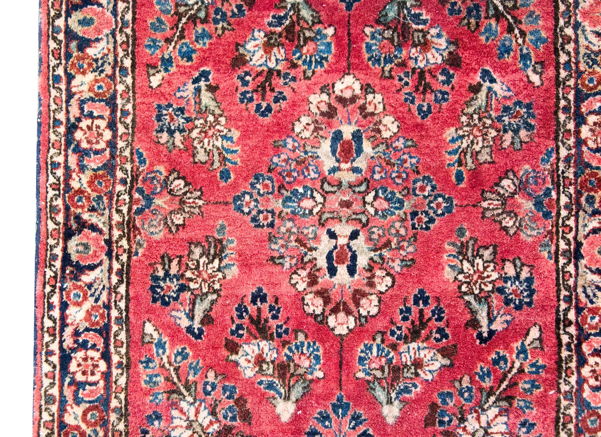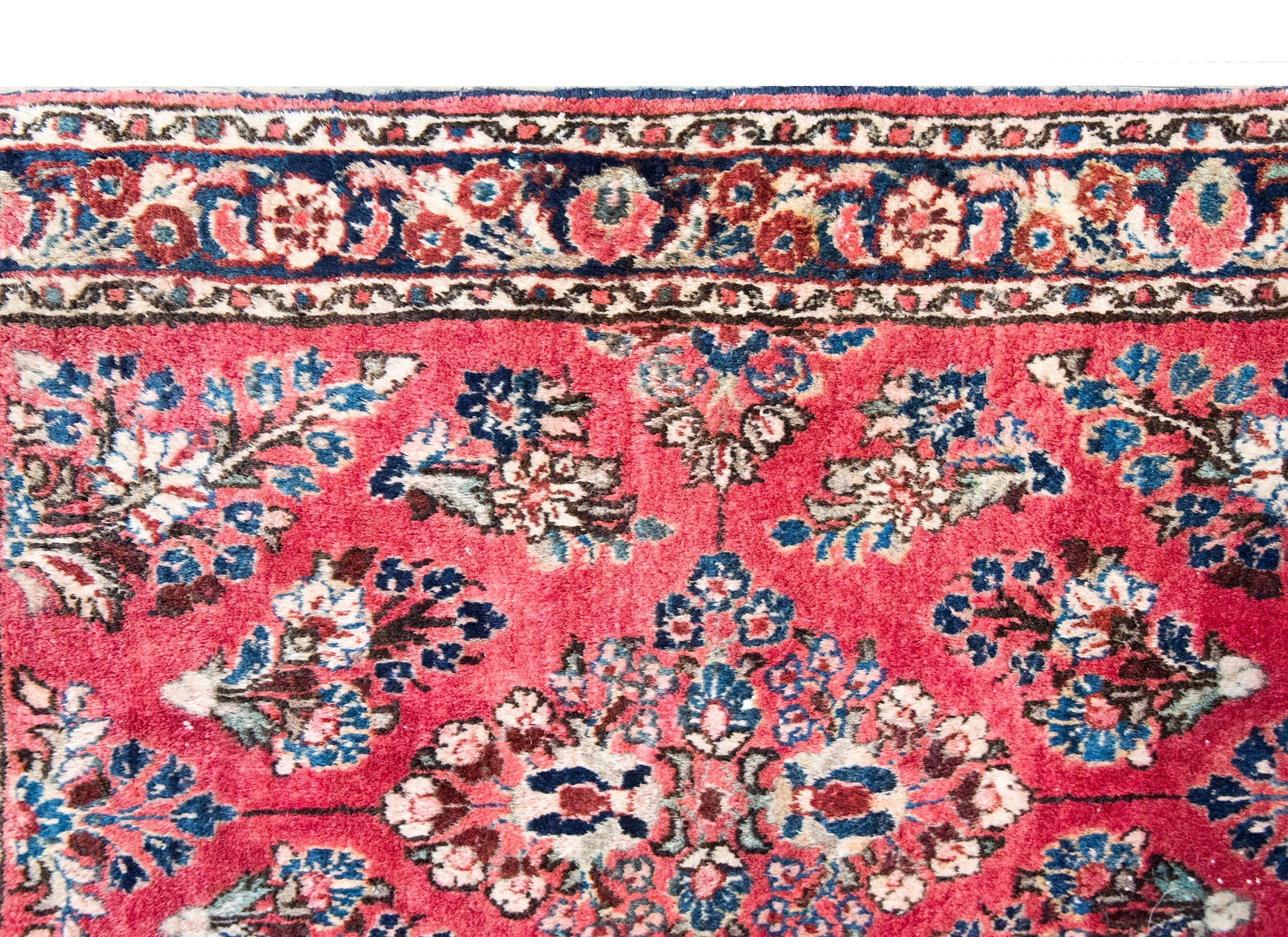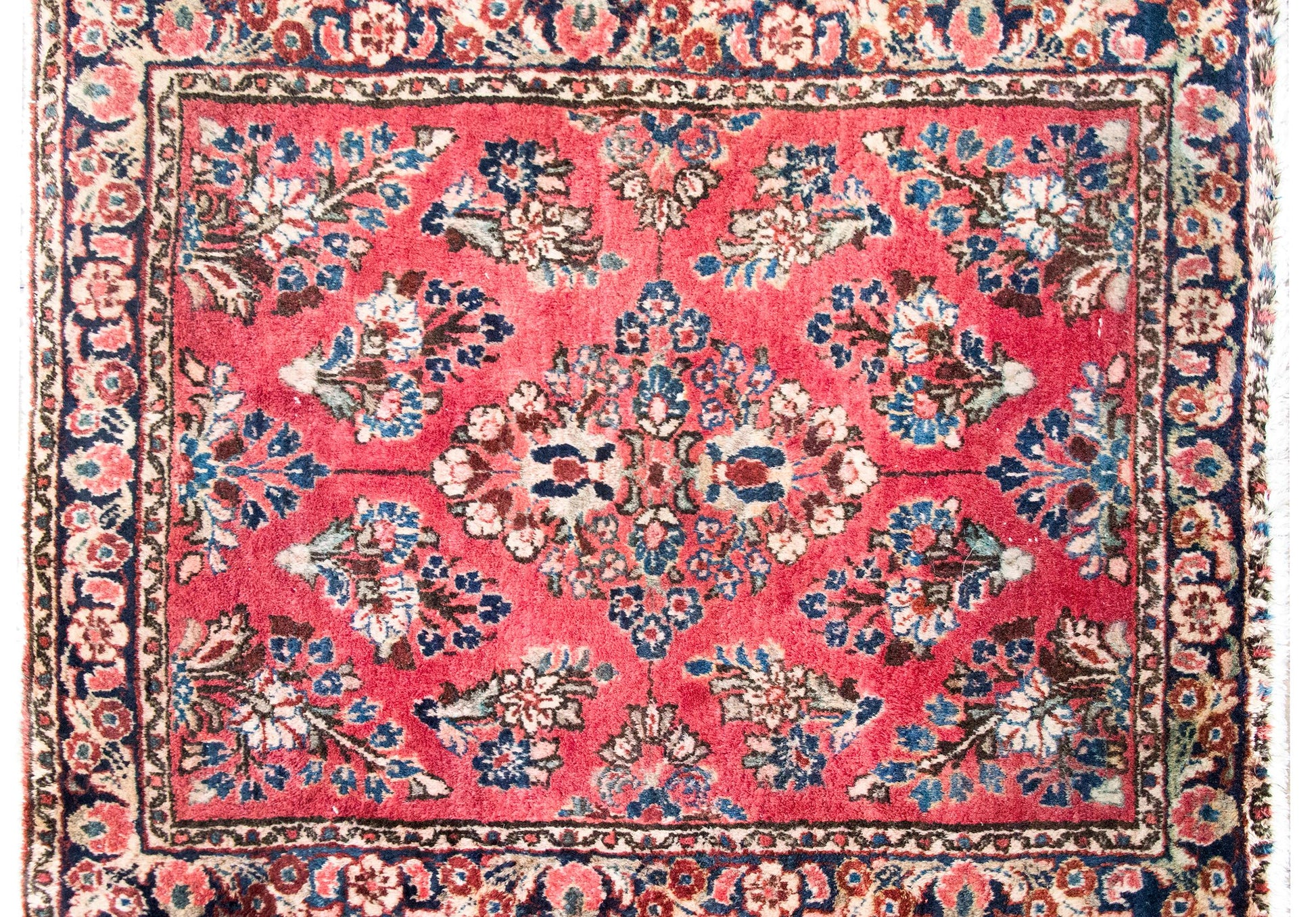 A petite early 20th century Persian Sarouk rug with a mirrored floral pattern across the field, surrounded by a simple floral and scrolling vine patterned border, and all woven in traditional Sarouk colors of cranberry, cream, pink, and varying shades of indigo.
