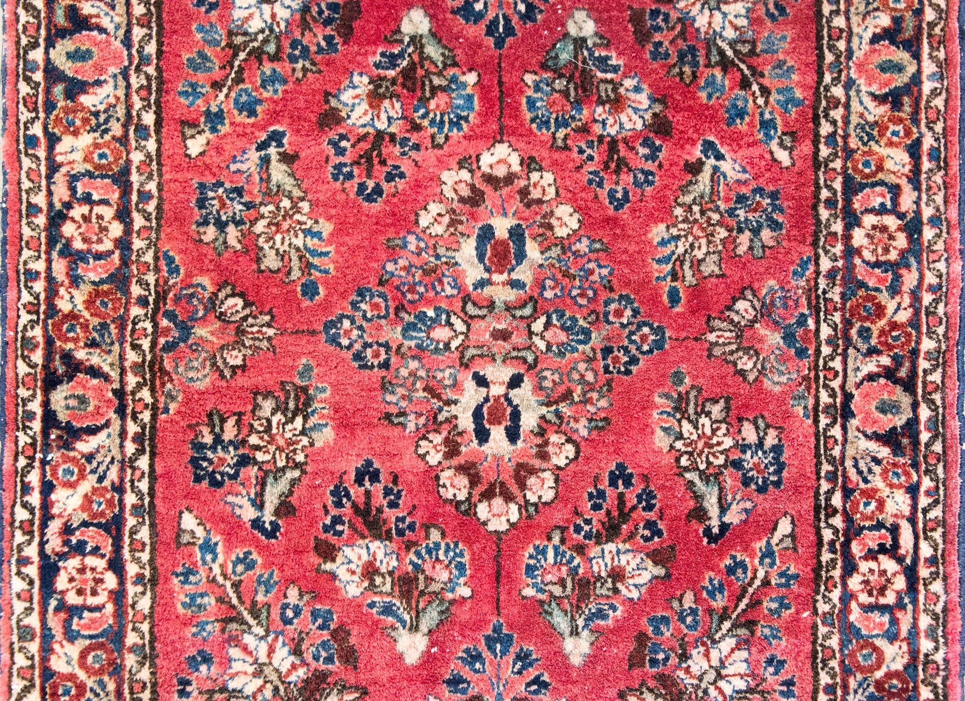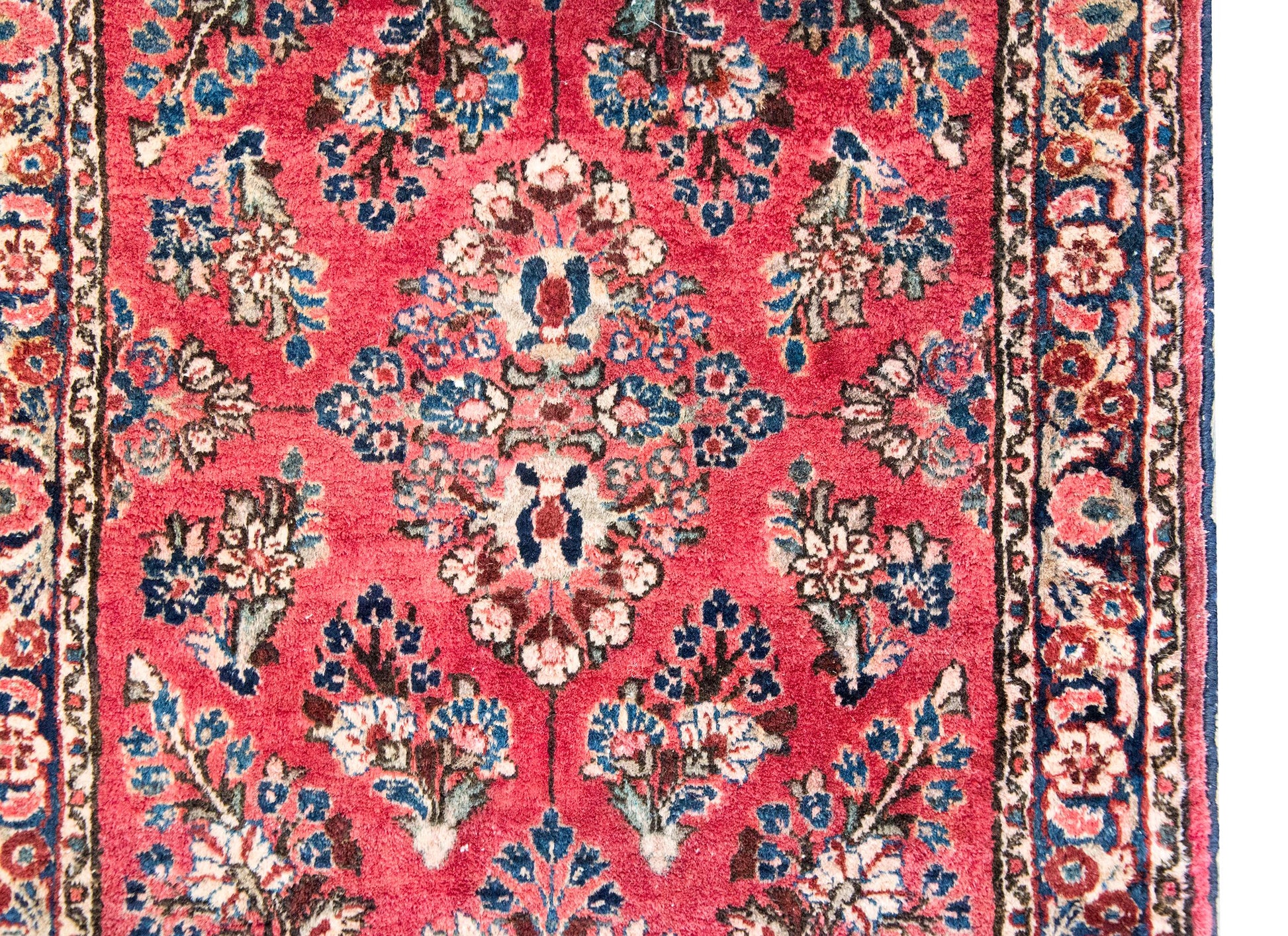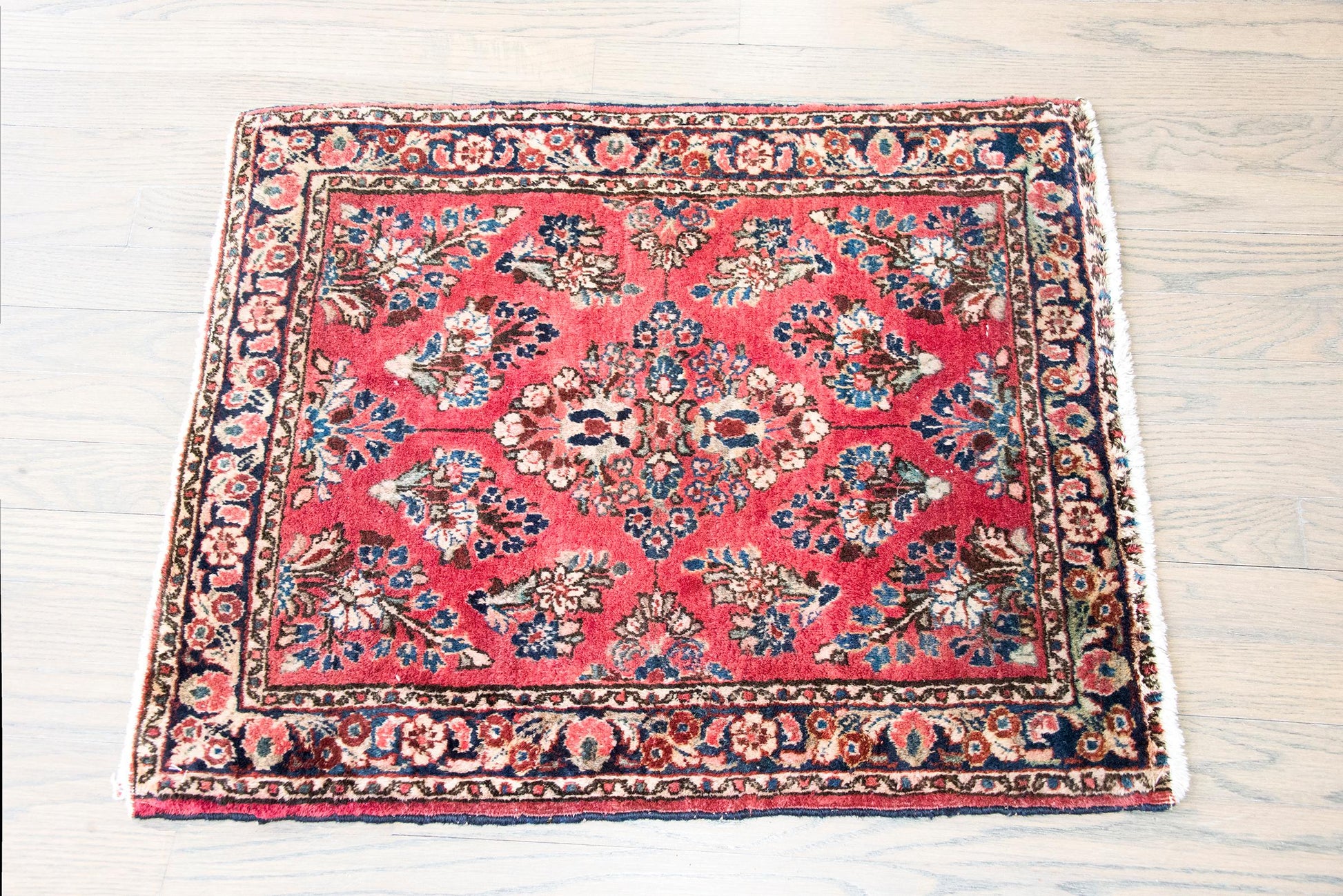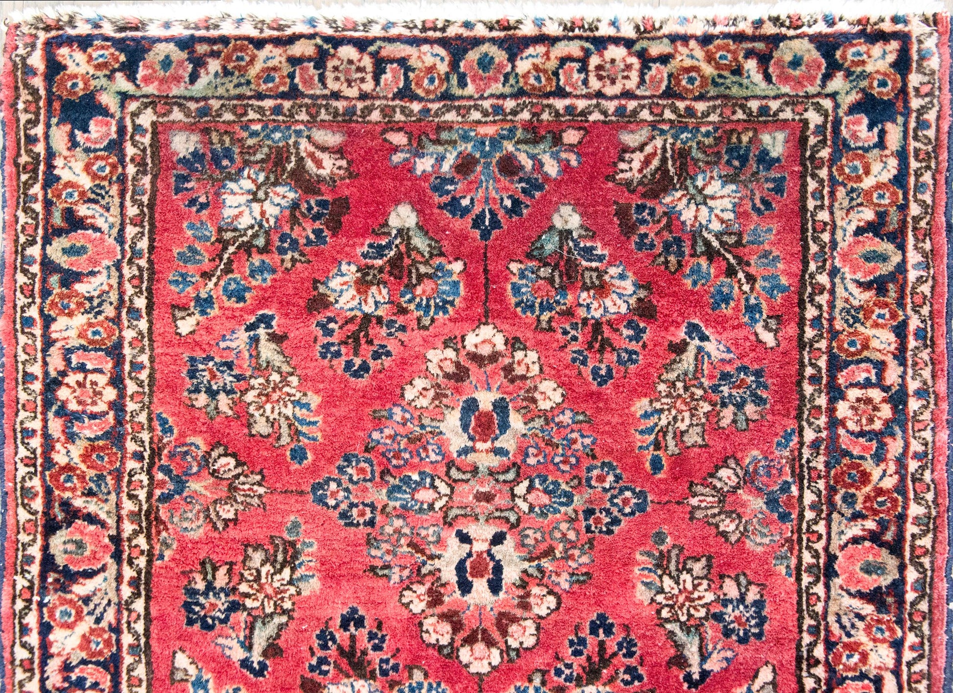 A petite early 20th century Persian Sarouk rug with a mirrored floral pattern across the field, surrounded by a simple floral and scrolling vine patterned border, and all woven in traditional Sarouk colors of cranberry, cream, pink, and varying shades of indigo.