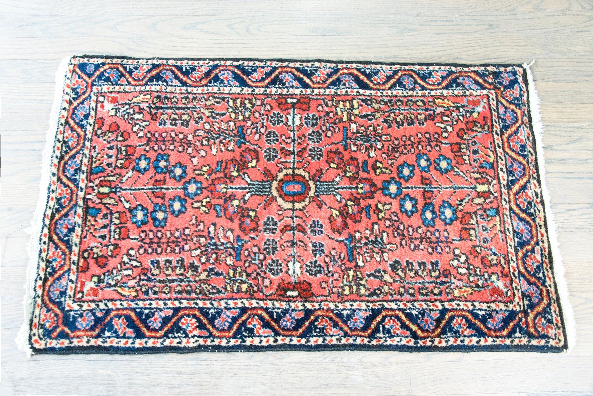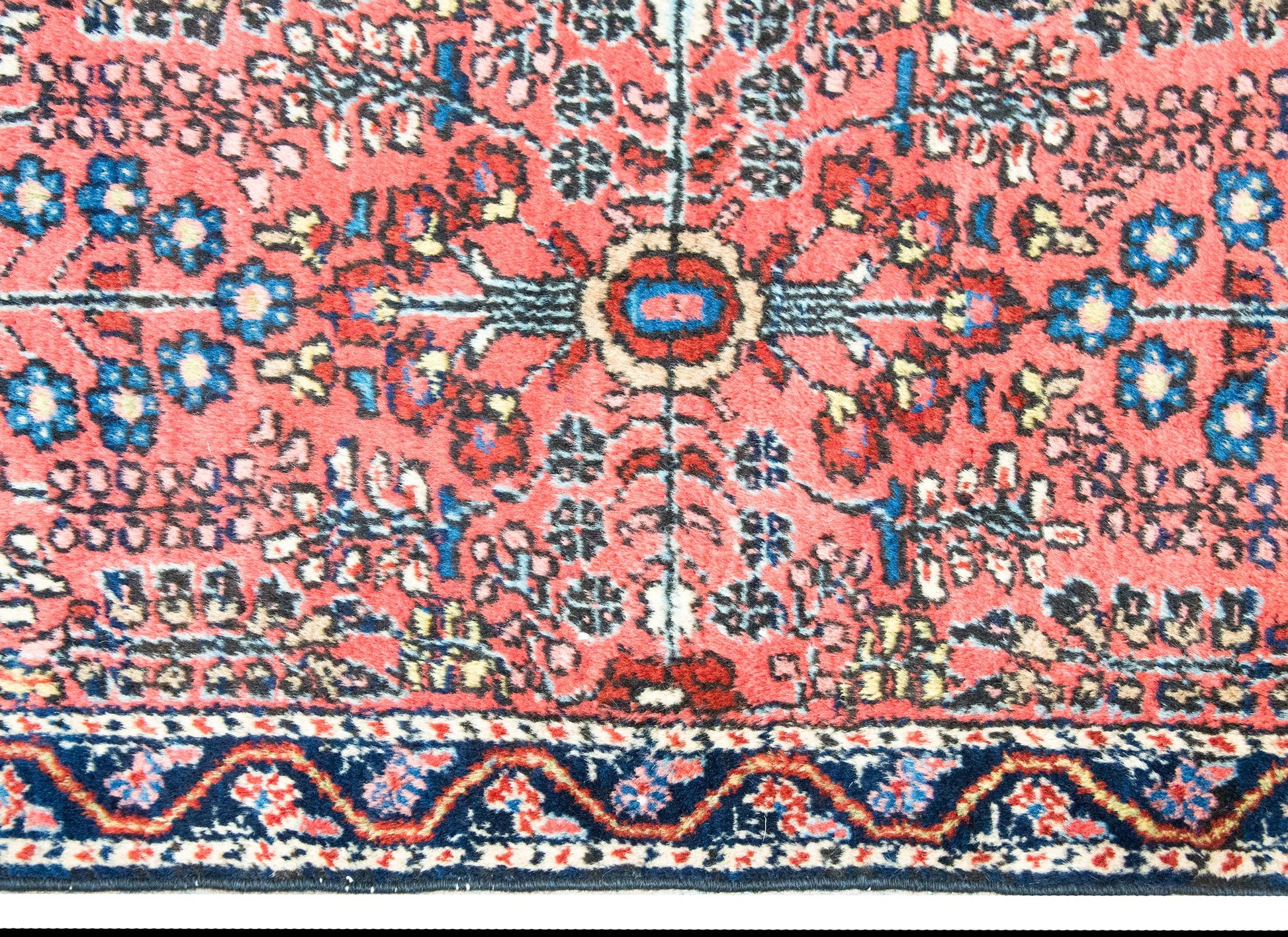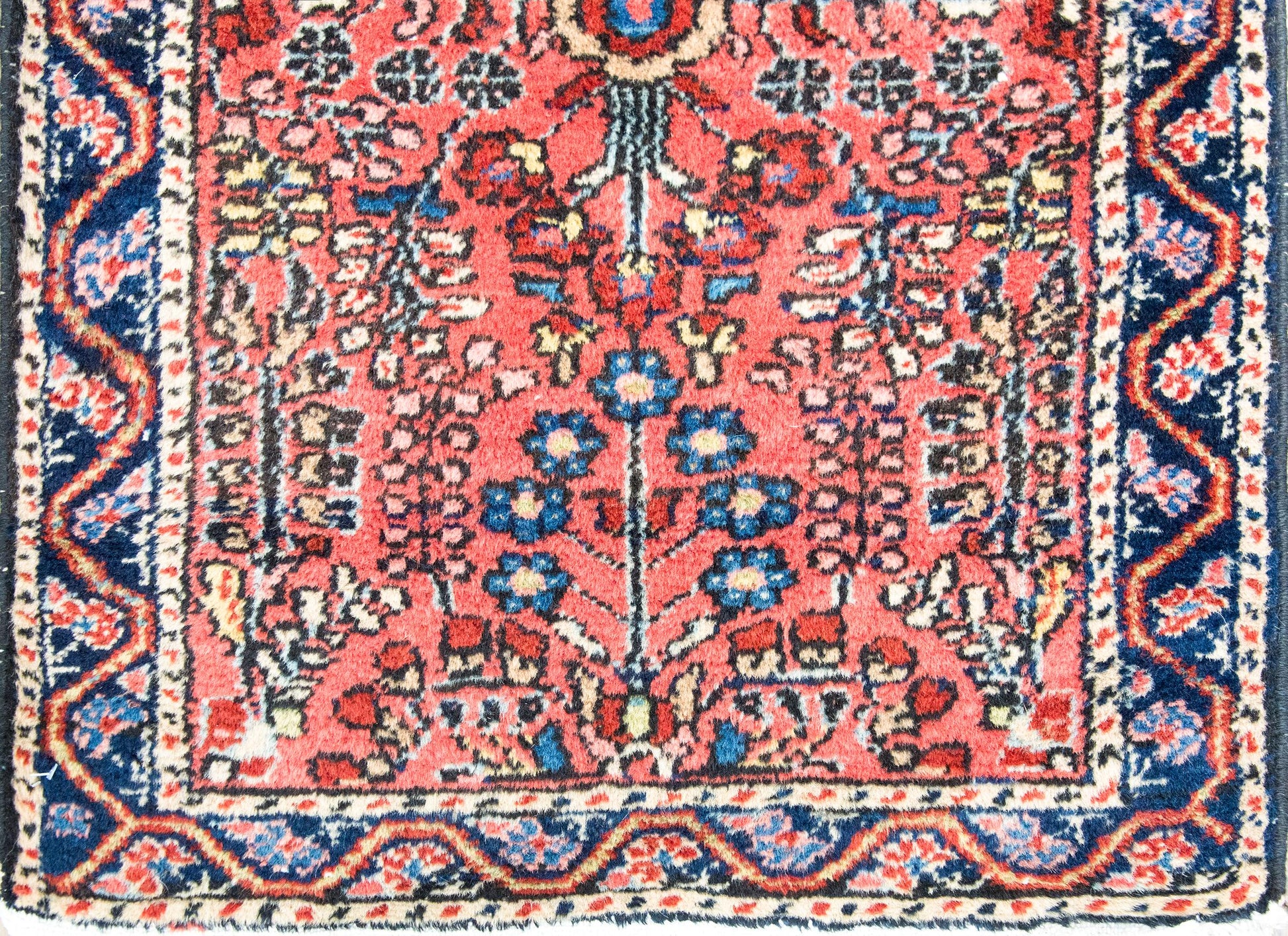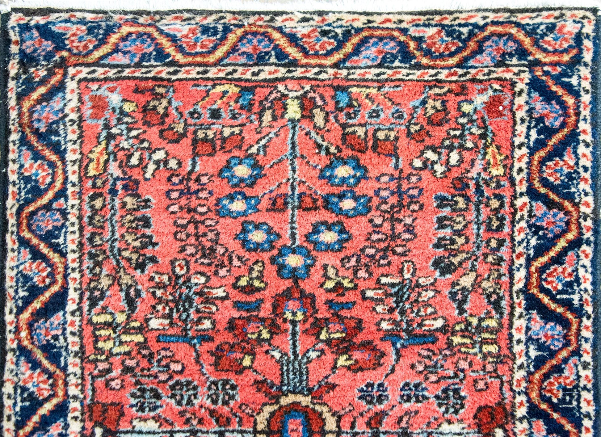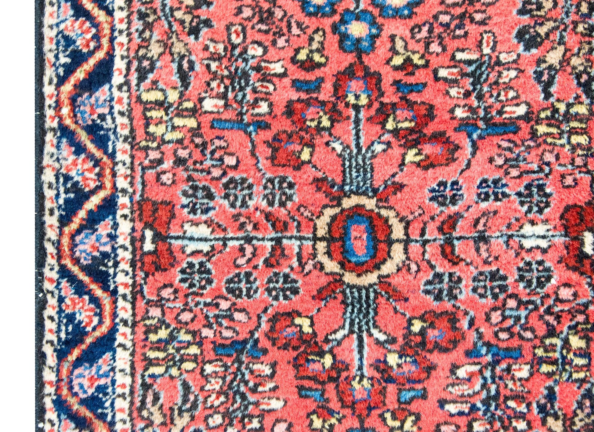 A striking early 20th century petite Persian Sarouk rug with a mirrored floral pattern with myriad varieties and clusters of flowers, surrounded by a simple border with a scrolling vine and flowers, and all woven in varying shades of crimson, coral, cream, and indigo.