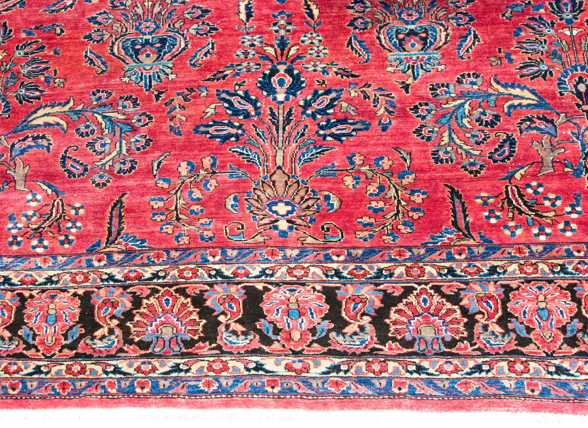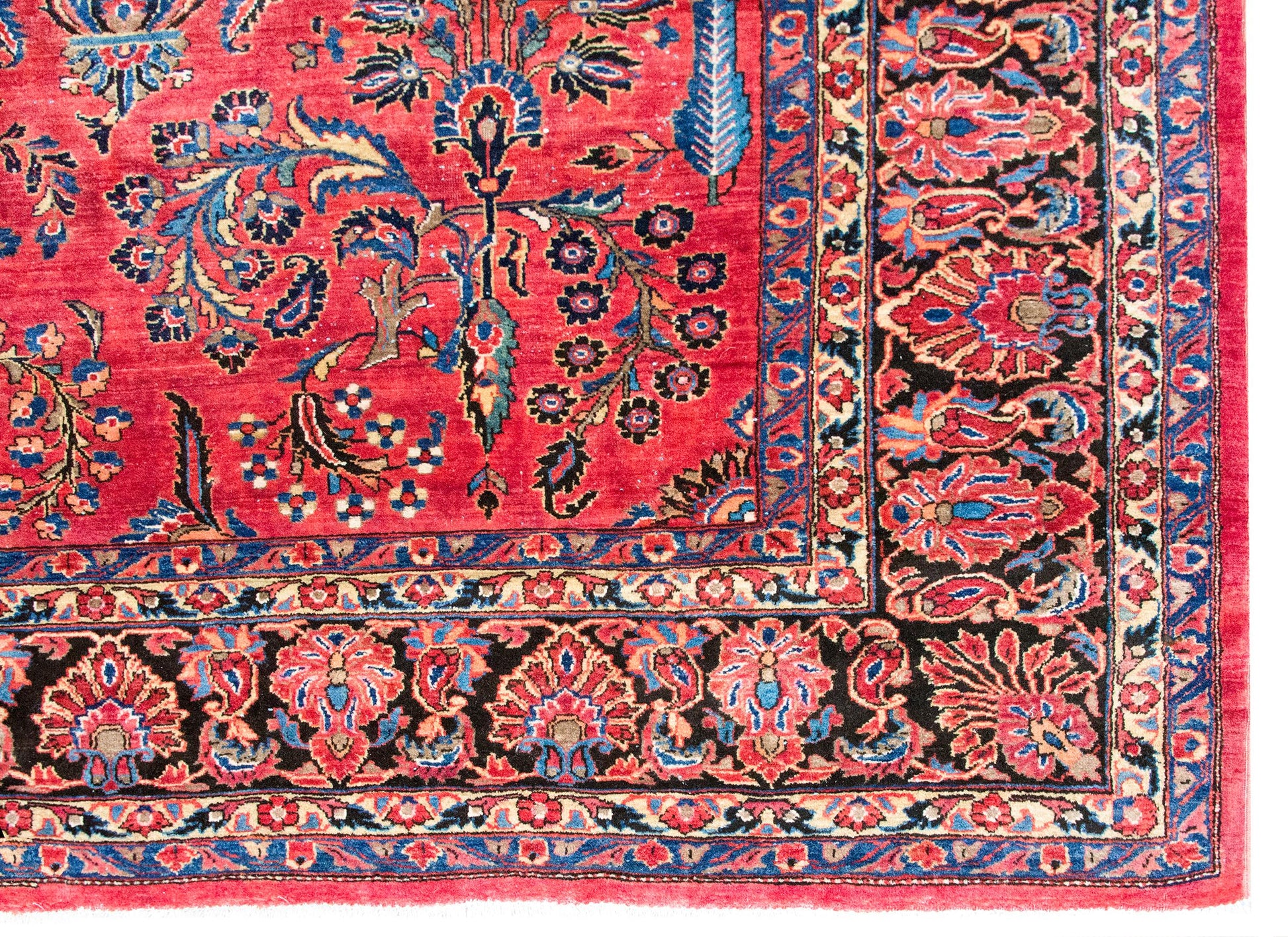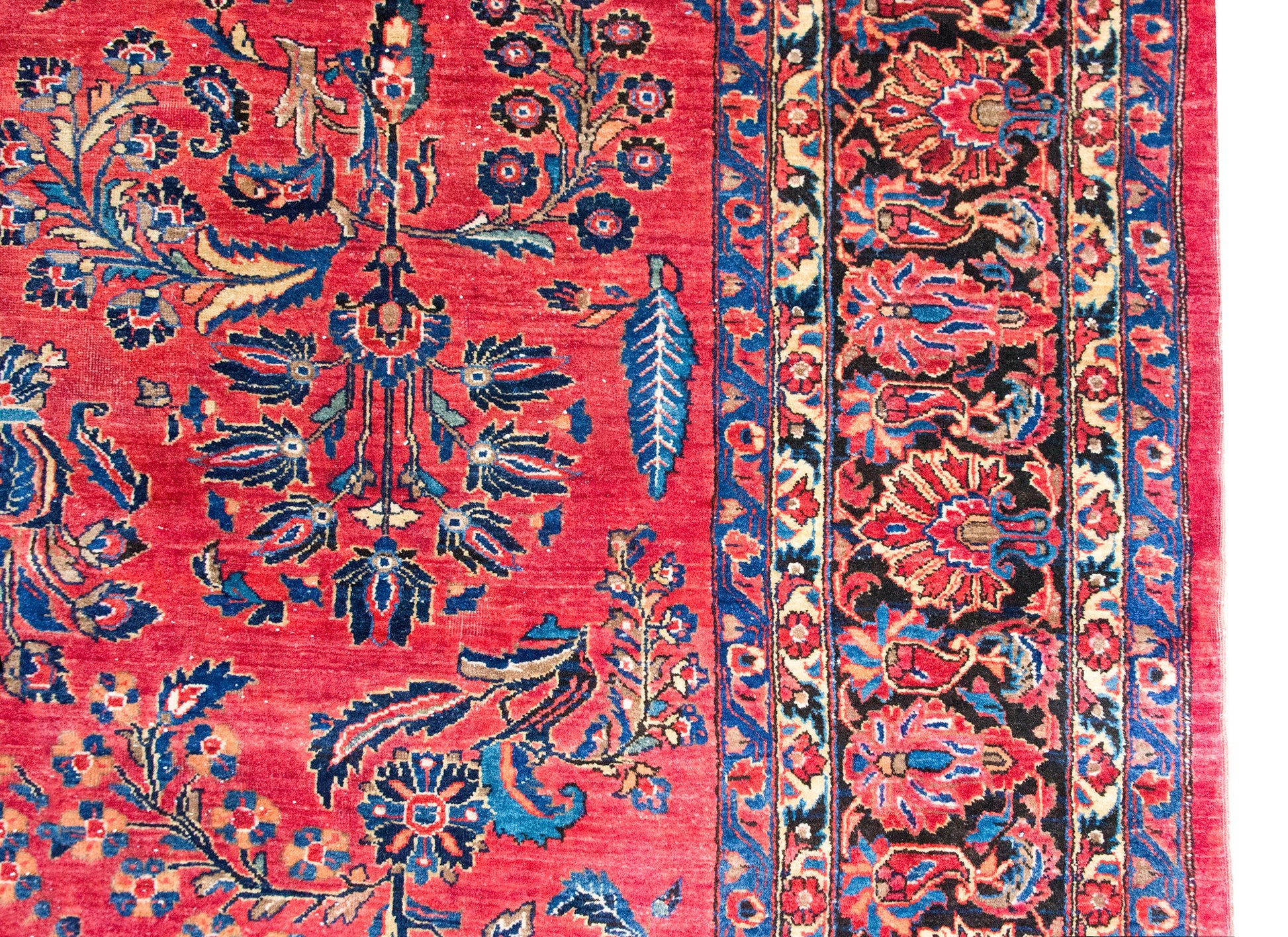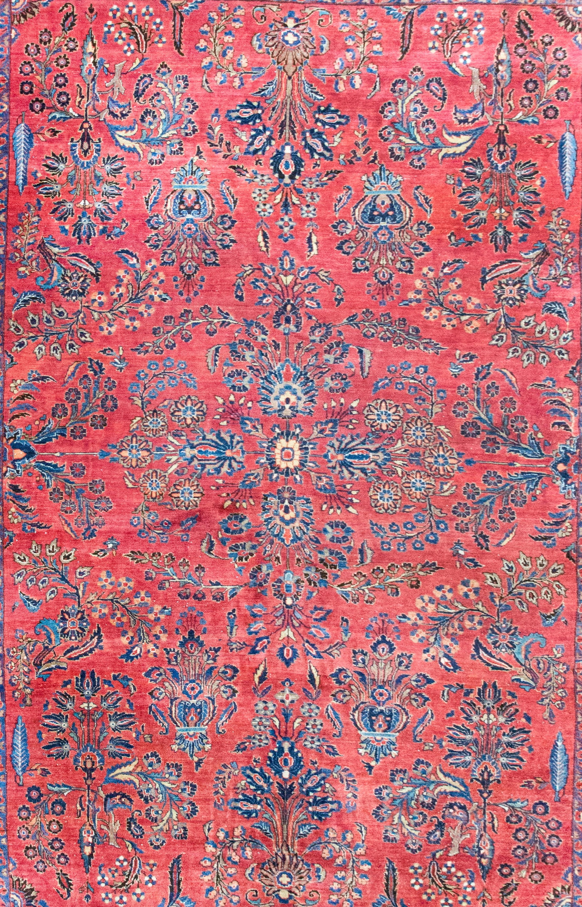 A very traditional early 20th century Persian Sarouk rug with a mirrored floral pattern of large floral clusters woven in typical Sarouk coors of cranberry, light and dark indigo, cream, and pink, and surrounded by a wonderful repeated floral pattered border woven in similar colors and the field.