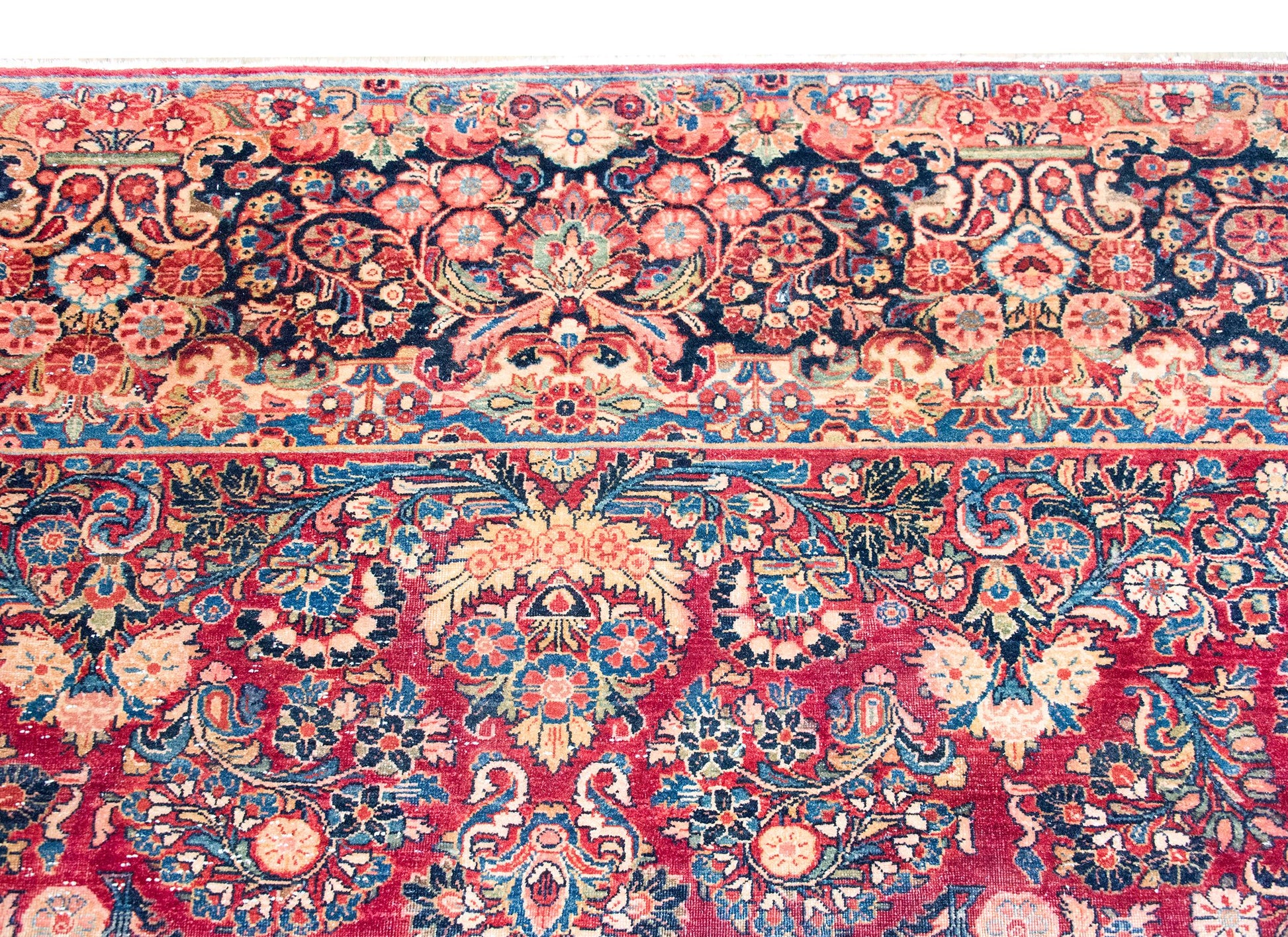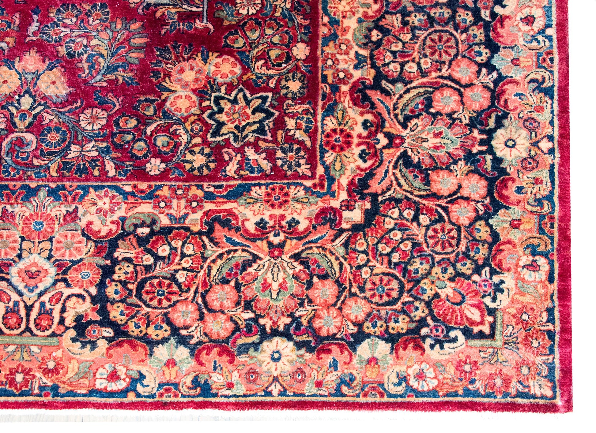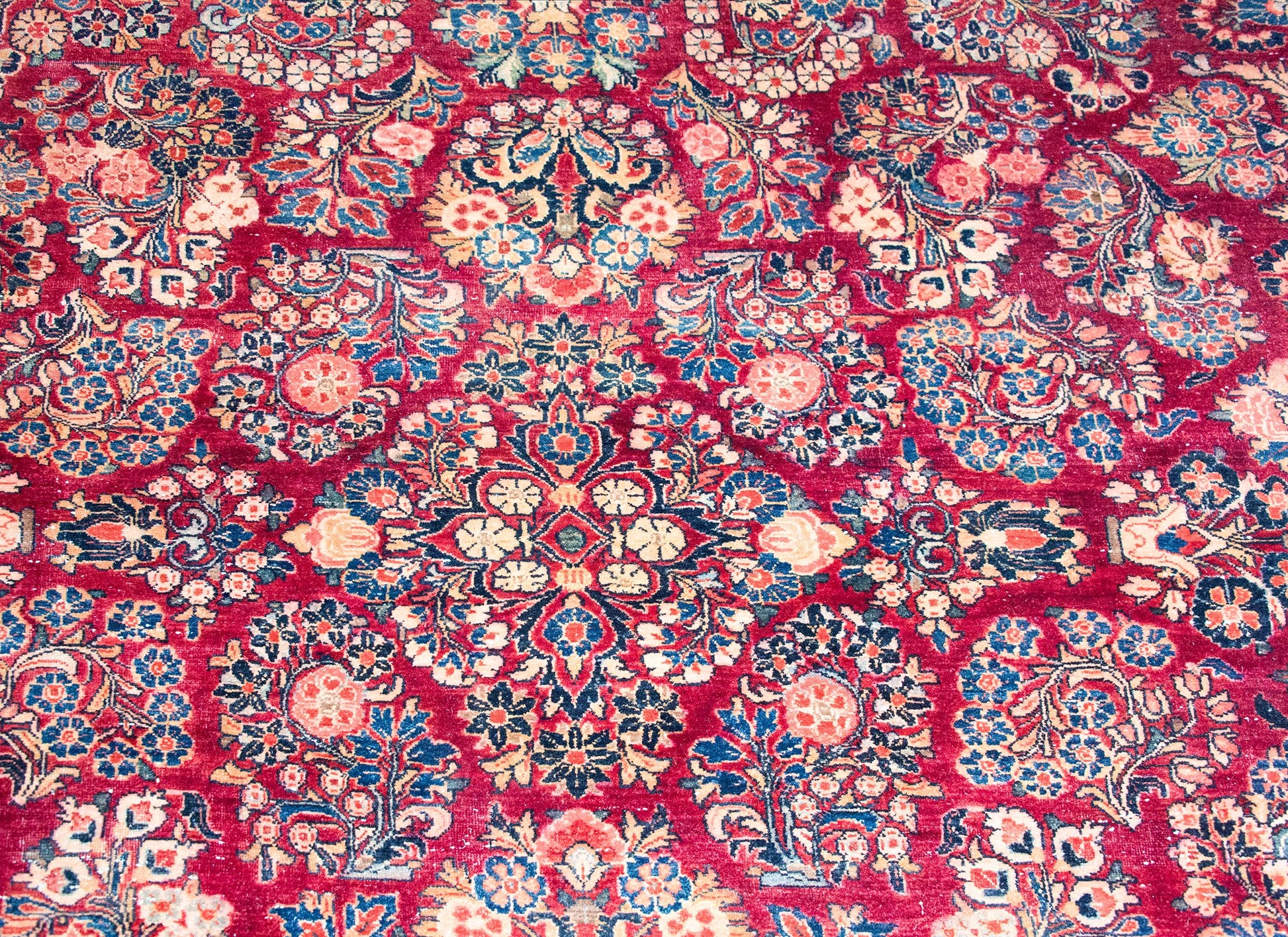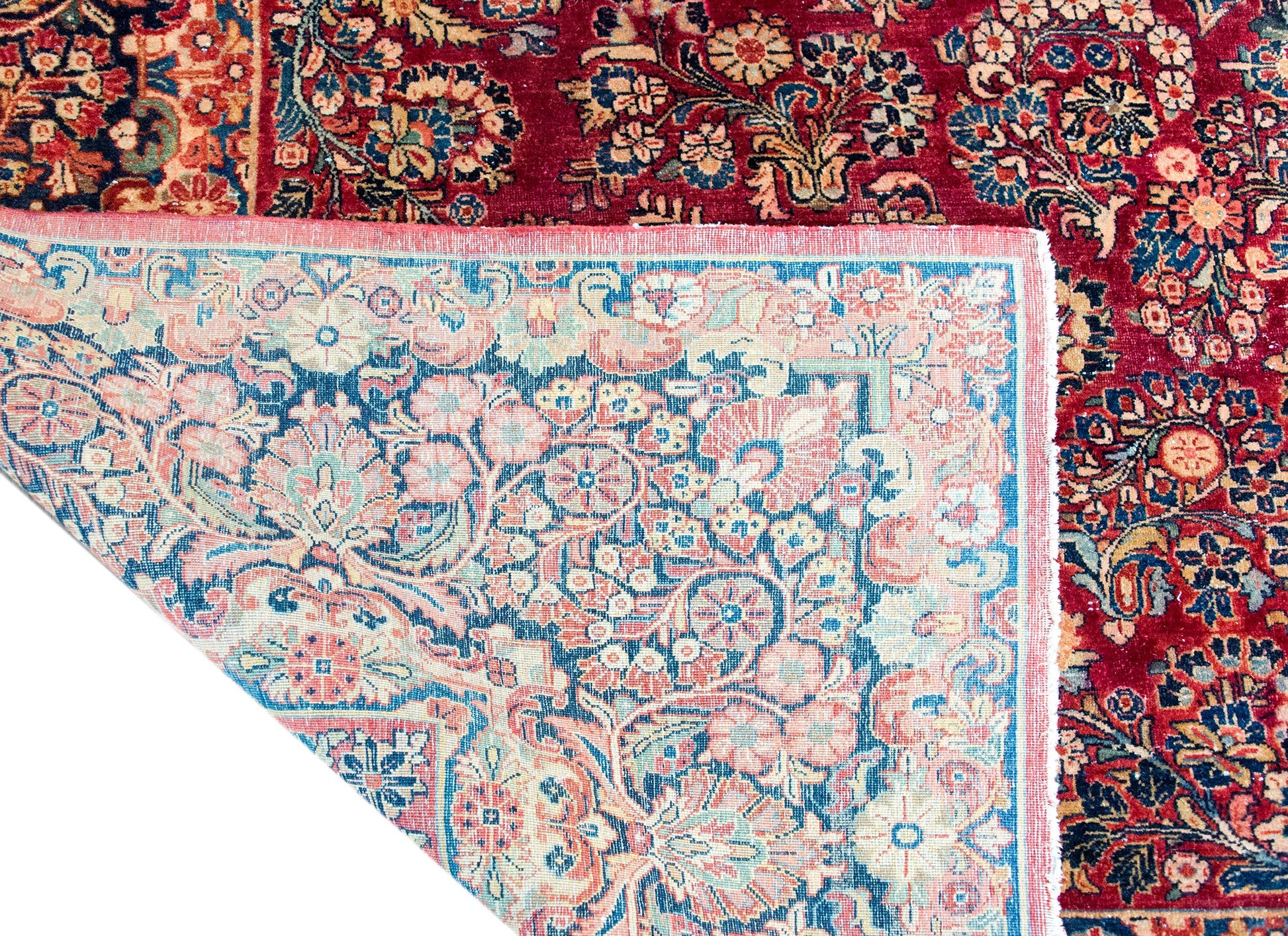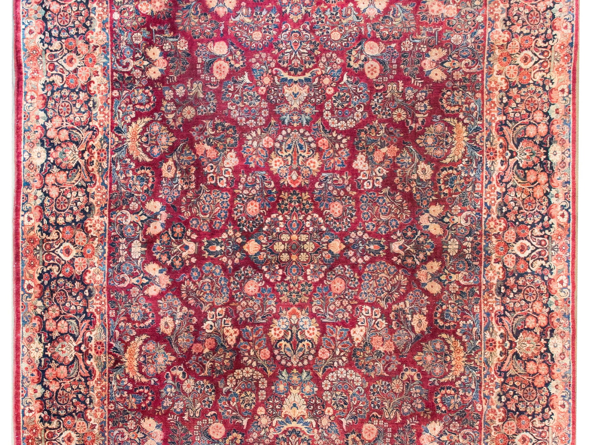 Woven in the traditional Sarouk palette, this piece boasts rich cranberry tones softened by delicate pink accents, all beautifully offset by varying shades of indigo—from deep navy to pale sky blue—and creamy neutral hues. Each color is rendered in fine wool, giving the rug a soft, luxurious texture and enduring durability.