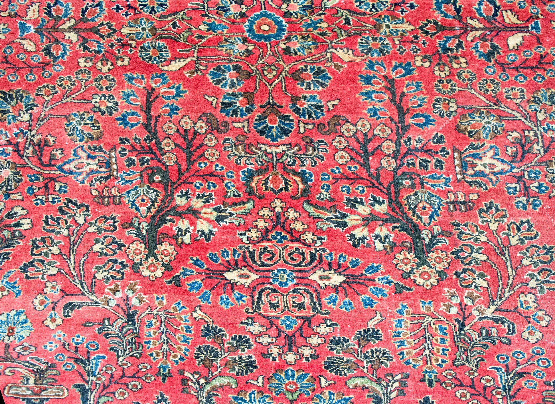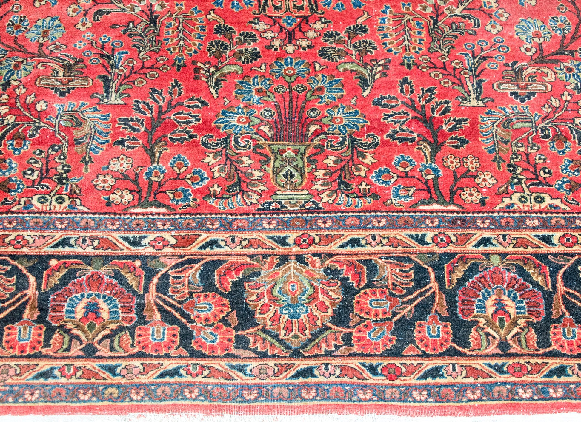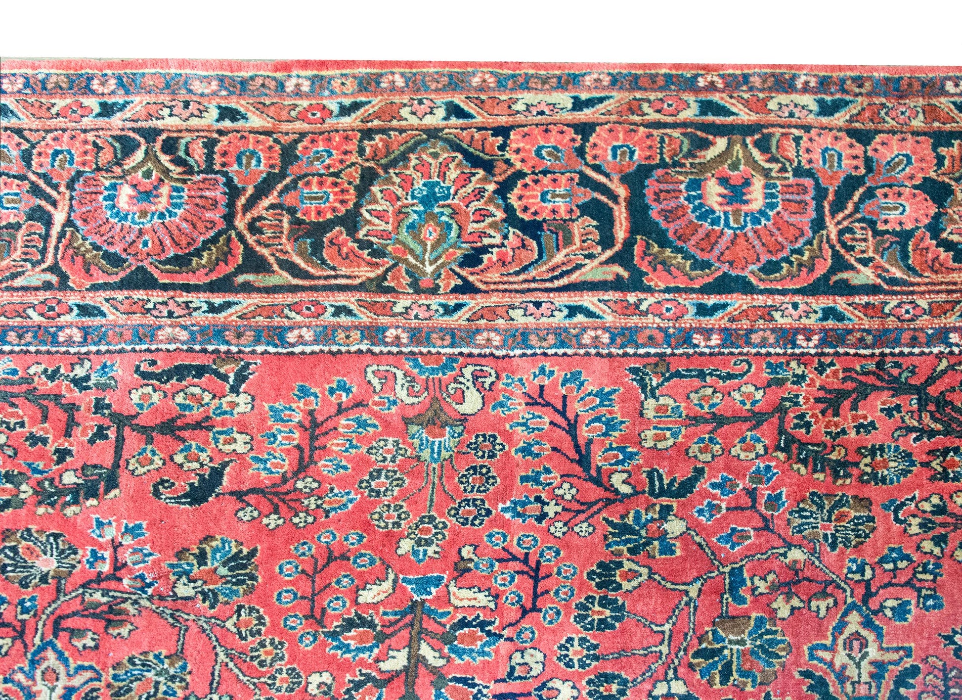 A wonderful early 20th century Persian Sarouk rug with an unusual all-over mirrored floral and scrolling pattern surrounded by a wide floral patterned border flanked by pairs of petite floral patterned stripes, and all woven in traditional Sarouk colors including cranberry, pink, light and dark indigo, and cream colored wool.