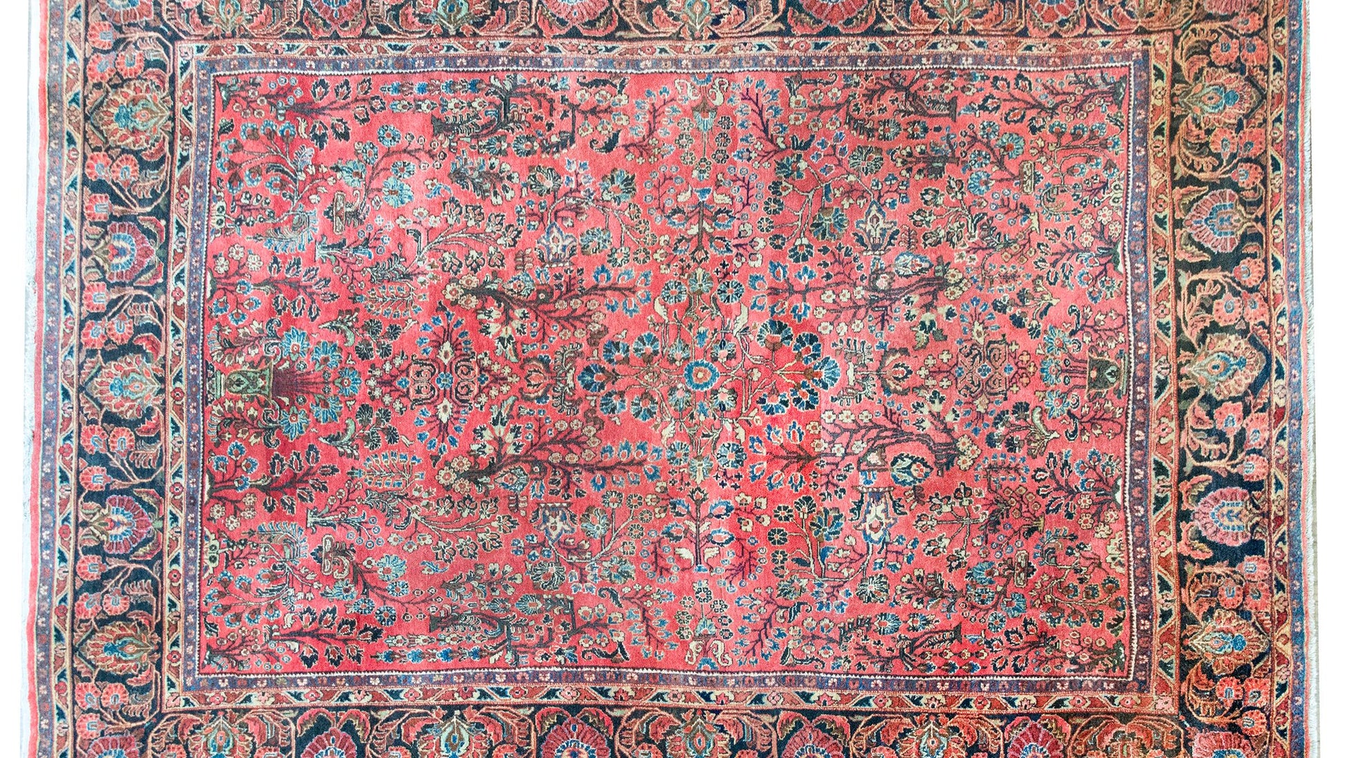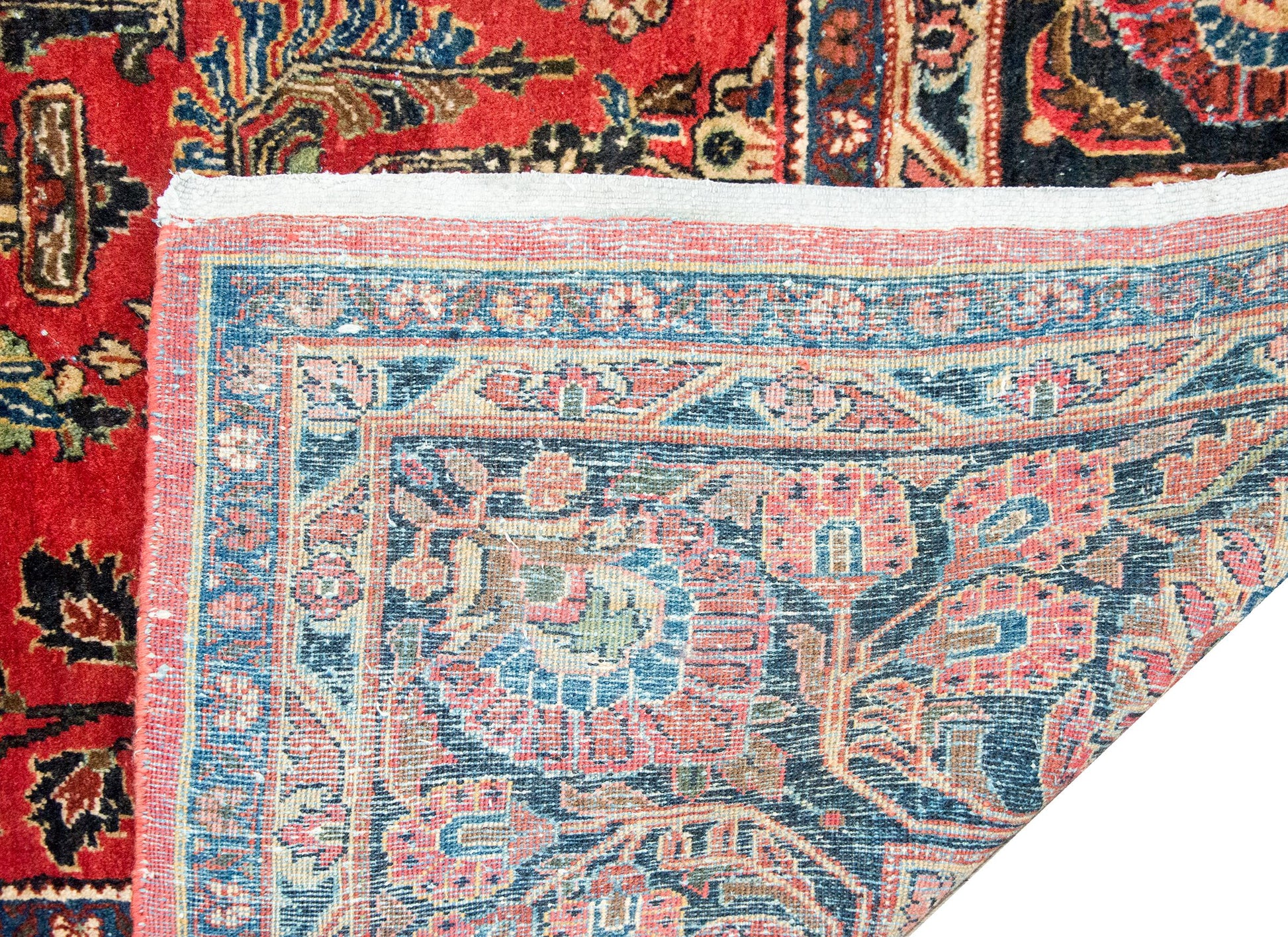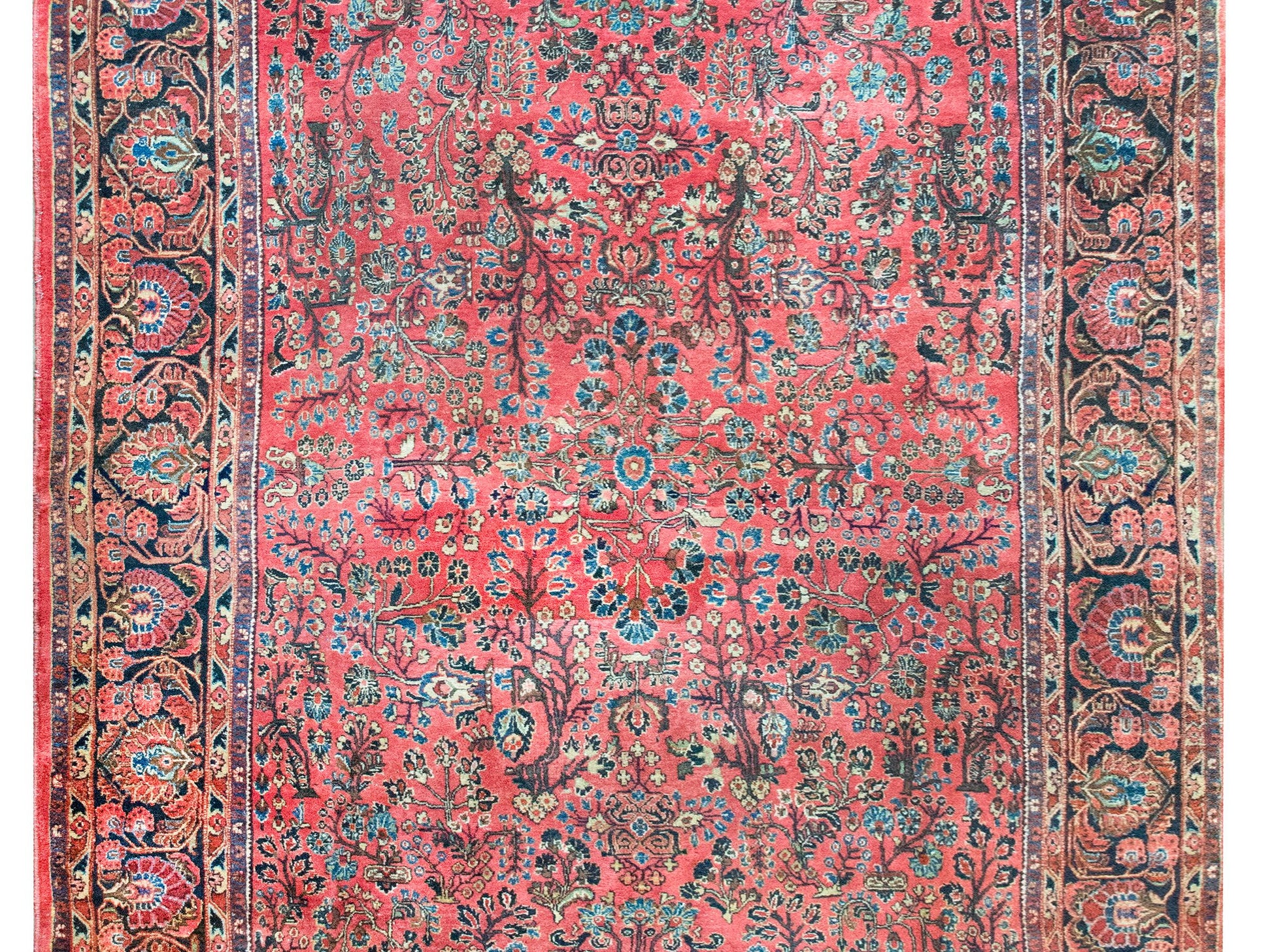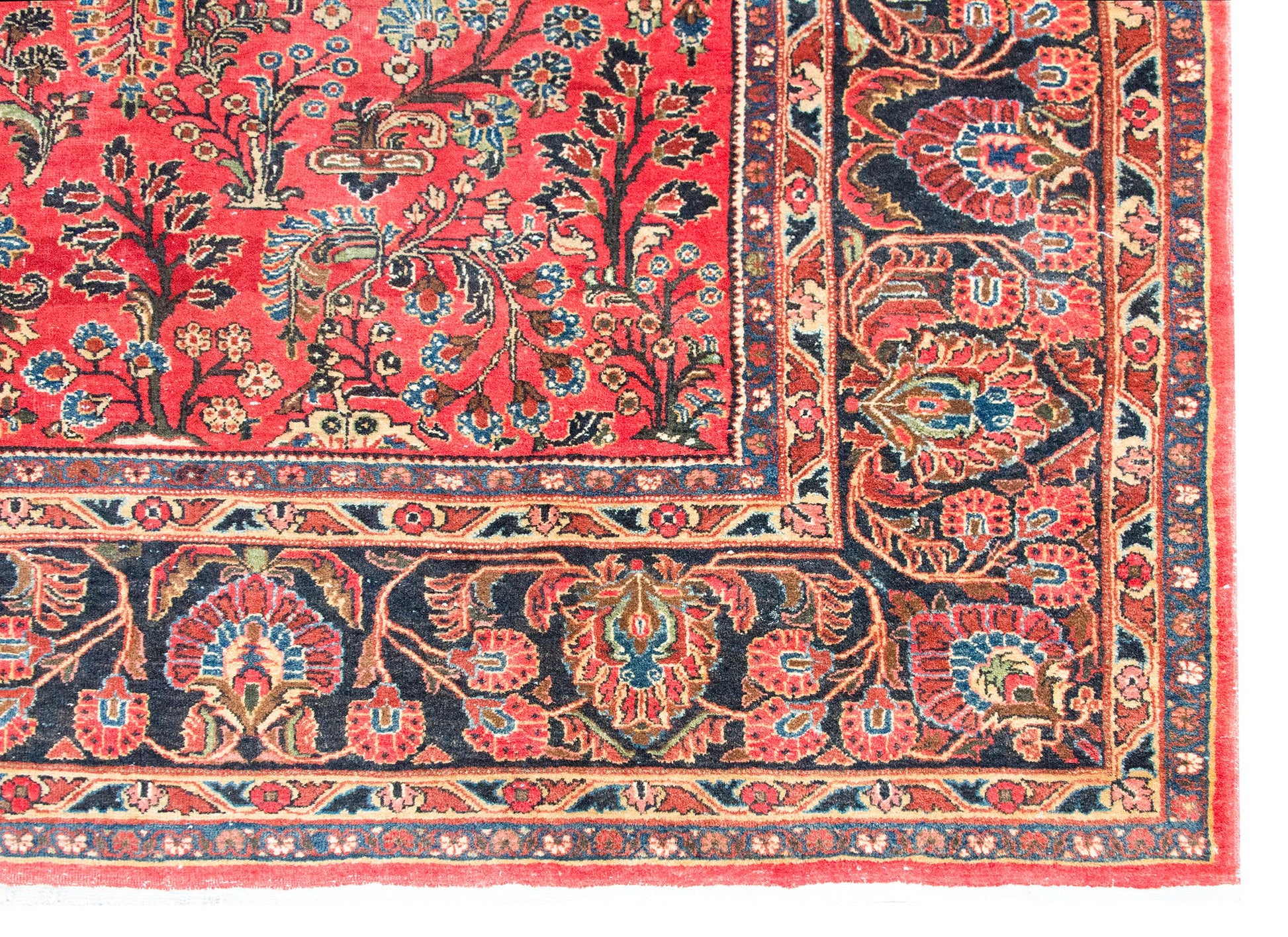 A wonderful early 20th century Persian Sarouk rug with an unusual all-over mirrored floral and scrolling pattern surrounded by a wide floral patterned border flanked by pairs of petite floral patterned stripes, and all woven in traditional Sarouk colors including cranberry, pink, light and dark indigo, and cream colored wool.