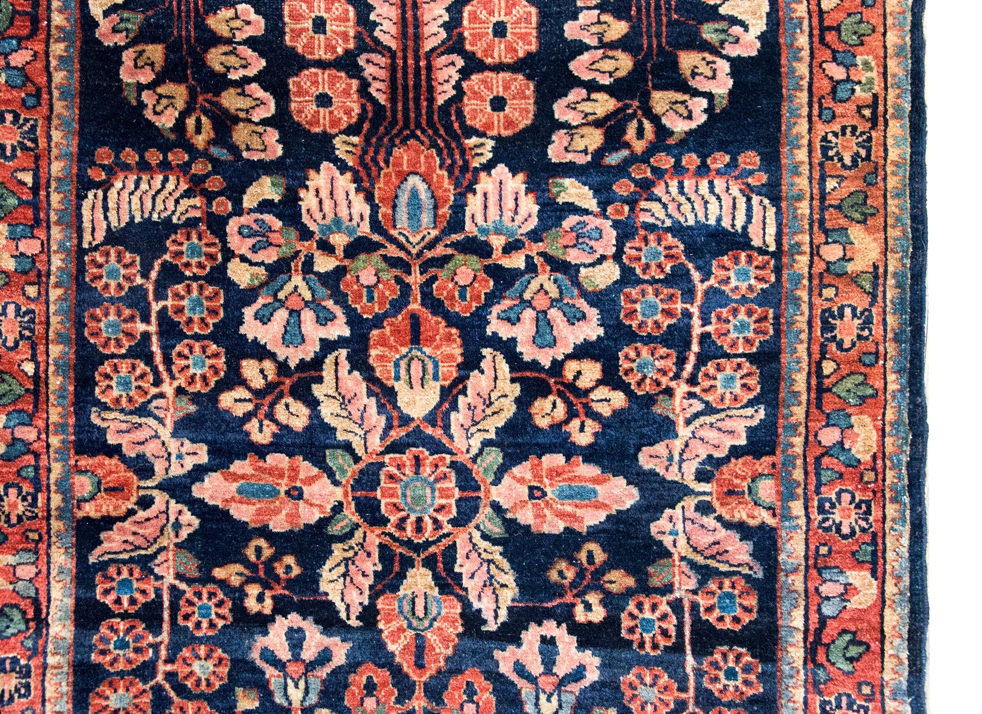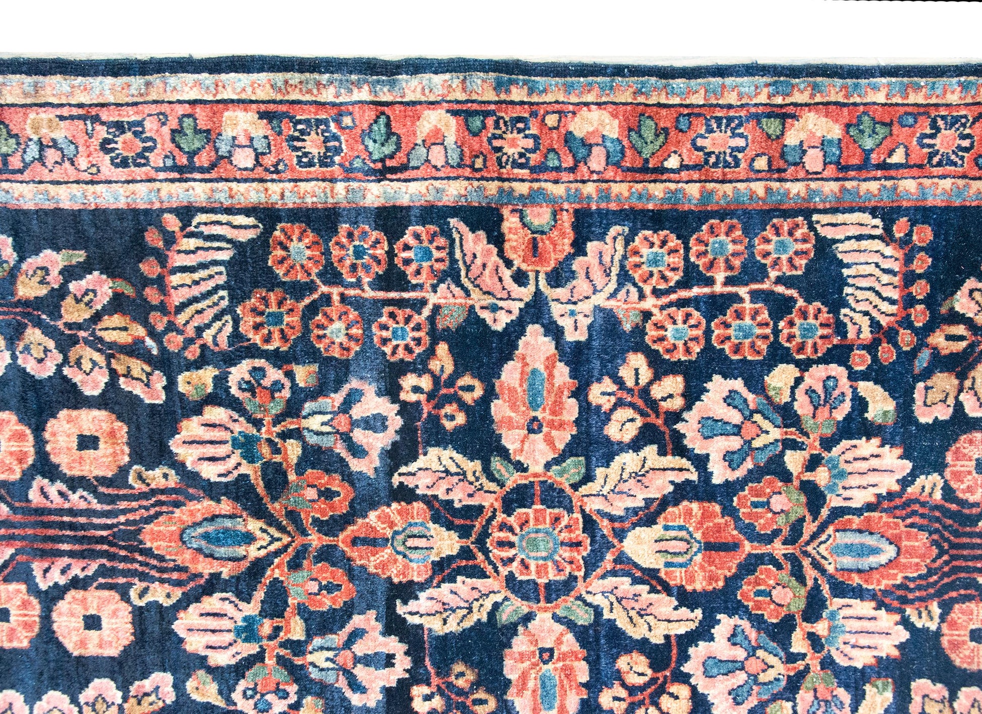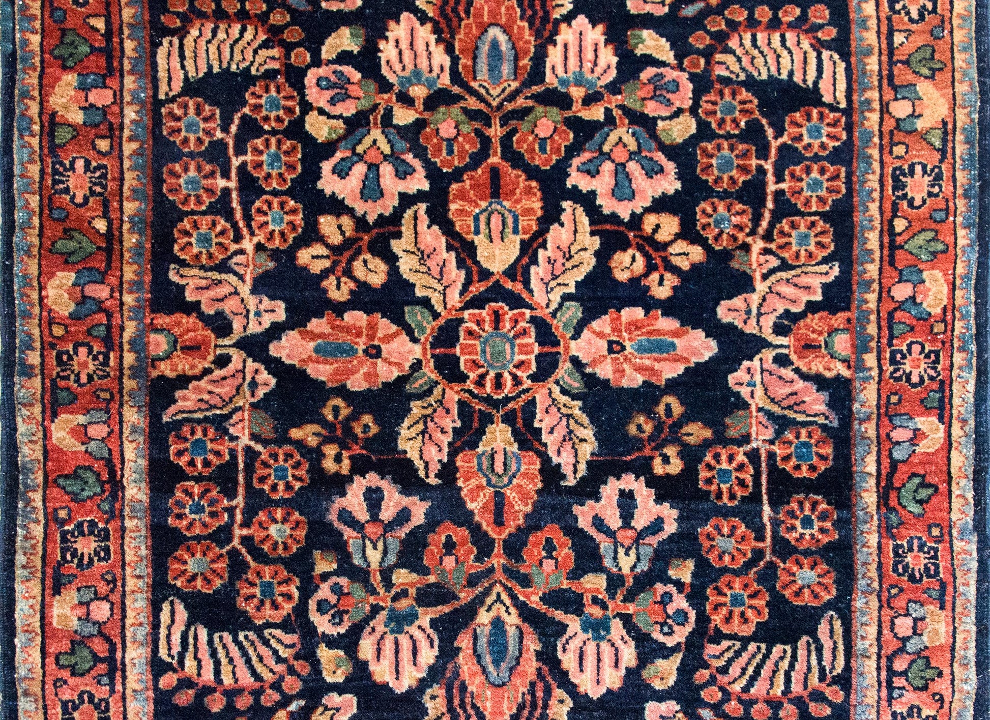 A beautiful early 20th century Persian Sarouk rug with a mirrored floral pattern with myriad floral clusters on the field, and surrounded by a sweet petite floral patterned border, and all woven in varying shades of cranberry, indigo, pink, and cream colored wool.