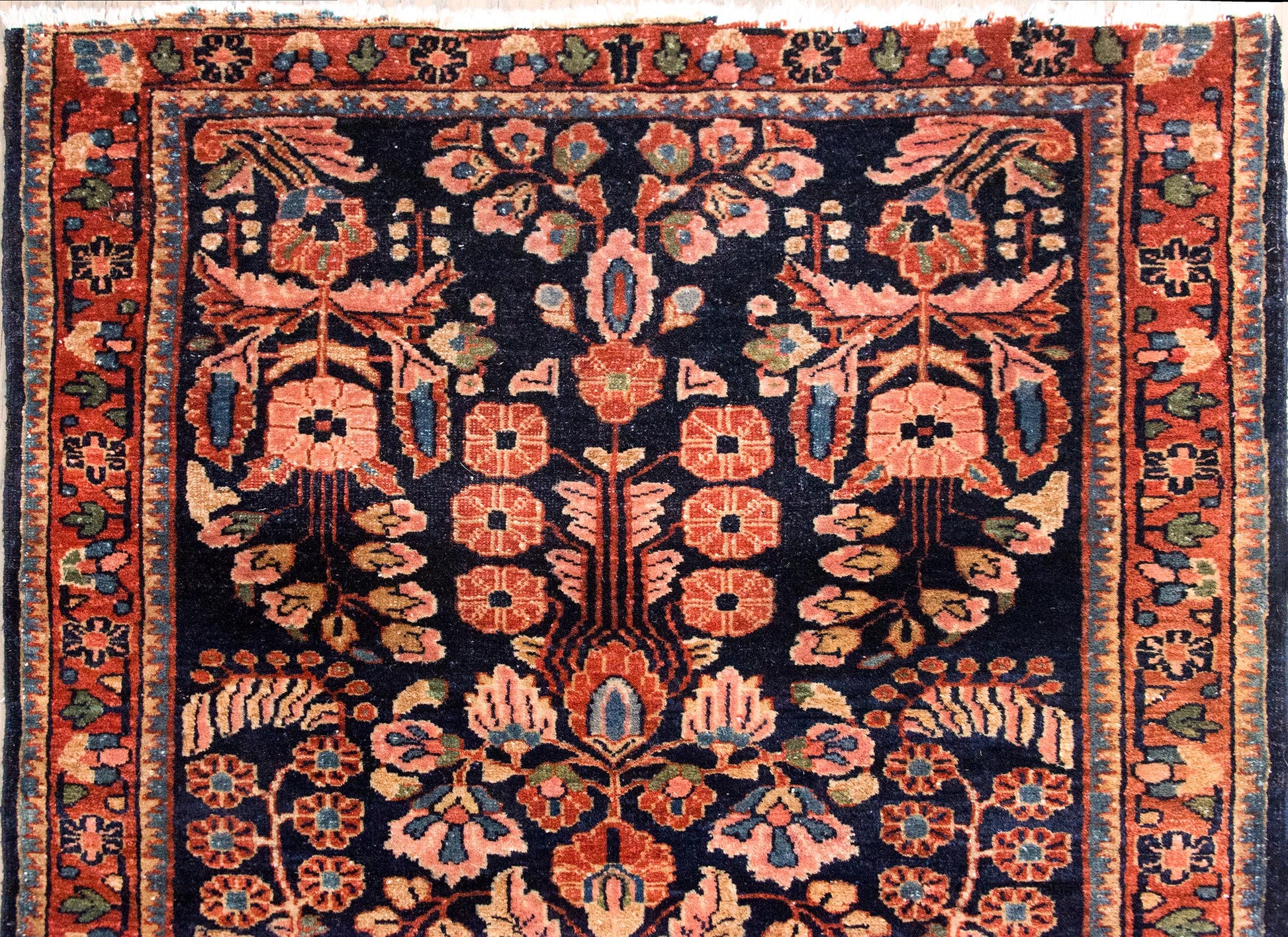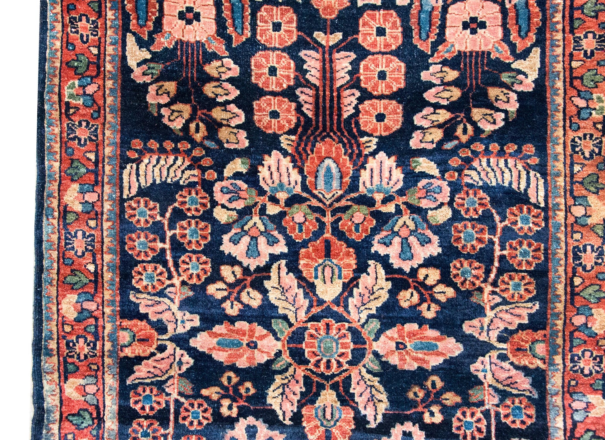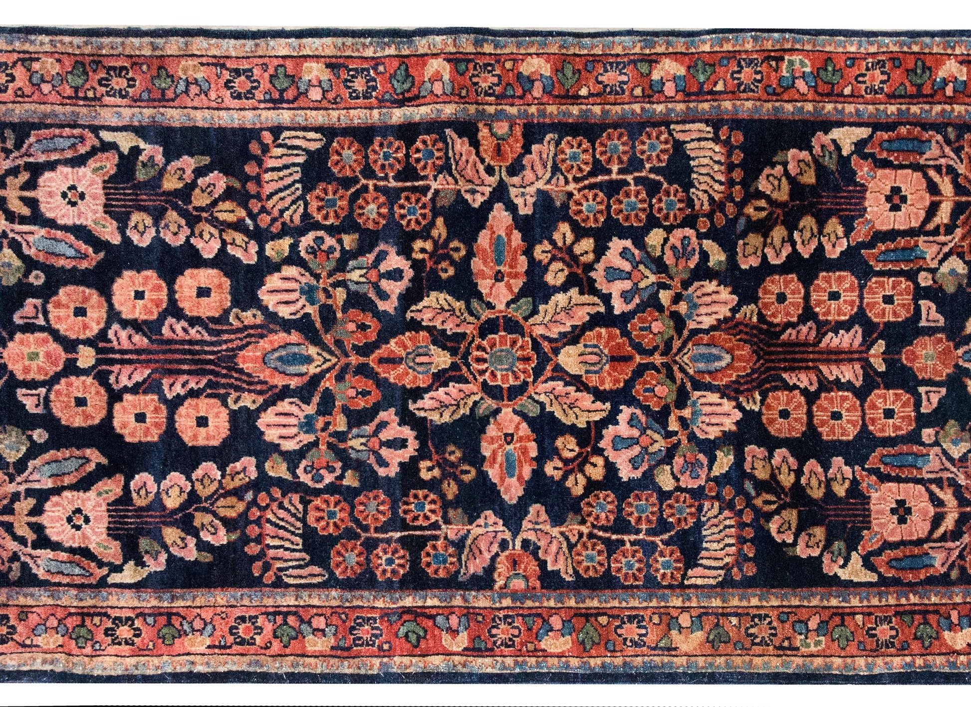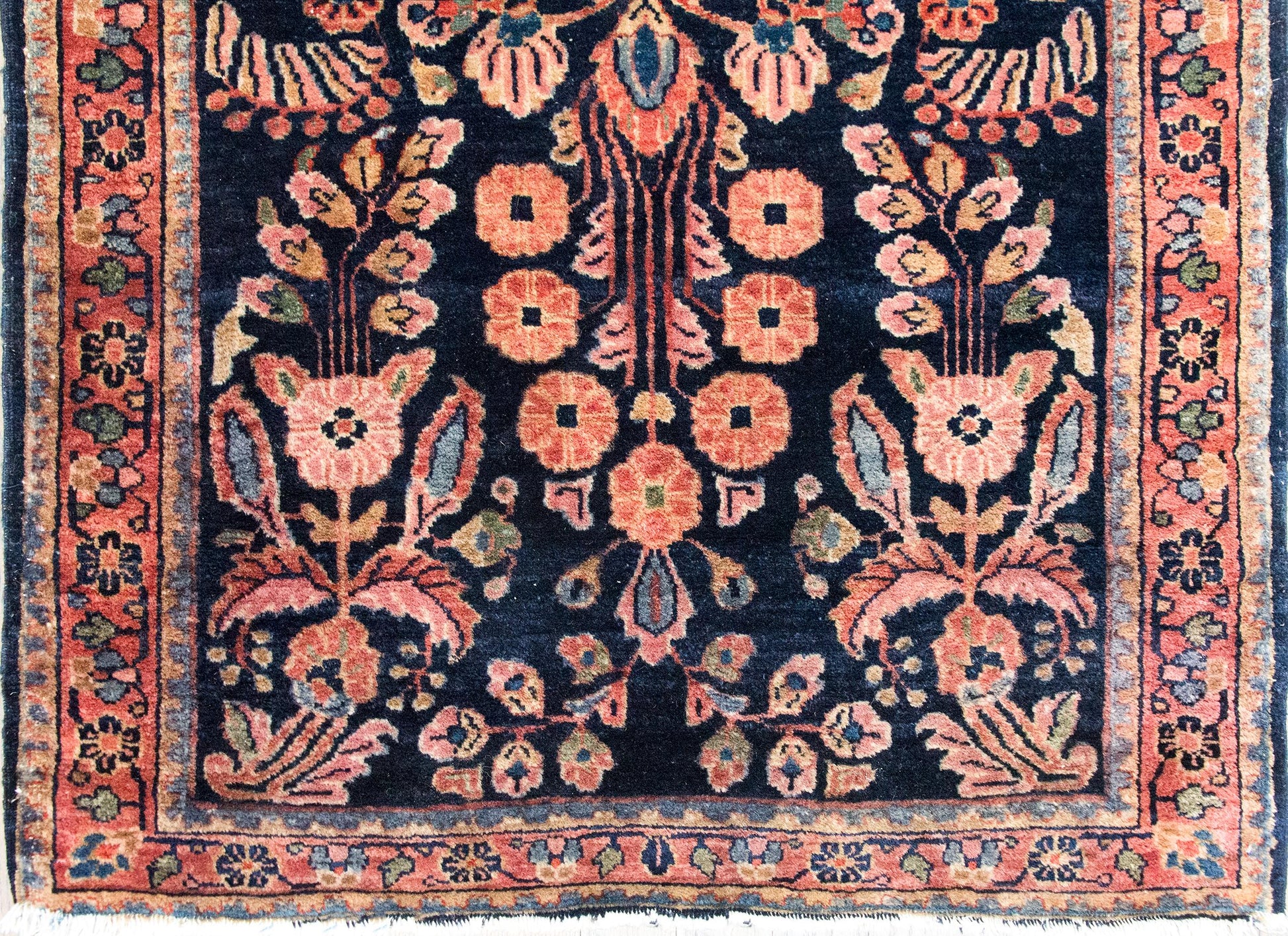 A beautiful early 20th century Persian Sarouk rug with a mirrored floral pattern with myriad floral clusters on the field, and surrounded by a sweet petite floral patterned border, and all woven in varying shades of cranberry, indigo, pink, and cream colored wool.
