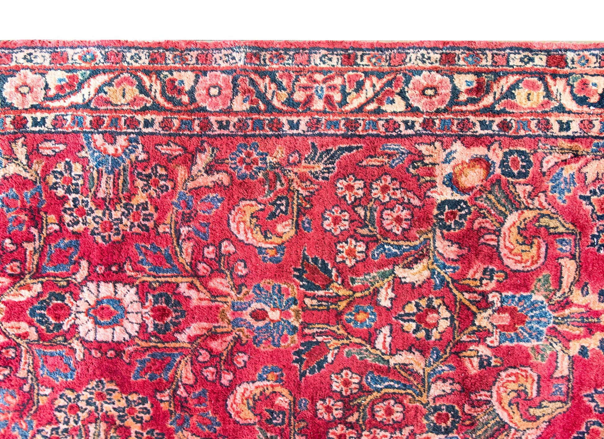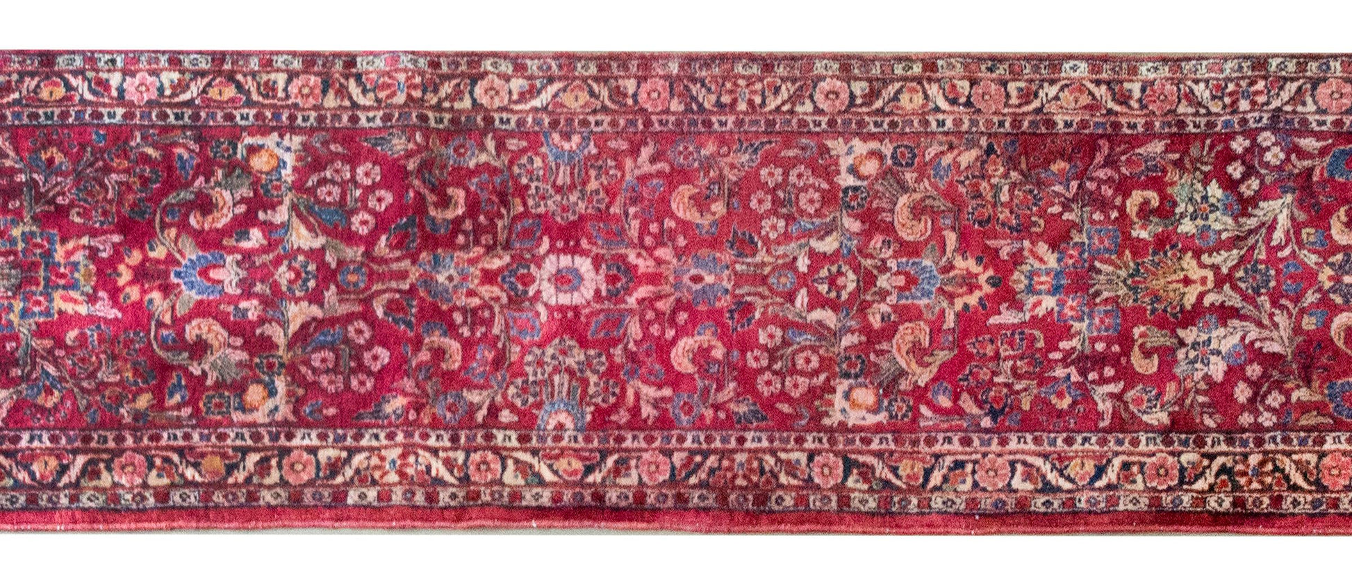 Woven in the traditional Sarouk palette, this runner showcases rich cranberry, soft cream, varying shades of indigo, and delicate pink tones, all rendered in finely woven wool. The luxurious texture and masterful dyeing techniques lend an enduring vibrancy to the piece. Ideal for adding warmth and sophistication to a hallway or elongating a space with its elegant proportions, this Sarouk runner offers a perfect blend of artistry and functionality. It brings a touch of Persian heritage and timeless beauty to both classic and contemporary interiors.