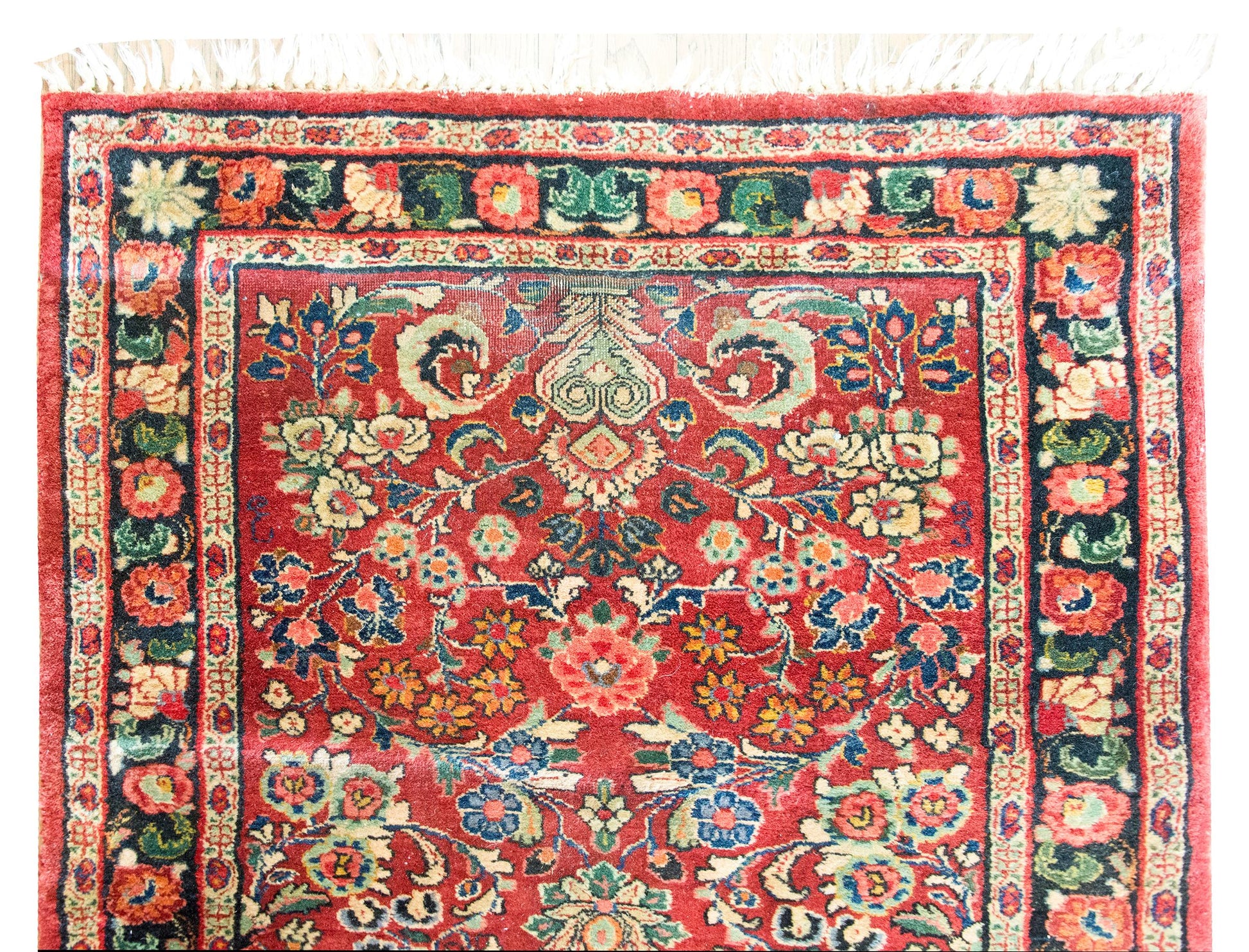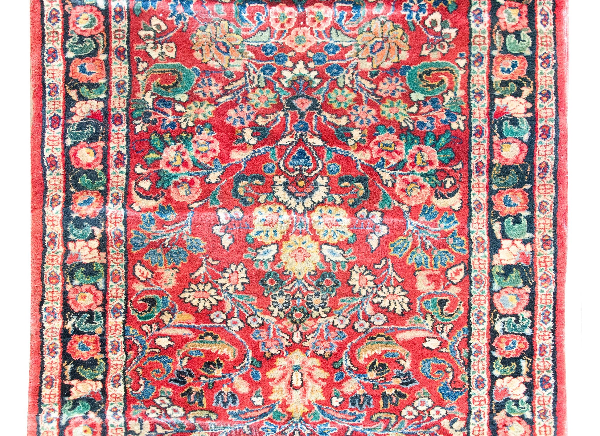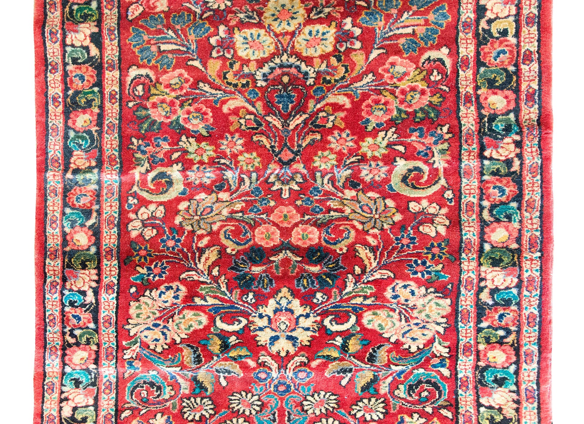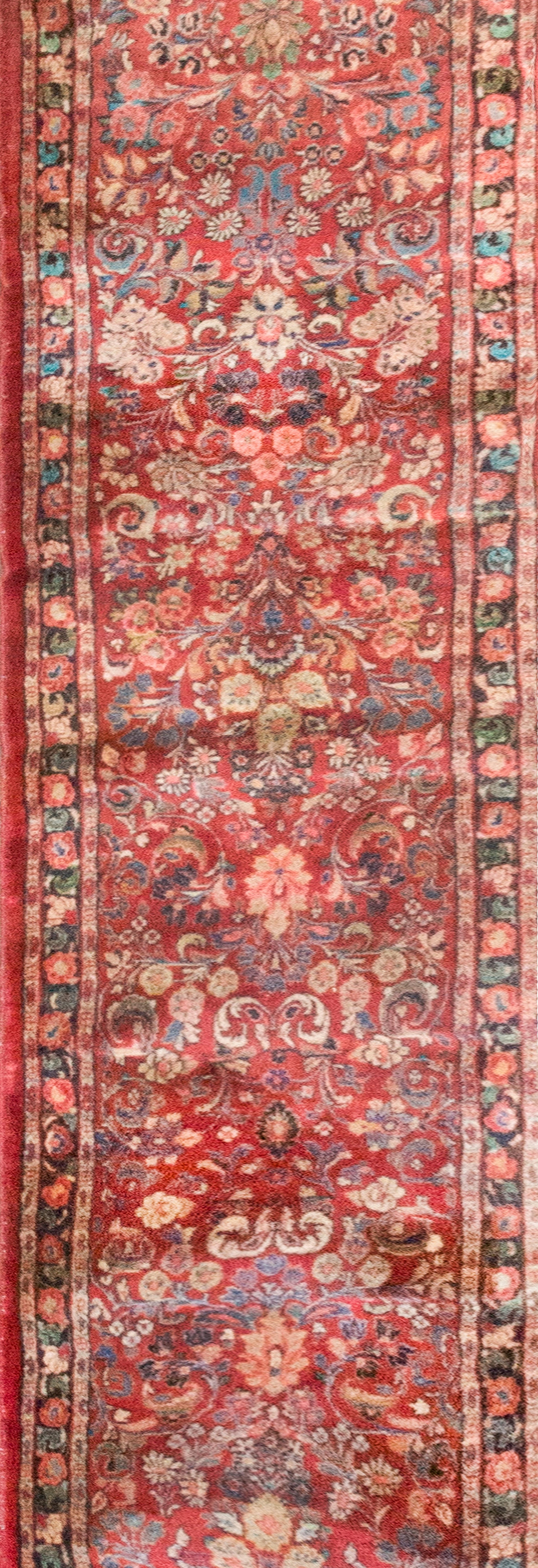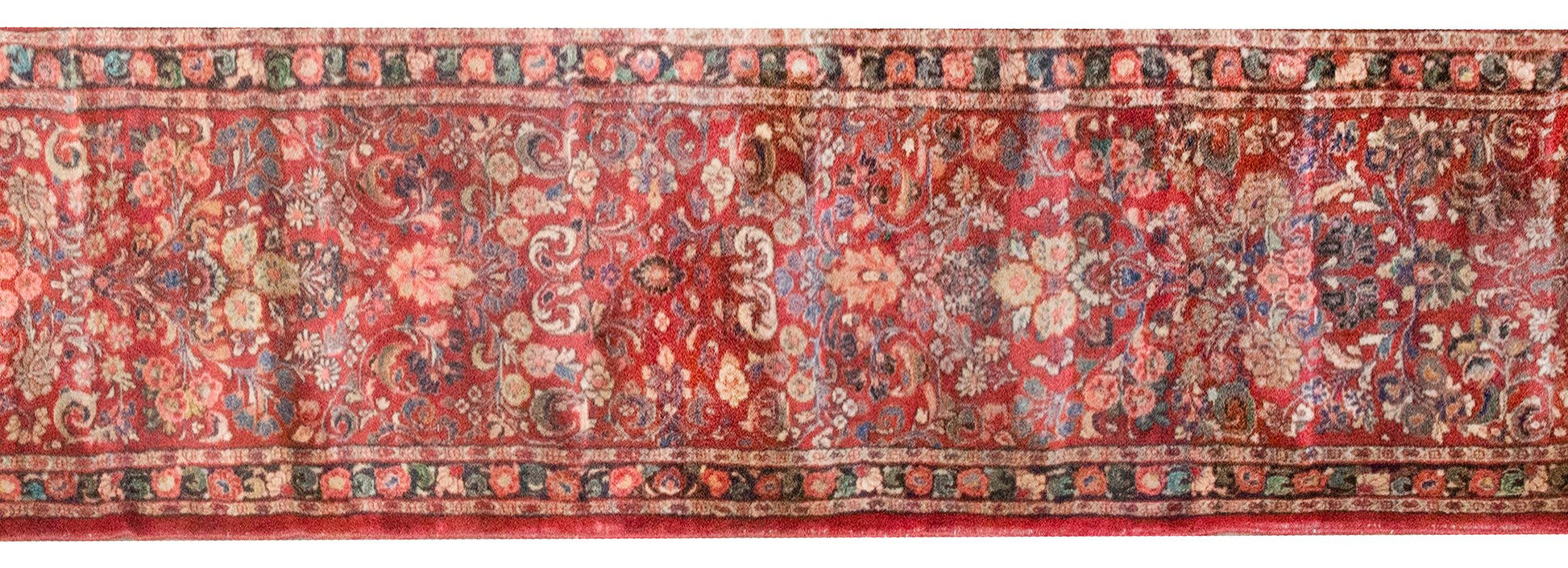 This early 20th-century Persian Sarouk runner features a classic mirrored floral pattern, richly woven in shades of cranberry, cream, pink, and light and dark indigo. The central field blooms with stylized sprays and palmettes arranged in symmetrical balance, a hallmark of Sarouk design. Framing the field is a series of narrow borders, each filled with petite floral motifs that add delicate rhythm and detail to the overall composition. Sarouk rugs are traditionally woven in the Arak region of west-central Iran, a region long celebrated for producing some of the finest Persian carpets. These pieces are typically hand-knotted by skilled village and workshop weavers, many of whom pass down their techniques through generations. Prized for their dense pile and graceful floral designs, Sarouk rugs were especially popular in the early 20th century with Western markets. This runner exemplifies the enduring elegance and fine craftsmanship associated with Persian weaving traditions.
