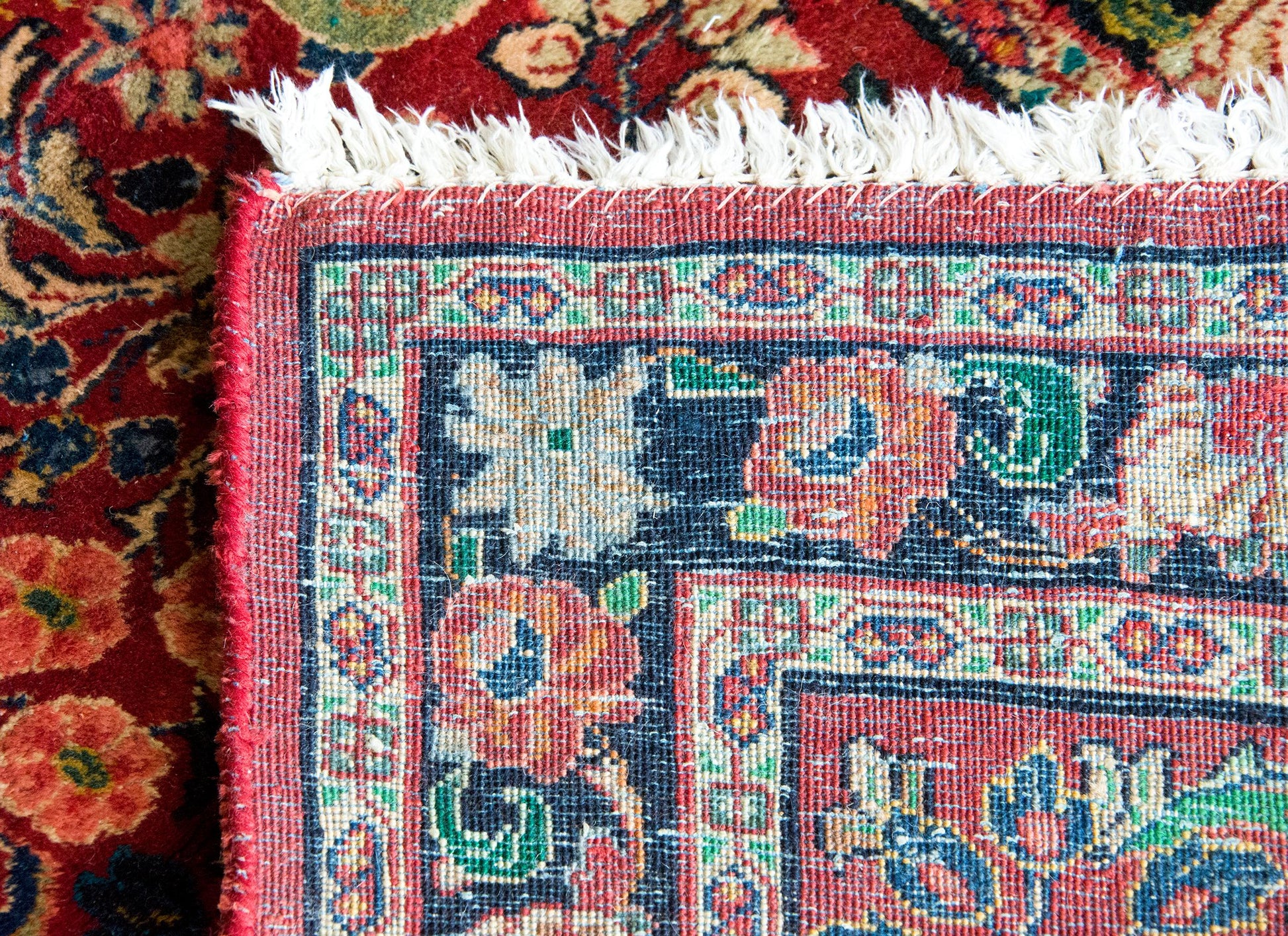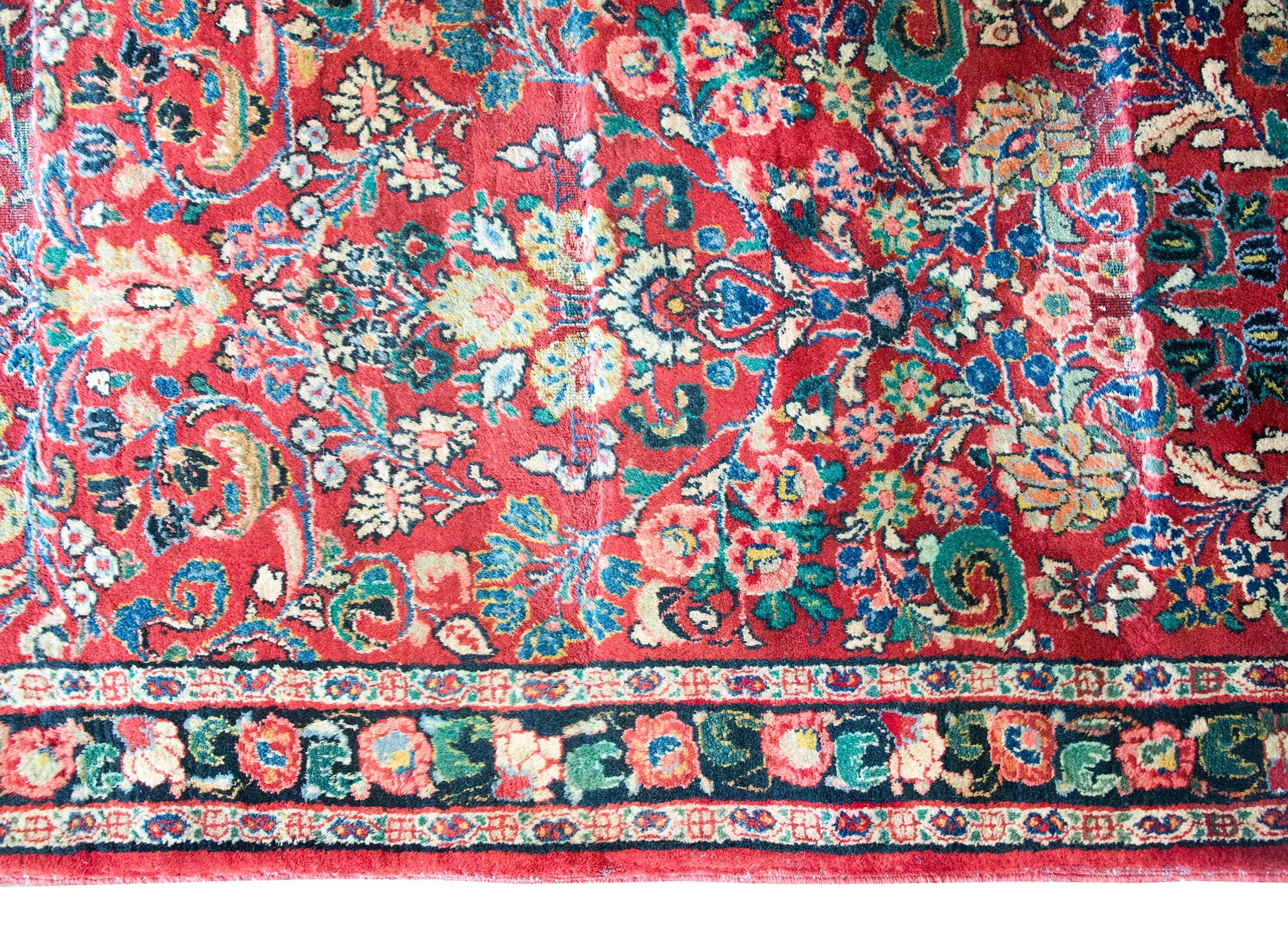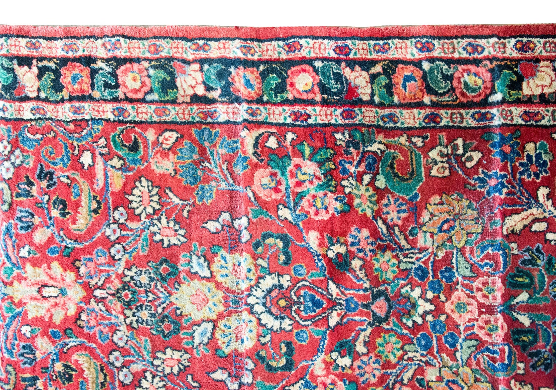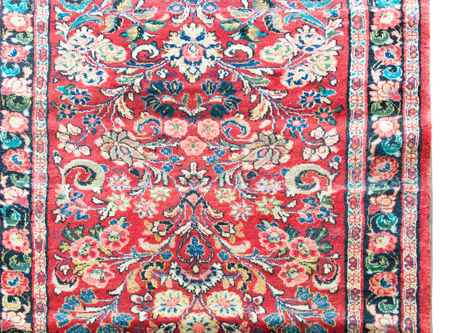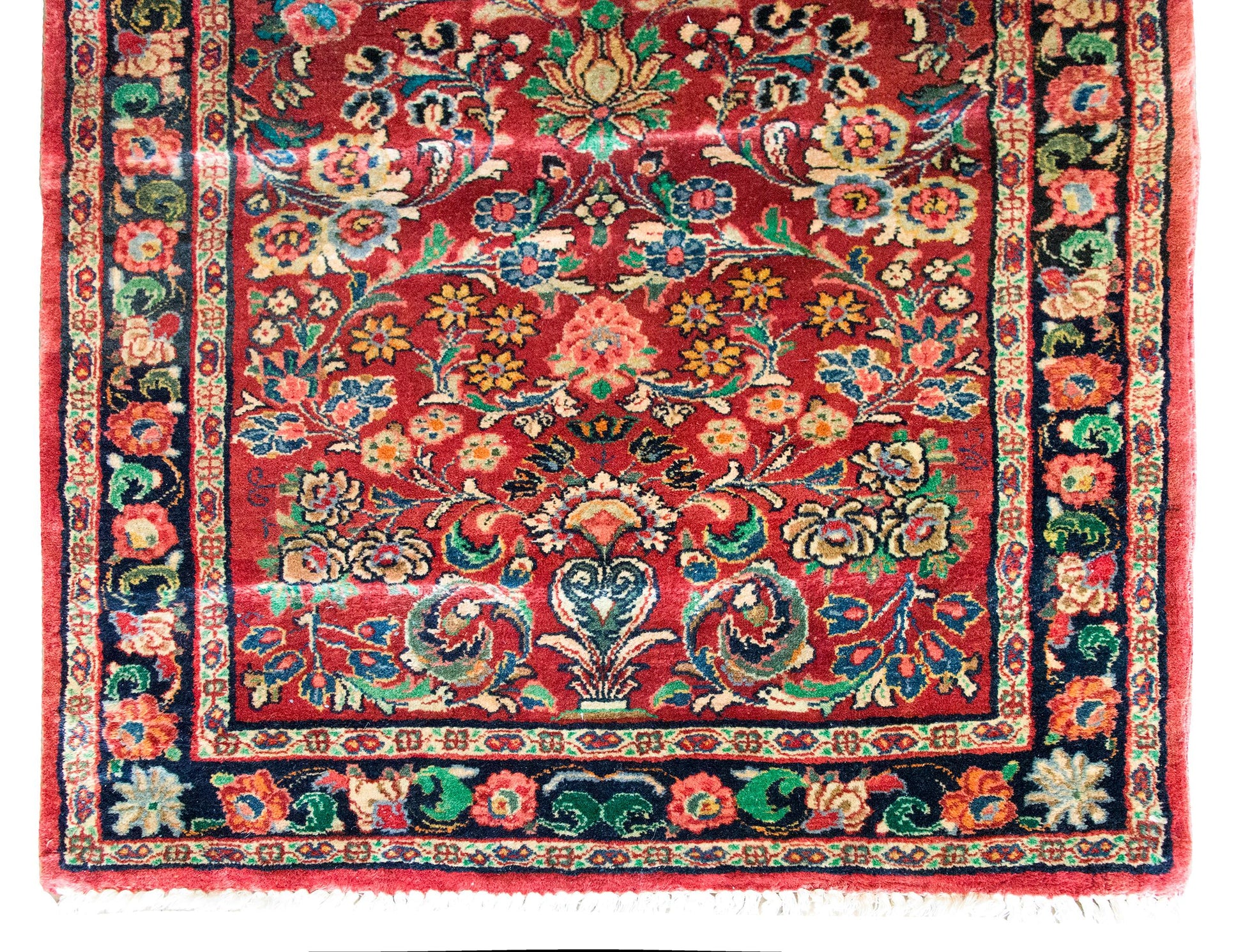 This early 20th-century Persian Sarouk runner features a classic mirrored floral pattern, richly woven in shades of cranberry, cream, pink, and light and dark indigo. The central field blooms with stylized sprays and palmettes arranged in symmetrical balance, a hallmark of Sarouk design. Framing the field is a series of narrow borders, each filled with petite floral motifs that add delicate rhythm and detail to the overall composition. Sarouk rugs are traditionally woven in the Arak region of west-central Iran, a region long celebrated for producing some of the finest Persian carpets. These pieces are typically hand-knotted by skilled village and workshop weavers, many of whom pass down their techniques through generations. Prized for their dense pile and graceful floral designs, Sarouk rugs were especially popular in the early 20th century with Western markets. This runner exemplifies the enduring elegance and fine craftsmanship associated with Persian weaving traditions.