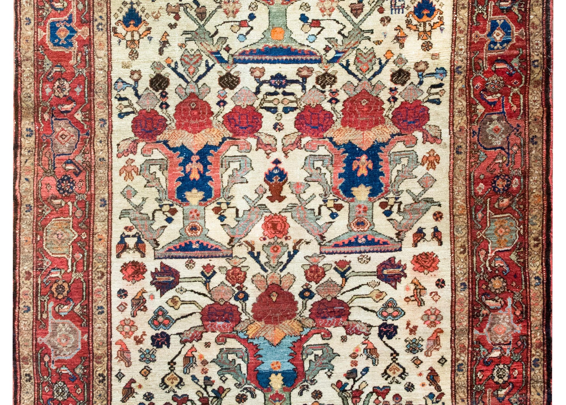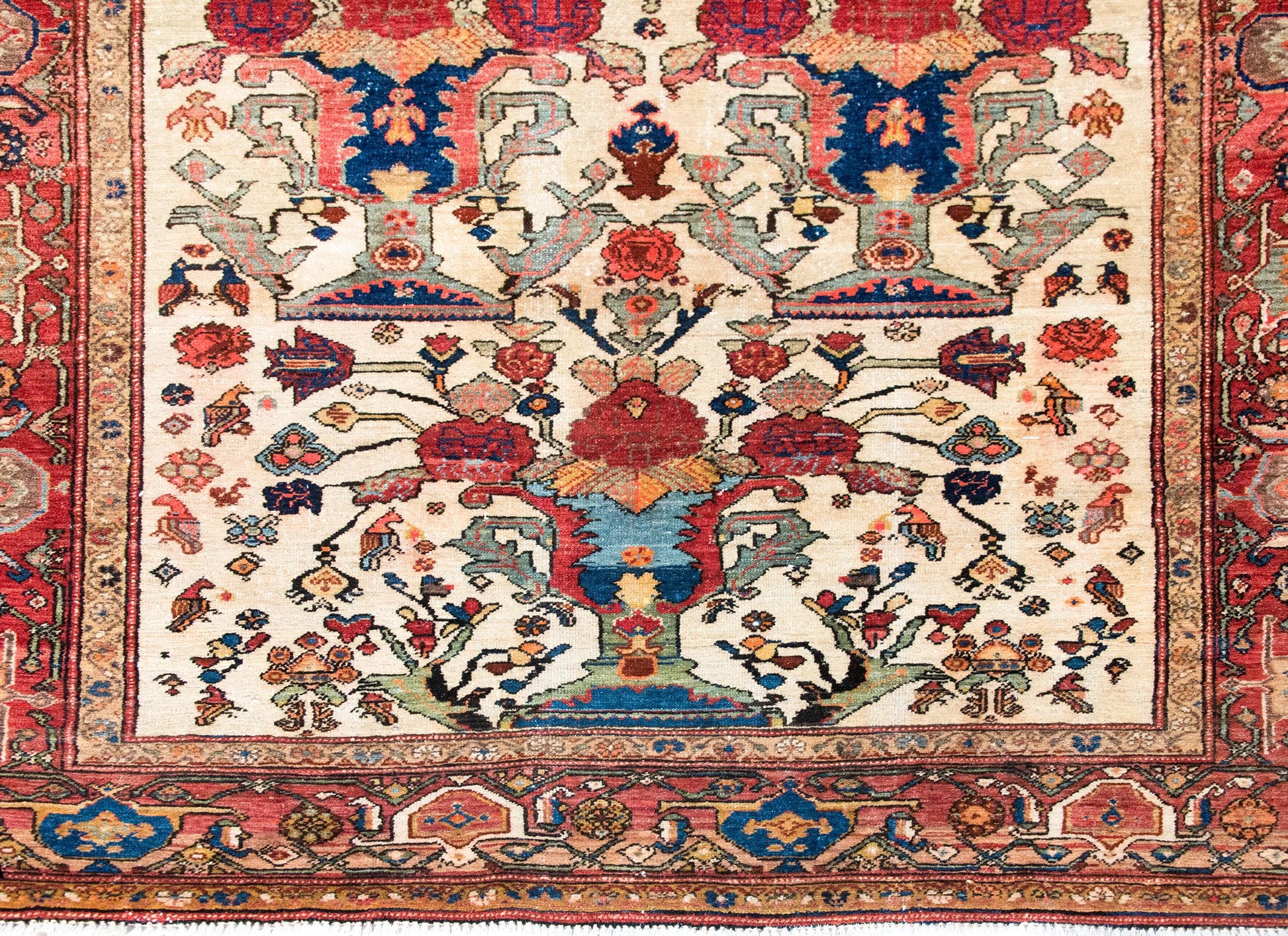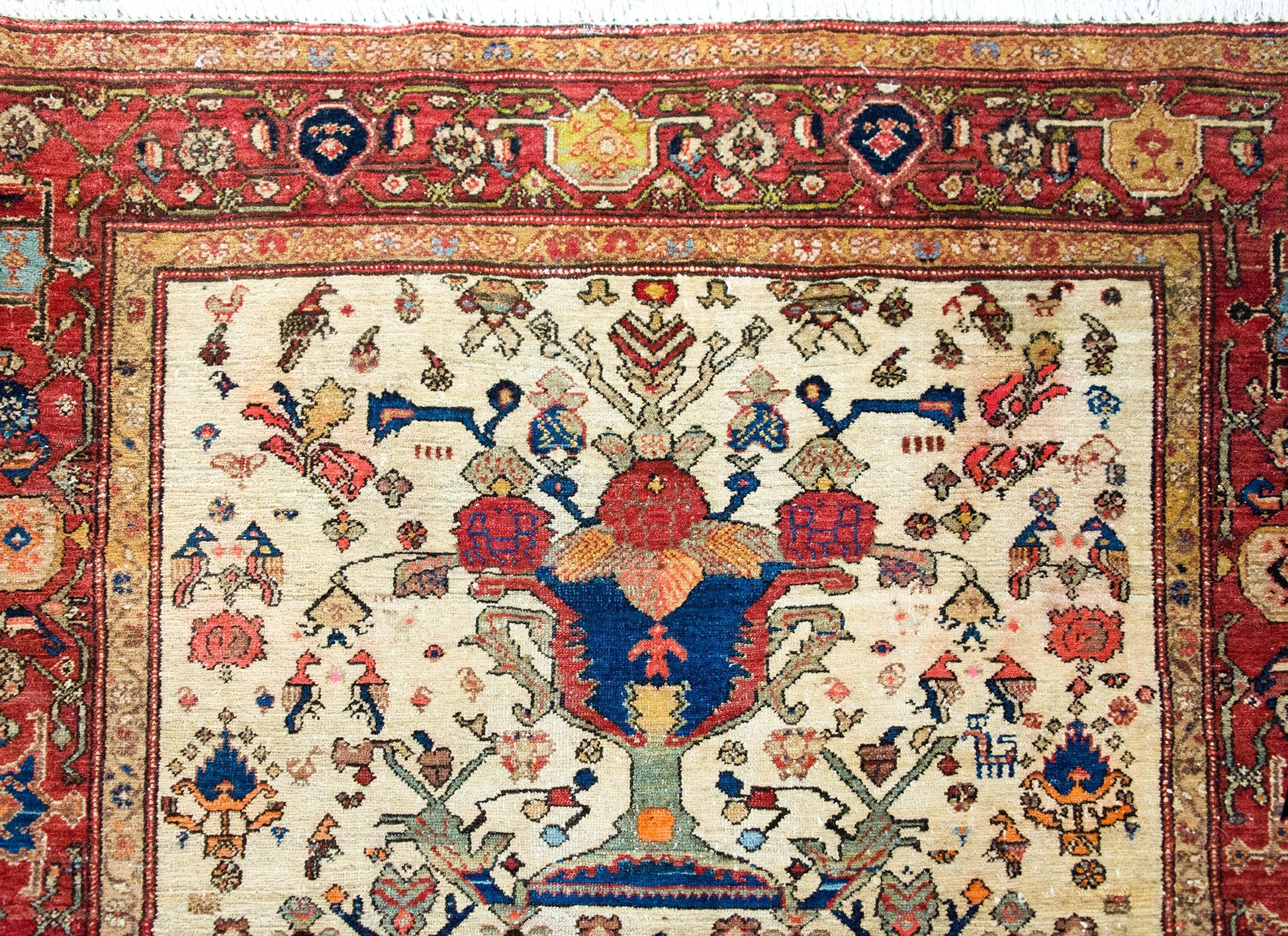 An extraordinary early 20th-century Persian Senneh rug, c. 1900, hand-knotted in fine wool and distinguished by a striking composition of four grand trees of life. Each tree rises from a stylized vase, blooming upward with bold red blossoms and surrounded by a profusion of smaller vines, flowers, and birds—woven densely into a field that hums with energy and motion. The palette—crimson, deep and pale indigo, gold, green, and white—is both rich and luminous. The border is exceptional: a wide band of oversized floral motifs, flanked on both sides by smaller, mirrored floral stripes. Senneh rugs are woven in Sanandaj, the capital of Iranian Kurdistan, long celebrated for its unusually fine weaving and detailed patterning. Crafted almost exclusively by Kurdish women, these rugs are prized for their precision and balance—symmetry and asymmetry held in constant tension. This rug is a lyrical, living expression of that legacy, both poetic and powerful.