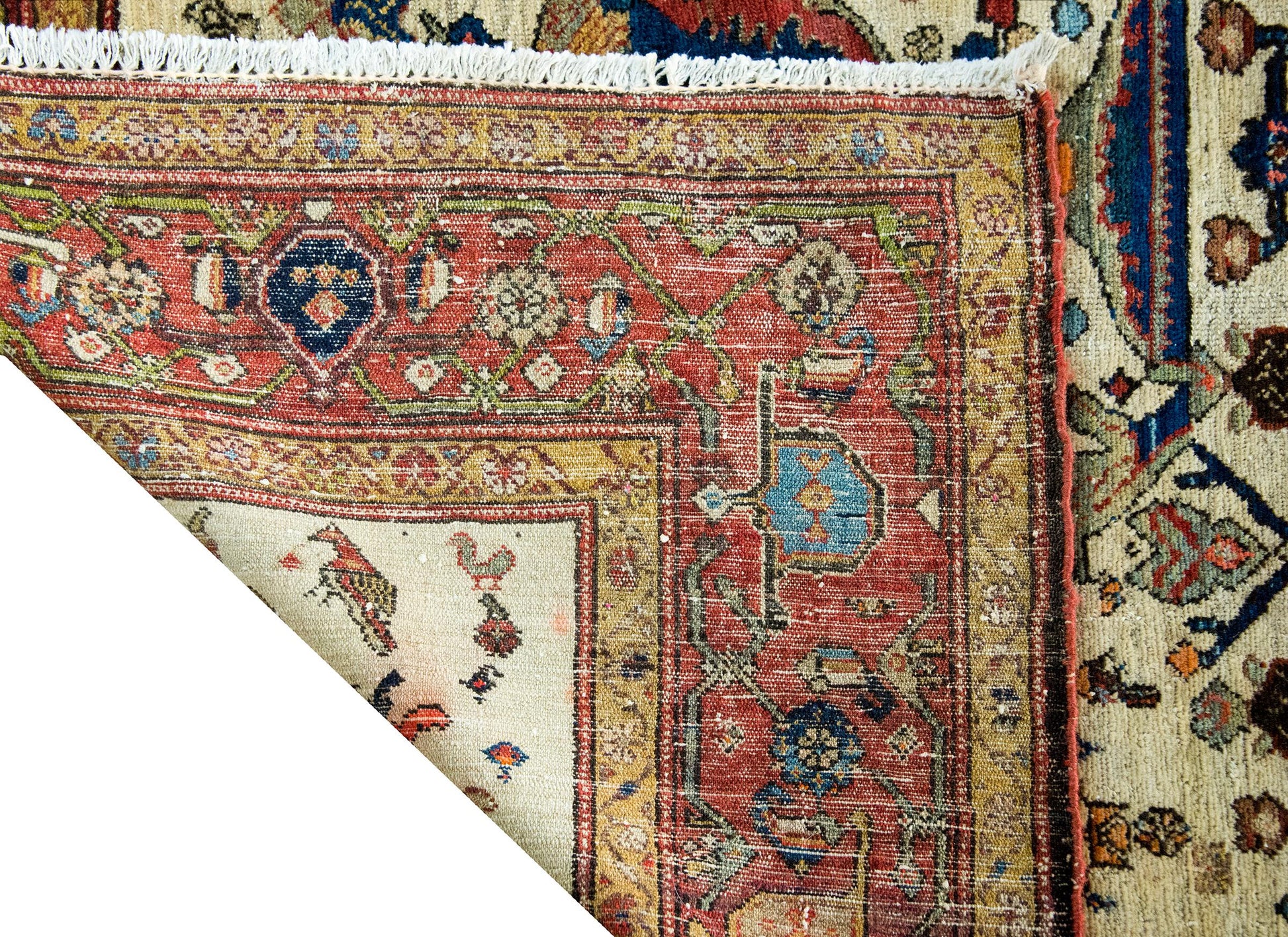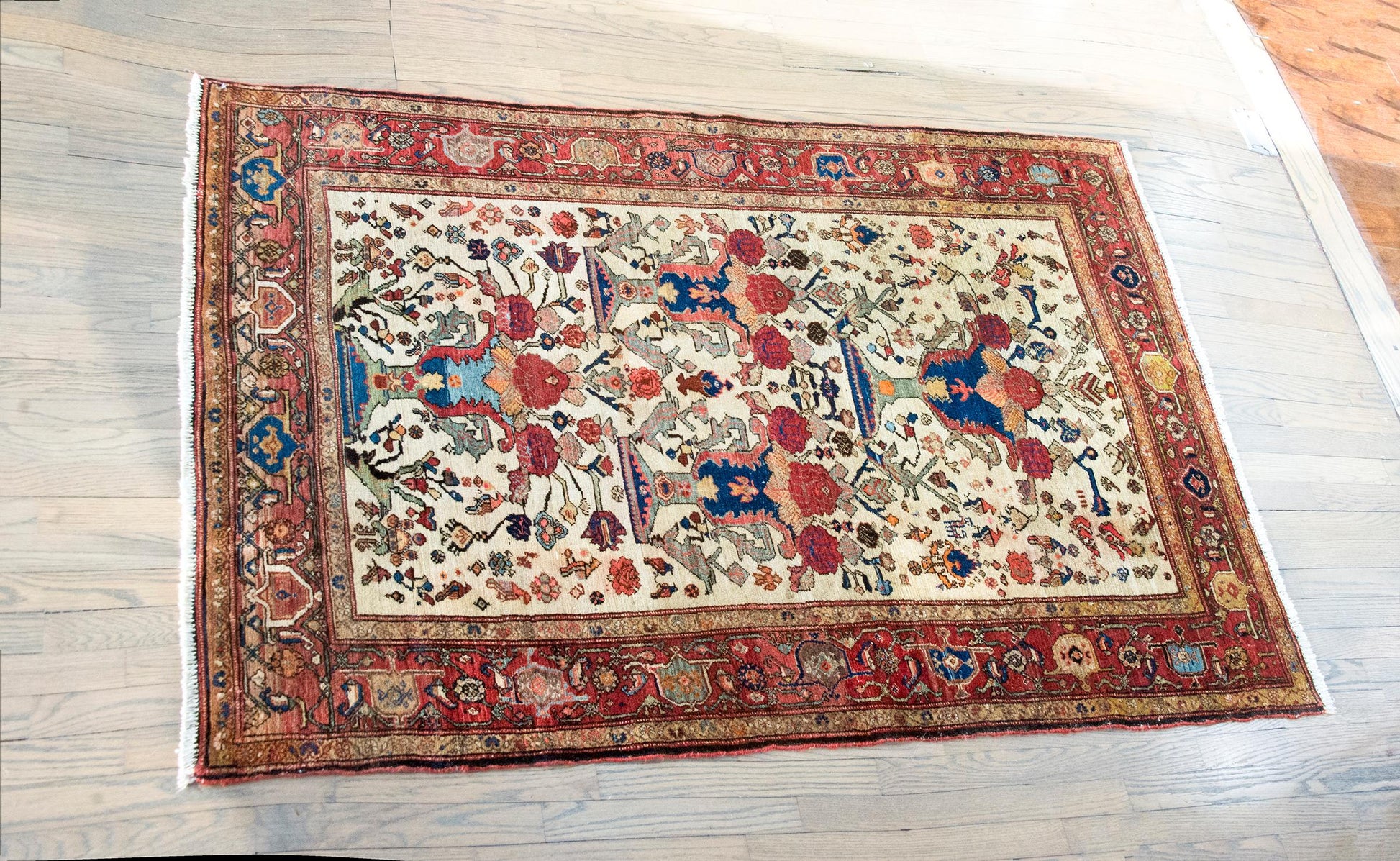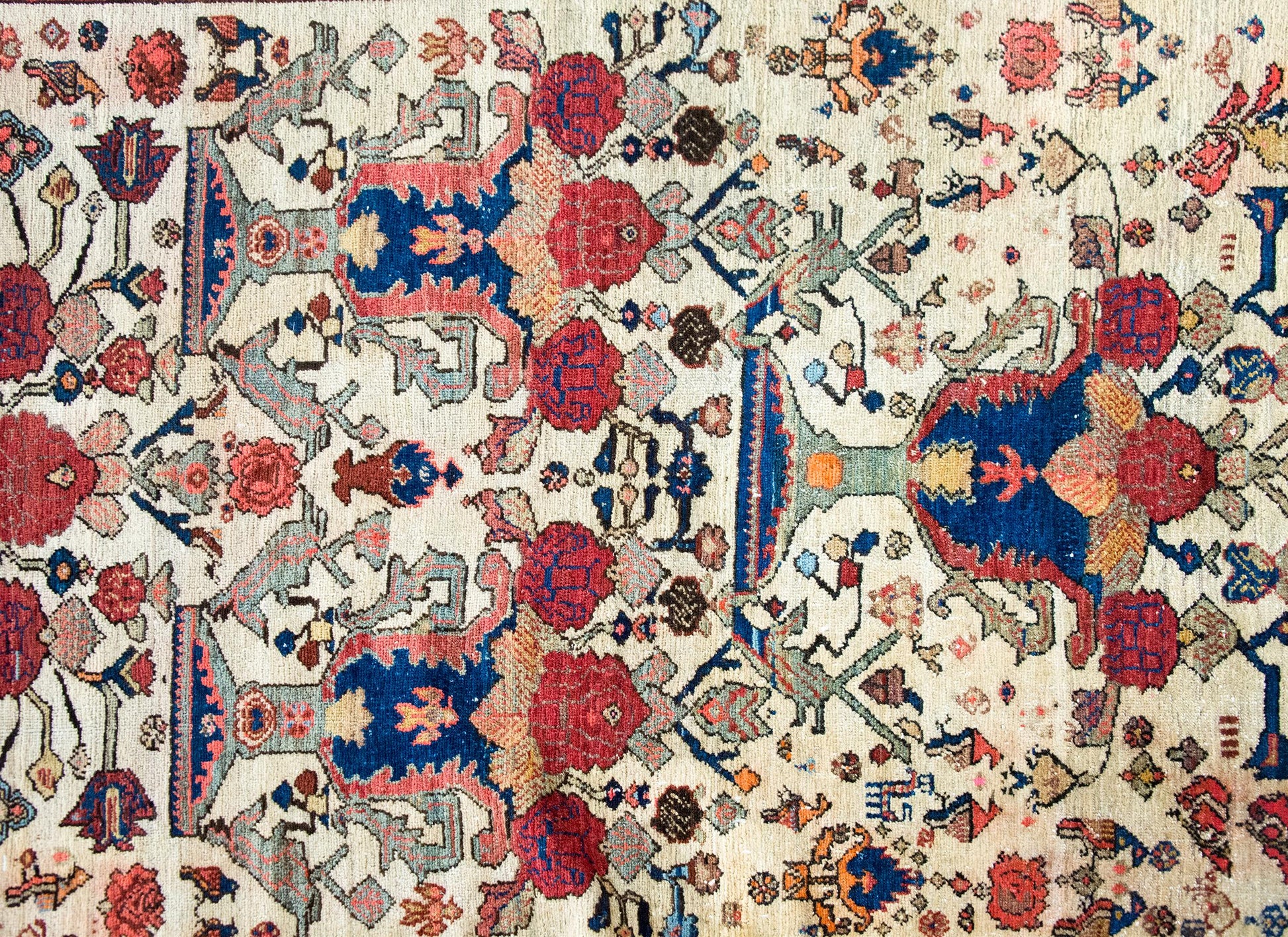 An extraordinary early 20th-century Persian Senneh rug, c. 1900, hand-knotted in fine wool and distinguished by a striking composition of four grand trees of life. Each tree rises from a stylized vase, blooming upward with bold red blossoms and surrounded by a profusion of smaller vines, flowers, and birds—woven densely into a field that hums with energy and motion. The palette—crimson, deep and pale indigo, gold, green, and white—is both rich and luminous. The border is exceptional: a wide band of oversized floral motifs, flanked on both sides by smaller, mirrored floral stripes. Senneh rugs are woven in Sanandaj, the capital of Iranian Kurdistan, long celebrated for its unusually fine weaving and detailed patterning. Crafted almost exclusively by Kurdish women, these rugs are prized for their precision and balance—symmetry and asymmetry held in constant tension. This rug is a lyrical, living expression of that legacy, both poetic and powerful.
