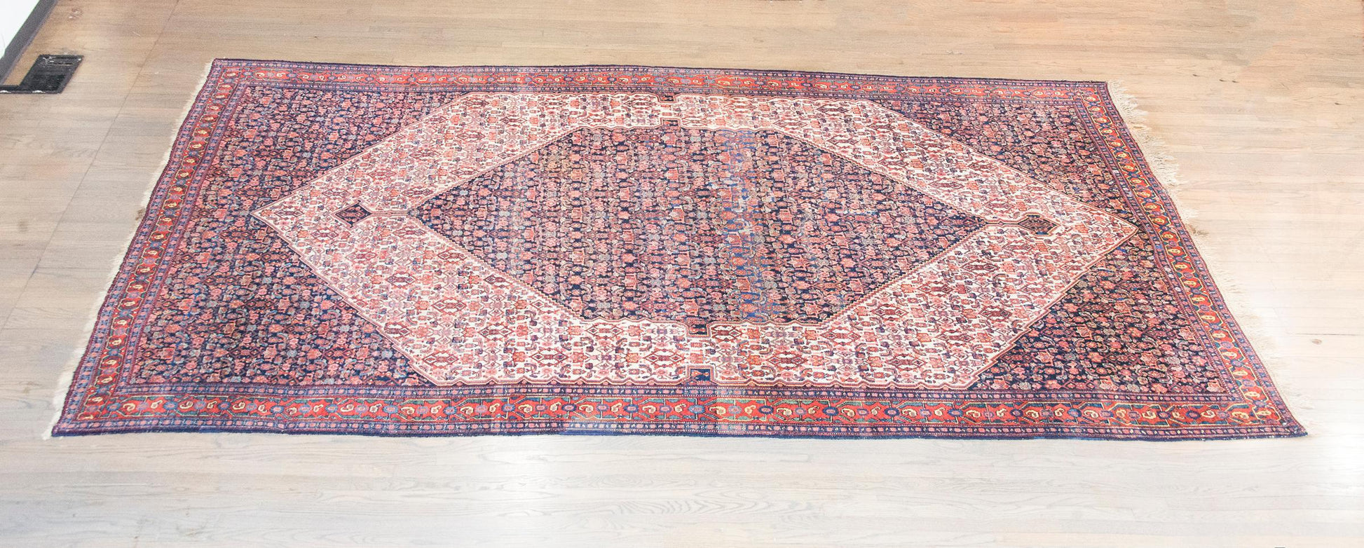 An exquisite example of early 20th-century Persian craftsmanship, this Senneh rug embodies the rich weaving heritage of Sanandaj, the capital of Iran’s Kurdistan province. Senneh rugs have been prized for centuries for their fine, single-weft construction, which gives them a supple yet durable texture, and for their elegant, intricate patterns that set them apart from other Persian rugs. Traditionally woven by Kurdish artisans, these rugs often feature highly detailed floral and geometric motifs, reflecting a deep cultural appreciation for precision and artistry.
