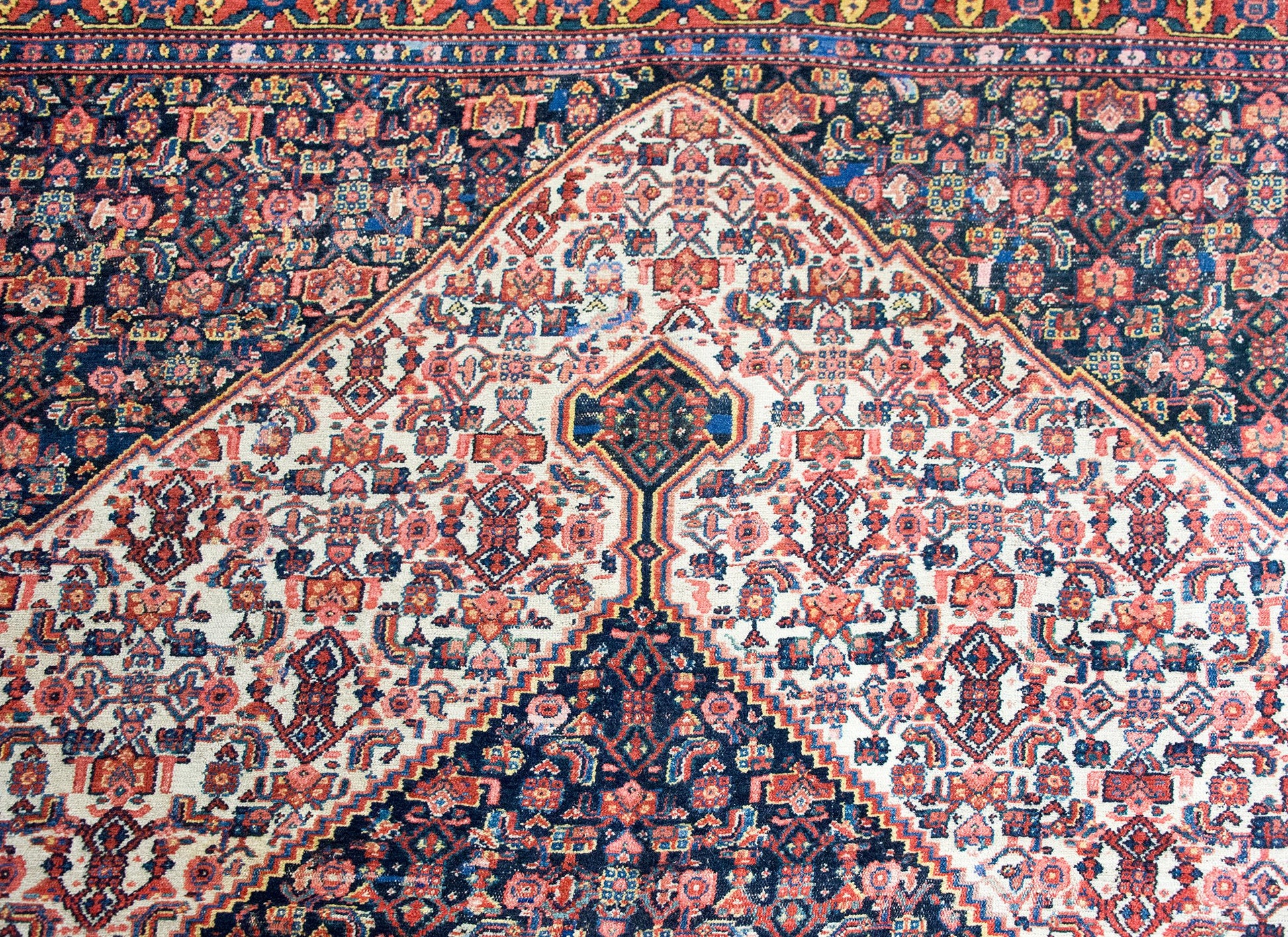 This particular rug boasts an elaborate floral trellis field, each element masterfully woven to create a sense of movement and depth. The wide floral-patterned border frames the composition beautifully, enhancing its symmetry and balance. Woven in a rich palette of crimson, indigo, cream, and pink, the rug’s colors add warmth and sophistication. Coveted by collectors for their refinement and historical significance, Senneh rugs bring an unmistakable elegance to any space.
