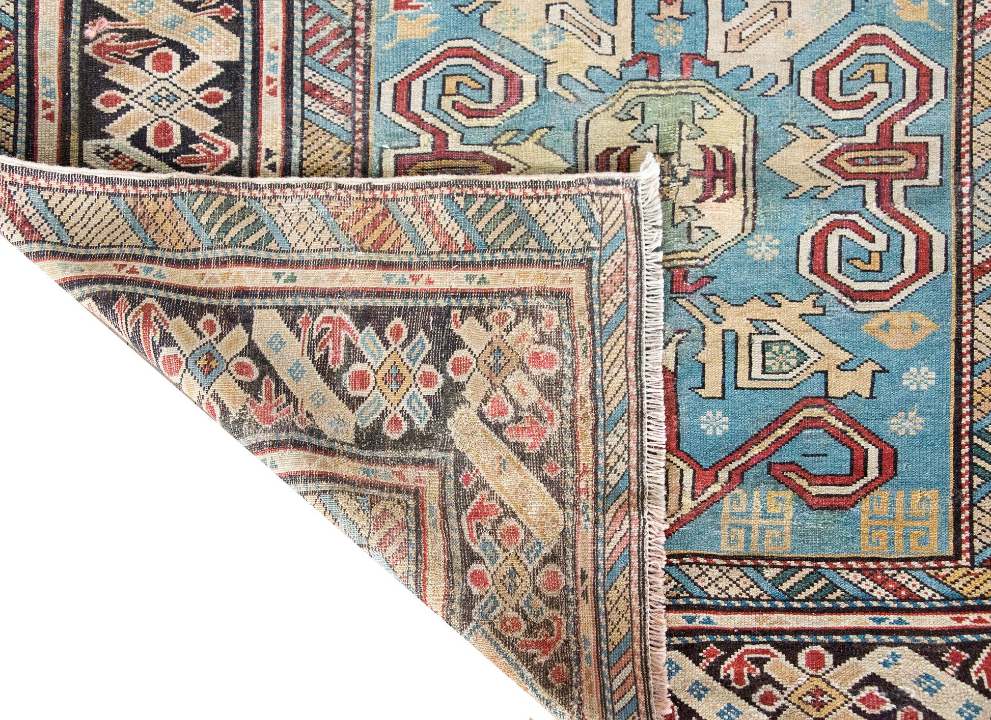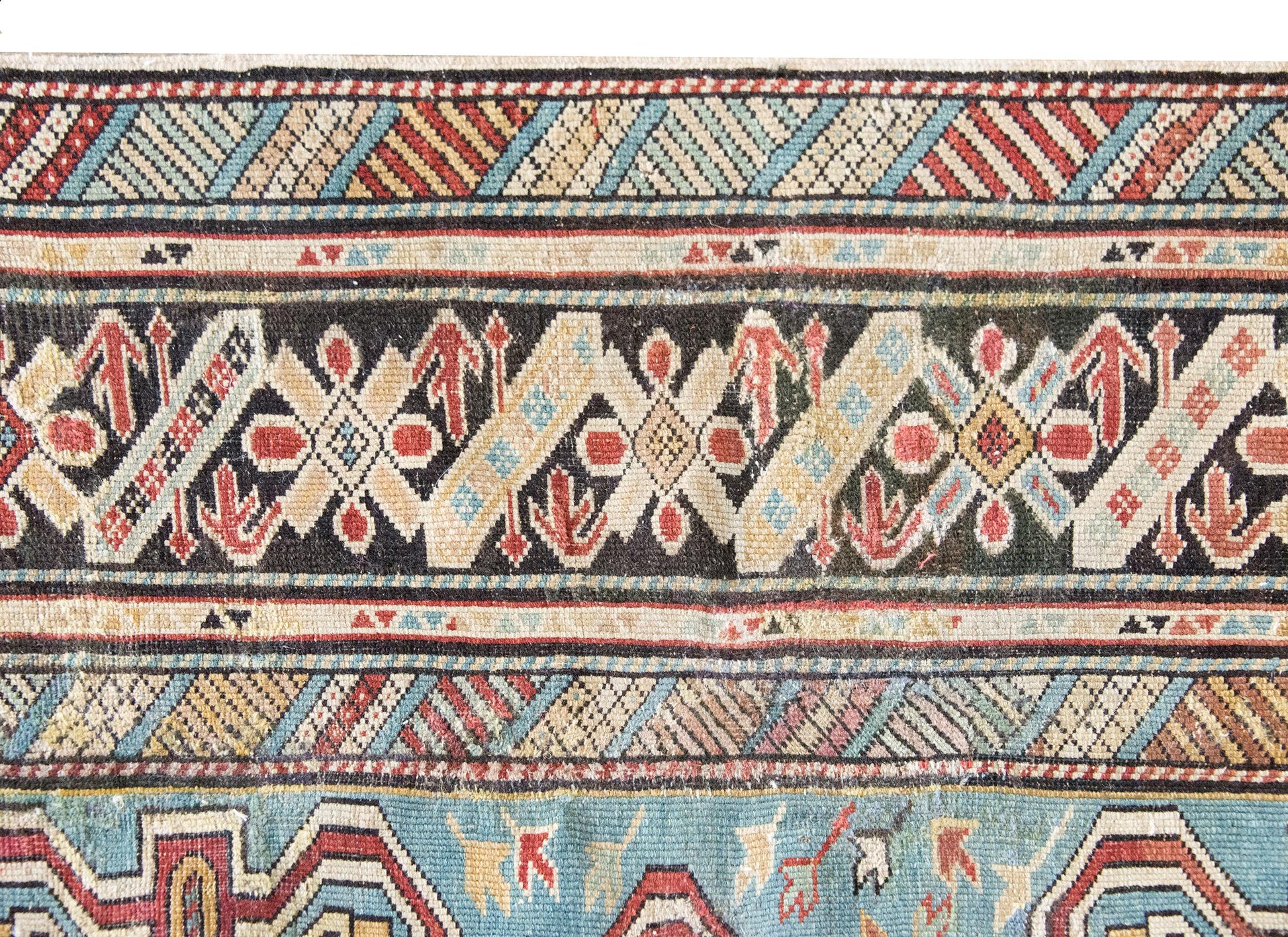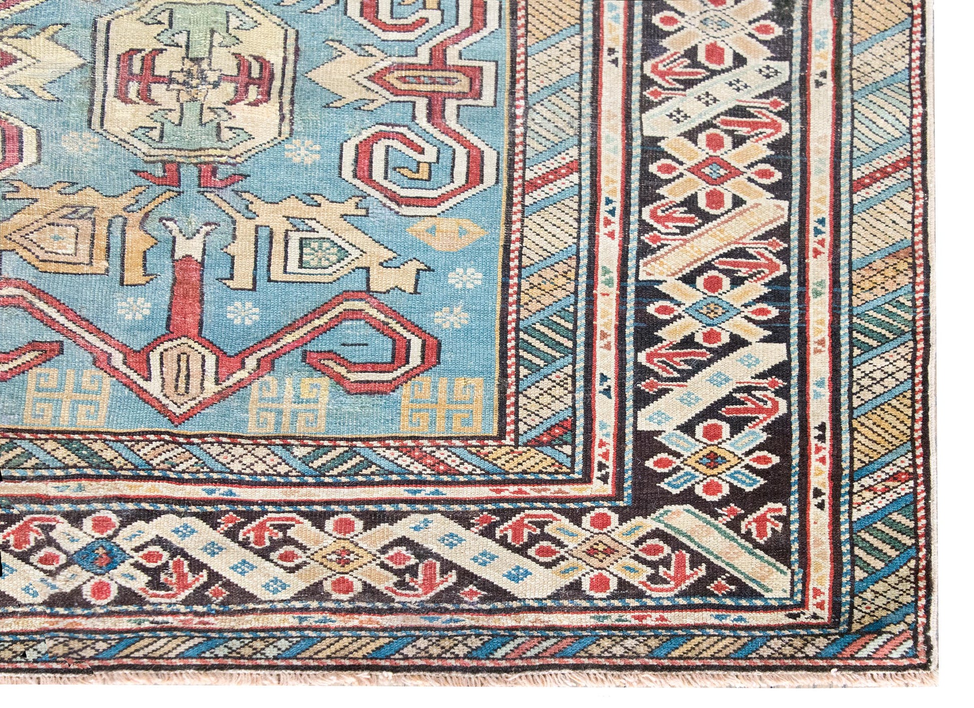 This early 20th-century Persian Shirvan rug is a masterclass in color, composition, and scale. Woven by Azerbaijani artisans from the Shirvan region in the eastern Caucasus—an area long celebrated for its intricate village weavings—this piece showcases a rare large-scale scrolling vine and floral pattern, rendered in vibrant shades of crimson, yellow, white, and pale green. The field is set against a deeply abrash indigo ground that shifts beautifully in tone, giving the pattern a sense of movement and depth. The border is no afterthought: a wide band of stylized florals is framed by alternating petite and wide geometric guard borders, all tightly drawn and richly hued. Shirvan rugs are typically known for their fine knotting, crisp lines, and compact scale—making this oversized pattern all the more unusual and desirable. An expressive and well-preserved example, this rug bridges the refinement of Persian design with the lively spirit of tribal craftsmanship.