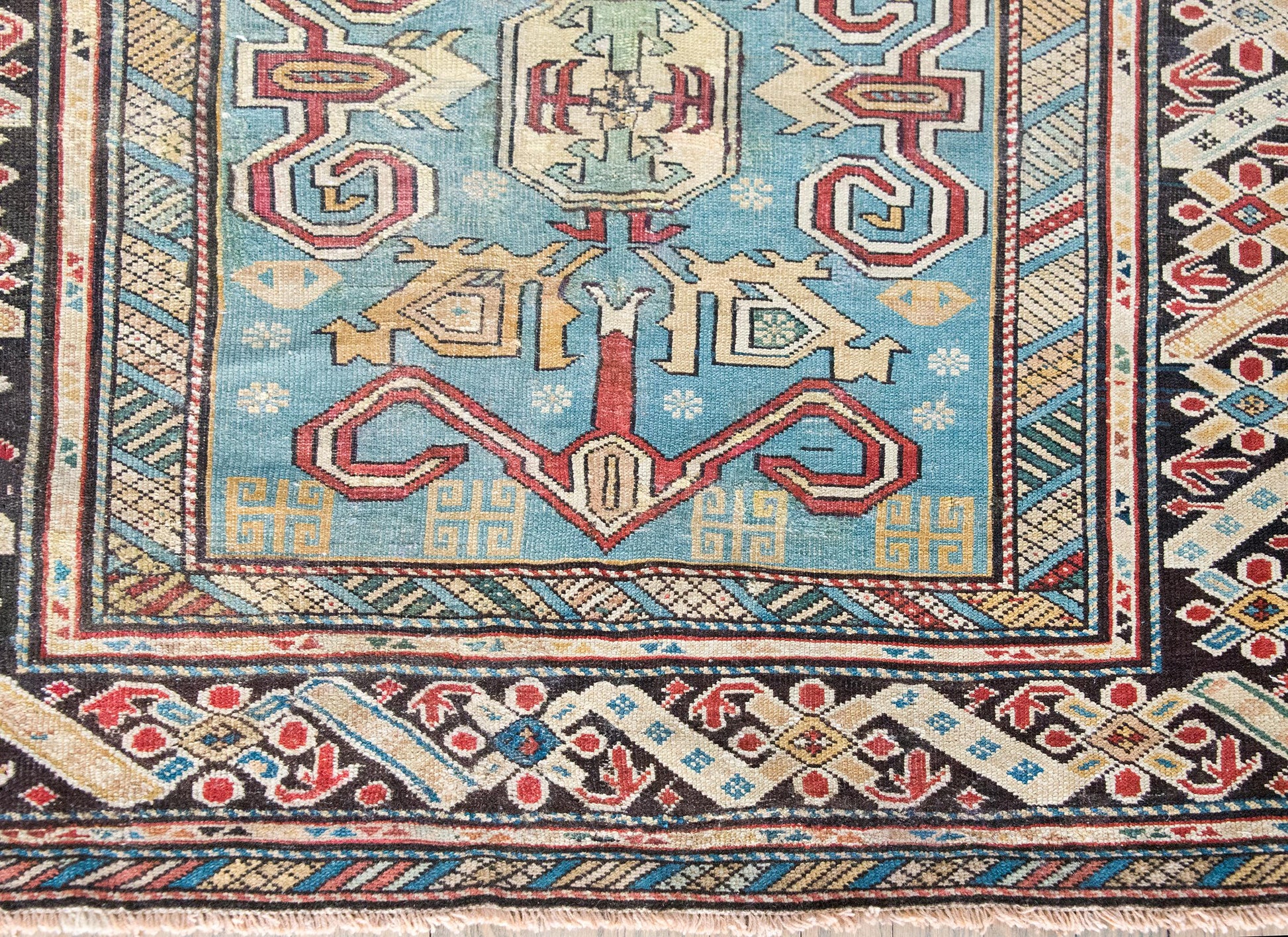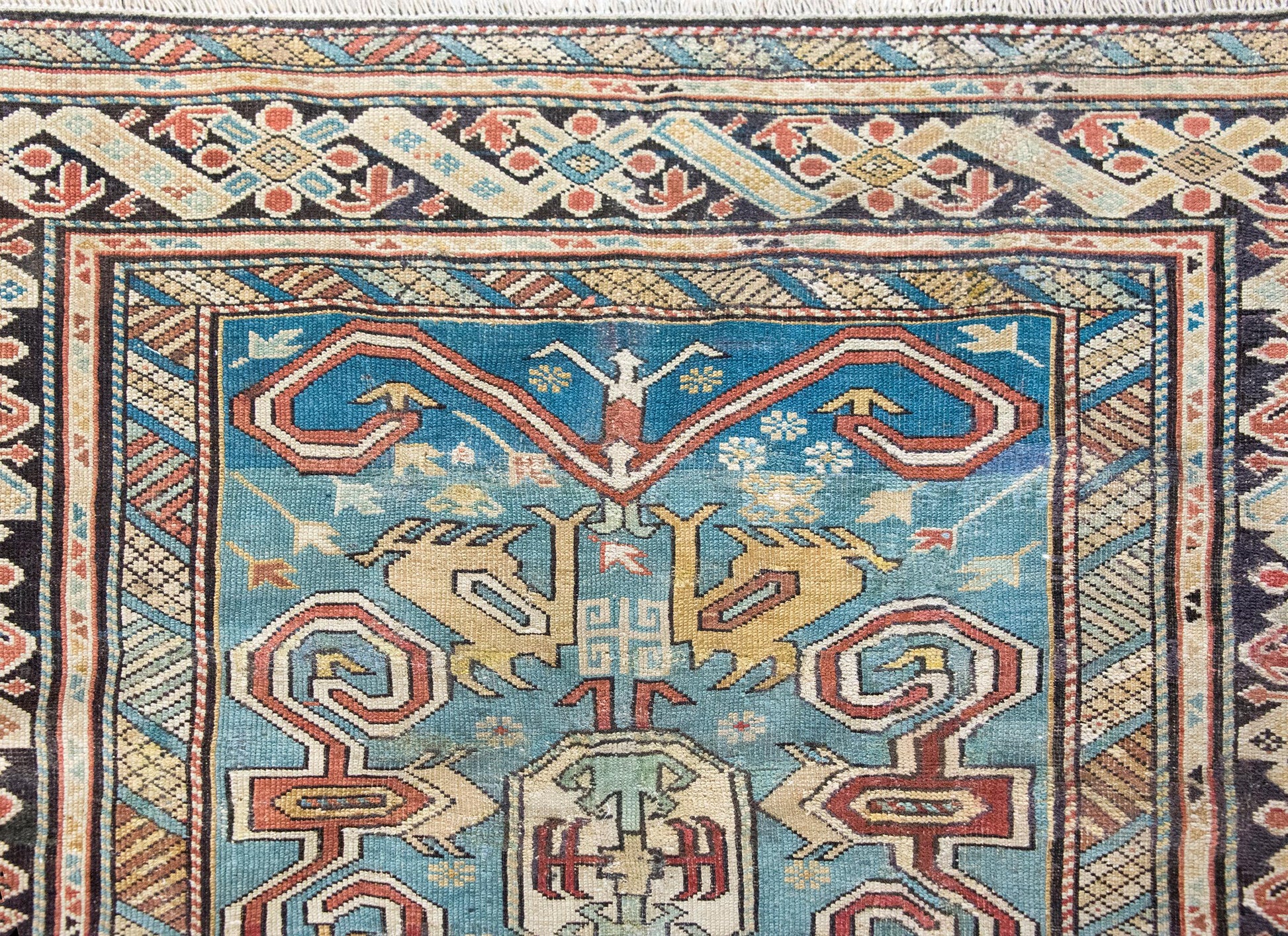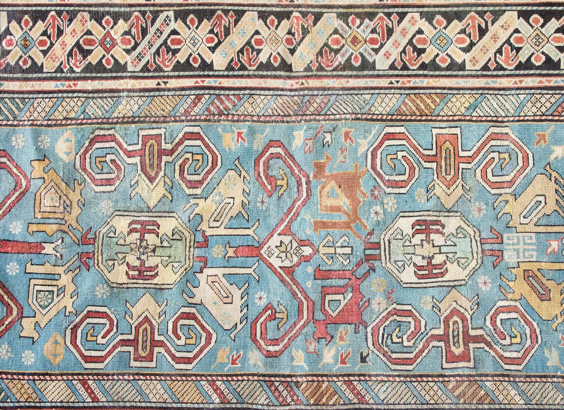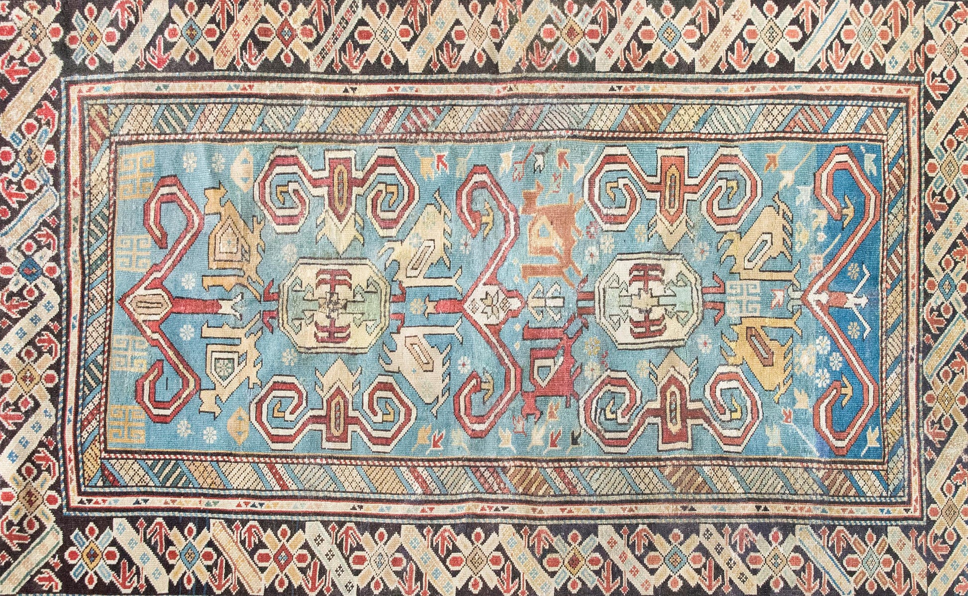 This early 20th-century Persian Shirvan rug is a masterclass in color, composition, and scale. Woven by Azerbaijani artisans from the Shirvan region in the eastern Caucasus—an area long celebrated for its intricate village weavings—this piece showcases a rare large-scale scrolling vine and floral pattern, rendered in vibrant shades of crimson, yellow, white, and pale green. The field is set against a deeply abrash indigo ground that shifts beautifully in tone, giving the pattern a sense of movement and depth. The border is no afterthought: a wide band of stylized florals is framed by alternating petite and wide geometric guard borders, all tightly drawn and richly hued. Shirvan rugs are typically known for their fine knotting, crisp lines, and compact scale—making this oversized pattern all the more unusual and desirable. An expressive and well-preserved example, this rug bridges the refinement of Persian design with the lively spirit of tribal craftsmanship.