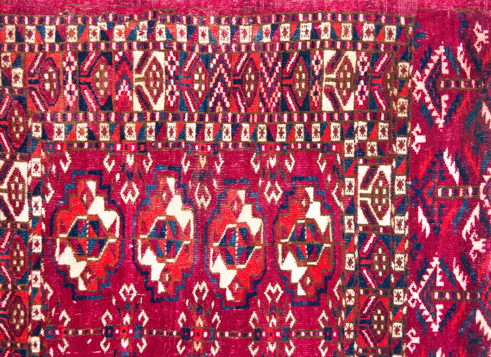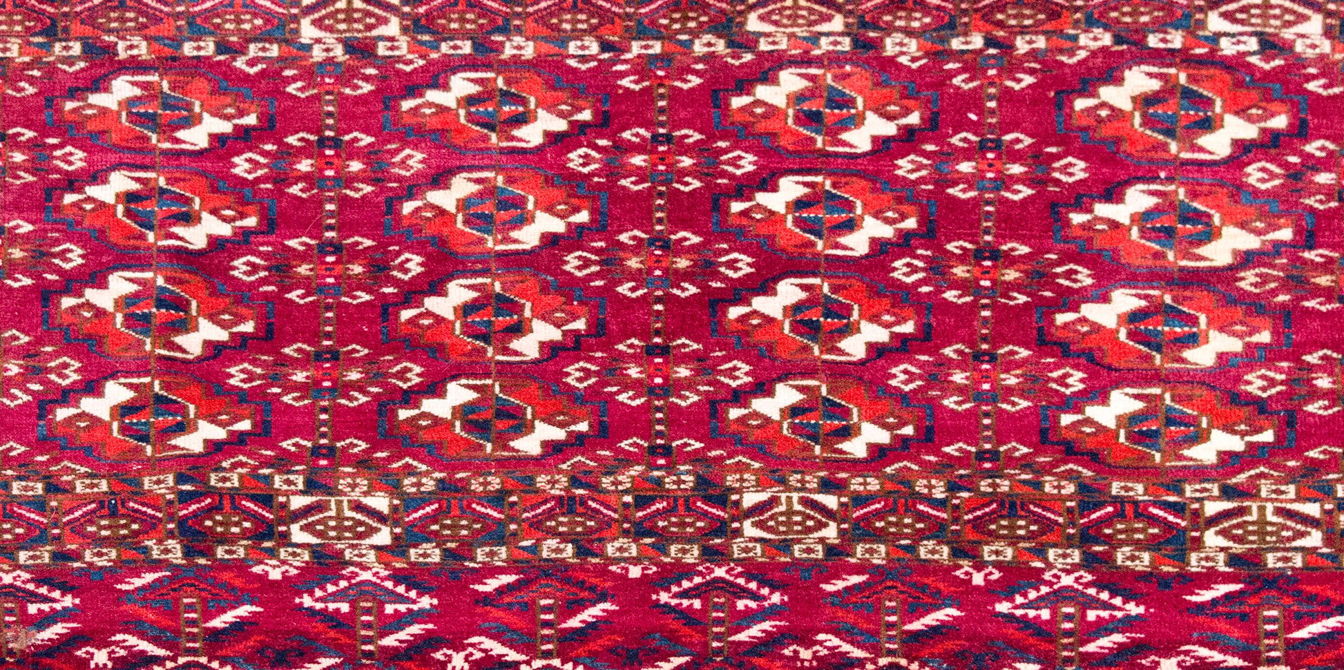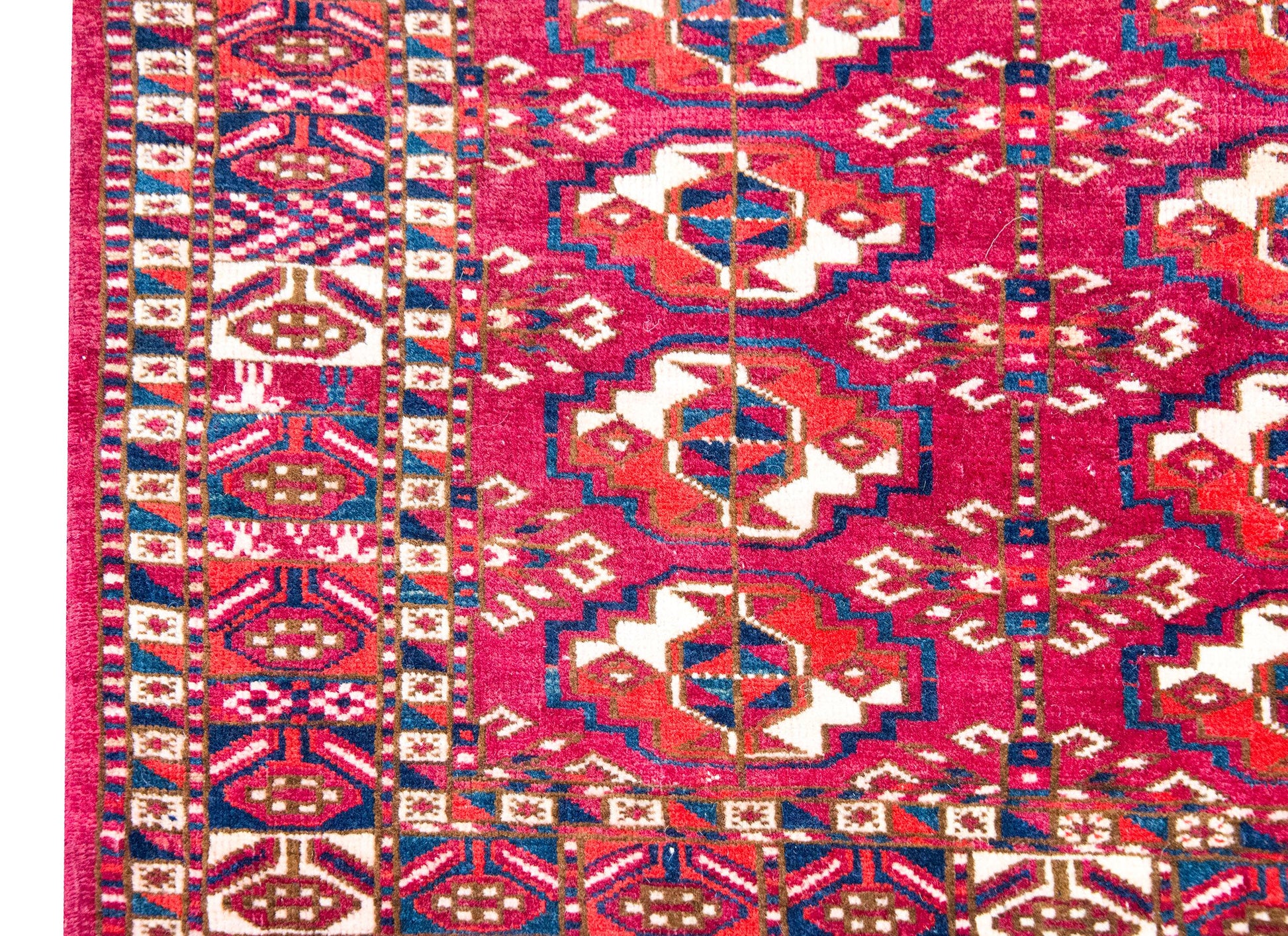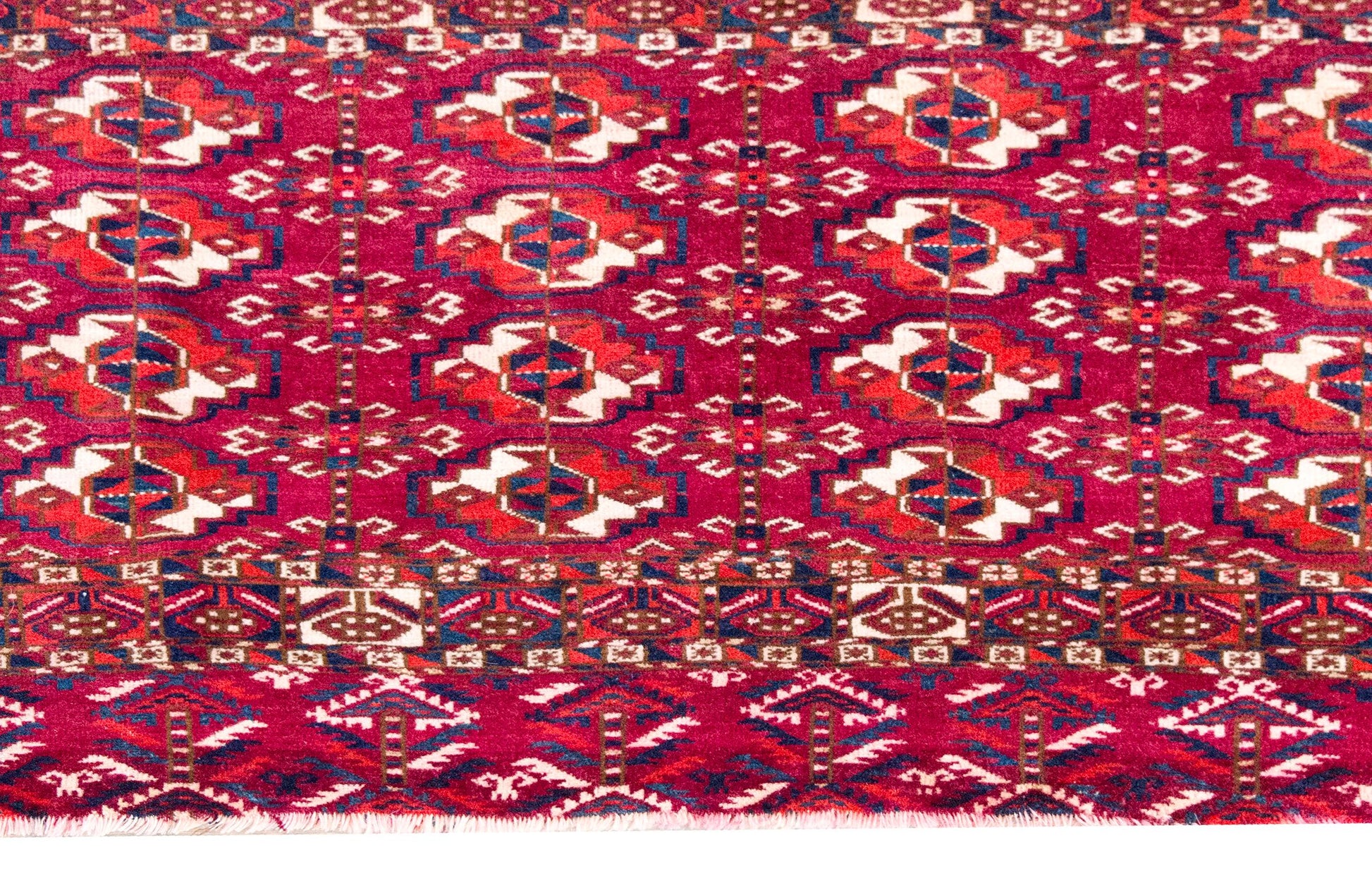 A beautiful early 20th century Persian Turkmen Take rug with all-over styled floral medallions woven in orange and white, crimson, and indigo, and set against a cranberry background. The border is asymmetrical with more stylized leaves and flowers.